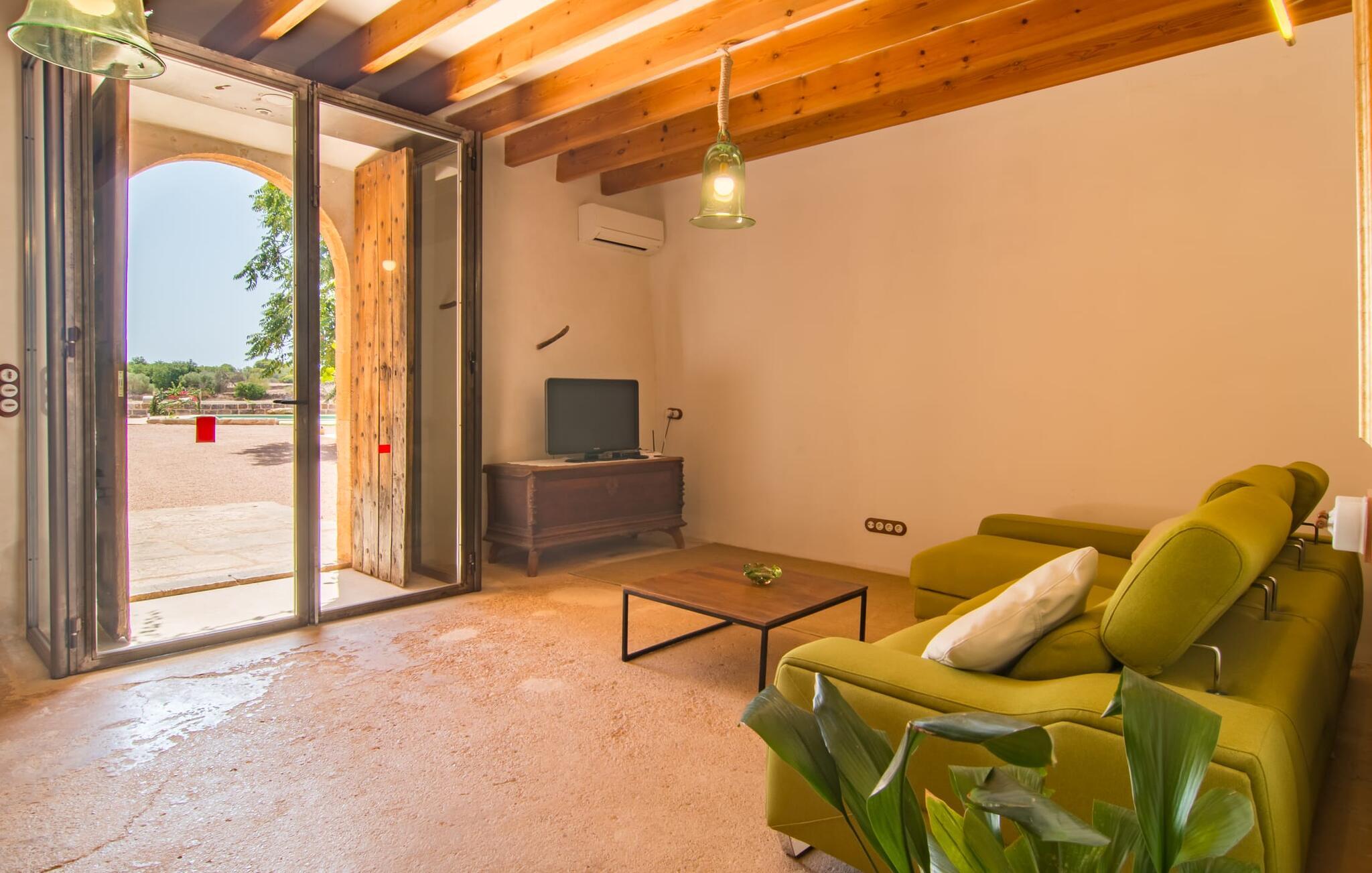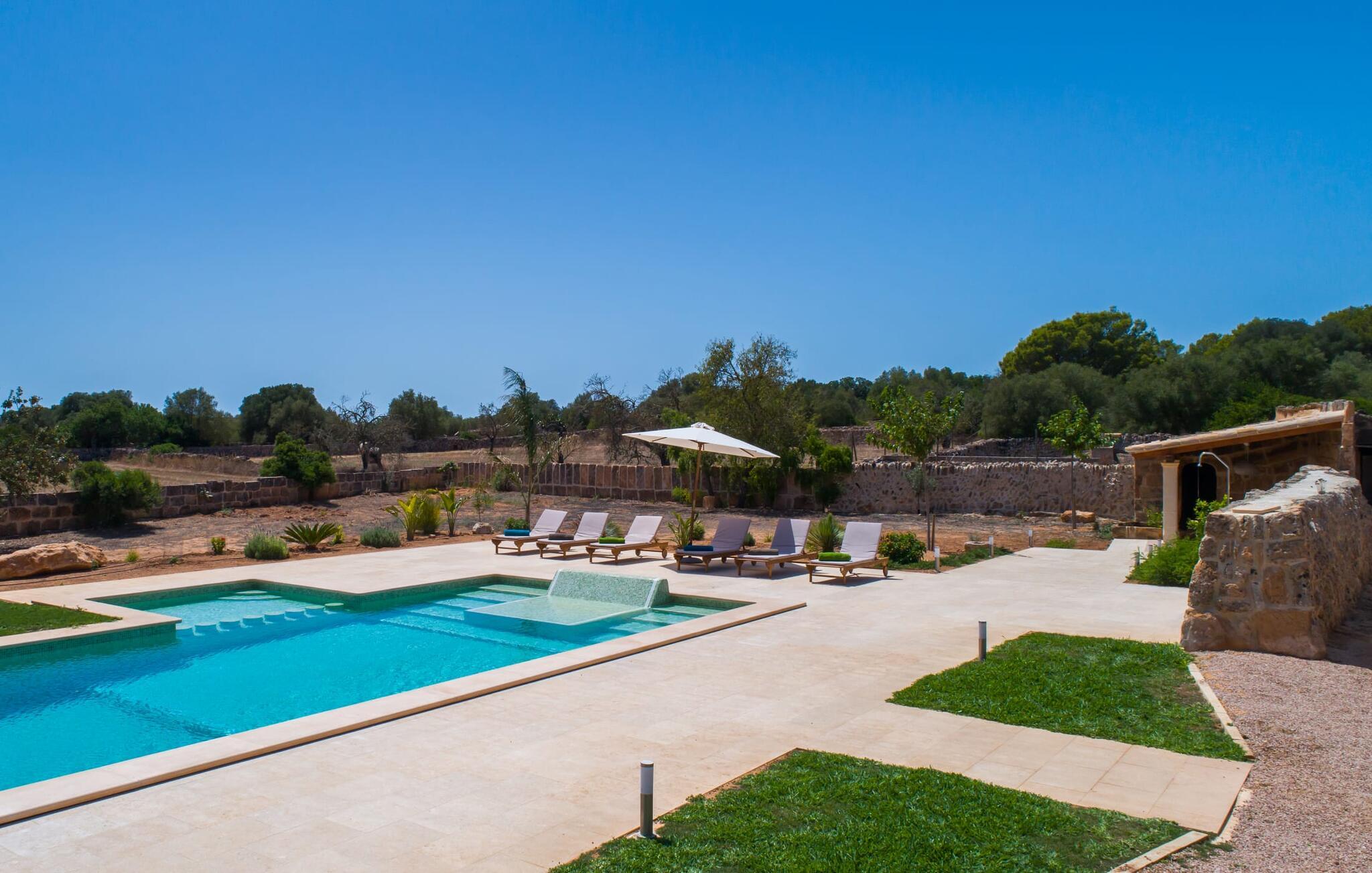 Der er villaer, der giver jer følelsen af, at halvdelen af Mallorca ligger for jeres fødder. Dette er tilfældet med villaen "Son Delabau Gran". Så snart I når den vidtstrakte ejendom efter en kort køretur fra den mallorcanske lufthavn, sætter følelsen af tidløs luksus uundgåeligt ind. På trods af den attraktive nærhed til spændende byer som Palma eller Llucmajor, emmer udsigten over det omkringliggende landskab af ren landlig idyl. Og måske vil den buede terrasse minde jer om de store tider i jeres barndom, hvor I havde en særlig forkærlighed for slotte, der lignede noget ud af et eventyr. Smalle trin, der giver indtryk af et gammelt vartegn, fører til en smuk tagterrasse, hvor I kan nyde øens solskinn. Poolvandet glitrer forførende i solen, noget I måske ikke kan modstå længe. Og hvorfor skulle I det? En af de gavnlige effekter ved vand er, at maden smager meget bedre bagefter. Især når det blev tilberedt i sådan et hyggeligt udekøkken, perfekt udstyret til en stor BBQ. Når I ligger på en af liggestolene og ser solnedgangen eller bruger et af siddeområderne - som pergolaen eller chill-out loungen - til at smage et glas ø-vin, vil I vide: I gjorde alt rigtigt, en mere billedskønt Der er ingen idyl. Vildt romantiske roser kravler op ad stenmursfronten i indgangspartiet. Når I kommer ind, befinder I jer i et hus af særlig kvalitet. I finder ikke noget overflødigt her, den minimalistiske og hyggelige stil minder om skandinavisk æstetik, samtidig med at den "finca-agtige" landlige charme stadig er til stede i næsten alle hjørner. Et hyggeligt opholdsområde med en stenbænk badet i varmt lys, ideel til lange nætter med historie, kan blive et af jeres yndlingssteder i huset. Det kunne den grønne sofa, hvorfra I kan se ud i jeres drømmehave, sige noget om det. Der er to spisepladser. En af dem ligger lige ved siden af det allerede nævnte opholdsområde og springvandet, det andet spisebord står i et større rum. Vinduerne, der varierer i størrelse og form, bidrager til originaliteten af den magiske stemning. Et af værelserne ligner endda et kapel med sit farverige glasvindue i loftet. Her kan I for eksempel meditere om morgenen for at starte dagen afbalanceret og i godt humør. Indretningen af værelserne er meget rustik de to soveværelser nås gennem snoede gange. Hver af dem har sit eget badeværelse, og det lille tredje soveværelse er det perfekte sted for børnene. Naturstensvægelementerne i huset skaber en hjemlig slotsstemning, som også formidler modernitet gennem de hvide farver og det venlige lyskoncept. Så I vil føle jer frisk, når I forlader ejendommen om morgenen. Vejen er let at nå, hvilket kan forårsage hørbar trafikstøj afhængigt af vindretningen. I er ikke meget mere end 10 minutter fra Llucmajor, hvor det livlige Placa d'Espana byder på en farverig blanding af caféer, restauranter og barer. Der er et marked her to gange om ugen, hvor I kan forsyne jer med friske grøntsager, især om fredagen. Til en shoppingtur anbefaler vi også de 20 minutters kørsel til den pulserende ø-hovedstad Palma, som imponerer med sit mangfoldige kulturelle tilbud. Golfentusiaster vil få noget for pengene på Son Antem golfbane, 1 km væk. Efter en halv times kørsel vil I befinde jer foran den paradisiske naturlige sandstrand Es Trenc. Rejsen til Tramuntana-bjergene, som er ideel til vandreture, tager omtrent samme tid. Den fantastiske villa "Son Delabau Gran" har masser af plads og ligger mellem drømmestranden S'Arenal og Llucmajor, 11 km væk. I kan tage ind til byen og nyde den livlige atmosfære på Placa d'Espana. Da I kun er 20 minutters kørsel fra hovedstaden Palma, finder I masser af variation i byens centrum. Efter shopping kan I slappe af på sydkystens strande, herunder Calo de San Antoni.