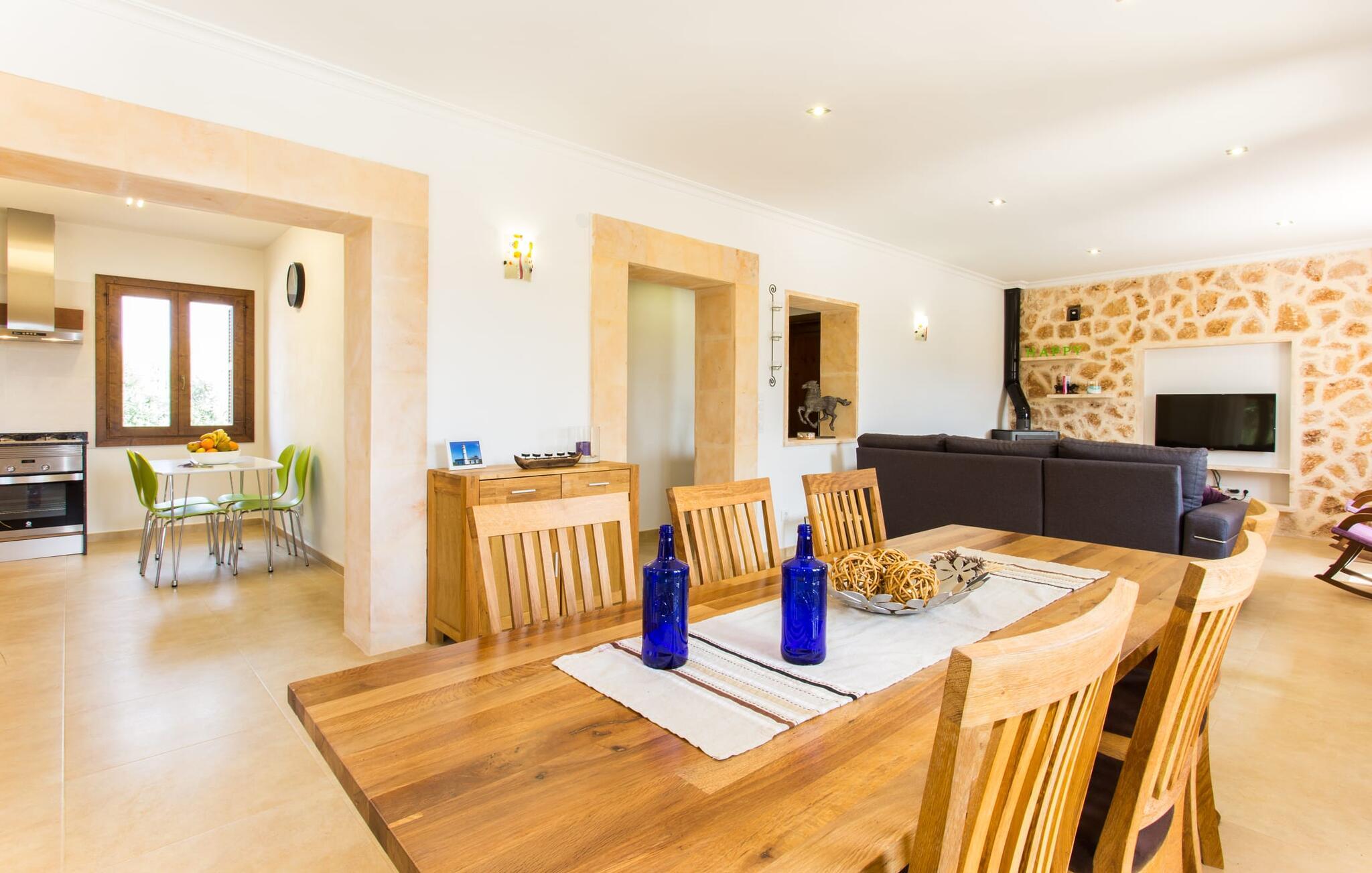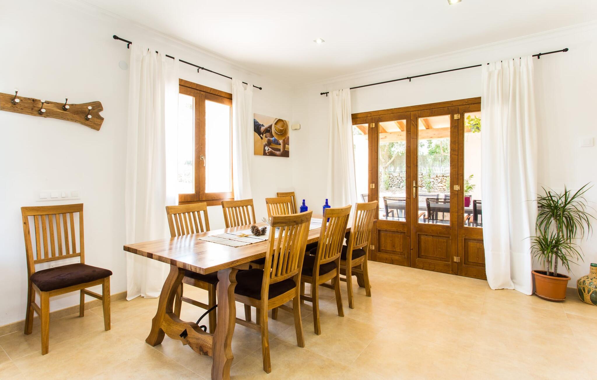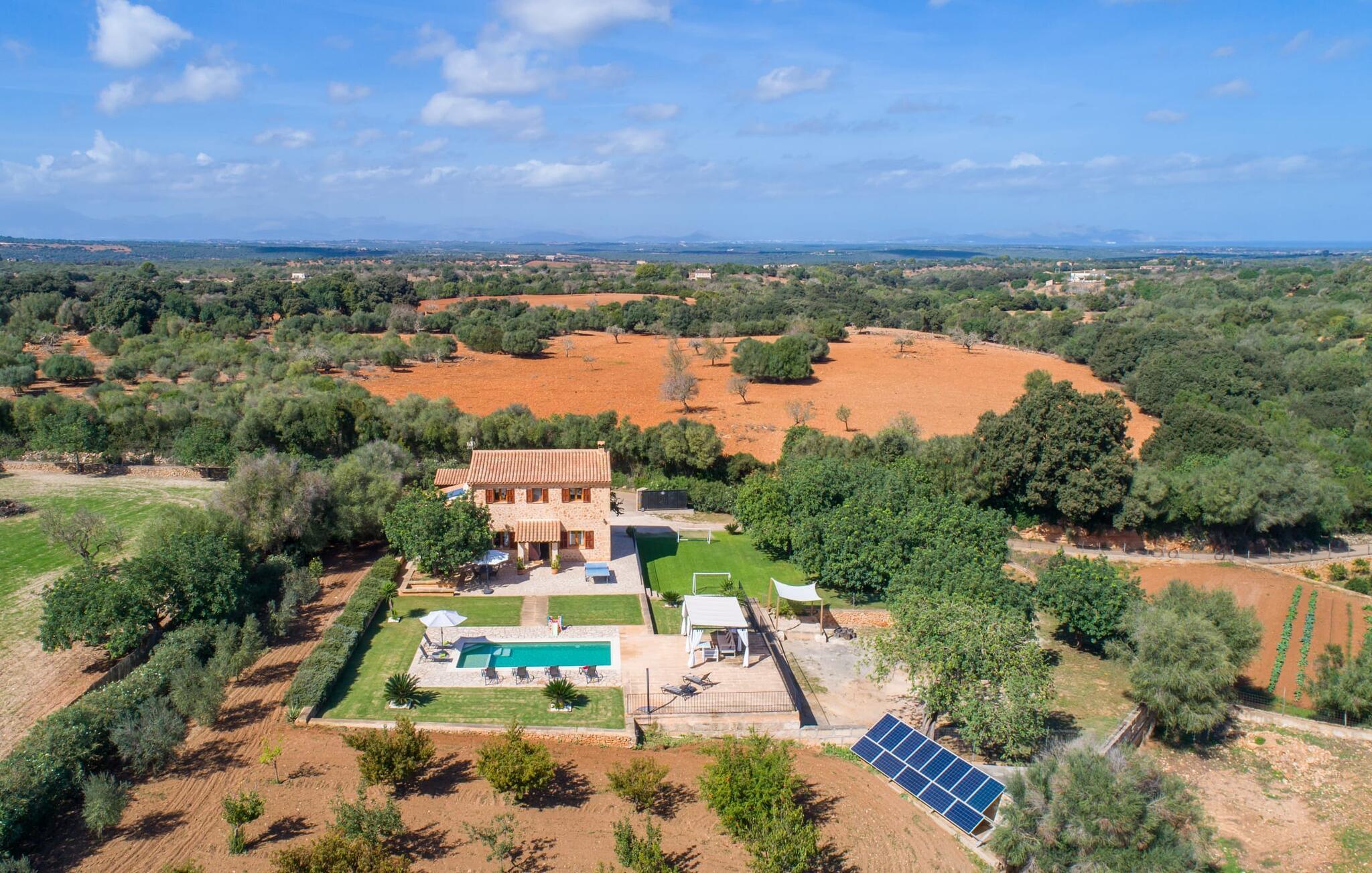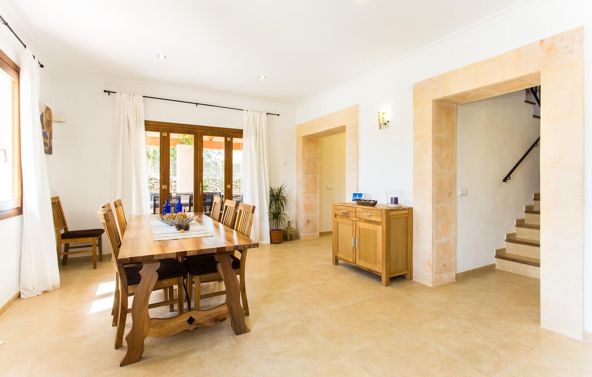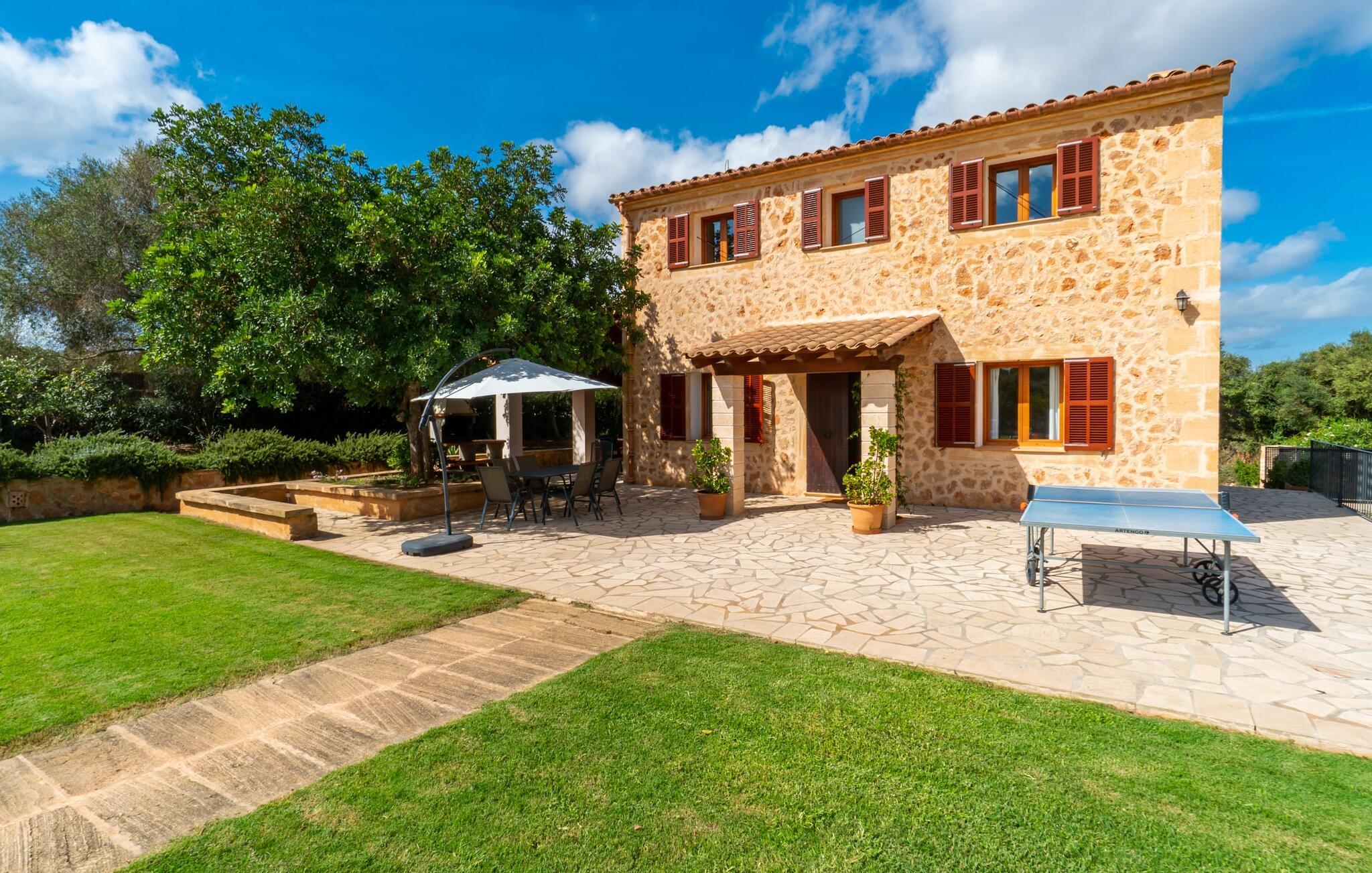 Det charmerende feriehus "Son Duri" nær Manacor er beliggende i rolige landlige omgivelser, omgivet af fladt landskab. Det næsten trinløse, rummelige udendørsareal har en rummelig græsplæne, der indbyder til leg og afslapning. Skyggefulde legeområder byder de små gæster varmt velkommen. Poolen har nem adgangstrin og et bredt siddeområde og kan sikkert indhegnes, hvis det ønskes. Solterrassen, foret med en stor pavillon og komfortable havemøbler, inviterer jer til at slappe af. En overdækket terrasse giver et hyggeligt sted til udendørs spisning, så I kan nyde måltider fra murstensgrillen, mens I holder øje med poolen. Den omfattende ejendom tilbyder en betagende udsigt over landskabet nord for Manacor og sikrer masser af privatliv. Det rummelige interiør er ideelt til en afslappende ferie med hele familien. I stueetagen finder I en lys opholds- og spisestue med siddepladser og pejs. Det moderne, veludstyrede køkken er halvåbent til spisepladsen. Der er direkte udgang til den overdækkede terrasse fra både køkken og spiseplads. Den brede bruser og døre i stueetagen gør denne del af fincaen let tilgængelig for alle. På øverste etage er der yderligere tre soveværelser med dobbeltsenge og to badeværelser. De hyggelige soveværelser byder på en smuk udsigt over det omkringliggende landskab og vinduerne kan let mørklægges med skodder. Dette dejlige feriehus nær Manacor tilbyder også pålidelig mobiltelefonmodtagelse, god WiFi og et skrivebord. Den moderne villa "Son Duri" ligger på en kæmpe ejendom på den østlige del af øen, omkring 60 km fra lufthavnen. Det er centralt beliggende, små byer og strande er i nærheden.
