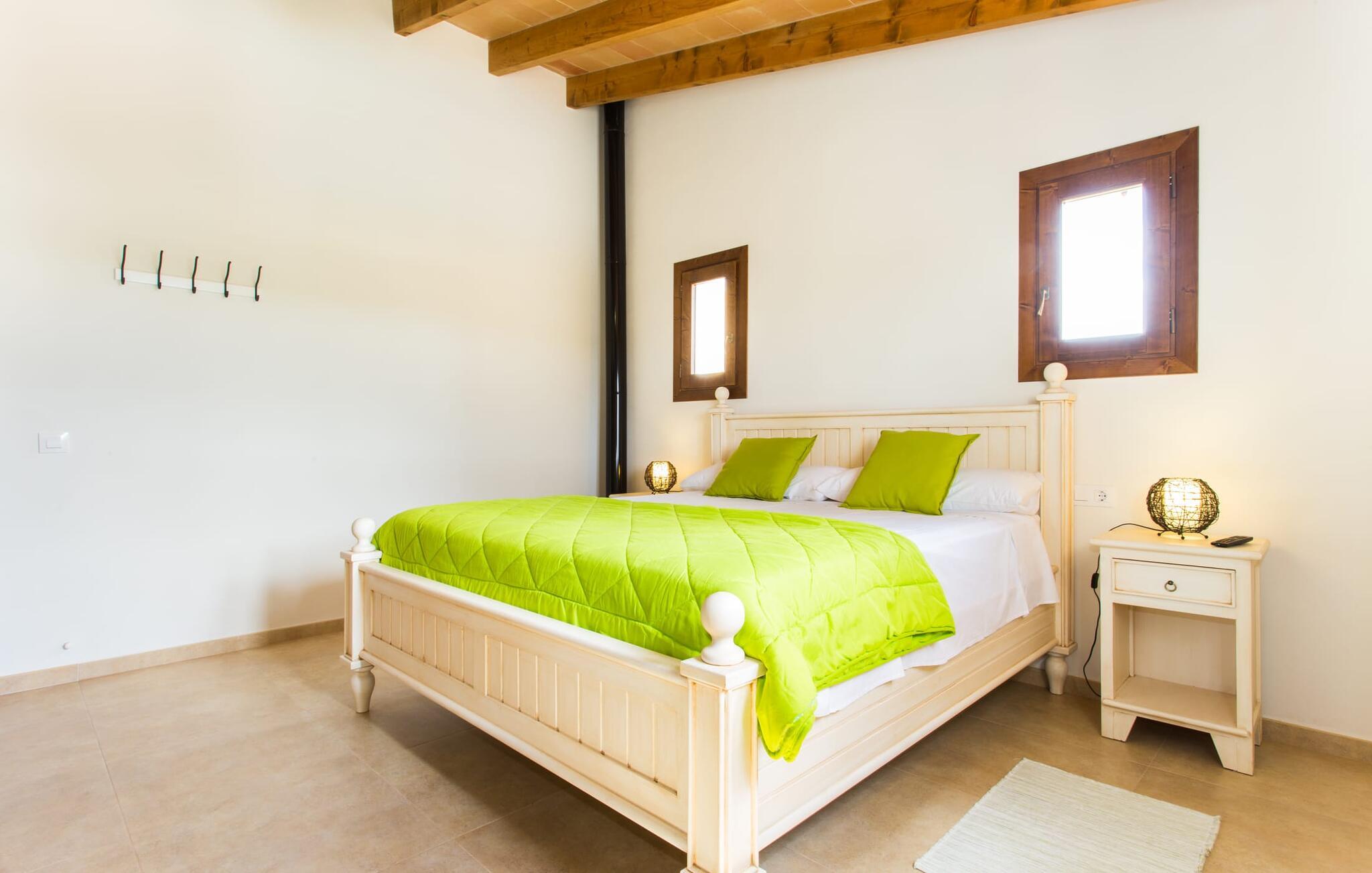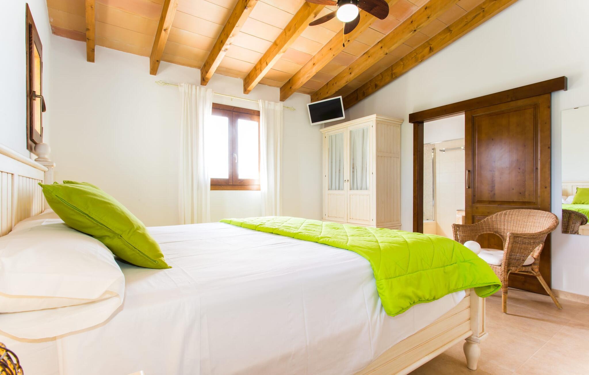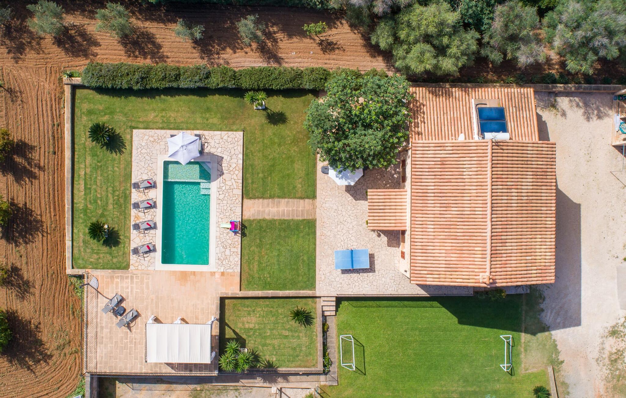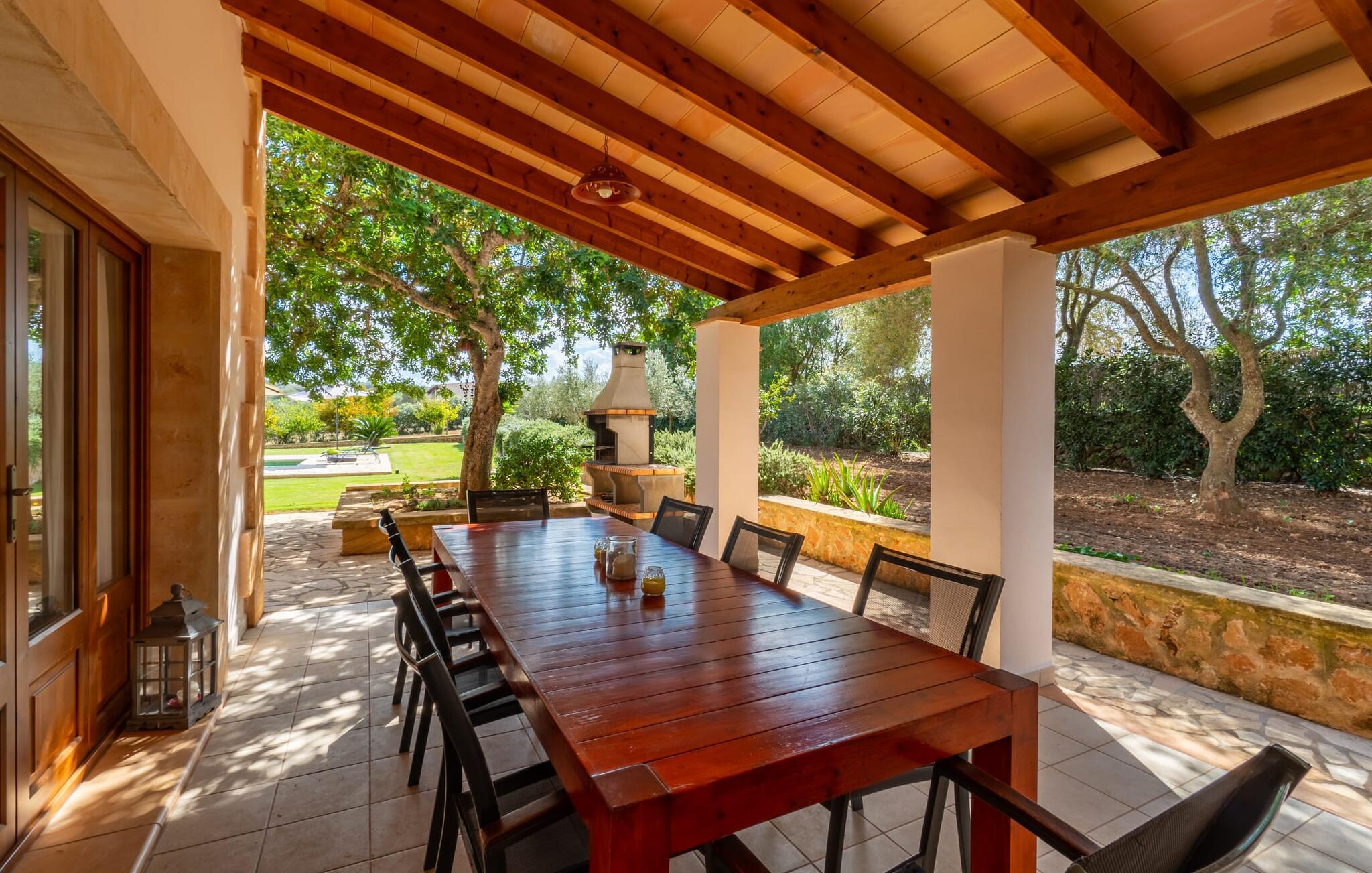 Det charmerende feriehus "Son Duri" nær Manacor er beliggende i rolige landlige omgivelser, omgivet af fladt landskab. Det næsten trinløse, rummelige udendørsareal har en rummelig græsplæne, der indbyder til leg og afslapning. Skyggefulde legeområder byder de små gæster varmt velkommen. Poolen har nem adgangstrin og et bredt siddeområde og kan sikkert indhegnes, hvis det ønskes. Solterrassen, foret med en stor pavillon og komfortable havemøbler, inviterer jer til at slappe af. En overdækket terrasse giver et hyggeligt sted til udendørs spisning, så I kan nyde måltider fra murstensgrillen, mens I holder øje med poolen. Den omfattende ejendom tilbyder en betagende udsigt over landskabet nord for Manacor og sikrer masser af privatliv. Det rummelige interiør er ideelt til en afslappende ferie med hele familien. I stueetagen finder I en lys opholds- og spisestue med siddepladser og pejs. Det moderne, veludstyrede køkken er halvåbent til spisepladsen. Der er direkte udgang til den overdækkede terrasse fra både køkken og spiseplads. Den brede bruser og døre i stueetagen gør denne del af fincaen let tilgængelig for alle. På øverste etage er der yderligere tre soveværelser med dobbeltsenge og to badeværelser. De hyggelige soveværelser byder på en smuk udsigt over det omkringliggende landskab og vinduerne kan let mørklægges med skodder. Dette dejlige feriehus nær Manacor tilbyder også pålidelig mobiltelefonmodtagelse, god WiFi og et skrivebord. Den moderne villa "Son Duri" ligger på en kæmpe ejendom på den østlige del af øen, omkring 60 km fra lufthavnen. Det er centralt beliggende, små byer og strande er i nærheden.
