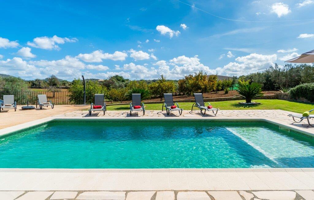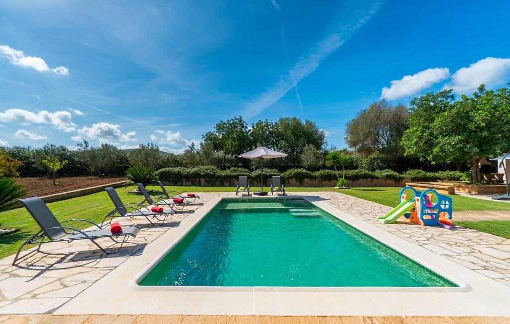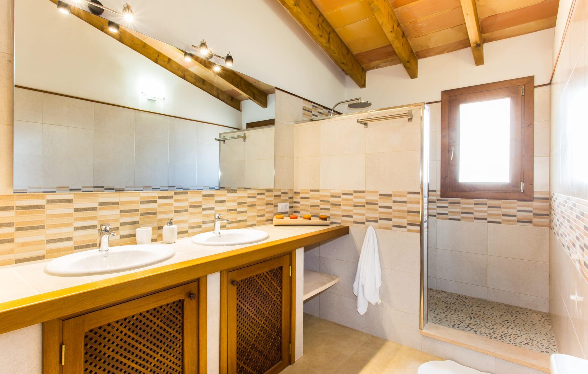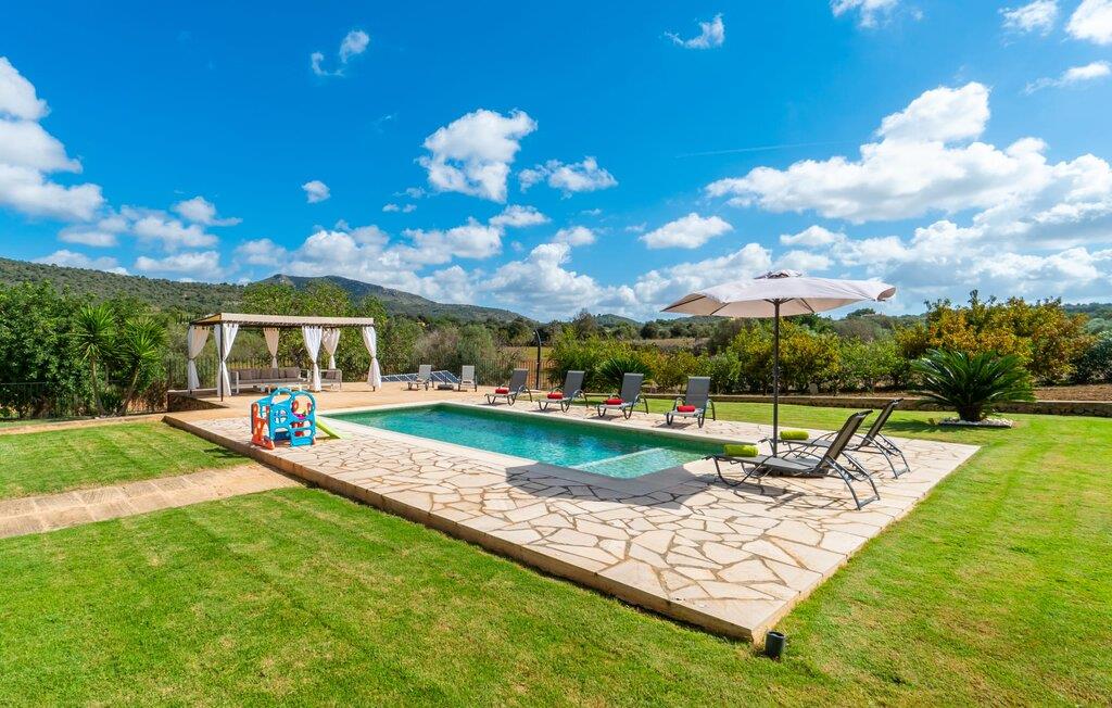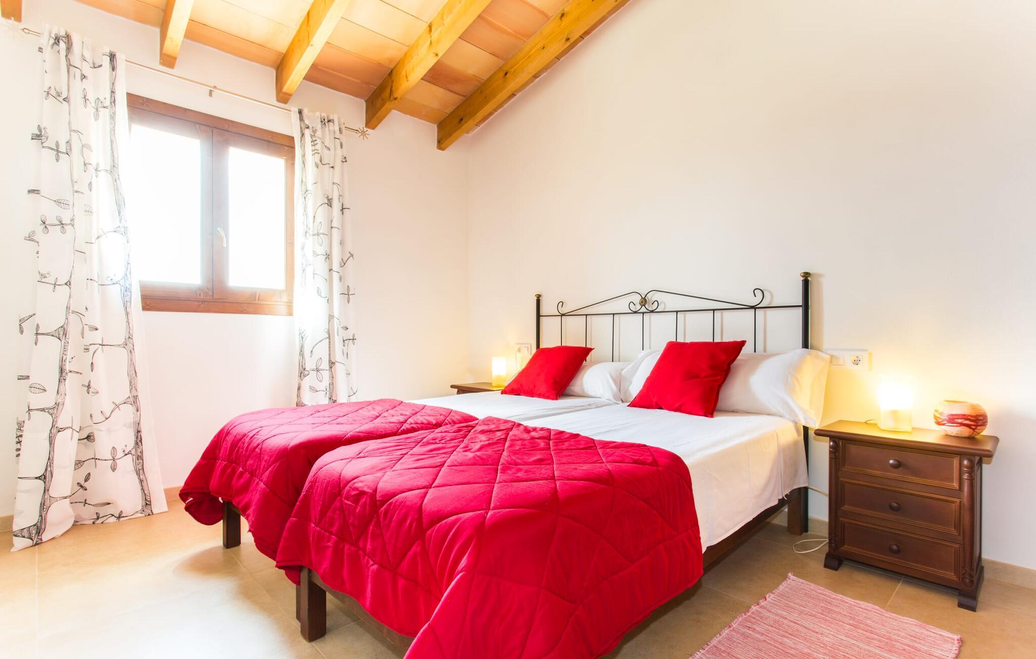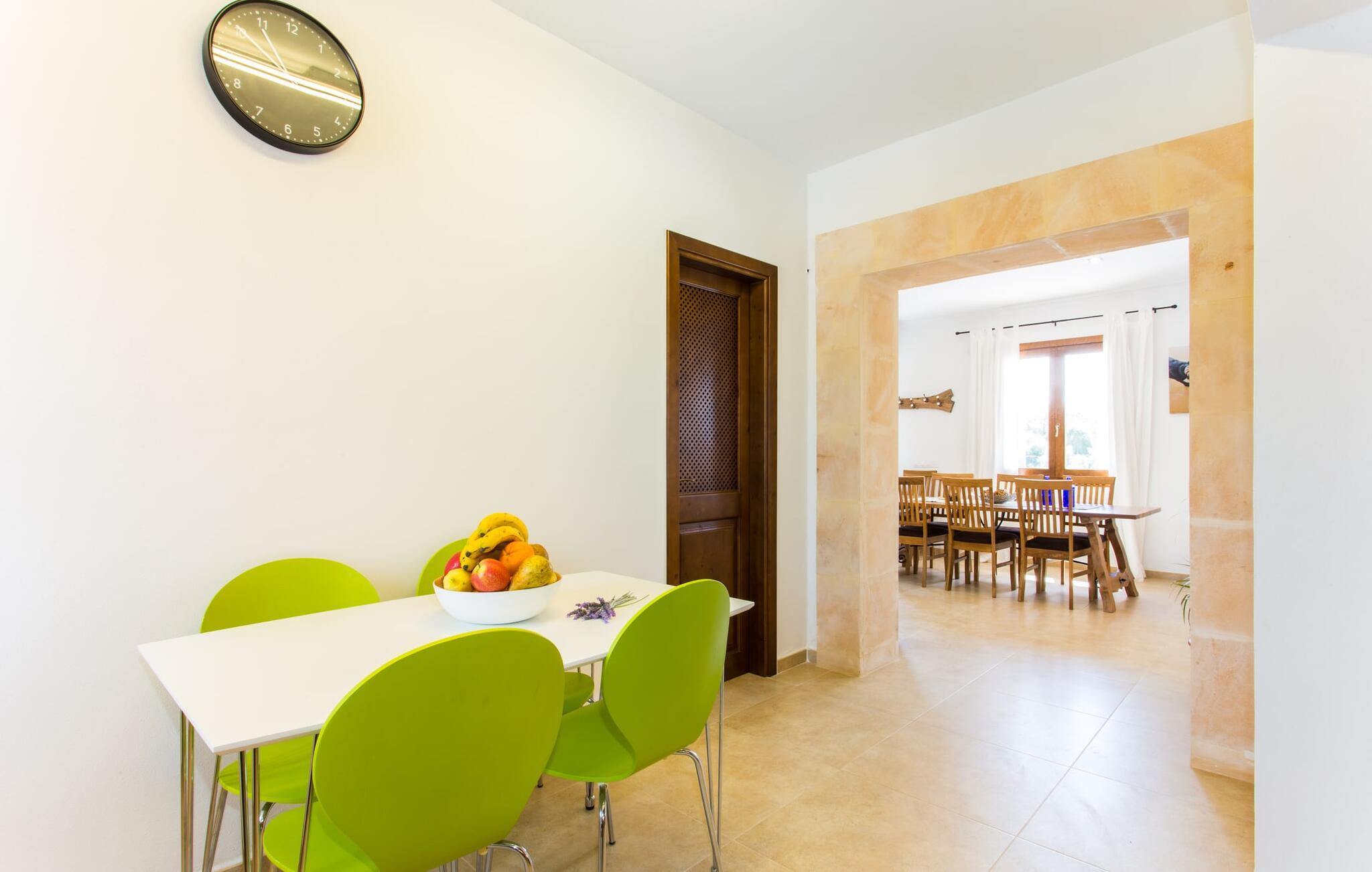 Det charmerende feriehus "Son Duri" nær Manacor er beliggende i rolige landlige omgivelser, omgivet af fladt landskab. Det næsten trinløse, rummelige udendørsareal har en rummelig græsplæne, der indbyder til leg og afslapning. Skyggefulde legeområder byder de små gæster varmt velkommen. Poolen har nem adgangstrin og et bredt siddeområde og kan sikkert indhegnes, hvis det ønskes. Solterrassen, foret med en stor pavillon og komfortable havemøbler, inviterer jer til at slappe af. En overdækket terrasse giver et hyggeligt sted til udendørs spisning, så I kan nyde måltider fra murstensgrillen, mens I holder øje med poolen. Den omfattende ejendom tilbyder en betagende udsigt over landskabet nord for Manacor og sikrer masser af privatliv. Det rummelige interiør er ideelt til en afslappende ferie med hele familien. I stueetagen finder I en lys opholds- og spisestue med siddepladser og pejs. Det moderne, veludstyrede køkken er halvåbent til spisepladsen. Der er direkte udgang til den overdækkede terrasse fra både køkken og spiseplads. Den brede bruser og døre i stueetagen gør denne del af fincaen let tilgængelig for alle. På øverste etage er der yderligere tre soveværelser med dobbeltsenge og to badeværelser. De hyggelige soveværelser byder på en smuk udsigt over det omkringliggende landskab og vinduerne kan let mørklægges med skodder. Dette dejlige feriehus nær Manacor tilbyder også pålidelig mobiltelefonmodtagelse, god WiFi og et skrivebord. Den moderne villa "Son Duri" ligger på en kæmpe ejendom på den østlige del af øen, omkring 60 km fra lufthavnen. Det er centralt beliggende, små byer og strande er i nærheden.
