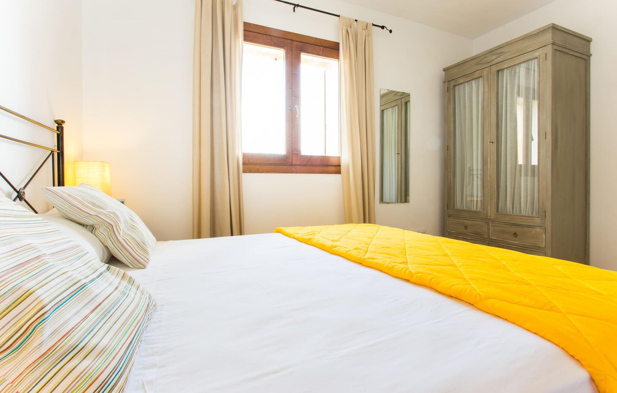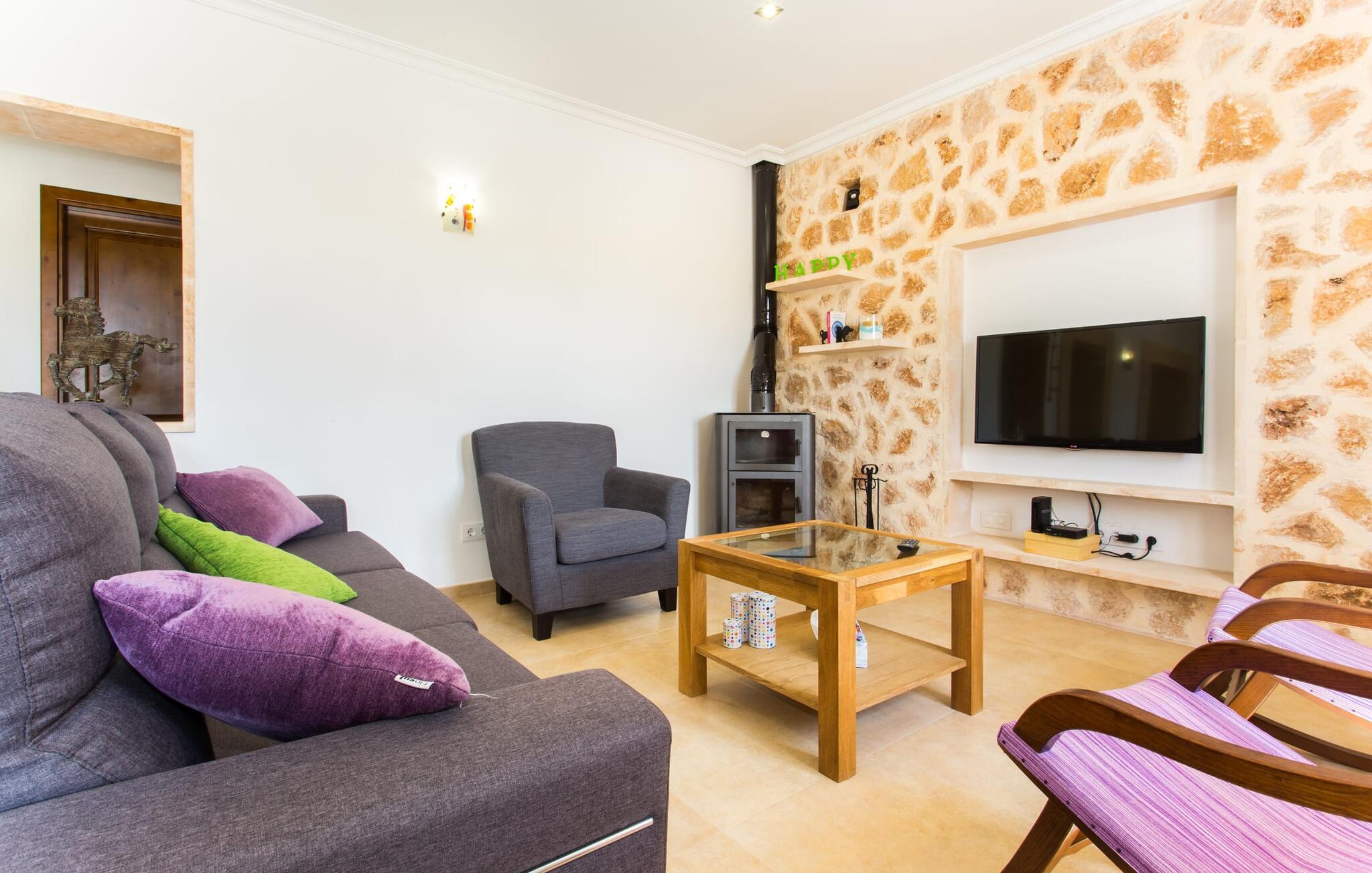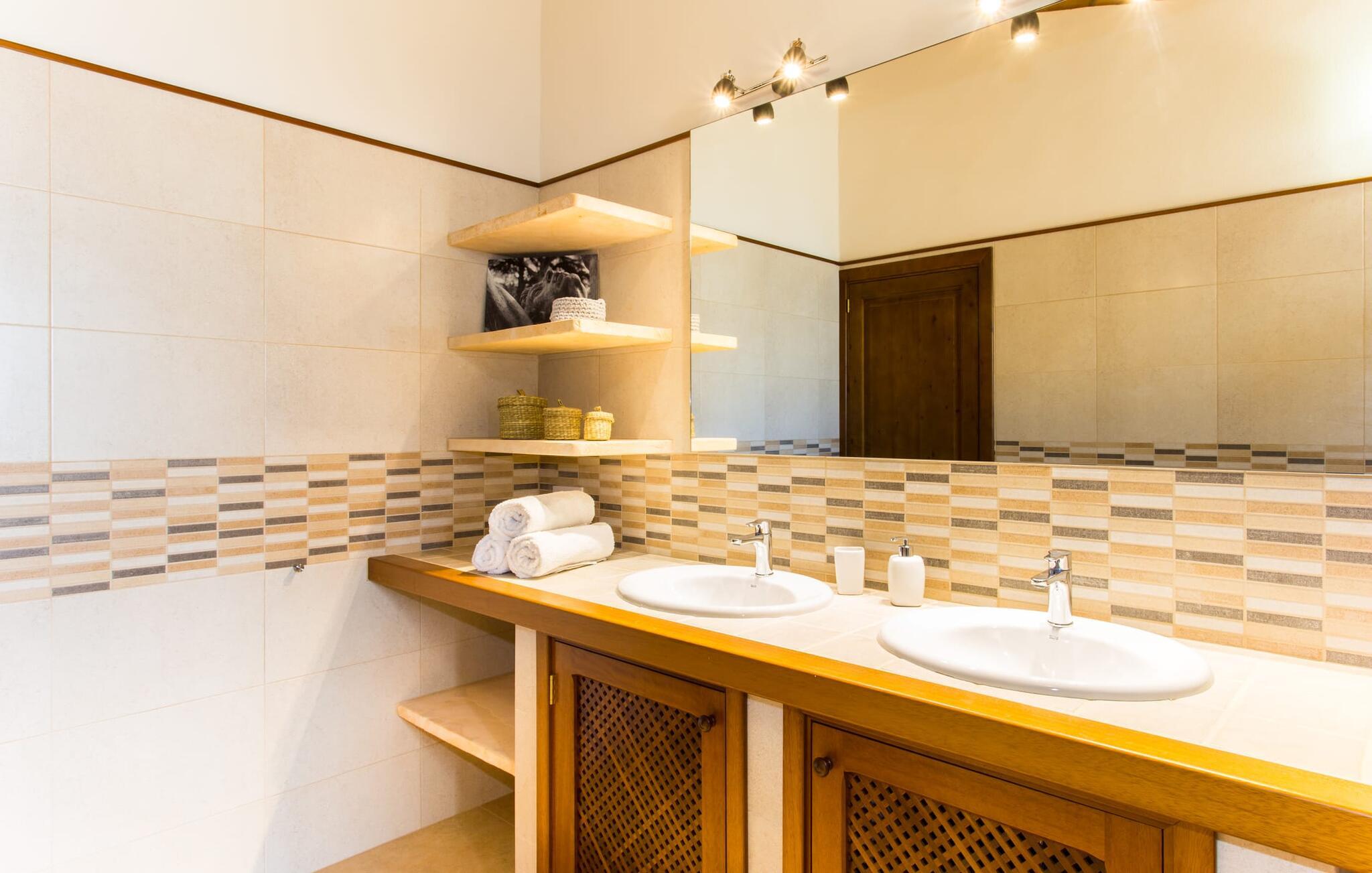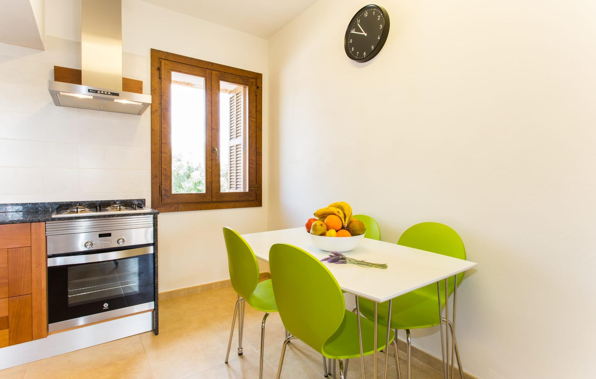 Det charmerende feriehus "Son Duri" nær Manacor er beliggende i rolige landlige omgivelser, omgivet af fladt landskab. Det næsten trinløse, rummelige udendørsareal har en rummelig græsplæne, der indbyder til leg og afslapning. Skyggefulde legeområder byder de små gæster varmt velkommen. Poolen har nem adgangstrin og et bredt siddeområde og kan sikkert indhegnes, hvis det ønskes. Solterrassen, foret med en stor pavillon og komfortable havemøbler, inviterer jer til at slappe af. En overdækket terrasse giver et hyggeligt sted til udendørs spisning, så I kan nyde måltider fra murstensgrillen, mens I holder øje med poolen. Den omfattende ejendom tilbyder en betagende udsigt over landskabet nord for Manacor og sikrer masser af privatliv. Det rummelige interiør er ideelt til en afslappende ferie med hele familien. I stueetagen finder I en lys opholds- og spisestue med siddepladser og pejs. Det moderne, veludstyrede køkken er halvåbent til spisepladsen. Der er direkte udgang til den overdækkede terrasse fra både køkken og spiseplads. Den brede bruser og døre i stueetagen gør denne del af fincaen let tilgængelig for alle. På øverste etage er der yderligere tre soveværelser med dobbeltsenge og to badeværelser. De hyggelige soveværelser byder på en smuk udsigt over det omkringliggende landskab og vinduerne kan let mørklægges med skodder. Dette dejlige feriehus nær Manacor tilbyder også pålidelig mobiltelefonmodtagelse, god WiFi og et skrivebord. Den moderne villa "Son Duri" ligger på en kæmpe ejendom på den østlige del af øen, omkring 60 km fra lufthavnen. Det er centralt beliggende, små byer og strande er i nærheden.