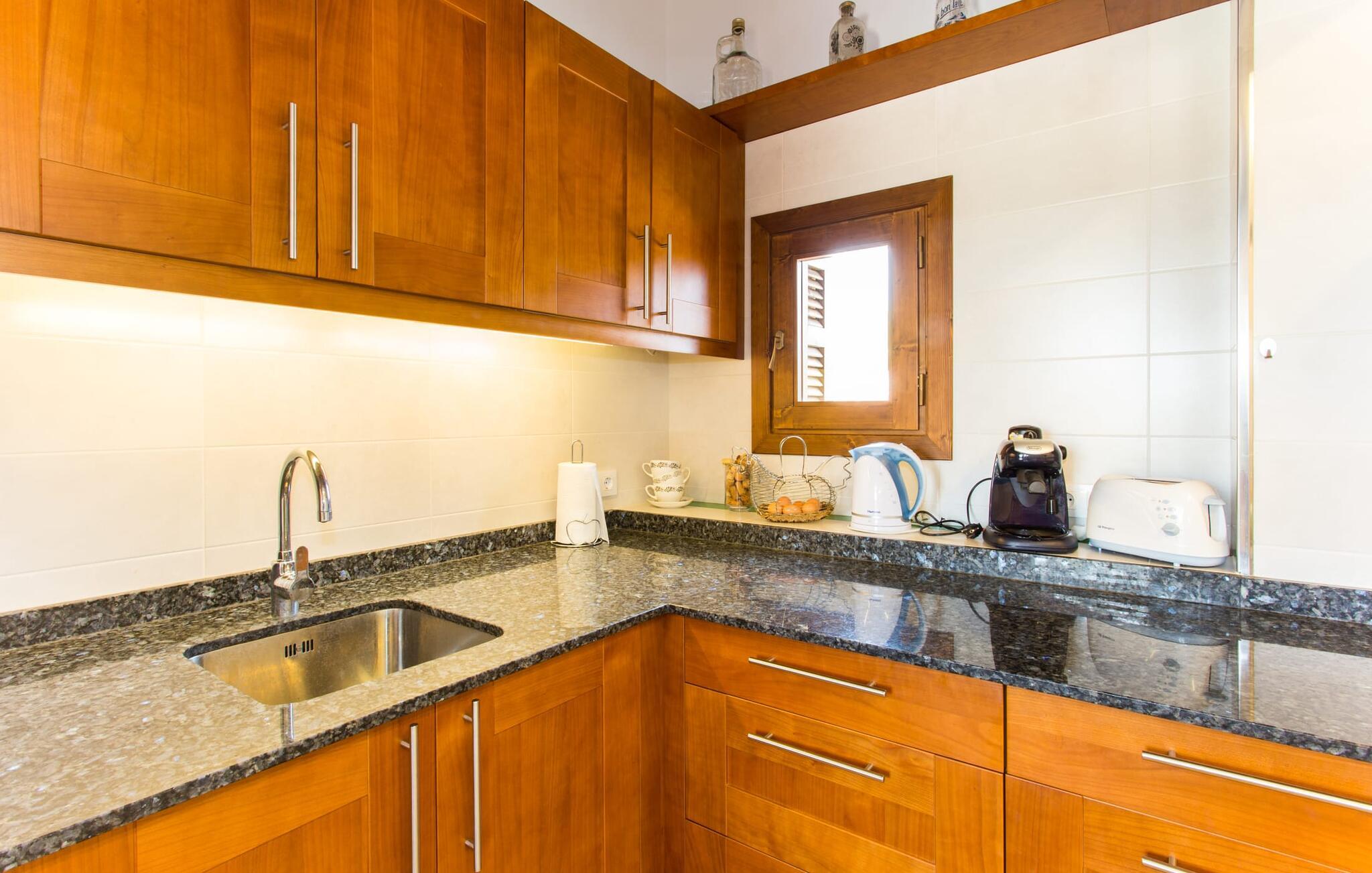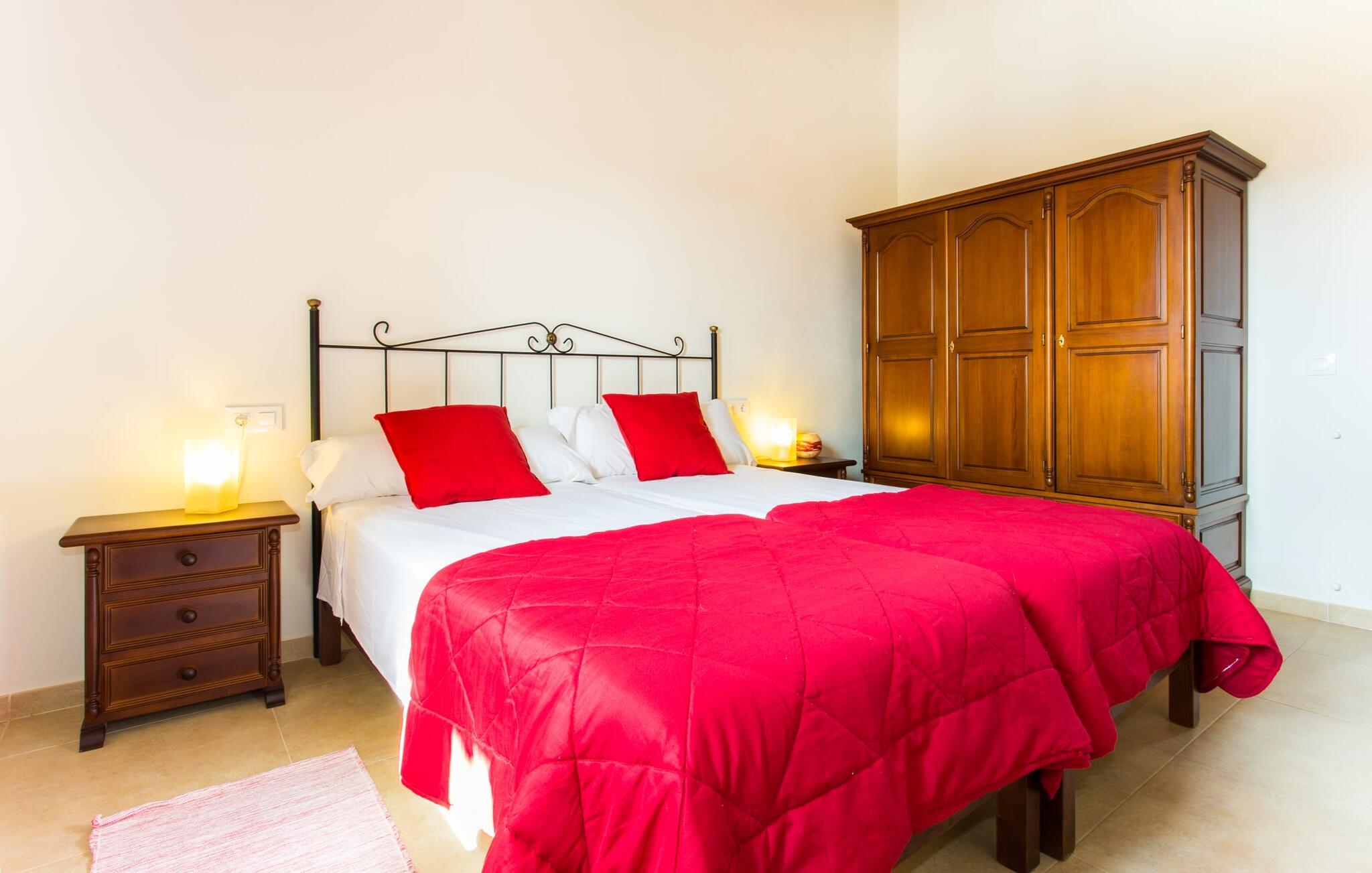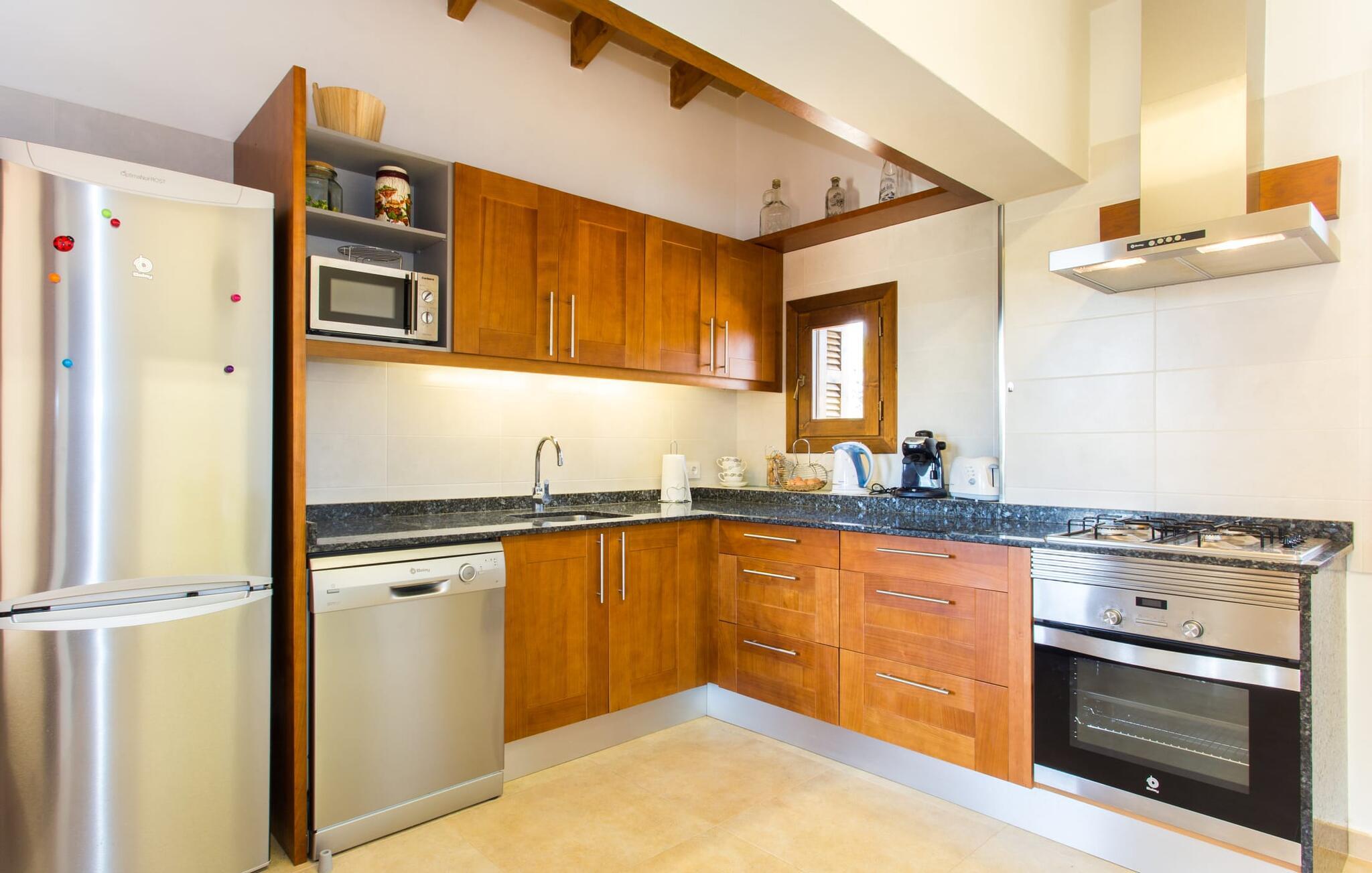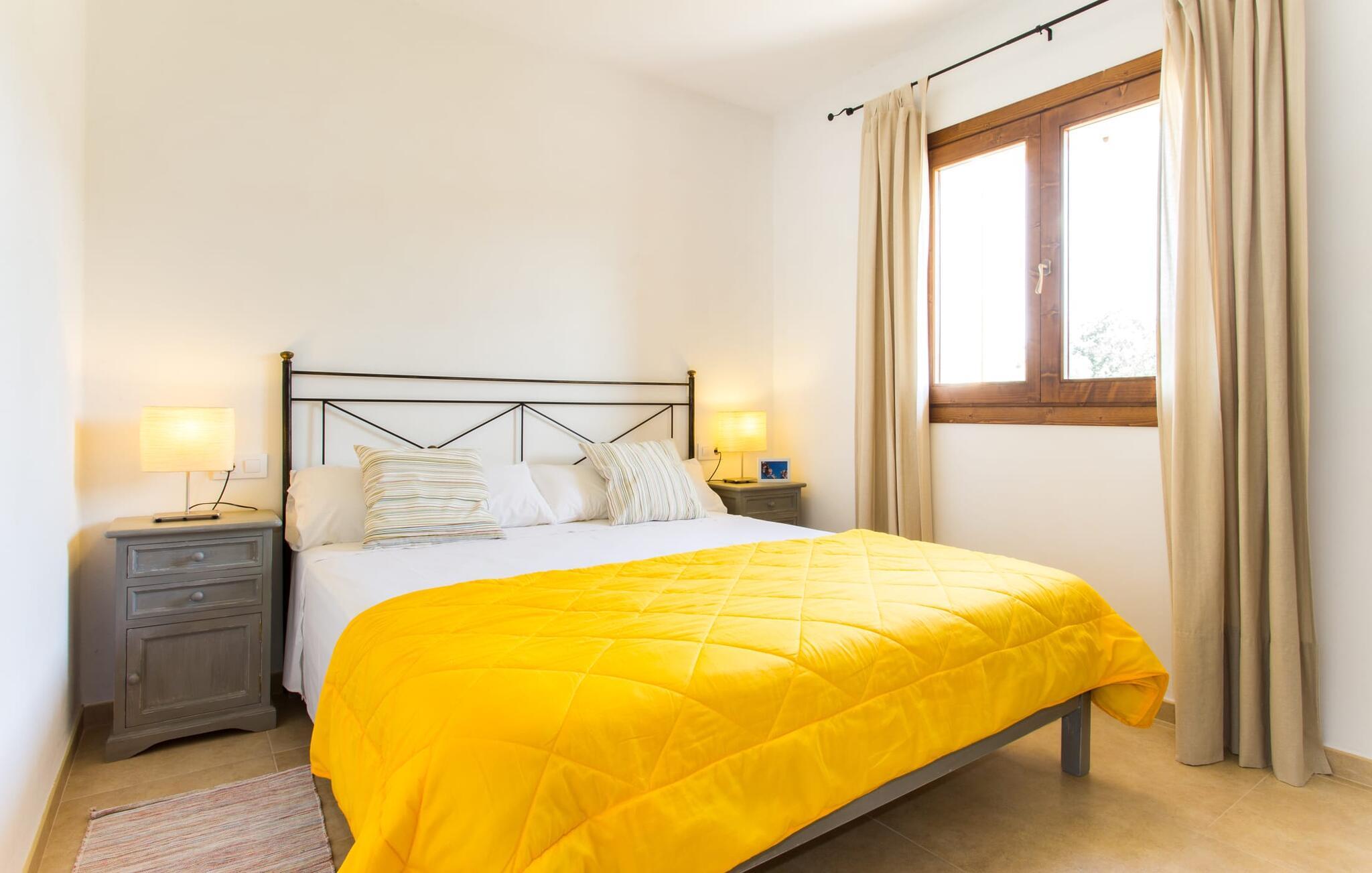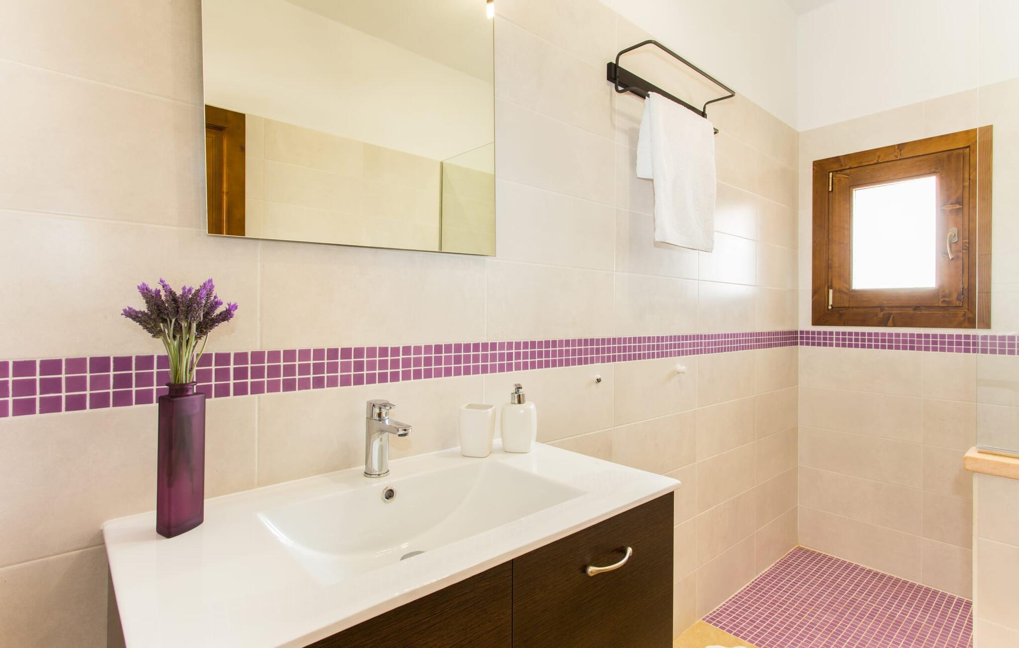 Det charmerende feriehus "Son Duri" nær Manacor er beliggende i rolige landlige omgivelser, omgivet af fladt landskab. Det næsten trinløse, rummelige udendørsareal har en rummelig græsplæne, der indbyder til leg og afslapning. Skyggefulde legeområder byder de små gæster varmt velkommen. Poolen har nem adgangstrin og et bredt siddeområde og kan sikkert indhegnes, hvis det ønskes. Solterrassen, foret med en stor pavillon og komfortable havemøbler, inviterer jer til at slappe af. En overdækket terrasse giver et hyggeligt sted til udendørs spisning, så I kan nyde måltider fra murstensgrillen, mens I holder øje med poolen. Den omfattende ejendom tilbyder en betagende udsigt over landskabet nord for Manacor og sikrer masser af privatliv. Det rummelige interiør er ideelt til en afslappende ferie med hele familien. I stueetagen finder I en lys opholds- og spisestue med siddepladser og pejs. Det moderne, veludstyrede køkken er halvåbent til spisepladsen. Der er direkte udgang til den overdækkede terrasse fra både køkken og spiseplads. Den brede bruser og døre i stueetagen gør denne del af fincaen let tilgængelig for alle. På øverste etage er der yderligere tre soveværelser med dobbeltsenge og to badeværelser. De hyggelige soveværelser byder på en smuk udsigt over det omkringliggende landskab og vinduerne kan let mørklægges med skodder. Dette dejlige feriehus nær Manacor tilbyder også pålidelig mobiltelefonmodtagelse, god WiFi og et skrivebord. Den moderne villa "Son Duri" ligger på en kæmpe ejendom på den østlige del af øen, omkring 60 km fra lufthavnen. Det er centralt beliggende, små byer og strande er i nærheden.
