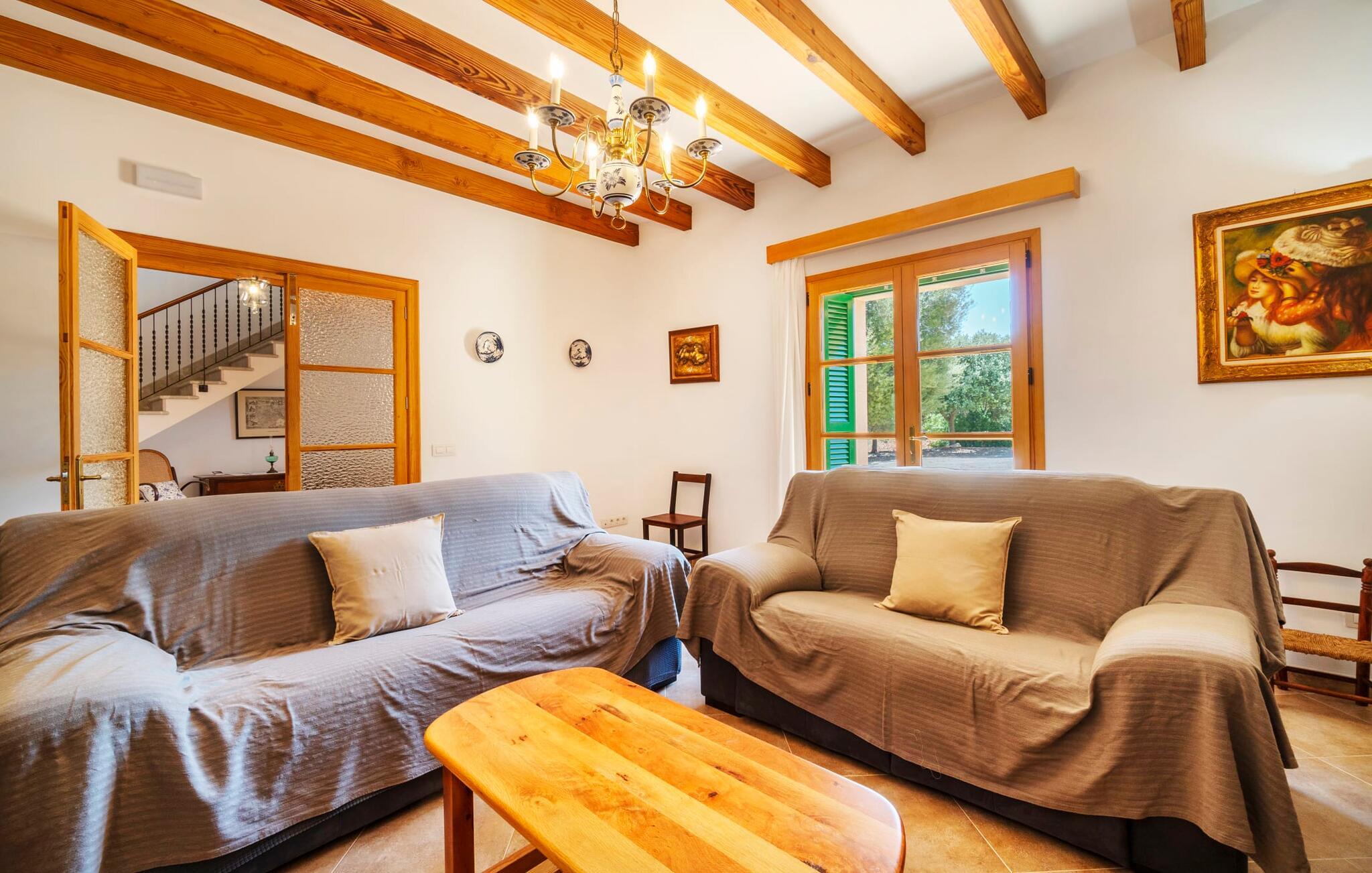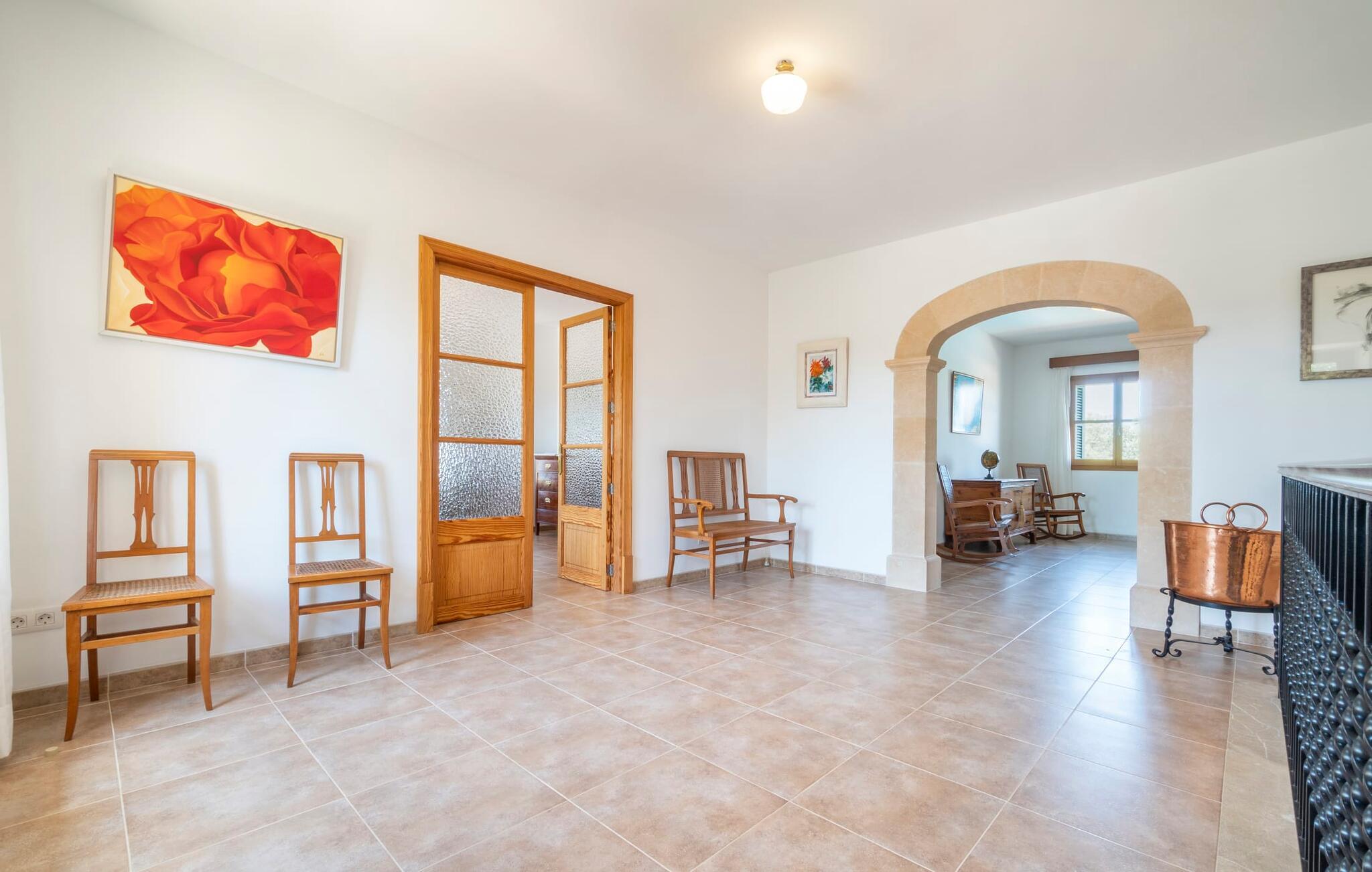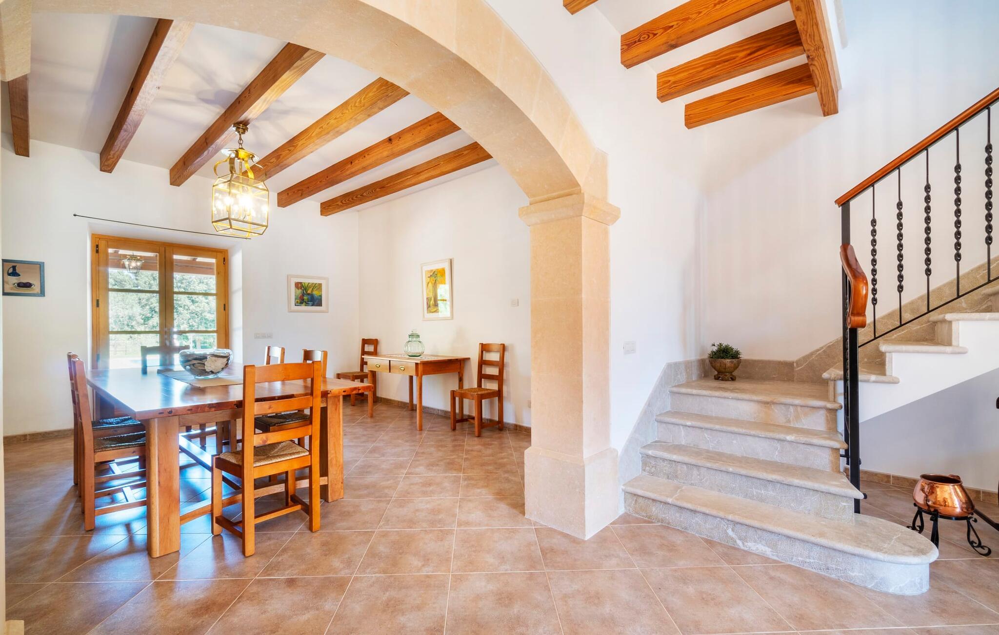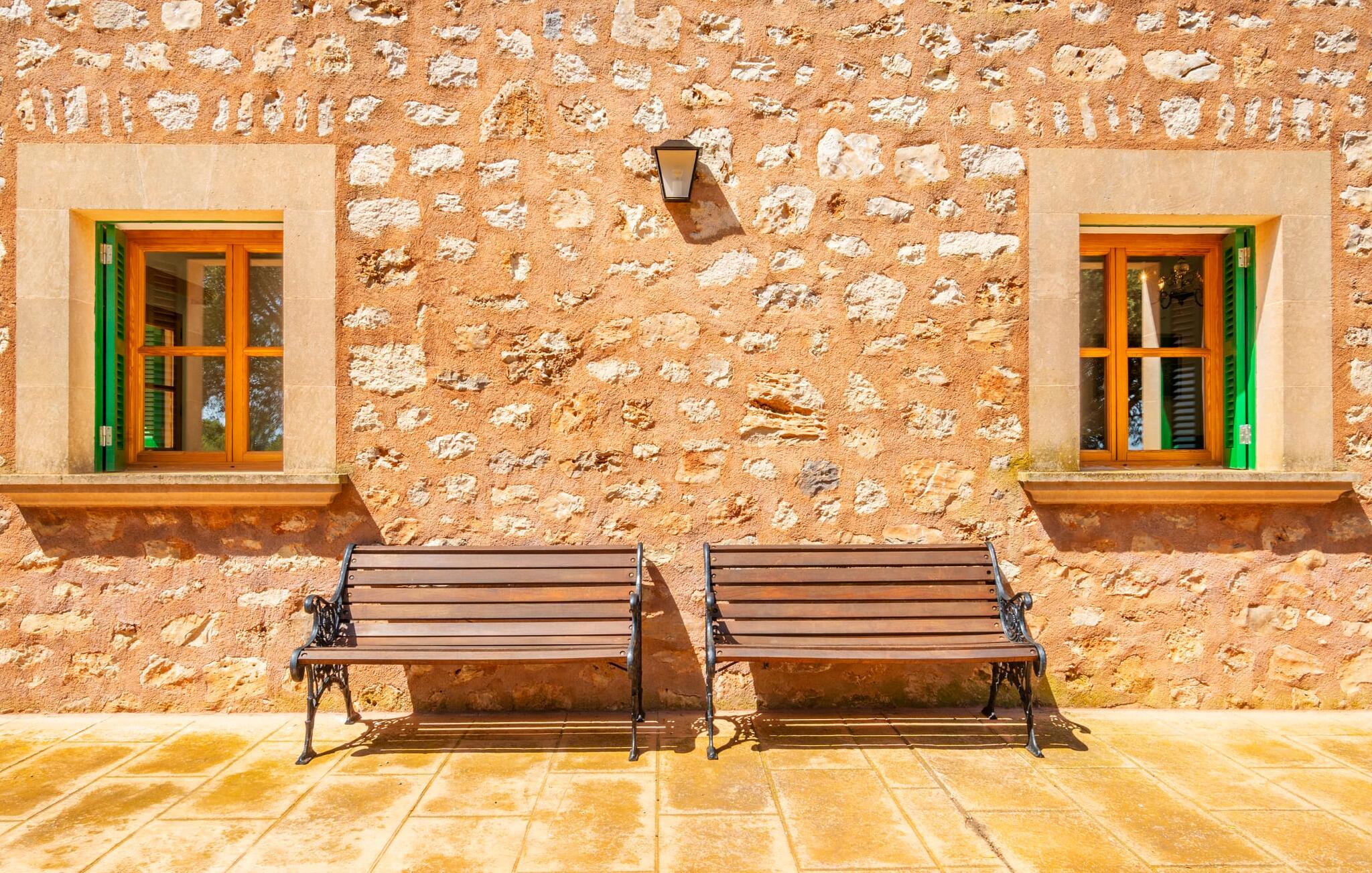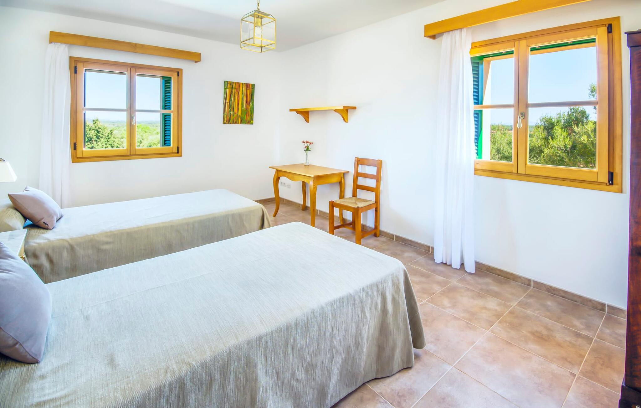 Beliggende mellem de små byer Campos og Felanitx på øen Mallorca, er villaen “Son Fadrí” en oase af fred og ro, hvor I ikke skal bekymre jer om naboerne. Den store ejendom og det omkringliggende skovområde inviterer jer til at opdage dens charme til fods eller på cykel, eller I kan læne jer tilbage, slappe af og nyde havudsigten uden at forlade komforten på jeres altan. Når I nærmer jer indkørslen til det charmerende mallorcanske landsted, vil I se "Son Fadrí" med sine rustikke grønne skodder, der krammer vinduerne, mens den kigger ud bag palmetræerne. Denne feriebolig er ideel til store grupper, der udforsker området med en eller flere biler, da der er en carport og garage med god plads til parkering. Ejendommen er nordvendt, hvilket sammen med de frodige grønne omgivelser er med til at holde jer kølig, når temperaturerne stiger. Hvis det ikke er nok, kan I altid dykke ned i den rummelige udendørs pool på den nederste terrasse. Slap af i og ud af vandet og tør af i solen på den nærliggende græsplæne. Takket være det udendørs køkken, kan I lave mad og spise udendørs uanset vejret. Vi kan ikke forestille os en bedre måde at tilbringe de lange sommerdage og nætter på! Selvfølgelig behøver I ikke opholde jer udenfor for at nyde det bedste, naturen har at byde på... Interiøret i "Son Fadrí" har træmøbler, et nik til de landlige omgivelser, med fyrretræ, arvestykker og mahogni udstillet og understrege den indlevede, hyggelige feriestemning. Værelserne er enkle og funktionelle og svarer til husets ånd. Der strømmer skarpt sollys gennem vinduerne, hvilket er nødvendigt for at dekorere villaen. Høje dobbelte glasdøre fører fra entré og gang ind i loungeområderne, som er udstyret med pejs og fjernsyn. Der er to soveværelser i stueetagen og tre på første sal med flere vaskefaciliteter, herunder separate brusere og badekar med boblebad. Og hvis I ikke vil sove alene, er der også 2 dobbeltværelser til rådighed. Et indendørs køkken med en Aga samt et praktisk udekøkken og tre spiseborde sørger for, at selv når huset er fyldt er der mad nok til alle, og der er noget for enhver smag; De perfekte ingredienser til at fejre enhver lejlighed - lad blot ejeren køre den først. Da optænding af bål ikke er tilladt om sommeren, er en elektrisk grill tilgængelig til store udendørs grill. Vi har et par ideer, hvis I virkelig vil nyde de herligheder, denne del af verden har at byde på; Den maleriske bydel Llucmajor er Mallorcas svar på Toscana og populær blandt kunstnere – I behøver kun at slentre gennem Cas Concos des Cavaller for at se hvorfor. Fordriv tiden med en espresso og mandelkage, et must for både turister og lokale, i Campos eller med et stop ved Café Colón, Plaça Espanya på vej til Palma. Tag til kysten og find skjulte perler i de sydlige kommuner Santanyi, Ses Salines og feriebyen Colònia de Sant Jordi, som tilbyder bådture til Cabrera. Og selvfølgelig miles af gyldne sandstrande, herunder Es Trenc, Cala Pí og det familievenlige Platja de Sa Rápita. Hvad mere kan I ønske dig? Omgivet af skov i en absolut rolig beliggenhed byder den smukke landvilla "Son Fadrí de Campos" på en vidunderlig udsigt over naturen. Blot 15 minutters kørsel væk ligger de travle markeder, restauranter og caféer i Campos og Felanitx. Fra Campos er Ma-19 jeres hurtigste rute til en sightseeingtur til Palma via Llucmajor eller en dag på stranden til Santanyi. De vidunderligt smukke strande i syd som Es Trenc, Platja de Sa Rápita og Ses Covetes (20 km væk) lover stranddage med caribisk flair, vandsport og bådture.