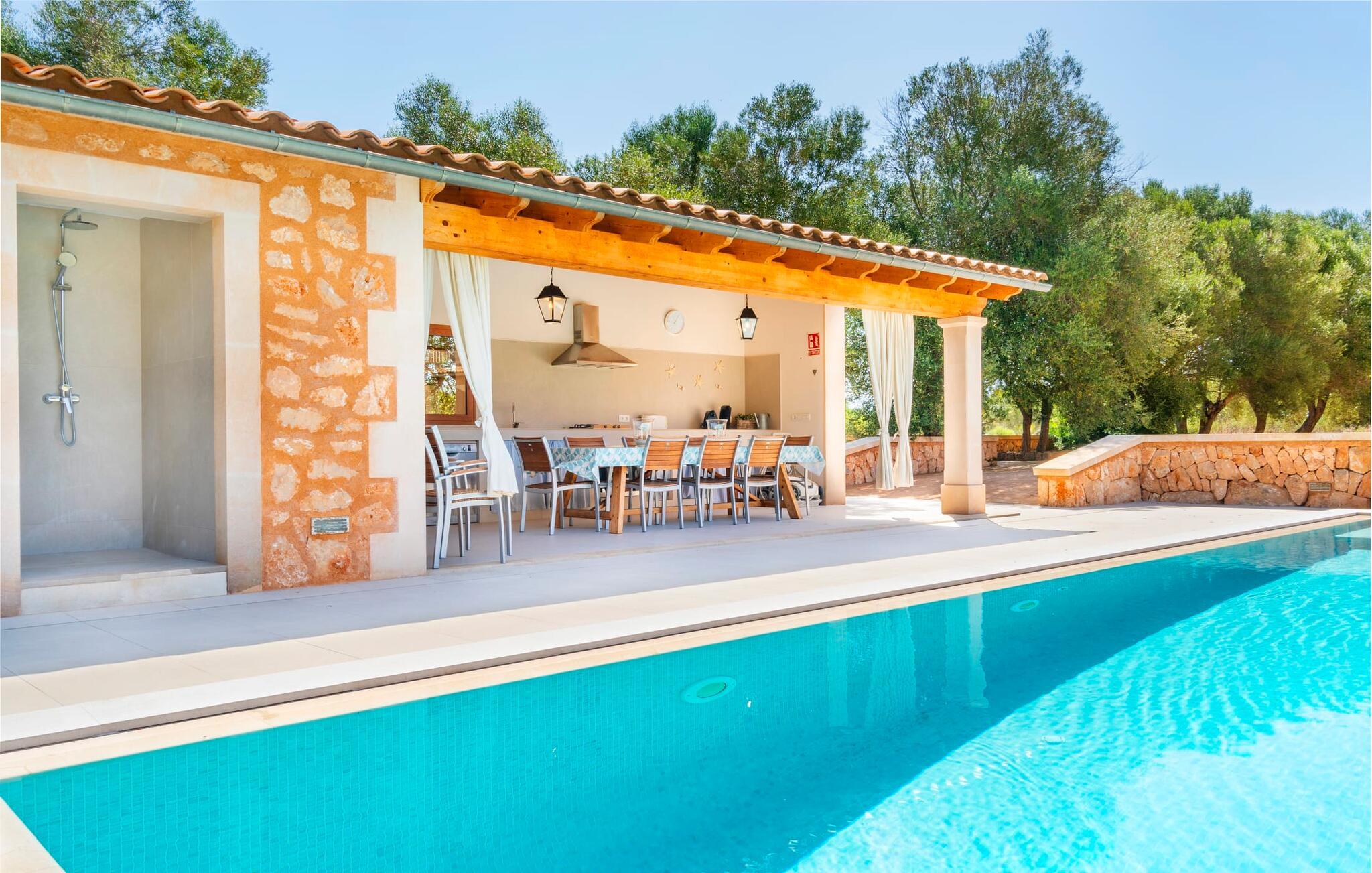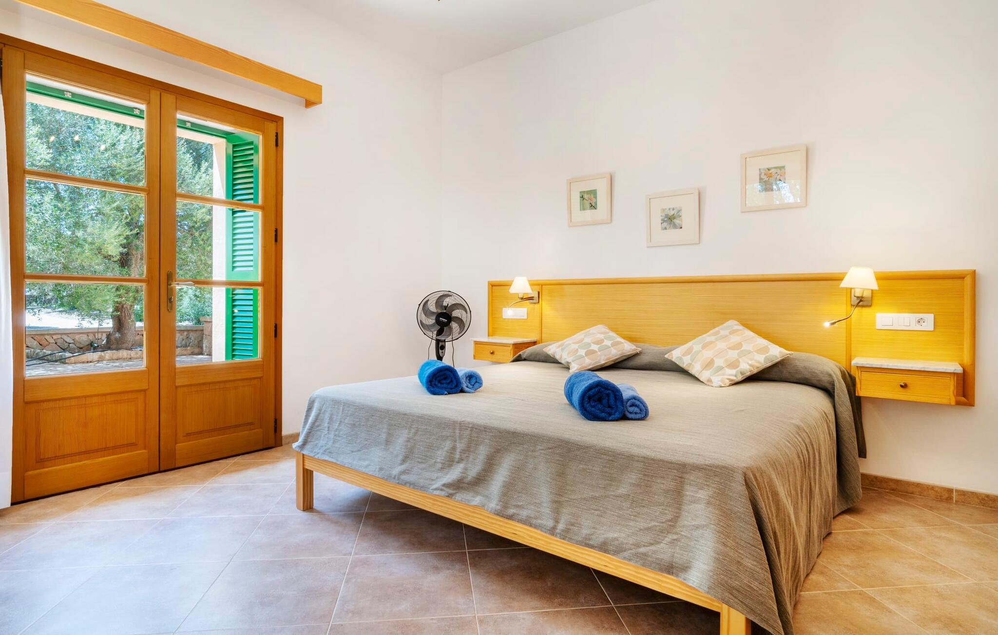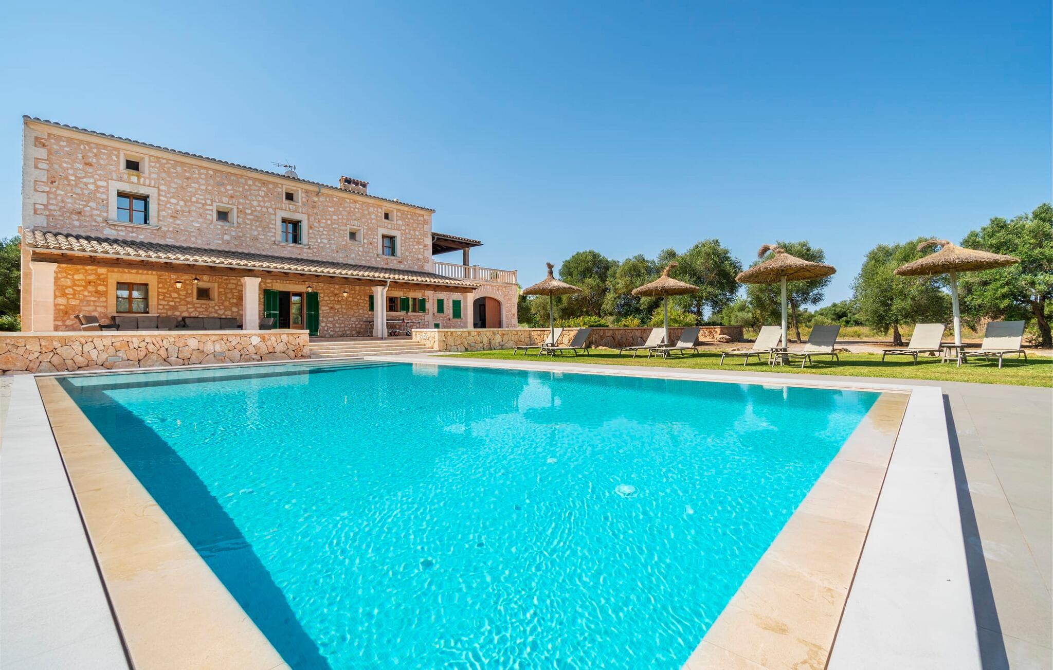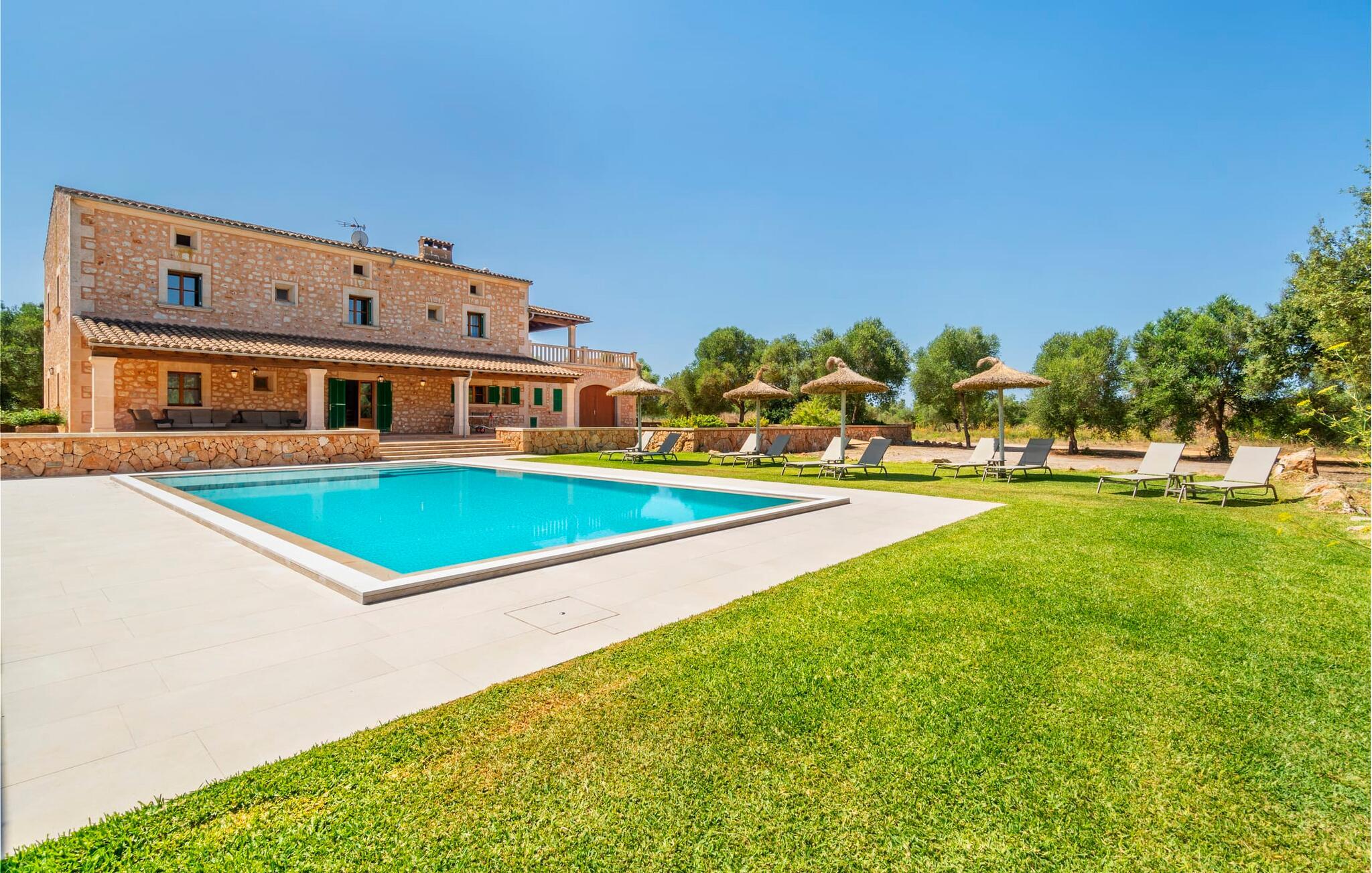 Beliggende mellem de små byer Campos og Felanitx på øen Mallorca, er villaen “Son Fadrí” en oase af fred og ro, hvor I ikke skal bekymre jer om naboerne. Den store ejendom og det omkringliggende skovområde inviterer jer til at opdage dens charme til fods eller på cykel, eller I kan læne jer tilbage, slappe af og nyde havudsigten uden at forlade komforten på jeres altan. Når I nærmer jer indkørslen til det charmerende mallorcanske landsted, vil I se "Son Fadrí" med sine rustikke grønne skodder, der krammer vinduerne, mens den kigger ud bag palmetræerne. Denne feriebolig er ideel til store grupper, der udforsker området med en eller flere biler, da der er en carport og garage med god plads til parkering. Ejendommen er nordvendt, hvilket sammen med de frodige grønne omgivelser er med til at holde jer kølig, når temperaturerne stiger. Hvis det ikke er nok, kan I altid dykke ned i den rummelige udendørs pool på den nederste terrasse. Slap af i og ud af vandet og tør af i solen på den nærliggende græsplæne. Takket være det udendørs køkken, kan I lave mad og spise udendørs uanset vejret. Vi kan ikke forestille os en bedre måde at tilbringe de lange sommerdage og nætter på! Selvfølgelig behøver I ikke opholde jer udenfor for at nyde det bedste, naturen har at byde på... Interiøret i "Son Fadrí" har træmøbler, et nik til de landlige omgivelser, med fyrretræ, arvestykker og mahogni udstillet og understrege den indlevede, hyggelige feriestemning. Værelserne er enkle og funktionelle og svarer til husets ånd. Der strømmer skarpt sollys gennem vinduerne, hvilket er nødvendigt for at dekorere villaen. Høje dobbelte glasdøre fører fra entré og gang ind i loungeområderne, som er udstyret med pejs og fjernsyn. Der er to soveværelser i stueetagen og tre på første sal med flere vaskefaciliteter, herunder separate brusere og badekar med boblebad. Og hvis I ikke vil sove alene, er der også 2 dobbeltværelser til rådighed. Et indendørs køkken med en Aga samt et praktisk udekøkken og tre spiseborde sørger for, at selv når huset er fyldt er der mad nok til alle, og der er noget for enhver smag; De perfekte ingredienser til at fejre enhver lejlighed - lad blot ejeren køre den først. Da optænding af bål ikke er tilladt om sommeren, er en elektrisk grill tilgængelig til store udendørs grill. Vi har et par ideer, hvis I virkelig vil nyde de herligheder, denne del af verden har at byde på; Den maleriske bydel Llucmajor er Mallorcas svar på Toscana og populær blandt kunstnere – I behøver kun at slentre gennem Cas Concos des Cavaller for at se hvorfor. Fordriv tiden med en espresso og mandelkage, et must for både turister og lokale, i Campos eller med et stop ved Café Colón, Plaça Espanya på vej til Palma. Tag til kysten og find skjulte perler i de sydlige kommuner Santanyi, Ses Salines og feriebyen Colònia de Sant Jordi, som tilbyder bådture til Cabrera. Og selvfølgelig miles af gyldne sandstrande, herunder Es Trenc, Cala Pí og det familievenlige Platja de Sa Rápita. Hvad mere kan I ønske dig? Omgivet af skov i en absolut rolig beliggenhed byder den smukke landvilla "Son Fadrí de Campos" på en vidunderlig udsigt over naturen. Blot 15 minutters kørsel væk ligger de travle markeder, restauranter og caféer i Campos og Felanitx. Fra Campos er Ma-19 jeres hurtigste rute til en sightseeingtur til Palma via Llucmajor eller en dag på stranden til Santanyi. De vidunderligt smukke strande i syd som Es Trenc, Platja de Sa Rápita og Ses Covetes (20 km væk) lover stranddage med caribisk flair, vandsport og bådture.
