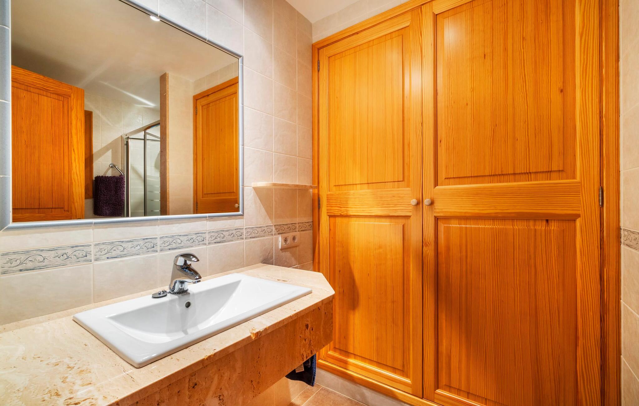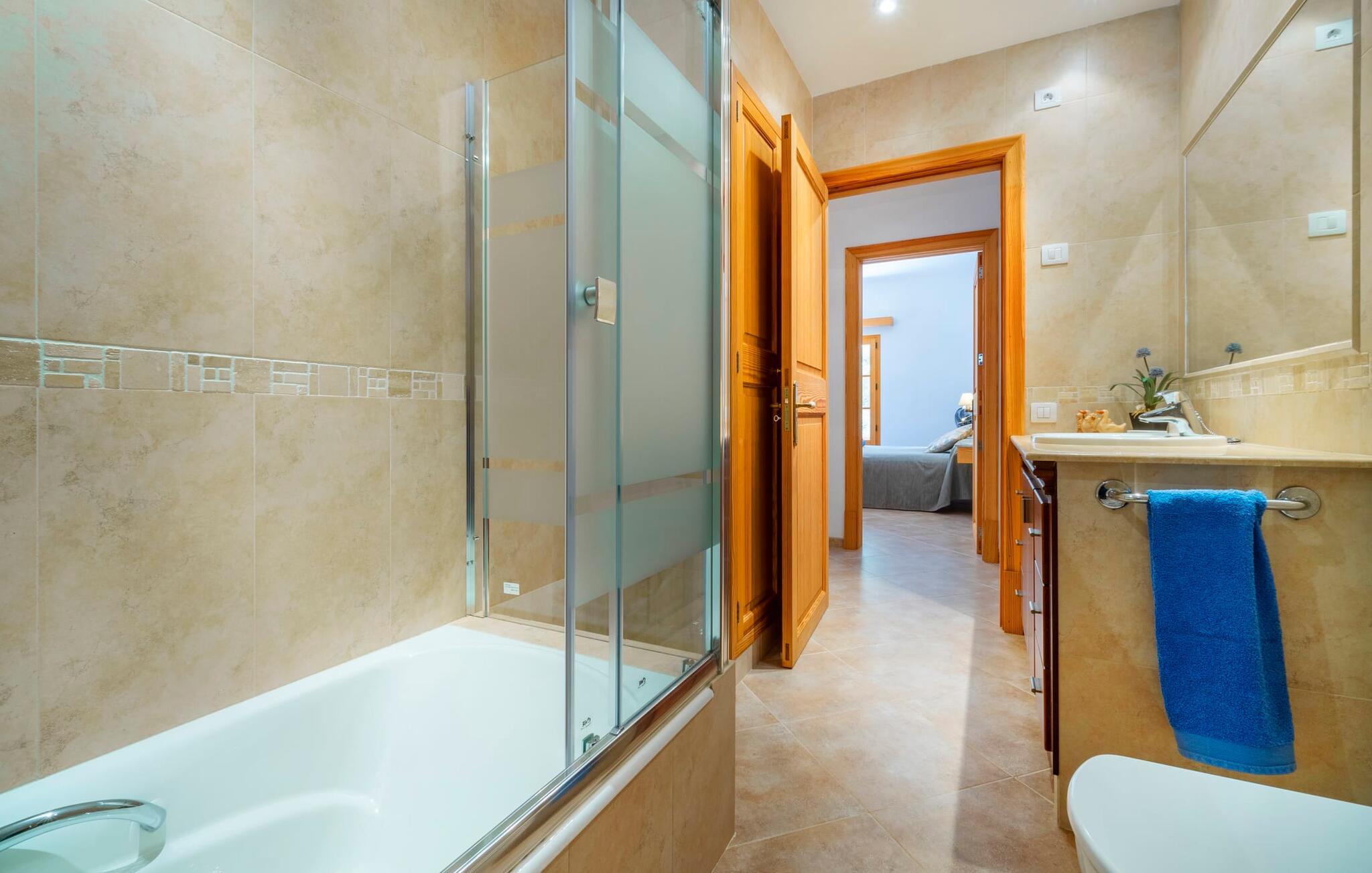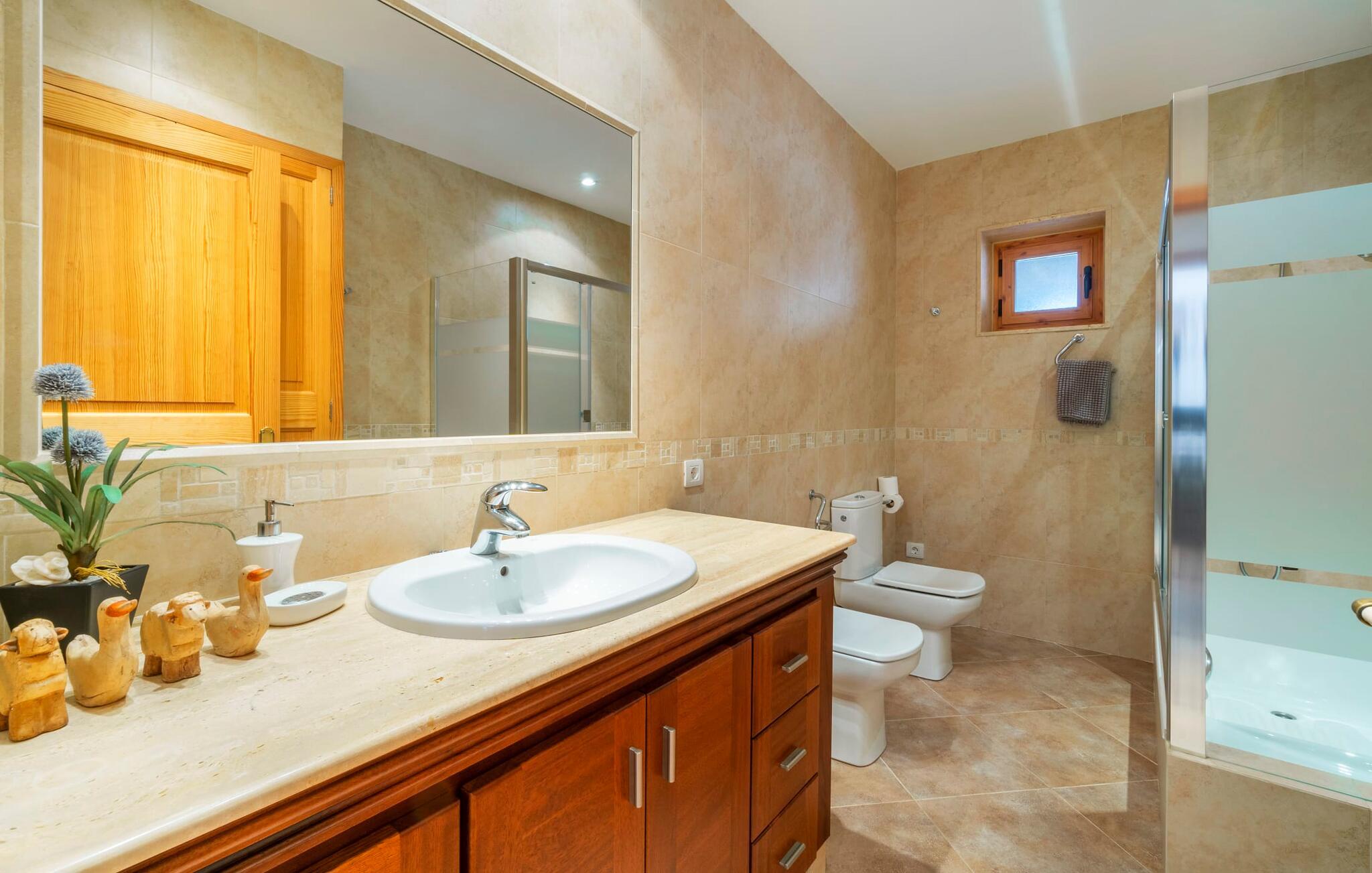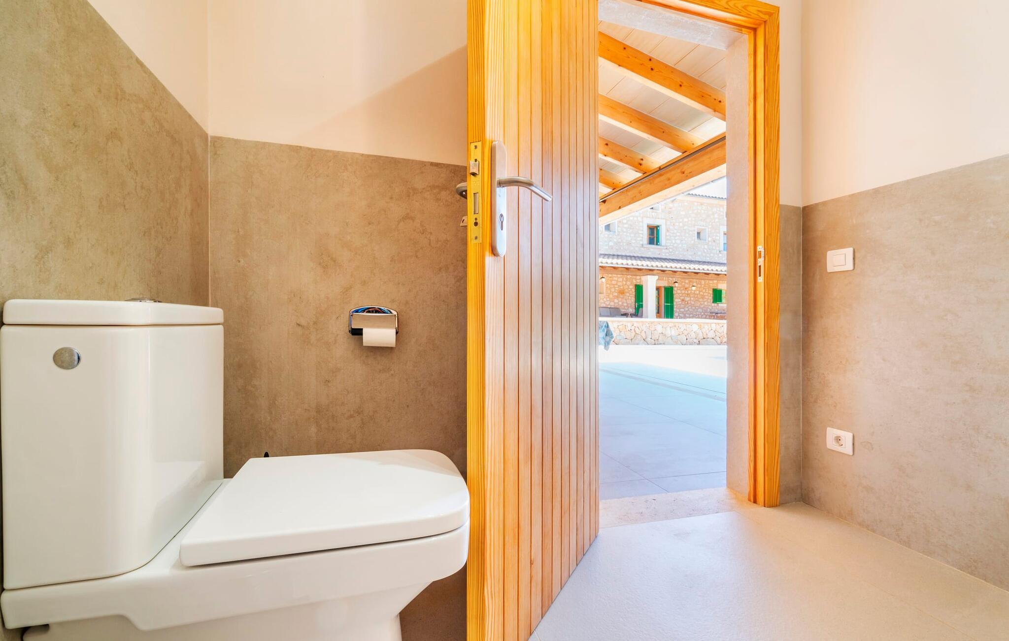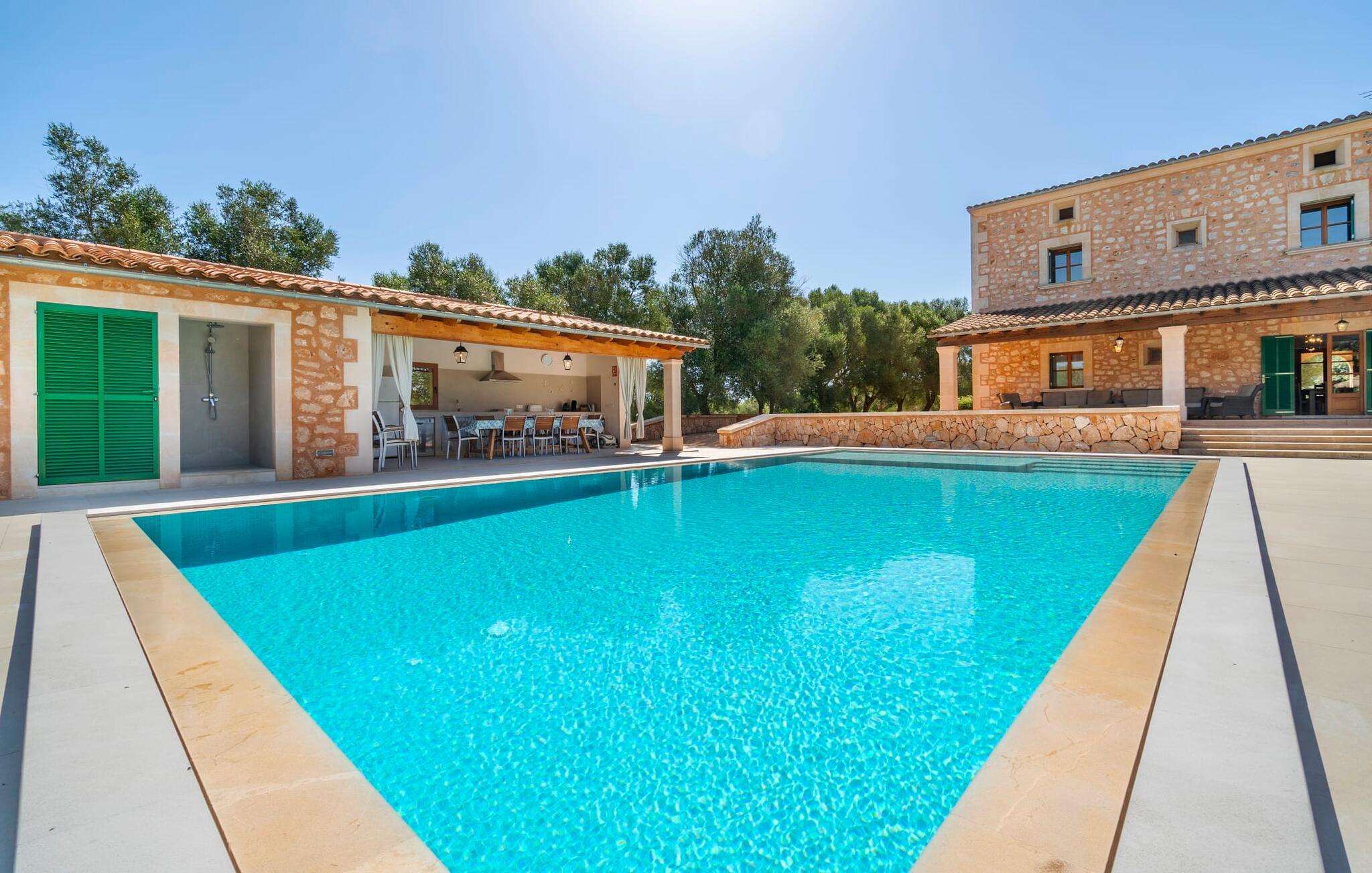 Beliggende mellem de små byer Campos og Felanitx på øen Mallorca, er villaen “Son Fadrí” en oase af fred og ro, hvor I ikke skal bekymre jer om naboerne. Den store ejendom og det omkringliggende skovområde inviterer jer til at opdage dens charme til fods eller på cykel, eller I kan læne jer tilbage, slappe af og nyde havudsigten uden at forlade komforten på jeres altan. Når I nærmer jer indkørslen til det charmerende mallorcanske landsted, vil I se "Son Fadrí" med sine rustikke grønne skodder, der krammer vinduerne, mens den kigger ud bag palmetræerne. Denne feriebolig er ideel til store grupper, der udforsker området med en eller flere biler, da der er en carport og garage med god plads til parkering. Ejendommen er nordvendt, hvilket sammen med de frodige grønne omgivelser er med til at holde jer kølig, når temperaturerne stiger. Hvis det ikke er nok, kan I altid dykke ned i den rummelige udendørs pool på den nederste terrasse. Slap af i og ud af vandet og tør af i solen på den nærliggende græsplæne. Takket være det udendørs køkken, kan I lave mad og spise udendørs uanset vejret. Vi kan ikke forestille os en bedre måde at tilbringe de lange sommerdage og nætter på! Selvfølgelig behøver I ikke opholde jer udenfor for at nyde det bedste, naturen har at byde på... Interiøret i "Son Fadrí" har træmøbler, et nik til de landlige omgivelser, med fyrretræ, arvestykker og mahogni udstillet og understrege den indlevede, hyggelige feriestemning. Værelserne er enkle og funktionelle og svarer til husets ånd. Der strømmer skarpt sollys gennem vinduerne, hvilket er nødvendigt for at dekorere villaen. Høje dobbelte glasdøre fører fra entré og gang ind i loungeområderne, som er udstyret med pejs og fjernsyn. Der er to soveværelser i stueetagen og tre på første sal med flere vaskefaciliteter, herunder separate brusere og badekar med boblebad. Og hvis I ikke vil sove alene, er der også 2 dobbeltværelser til rådighed. Et indendørs køkken med en Aga samt et praktisk udekøkken og tre spiseborde sørger for, at selv når huset er fyldt er der mad nok til alle, og der er noget for enhver smag; De perfekte ingredienser til at fejre enhver lejlighed - lad blot ejeren køre den først. Da optænding af bål ikke er tilladt om sommeren, er en elektrisk grill tilgængelig til store udendørs grill. Vi har et par ideer, hvis I virkelig vil nyde de herligheder, denne del af verden har at byde på; Den maleriske bydel Llucmajor er Mallorcas svar på Toscana og populær blandt kunstnere – I behøver kun at slentre gennem Cas Concos des Cavaller for at se hvorfor. Fordriv tiden med en espresso og mandelkage, et must for både turister og lokale, i Campos eller med et stop ved Café Colón, Plaça Espanya på vej til Palma. Tag til kysten og find skjulte perler i de sydlige kommuner Santanyi, Ses Salines og feriebyen Colònia de Sant Jordi, som tilbyder bådture til Cabrera. Og selvfølgelig miles af gyldne sandstrande, herunder Es Trenc, Cala Pí og det familievenlige Platja de Sa Rápita. Hvad mere kan I ønske dig? Omgivet af skov i en absolut rolig beliggenhed byder den smukke landvilla "Son Fadrí de Campos" på en vidunderlig udsigt over naturen. Blot 15 minutters kørsel væk ligger de travle markeder, restauranter og caféer i Campos og Felanitx. Fra Campos er Ma-19 jeres hurtigste rute til en sightseeingtur til Palma via Llucmajor eller en dag på stranden til Santanyi. De vidunderligt smukke strande i syd som Es Trenc, Platja de Sa Rápita og Ses Covetes (20 km væk) lover stranddage med caribisk flair, vandsport og bådture.