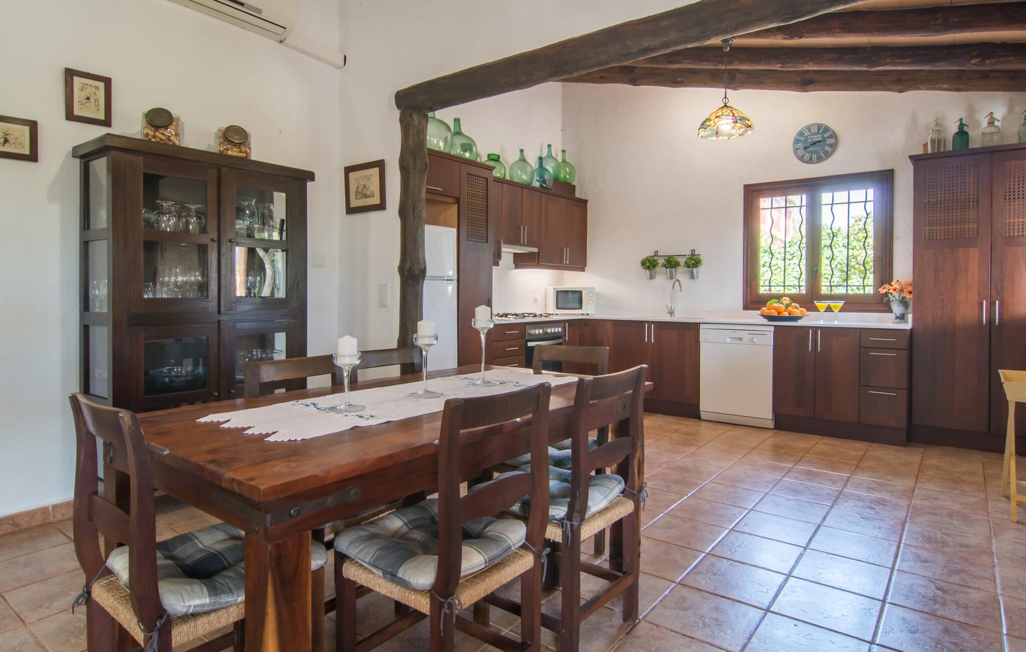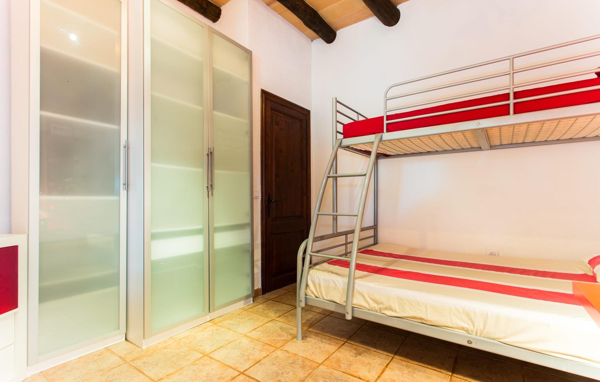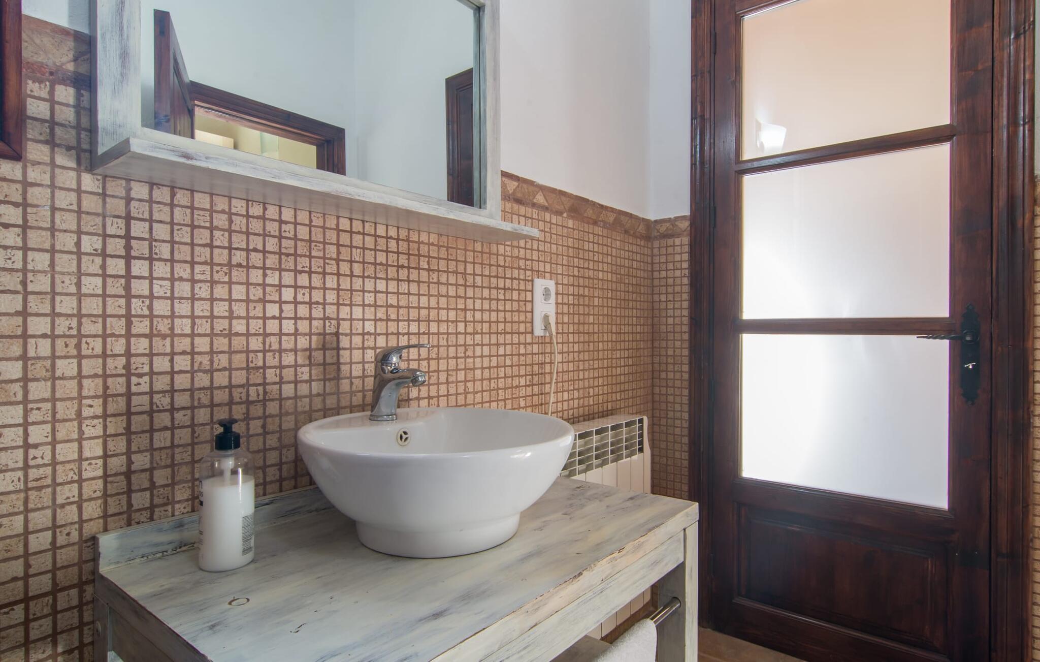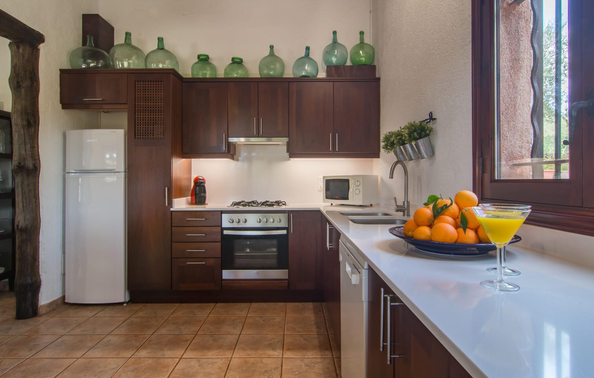 Den traditionelle villa "So Fangos" i en perfekt landlig beliggenhed lige syd for Manacor er perfekt til børn og familier. Dette kan allerede ses udefra, for eksempel ved den let hævede pool bag huset lige ved siden af et smukt, skyggefuldt skovområde med solterrasse og en lille græsplæne. Da poolområdet er indhegnet og aflåst med låge, er det sikret, at børn ikke kan lege på dette område uden opsyn. Ved poolen er der i alt seks liggestole til solbadning og to parasoller til skygge. Selve villaen er omgivet af et natursten terrasseområde omgivet af middelhavsgrønne planter. Et højt palmetræ grænser direkte op til den overdækkede terrasse langs huset. I dette område finder I et enkelt træbord med seks komfortable træstole - en fantastisk udendørs spiseplads kun få meter fra husets indgang og køkken. På den anden side af verandaen er der et loungeområde - perfekt om aftenen, når børnene er i seng, og man bare vil nyde græshoppernes kvidren og det milde klima med en sidste drink. På bagsiden af huset er der endnu en lille overdækket terrasse med siddeplads til vores folk. Det fine ved denne terrasse er, at den er direkte tilgængelig fra to af de tre soveværelser. Terrassen er desuden omgivet af en træport og kan lukkes med en dør. Der er en basketballbane til rådighed for gæsterne. Bagefter kan I tage en forfriskende svømmetur i den private pool. Den familievenlige karakter og design bekræftes også inde i villaen. Vi kan især godt lide, at villaen efter restaureringen har et stort spise-/opholds- og køkkenområde, som kombinerer alle de funktioner, som en familie bruger sammen (bortset fra de private områder i soveværelset, naturligvis) til et fælles opholdsrum. Træbordet med træstole står midt i rummet. Her er plads nok, hvilket giver rummet en rummelig følelse. Væggene er dekoreret med landbrugsredskaber, der illustrerer den oprindelige landbrugsmæssige anvendelse af denne ejendom. Til højre for spisepladsen er det åbne køkkenområde, hvor loftsbjælkerne af egetræ er synlige. Det smarte, mørke trækøkken behøver ikke at gemme sig i et lukket rum. Det fulde tekniske udstyr gør selvforplejning til jeres individuelle ferie let. Til venstre for spisepladsen, adskilt af en egetræsbue, er der en hyggelig opholdsstue malet i solgul. Sorte lædermøbler som et hyggeligt opholdsområde foran en støbejernspejs og foran det moderne LCD-tv inviterer til en hyggelig aften. Fra stuen når man master soveværelset med en 1,60 m bred dobbeltseng og en-suite badeværelse. De to andre soveværelser er i gangen, der fører væk fra spisepladsen. De to soveværelser deler badeværelse, hvor begge badeværelser er udstyret med moderne walk-in brusere. Det ene af de to soveværelser er udstyret med en 1,60 m bred dobbeltseng, det tredje soveværelse er et klassisk børneværelse med en dobbelt køjeseng, mens den nederste seng har en queen-size seng på 1,40 m. Fra disse to soveværelser er der også udgang til den lille børnesikre indhegnede terrasse. I kan starte dagen med en kop kaffe i morgensolen, inden I begynder at planlægge jeres dag og tænke over, hvor I gerne vil hen på jeres næste tur. Den fordelagtige beliggenhed i den frugtbare slette i centrum af øen, den såkaldte "Pla de Mallorca", giver den fordel, at I herfra kan opdage Mallorcas forskellige attraktioner. På grund af nærheden til vejen (som kan høres afhængig af vinden) kan I hurtigt nå Manacor på 3,5 km, hvor I ikke kun kan gøre jeres daglige indkøb, men også shoppe og slentre i en af øens største byer . Og I kan nemt nå kystbyerne som Porto Cristo, hvor I kan slentre langs promenaden og få en snack på en af caféerne og restauranterne. Et besøg i drypstenshulerne nær Artà, "Coves des Dracs", er ikke kun interessant for børn. For en dag ved havet kan I vælge mellem østkystens smukke strande, kendt som "Calas de Mallorca". Her finder I fantastiske, næsten uberørte naturstrande som Cala Varques. Sidst på dagen venter den autentiske villa "Son Fangos" sine gæster, og I kan slappe af med en svømmetur i poolen eller en grillaften og nyde samværet med jeres familie eller som par, for villaen kan lejes på et nedsat pris for to personer. Den typiske mallorcanske villa "Son Fangos" ligger lidt væk fra byen Manacor på vej til Felanitx. Gør jeres daglige indkøb hurtigt og nemt i nærliggende Manacor, hvor der også er et smukt bondemarked hver mandag. De smukke strande, herunder den ensomme og næsten uberørte naturlige bugt "Cala Varques", kan nemt nås med lejebil.