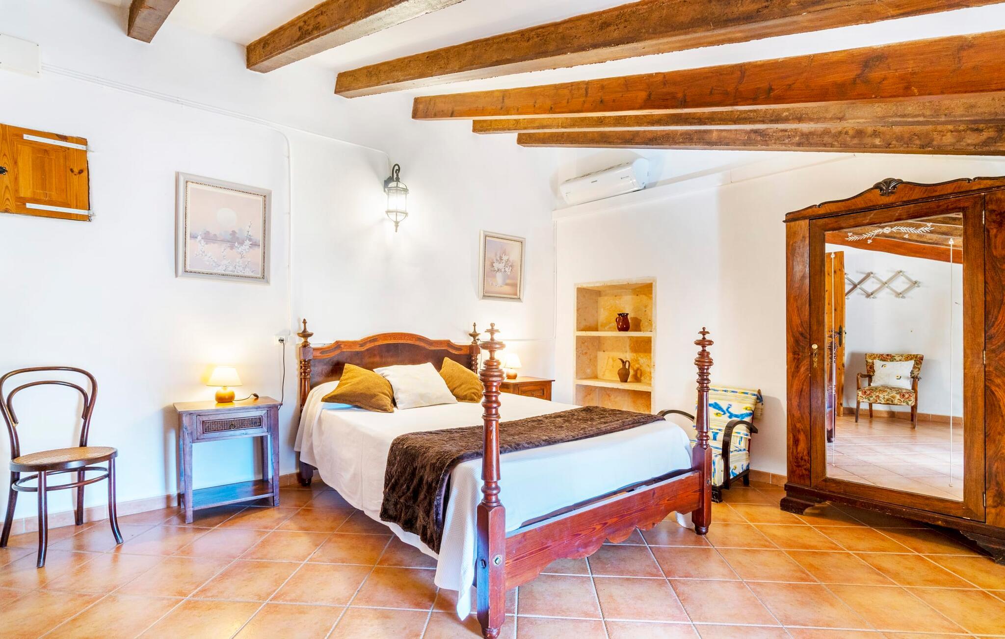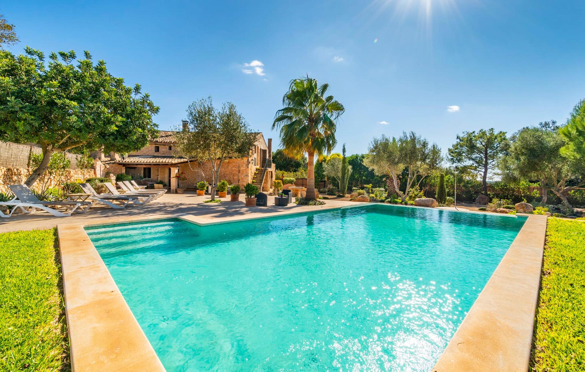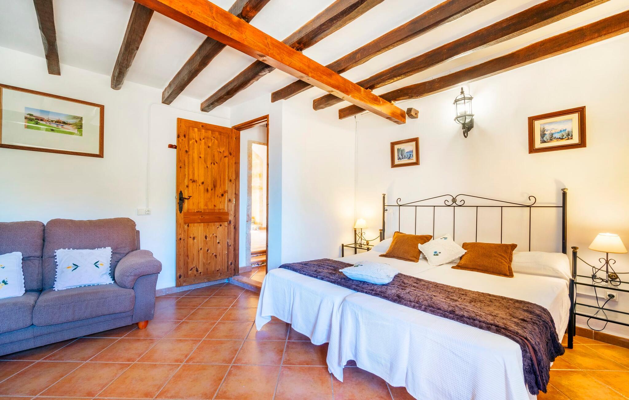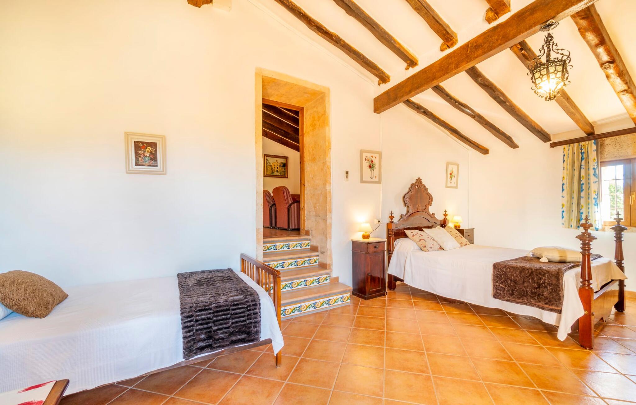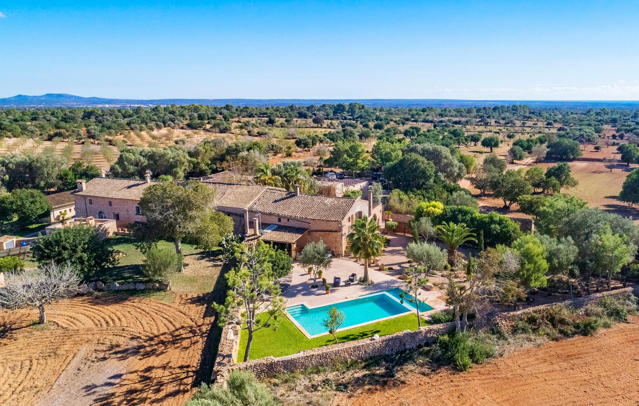 Den godt gemte villa “Son Gabriela” byder sine gæster velkommen i en helt landlig atmosfære og med en utrolig ro, der omgiver ejendommen. I den rummelige have, der stort set er dækket af let sandstensgrus, vil selv tilflyttere straks føle sig hjemme og få lyst til at blive. En lille græsplæne ved siden af poolen skaber et interessant og varieret overordnet udseende og tilbyder et malerisk legeområde for alle børn, der rejser med jer. Der er terrasser mellem huset og poolen, hver med adskillige dejlige siddepladser, hvor I kan slappe af i det fri. Siddepladserne, som blev bygget direkte ind i de små naturstensvægge, er særdeles elegante og indbydende. Dette er et fantastisk sted at fordrive tiden og lade jeres blik vandre over haven. Lige ved siden af huset ligger den overdækkede terrasse, som giver de perfekte rammer til at spise sammen takket være sit store spisebord. Her er også bekvemt installeret en indbygget grill, så I frisk kan tilberede og nyde regionens lækkerier. En stilfuld dobbeltpool, dekoreret med turkise mosaikfliser, er et rigtigt blikfang for store og små. Her kan I køle ned og finde en behagelig forfriskning på varme dage. Den store pool er let tilgængelig via en bred trappe og har en maksimal dybde på 1,90 m. Der er så meget privat jord omkring selve ejendommen, at enhver, der lejer denne ejendom, praktisk talt kan gå en tur uden at skulle vove sig ud af sin egen lille. areal. Med denne ejendom bor I så at sige i et dobbelthus. Den anden del af huset er dog ubeboet, så I kan nyde jeres ferie i fuldstændig privatlivets fred. Huset har egen parkeringsplads, som ligger ca. 20 m fra ejendommen. Selve huset er opdelt som følger: I stueplan er der en fantastisk entré, et rummeligt køkken med spisebord, en tv-stue og et badeværelse. Der er også en trappe, der fører til kælderen. De fire soveværelser og to badeværelser er placeret på øverste etage. En af dem er tilgængelig udefra, så man kan få adgang til badeværelset fra soveværelset via altanen. Det indre af villaen "Son Gabriela" er designet i den typiske mallorcanske stil, hvilket giver ejendommen en særlig rustik atmosfære. I hele ejendommen vil I støde på en overflod af smukke, ægte antikke møbler, som harmonerer perfekt med de farverige vægge, synlige bjælker og terracotta fliser. Her og der ses dekorative naturstenselementer. En række forskellige opholdsområder gør det nemt for jer at sprede jer efter hjertens lyst og finde mindst et af de mange indbydende steder, der inviterer jer til at slappe af. Det hyggelige køkken er veludstyret til jeres daglige behov og byder på alt fra en kedel til en filterkaffemaskine. Til kølige aftener er der endda en pejs, hvor I kan sidde sammen ved spisebordet og nyde et måltid. I spektakulært smukke soveværelser kan alle finde et sted at hvile, der passer præcis til deres behov. Også her finder vi antik flair og et absolut charmerende arrangement. Badeværelserne er indrettet i en moderne og meget smagfuld stil. Det er ikke nødvendigt at medbringe eget strygejern og hårtørrer, da disse allerede er tilgængelige på stedet og kan benyttes gratis under jeres ferie. I kan bekvemt opbevare jeres mad køligt i kælderen. Har I lyst til at tage ud og gå på opdagelse, kan I bruge en dag på en af de populære strande i området. Disse omfatter blandt andre Platja de sa Rapita og Es Freu de Ses Covetes. Det flade, landlige landskab omkring Llucmajor har også et veludviklet netværk af cykelstier, som enhver sportsentusiast vil nyde. Der er et landmandsmarked i Llucmajor tre dage om ugen: søndage, onsdage og fredage. Efter at have handlet efter det, I har brug for på markedet, kan I besøge en af de smukke caféer på Plaça Espanya og fortsætte med at se travlheden omkring jer, før I tager hjem til jeres tilflugtssted "Son Gabriela" og selv ser jer omkring. Tilbring dagen i måden I vælger. Villaen "Son Gabriela" er et charmerende tilflugtssted i den sydlige del af øen, omkring 7 km sydøst for Llucmajor. De lokale strande er nemme at nå. Ø-metropolen Palma de Mallorca ligger omkring 30 minutter væk i bil.
