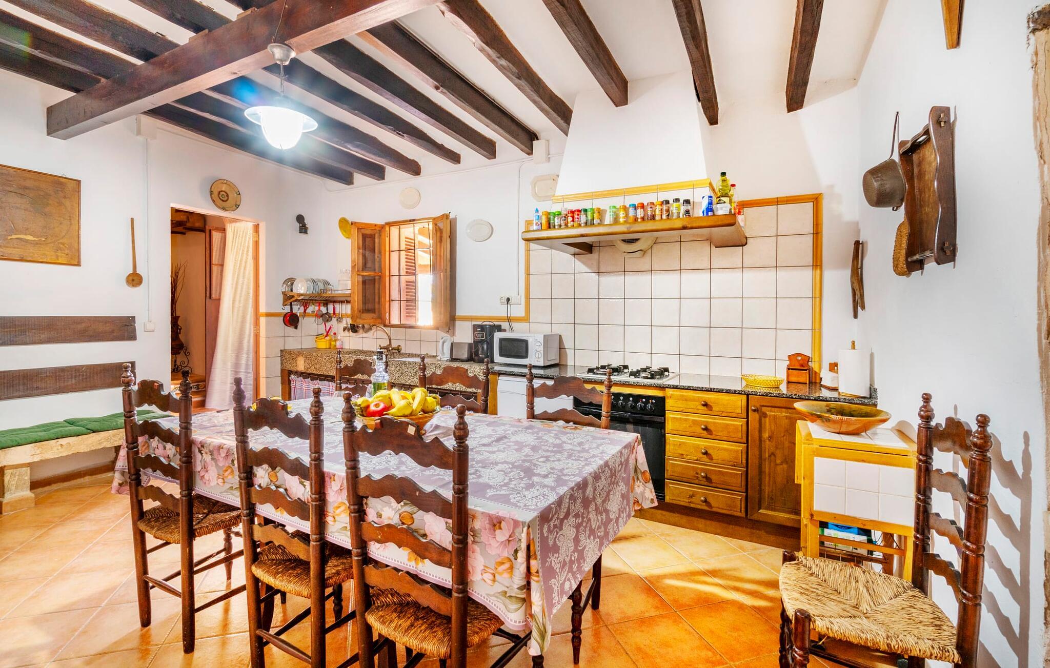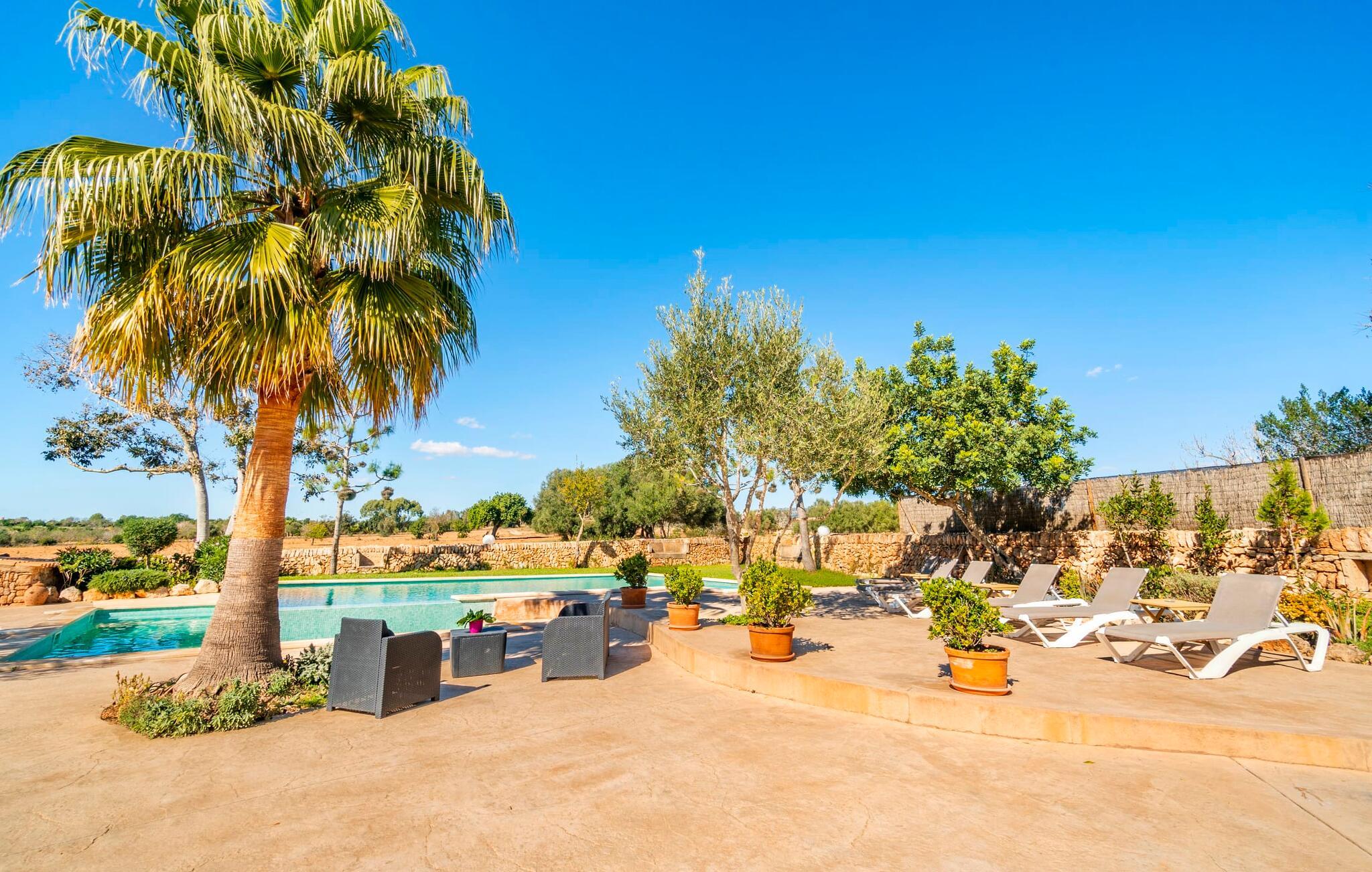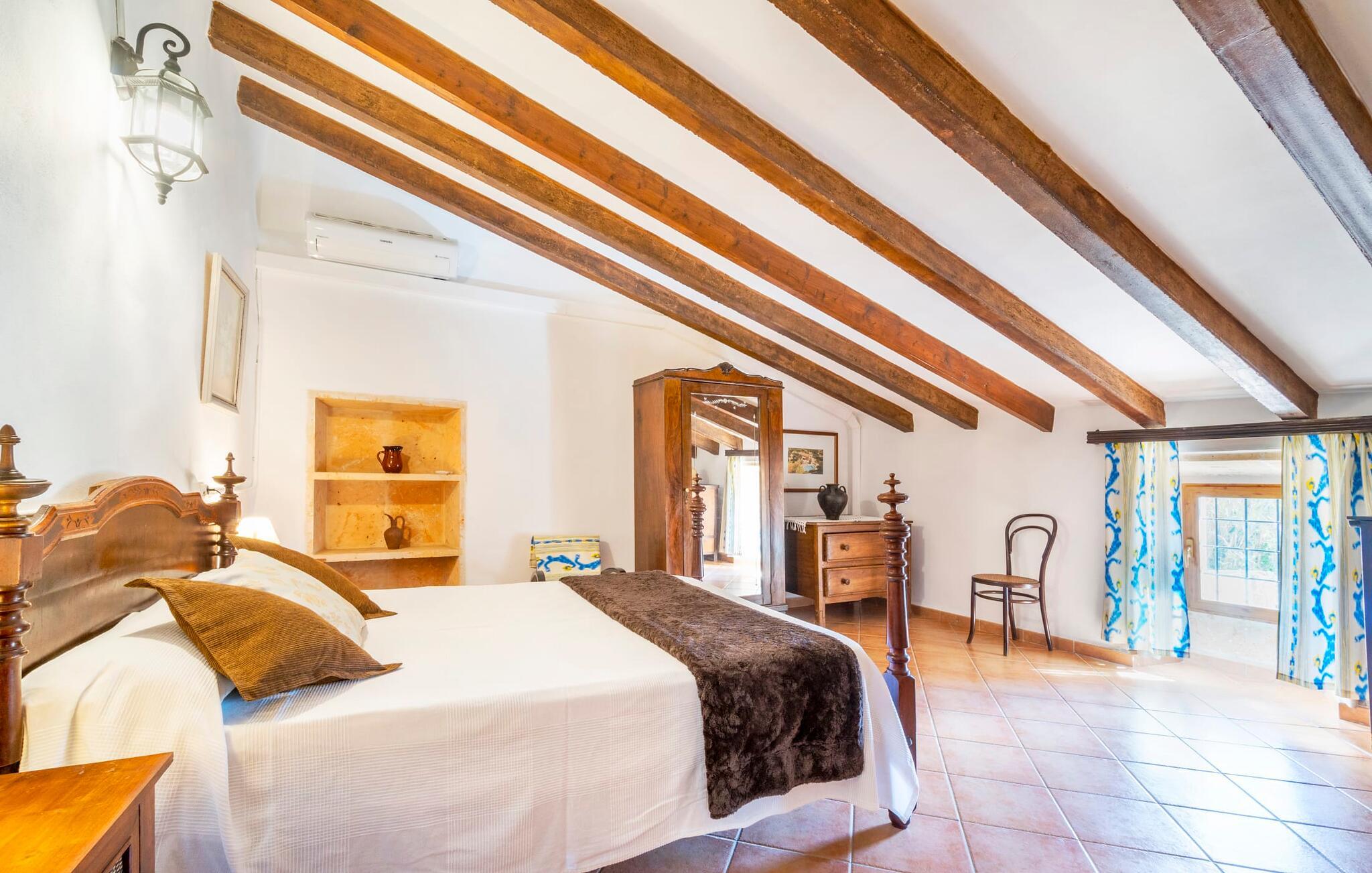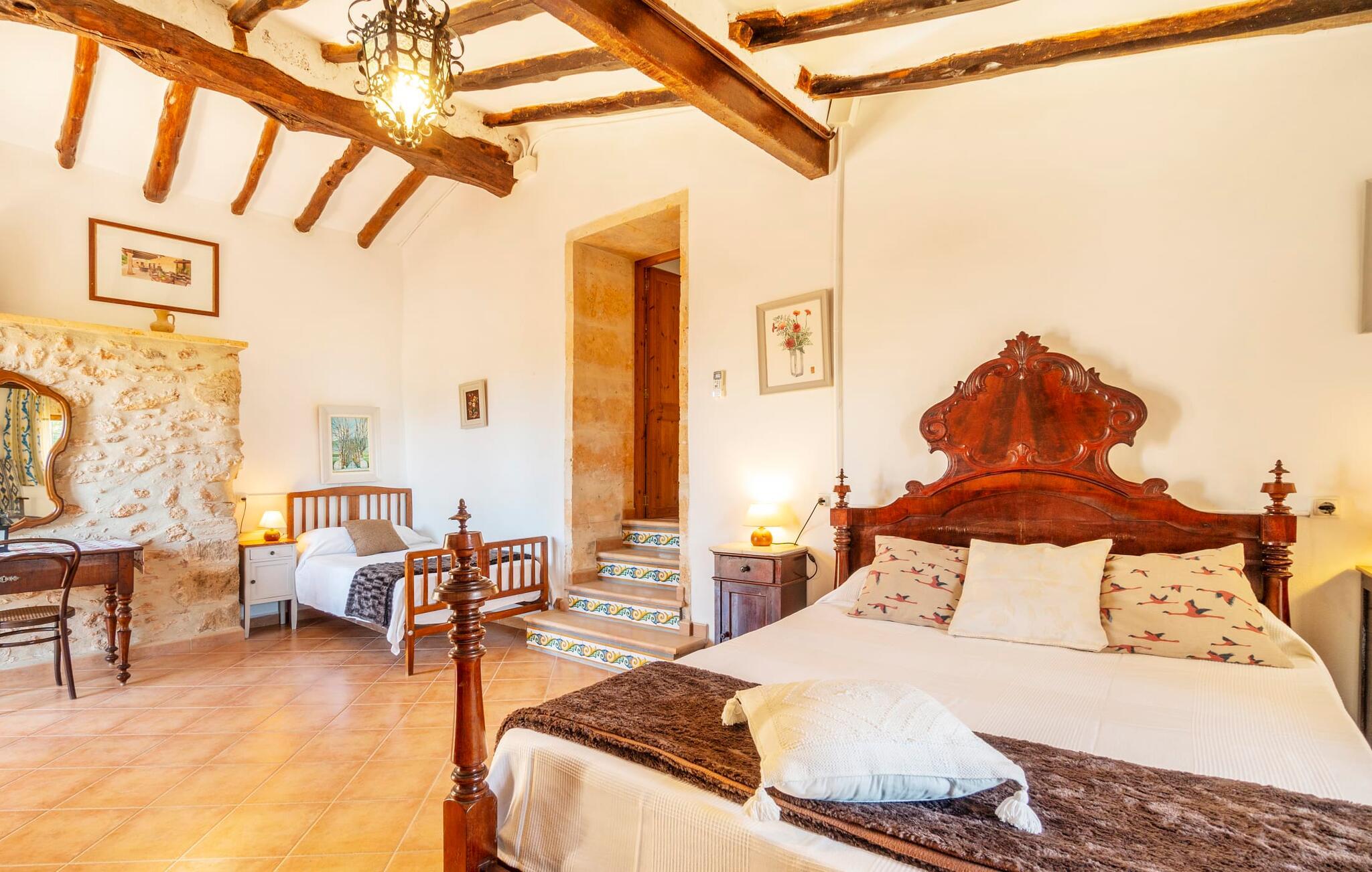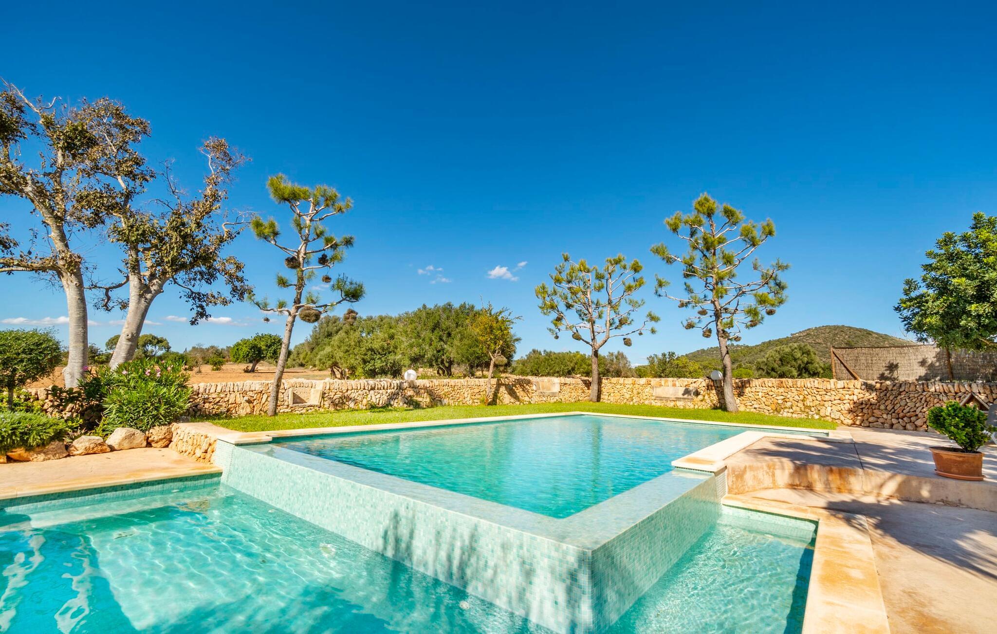 Den godt gemte villa “Son Gabriela” byder sine gæster velkommen i en helt landlig atmosfære og med en utrolig ro, der omgiver ejendommen. I den rummelige have, der stort set er dækket af let sandstensgrus, vil selv tilflyttere straks føle sig hjemme og få lyst til at blive. En lille græsplæne ved siden af poolen skaber et interessant og varieret overordnet udseende og tilbyder et malerisk legeområde for alle børn, der rejser med jer. Der er terrasser mellem huset og poolen, hver med adskillige dejlige siddepladser, hvor I kan slappe af i det fri. Siddepladserne, som blev bygget direkte ind i de små naturstensvægge, er særdeles elegante og indbydende. Dette er et fantastisk sted at fordrive tiden og lade jeres blik vandre over haven. Lige ved siden af huset ligger den overdækkede terrasse, som giver de perfekte rammer til at spise sammen takket være sit store spisebord. Her er også bekvemt installeret en indbygget grill, så I frisk kan tilberede og nyde regionens lækkerier. En stilfuld dobbeltpool, dekoreret med turkise mosaikfliser, er et rigtigt blikfang for store og små. Her kan I køle ned og finde en behagelig forfriskning på varme dage. Den store pool er let tilgængelig via en bred trappe og har en maksimal dybde på 1,90 m. Der er så meget privat jord omkring selve ejendommen, at enhver, der lejer denne ejendom, praktisk talt kan gå en tur uden at skulle vove sig ud af sin egen lille. areal. Med denne ejendom bor I så at sige i et dobbelthus. Den anden del af huset er dog ubeboet, så I kan nyde jeres ferie i fuldstændig privatlivets fred. Huset har egen parkeringsplads, som ligger ca. 20 m fra ejendommen. Selve huset er opdelt som følger: I stueplan er der en fantastisk entré, et rummeligt køkken med spisebord, en tv-stue og et badeværelse. Der er også en trappe, der fører til kælderen. De fire soveværelser og to badeværelser er placeret på øverste etage. En af dem er tilgængelig udefra, så man kan få adgang til badeværelset fra soveværelset via altanen. Det indre af villaen "Son Gabriela" er designet i den typiske mallorcanske stil, hvilket giver ejendommen en særlig rustik atmosfære. I hele ejendommen vil I støde på en overflod af smukke, ægte antikke møbler, som harmonerer perfekt med de farverige vægge, synlige bjælker og terracotta fliser. Her og der ses dekorative naturstenselementer. En række forskellige opholdsområder gør det nemt for jer at sprede jer efter hjertens lyst og finde mindst et af de mange indbydende steder, der inviterer jer til at slappe af. Det hyggelige køkken er veludstyret til jeres daglige behov og byder på alt fra en kedel til en filterkaffemaskine. Til kølige aftener er der endda en pejs, hvor I kan sidde sammen ved spisebordet og nyde et måltid. I spektakulært smukke soveværelser kan alle finde et sted at hvile, der passer præcis til deres behov. Også her finder vi antik flair og et absolut charmerende arrangement. Badeværelserne er indrettet i en moderne og meget smagfuld stil. Det er ikke nødvendigt at medbringe eget strygejern og hårtørrer, da disse allerede er tilgængelige på stedet og kan benyttes gratis under jeres ferie. I kan bekvemt opbevare jeres mad køligt i kælderen. Har I lyst til at tage ud og gå på opdagelse, kan I bruge en dag på en af de populære strande i området. Disse omfatter blandt andre Platja de sa Rapita og Es Freu de Ses Covetes. Det flade, landlige landskab omkring Llucmajor har også et veludviklet netværk af cykelstier, som enhver sportsentusiast vil nyde. Der er et landmandsmarked i Llucmajor tre dage om ugen: søndage, onsdage og fredage. Efter at have handlet efter det, I har brug for på markedet, kan I besøge en af de smukke caféer på Plaça Espanya og fortsætte med at se travlheden omkring jer, før I tager hjem til jeres tilflugtssted "Son Gabriela" og selv ser jer omkring. Tilbring dagen i måden I vælger. Villaen "Son Gabriela" er et charmerende tilflugtssted i den sydlige del af øen, omkring 7 km sydøst for Llucmajor. De lokale strande er nemme at nå. Ø-metropolen Palma de Mallorca ligger omkring 30 minutter væk i bil.