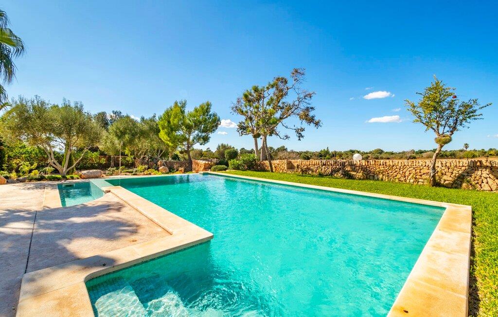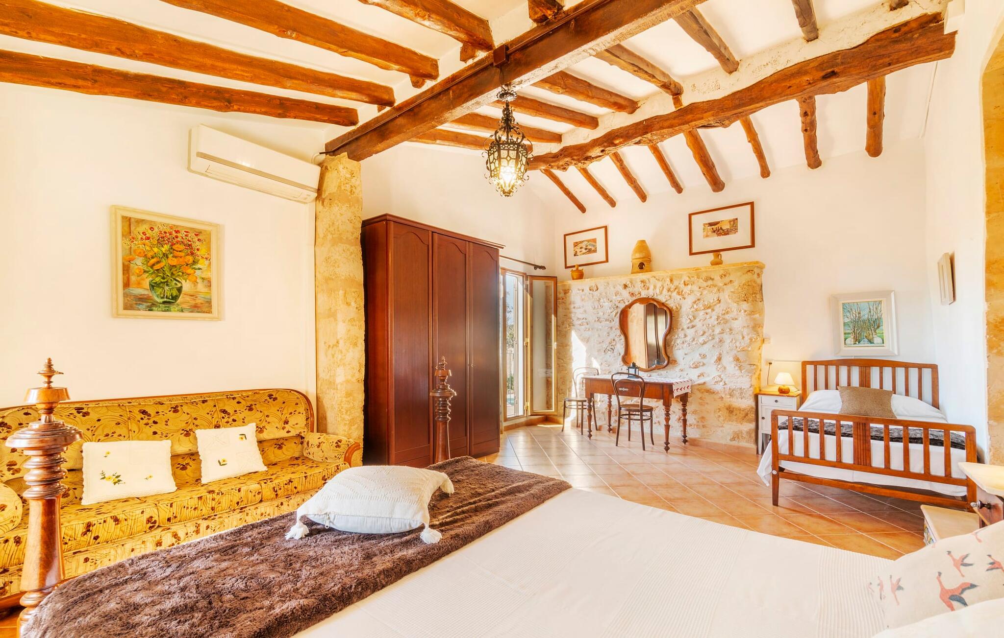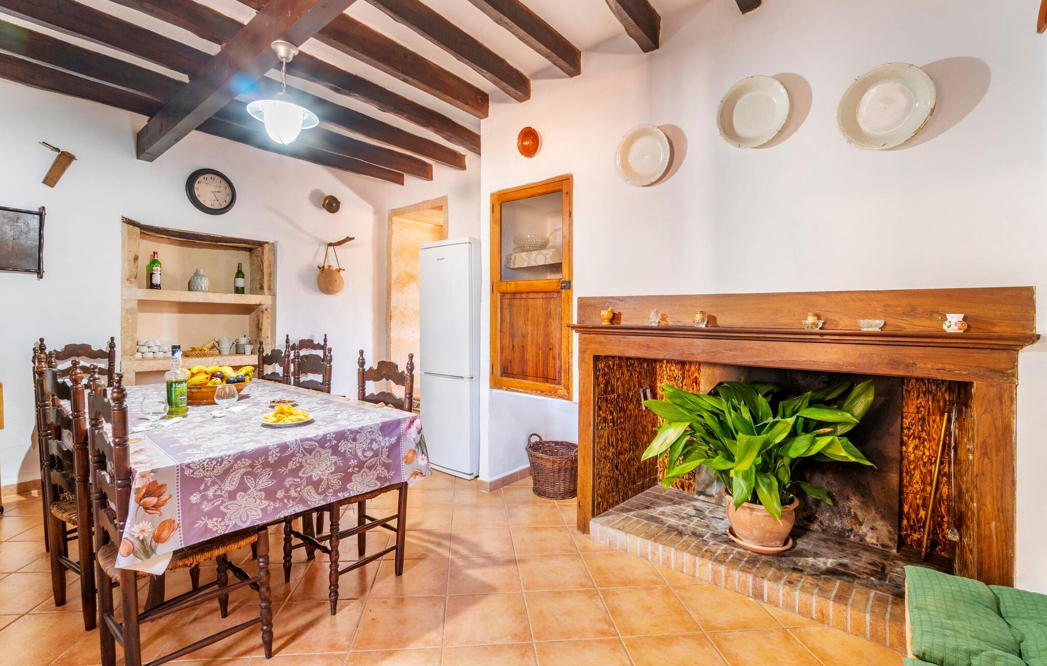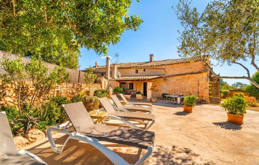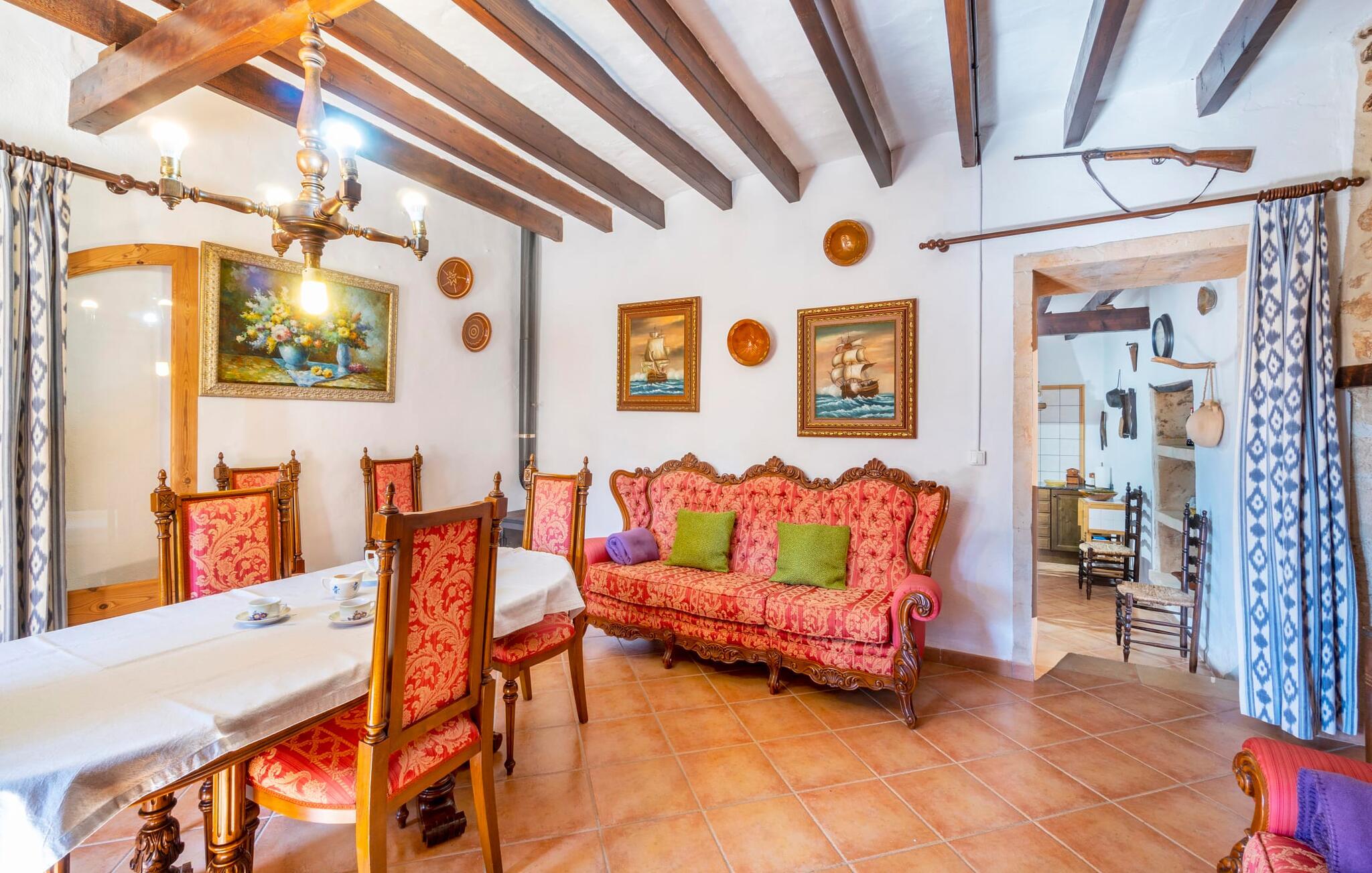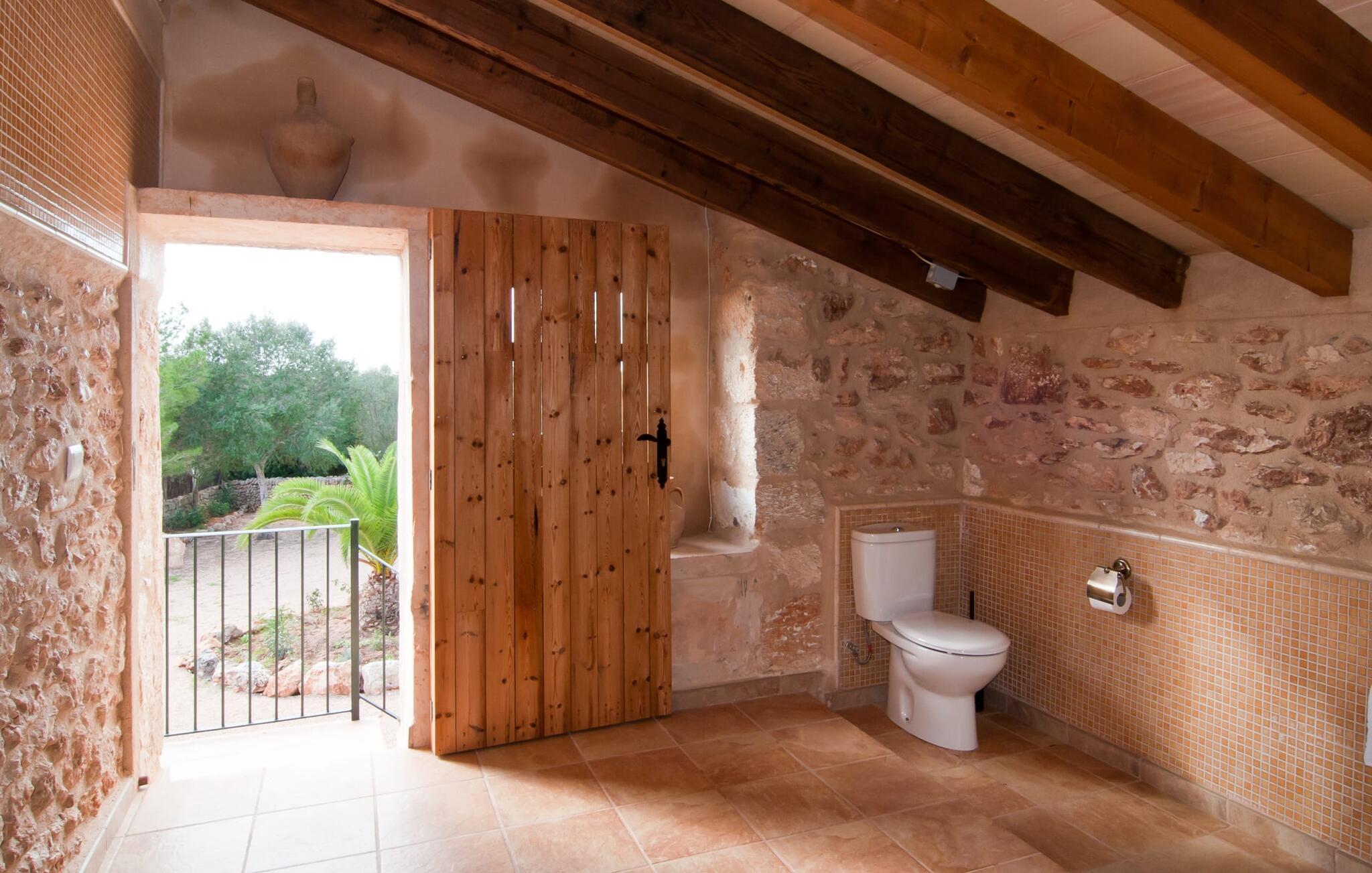 Den godt gemte villa “Son Gabriela” byder sine gæster velkommen i en helt landlig atmosfære og med en utrolig ro, der omgiver ejendommen. I den rummelige have, der stort set er dækket af let sandstensgrus, vil selv tilflyttere straks føle sig hjemme og få lyst til at blive. En lille græsplæne ved siden af poolen skaber et interessant og varieret overordnet udseende og tilbyder et malerisk legeområde for alle børn, der rejser med jer. Der er terrasser mellem huset og poolen, hver med adskillige dejlige siddepladser, hvor I kan slappe af i det fri. Siddepladserne, som blev bygget direkte ind i de små naturstensvægge, er særdeles elegante og indbydende. Dette er et fantastisk sted at fordrive tiden og lade jeres blik vandre over haven. Lige ved siden af huset ligger den overdækkede terrasse, som giver de perfekte rammer til at spise sammen takket være sit store spisebord. Her er også bekvemt installeret en indbygget grill, så I frisk kan tilberede og nyde regionens lækkerier. En stilfuld dobbeltpool, dekoreret med turkise mosaikfliser, er et rigtigt blikfang for store og små. Her kan I køle ned og finde en behagelig forfriskning på varme dage. Den store pool er let tilgængelig via en bred trappe og har en maksimal dybde på 1,90 m. Der er så meget privat jord omkring selve ejendommen, at enhver, der lejer denne ejendom, praktisk talt kan gå en tur uden at skulle vove sig ud af sin egen lille. areal. Med denne ejendom bor I så at sige i et dobbelthus. Den anden del af huset er dog ubeboet, så I kan nyde jeres ferie i fuldstændig privatlivets fred. Huset har egen parkeringsplads, som ligger ca. 20 m fra ejendommen. Selve huset er opdelt som følger: I stueplan er der en fantastisk entré, et rummeligt køkken med spisebord, en tv-stue og et badeværelse. Der er også en trappe, der fører til kælderen. De fire soveværelser og to badeværelser er placeret på øverste etage. En af dem er tilgængelig udefra, så man kan få adgang til badeværelset fra soveværelset via altanen. Det indre af villaen "Son Gabriela" er designet i den typiske mallorcanske stil, hvilket giver ejendommen en særlig rustik atmosfære. I hele ejendommen vil I støde på en overflod af smukke, ægte antikke møbler, som harmonerer perfekt med de farverige vægge, synlige bjælker og terracotta fliser. Her og der ses dekorative naturstenselementer. En række forskellige opholdsområder gør det nemt for jer at sprede jer efter hjertens lyst og finde mindst et af de mange indbydende steder, der inviterer jer til at slappe af. Det hyggelige køkken er veludstyret til jeres daglige behov og byder på alt fra en kedel til en filterkaffemaskine. Til kølige aftener er der endda en pejs, hvor I kan sidde sammen ved spisebordet og nyde et måltid. I spektakulært smukke soveværelser kan alle finde et sted at hvile, der passer præcis til deres behov. Også her finder vi antik flair og et absolut charmerende arrangement. Badeværelserne er indrettet i en moderne og meget smagfuld stil. Det er ikke nødvendigt at medbringe eget strygejern og hårtørrer, da disse allerede er tilgængelige på stedet og kan benyttes gratis under jeres ferie. I kan bekvemt opbevare jeres mad køligt i kælderen. Har I lyst til at tage ud og gå på opdagelse, kan I bruge en dag på en af de populære strande i området. Disse omfatter blandt andre Platja de sa Rapita og Es Freu de Ses Covetes. Det flade, landlige landskab omkring Llucmajor har også et veludviklet netværk af cykelstier, som enhver sportsentusiast vil nyde. Der er et landmandsmarked i Llucmajor tre dage om ugen: søndage, onsdage og fredage. Efter at have handlet efter det, I har brug for på markedet, kan I besøge en af de smukke caféer på Plaça Espanya og fortsætte med at se travlheden omkring jer, før I tager hjem til jeres tilflugtssted "Son Gabriela" og selv ser jer omkring. Tilbring dagen i måden I vælger. Villaen "Son Gabriela" er et charmerende tilflugtssted i den sydlige del af øen, omkring 7 km sydøst for Llucmajor. De lokale strande er nemme at nå. Ø-metropolen Palma de Mallorca ligger omkring 30 minutter væk i bil.