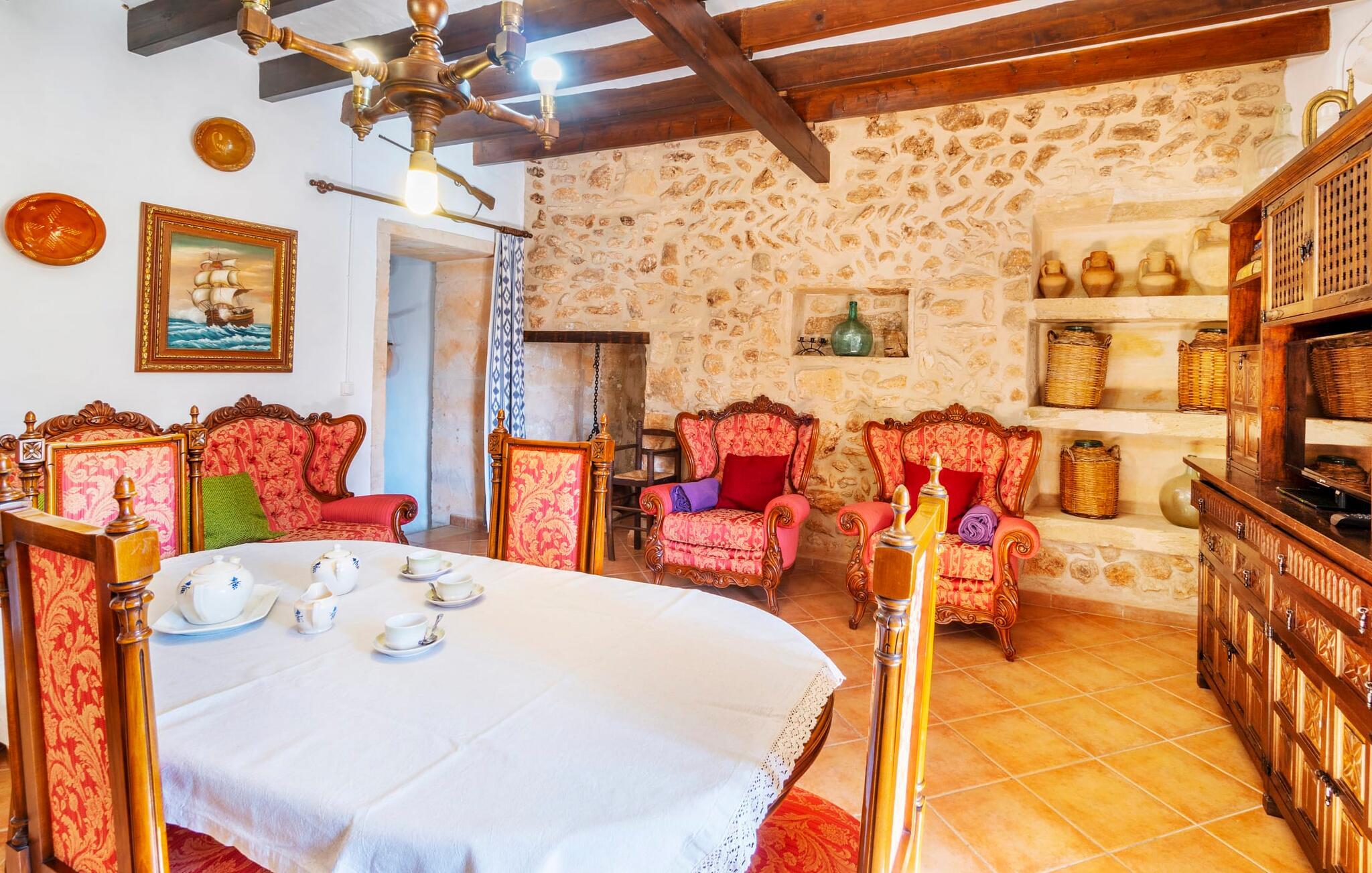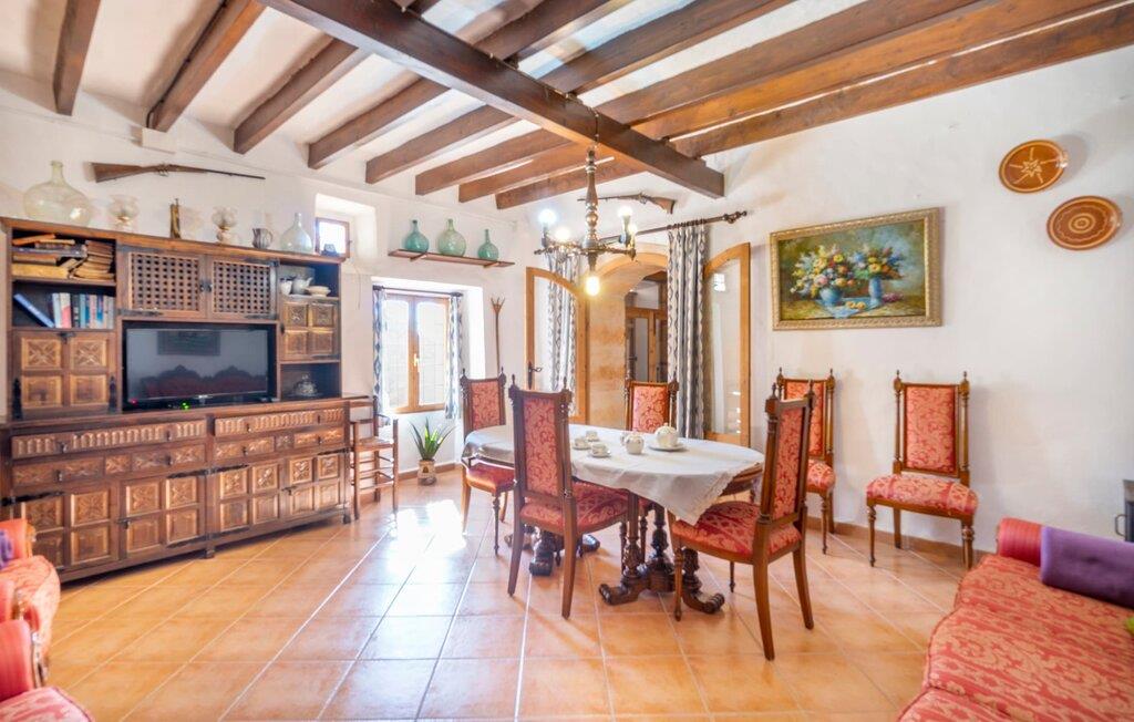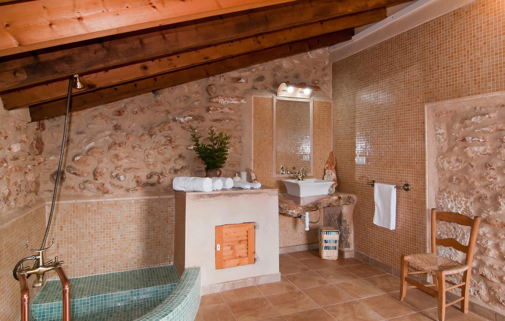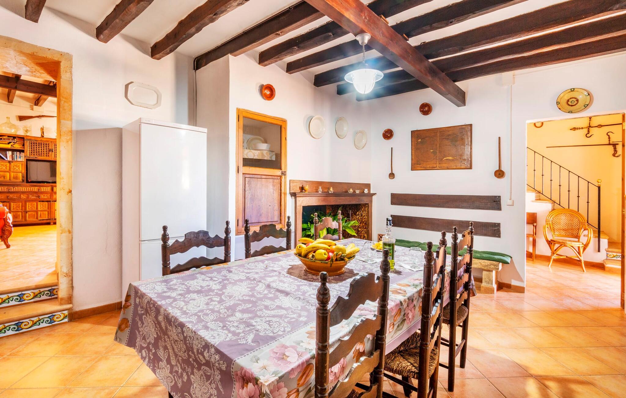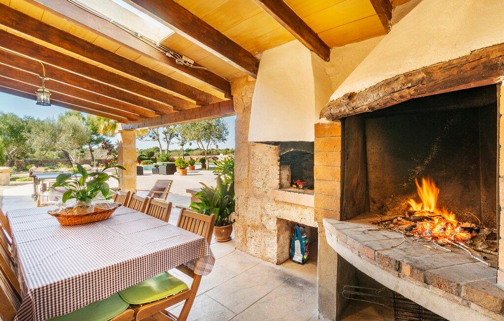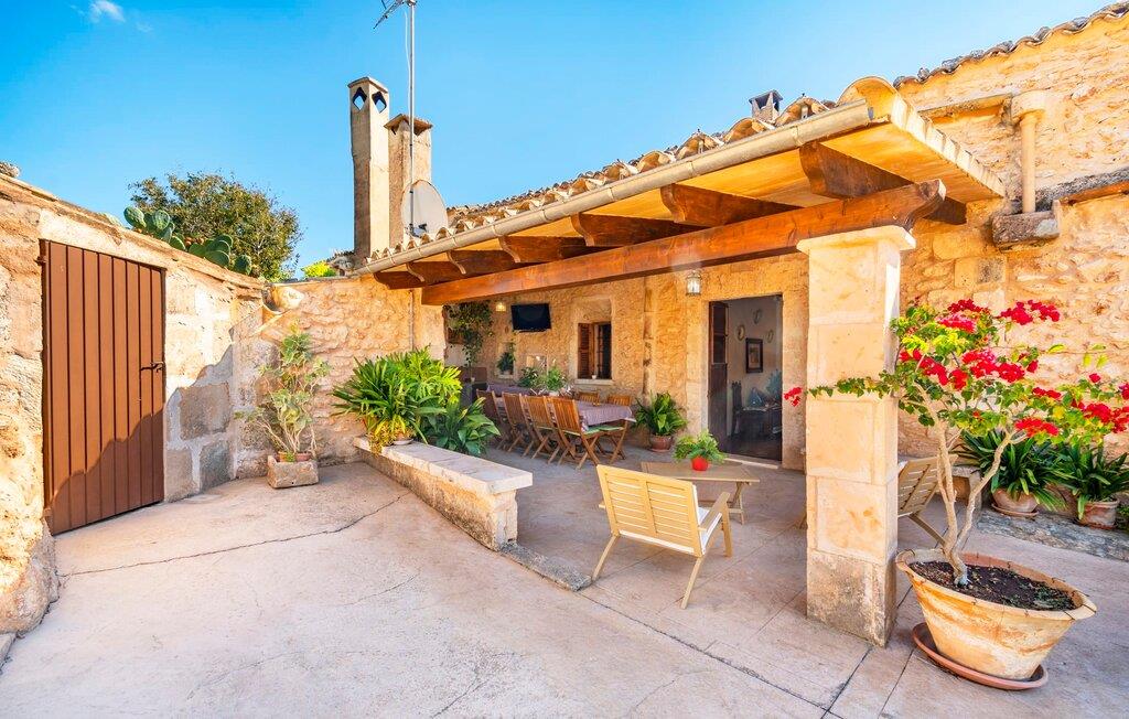 Den godt gemte villa “Son Gabriela” byder sine gæster velkommen i en helt landlig atmosfære og med en utrolig ro, der omgiver ejendommen. I den rummelige have, der stort set er dækket af let sandstensgrus, vil selv tilflyttere straks føle sig hjemme og få lyst til at blive. En lille græsplæne ved siden af poolen skaber et interessant og varieret overordnet udseende og tilbyder et malerisk legeområde for alle børn, der rejser med jer. Der er terrasser mellem huset og poolen, hver med adskillige dejlige siddepladser, hvor I kan slappe af i det fri. Siddepladserne, som blev bygget direkte ind i de små naturstensvægge, er særdeles elegante og indbydende. Dette er et fantastisk sted at fordrive tiden og lade jeres blik vandre over haven. Lige ved siden af huset ligger den overdækkede terrasse, som giver de perfekte rammer til at spise sammen takket være sit store spisebord. Her er også bekvemt installeret en indbygget grill, så I frisk kan tilberede og nyde regionens lækkerier. En stilfuld dobbeltpool, dekoreret med turkise mosaikfliser, er et rigtigt blikfang for store og små. Her kan I køle ned og finde en behagelig forfriskning på varme dage. Den store pool er let tilgængelig via en bred trappe og har en maksimal dybde på 1,90 m. Der er så meget privat jord omkring selve ejendommen, at enhver, der lejer denne ejendom, praktisk talt kan gå en tur uden at skulle vove sig ud af sin egen lille. areal. Med denne ejendom bor I så at sige i et dobbelthus. Den anden del af huset er dog ubeboet, så I kan nyde jeres ferie i fuldstændig privatlivets fred. Huset har egen parkeringsplads, som ligger ca. 20 m fra ejendommen. Selve huset er opdelt som følger: I stueplan er der en fantastisk entré, et rummeligt køkken med spisebord, en tv-stue og et badeværelse. Der er også en trappe, der fører til kælderen. De fire soveværelser og to badeværelser er placeret på øverste etage. En af dem er tilgængelig udefra, så man kan få adgang til badeværelset fra soveværelset via altanen. Det indre af villaen "Son Gabriela" er designet i den typiske mallorcanske stil, hvilket giver ejendommen en særlig rustik atmosfære. I hele ejendommen vil I støde på en overflod af smukke, ægte antikke møbler, som harmonerer perfekt med de farverige vægge, synlige bjælker og terracotta fliser. Her og der ses dekorative naturstenselementer. En række forskellige opholdsområder gør det nemt for jer at sprede jer efter hjertens lyst og finde mindst et af de mange indbydende steder, der inviterer jer til at slappe af. Det hyggelige køkken er veludstyret til jeres daglige behov og byder på alt fra en kedel til en filterkaffemaskine. Til kølige aftener er der endda en pejs, hvor I kan sidde sammen ved spisebordet og nyde et måltid. I spektakulært smukke soveværelser kan alle finde et sted at hvile, der passer præcis til deres behov. Også her finder vi antik flair og et absolut charmerende arrangement. Badeværelserne er indrettet i en moderne og meget smagfuld stil. Det er ikke nødvendigt at medbringe eget strygejern og hårtørrer, da disse allerede er tilgængelige på stedet og kan benyttes gratis under jeres ferie. I kan bekvemt opbevare jeres mad køligt i kælderen. Har I lyst til at tage ud og gå på opdagelse, kan I bruge en dag på en af de populære strande i området. Disse omfatter blandt andre Platja de sa Rapita og Es Freu de Ses Covetes. Det flade, landlige landskab omkring Llucmajor har også et veludviklet netværk af cykelstier, som enhver sportsentusiast vil nyde. Der er et landmandsmarked i Llucmajor tre dage om ugen: søndage, onsdage og fredage. Efter at have handlet efter det, I har brug for på markedet, kan I besøge en af de smukke caféer på Plaça Espanya og fortsætte med at se travlheden omkring jer, før I tager hjem til jeres tilflugtssted "Son Gabriela" og selv ser jer omkring. Tilbring dagen i måden I vælger. Villaen "Son Gabriela" er et charmerende tilflugtssted i den sydlige del af øen, omkring 7 km sydøst for Llucmajor. De lokale strande er nemme at nå. Ø-metropolen Palma de Mallorca ligger omkring 30 minutter væk i bil.