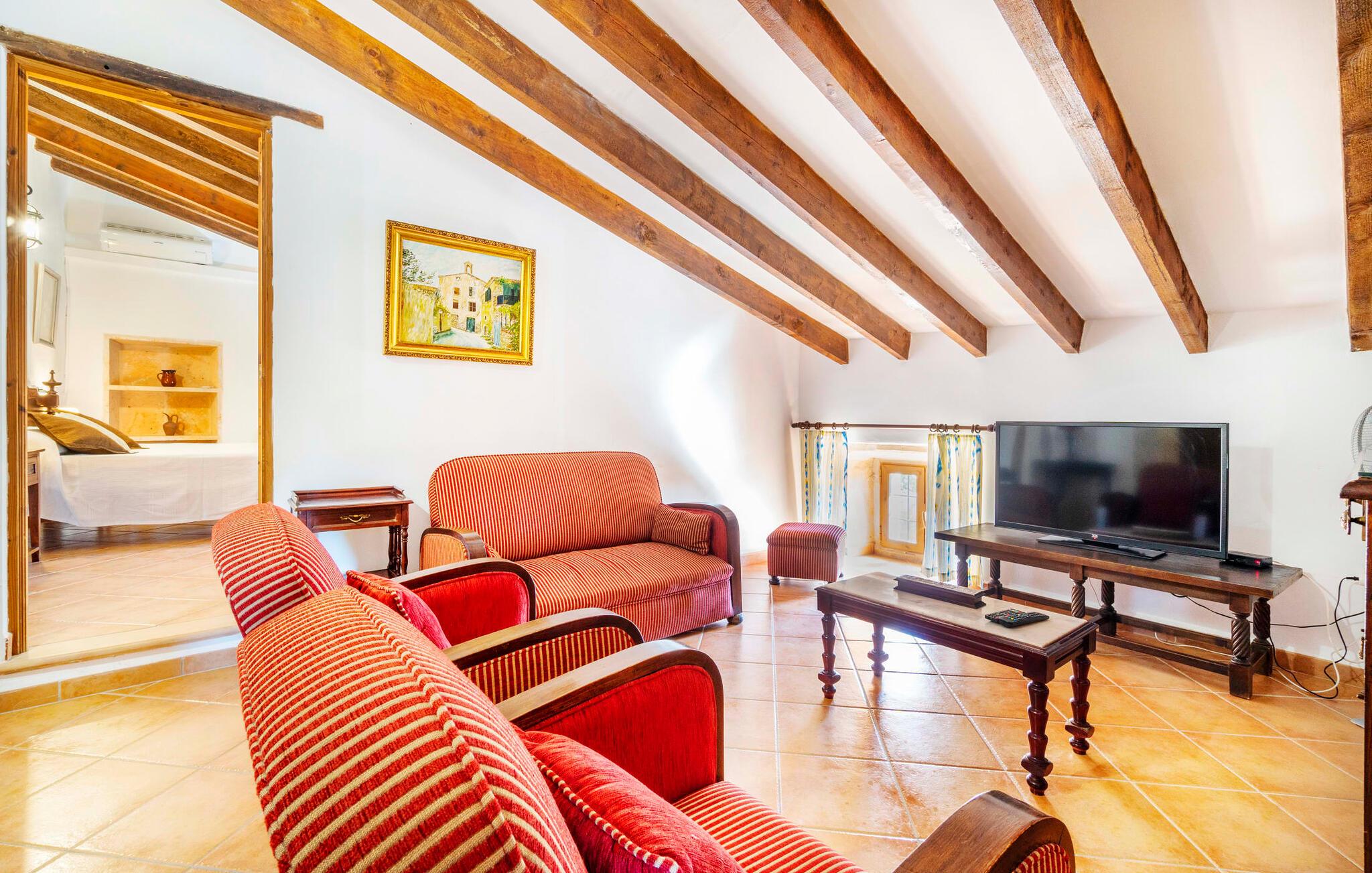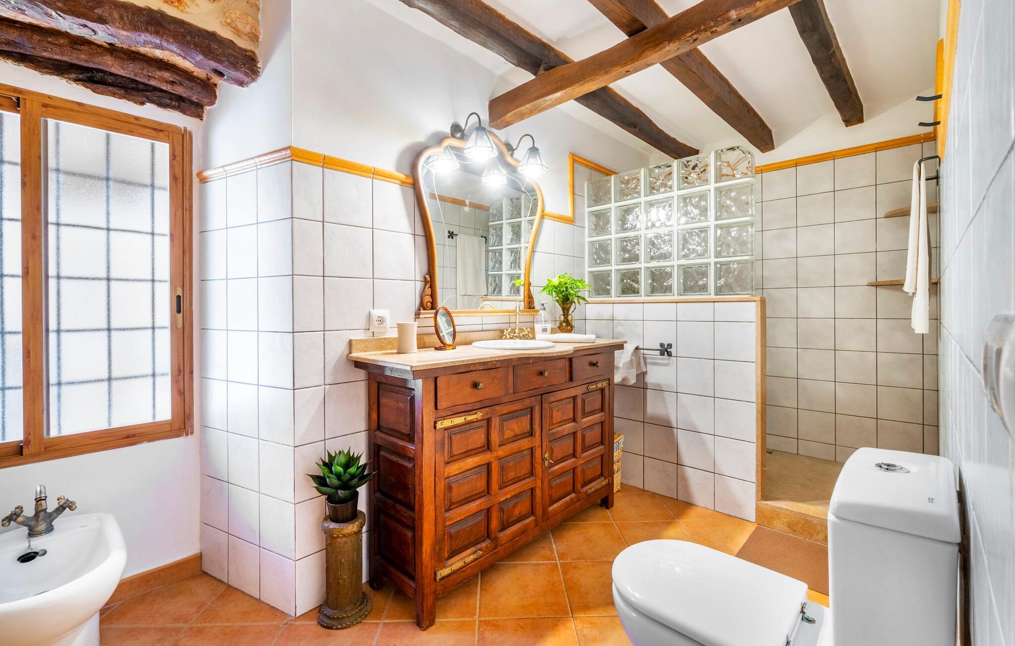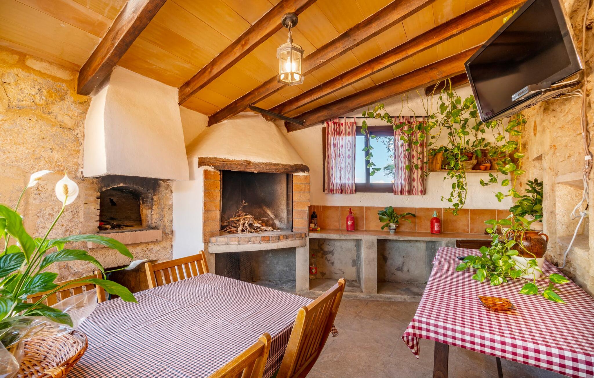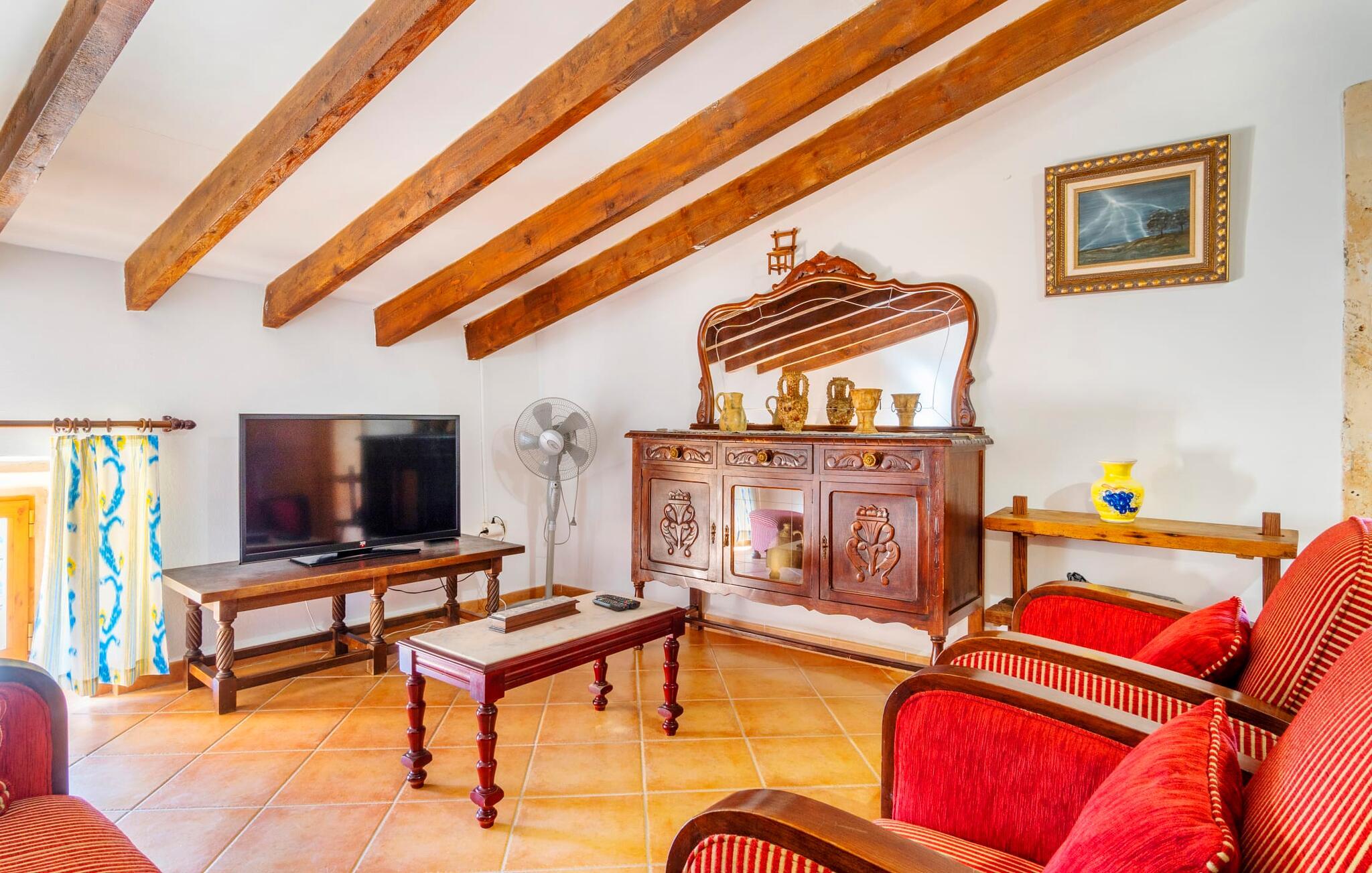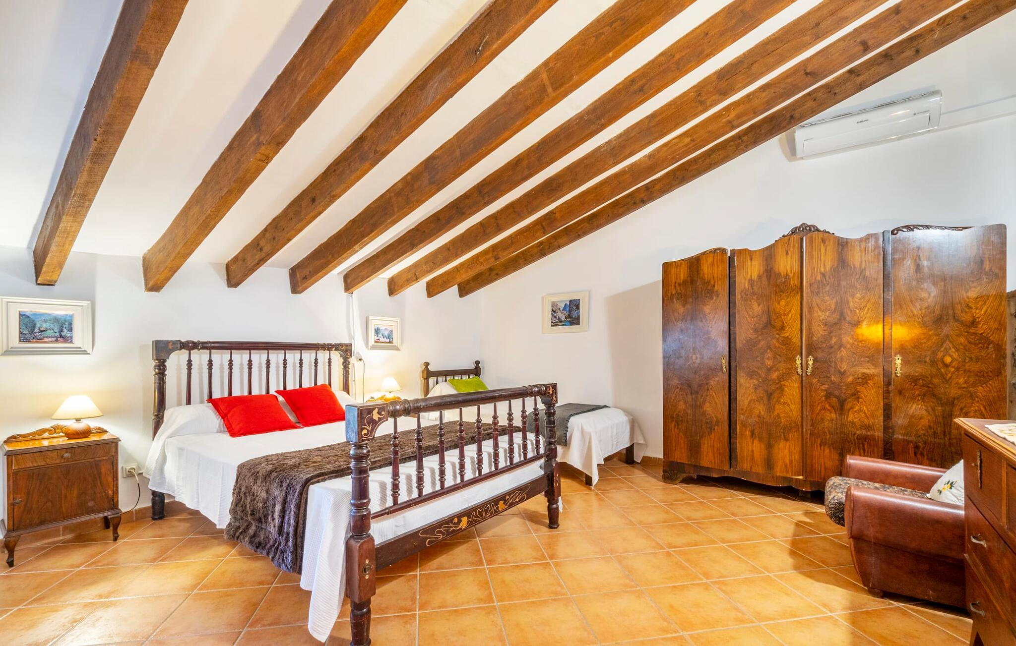 Den godt gemte villa “Son Gabriela” byder sine gæster velkommen i en helt landlig atmosfære og med en utrolig ro, der omgiver ejendommen. I den rummelige have, der stort set er dækket af let sandstensgrus, vil selv tilflyttere straks føle sig hjemme og få lyst til at blive. En lille græsplæne ved siden af poolen skaber et interessant og varieret overordnet udseende og tilbyder et malerisk legeområde for alle børn, der rejser med jer. Der er terrasser mellem huset og poolen, hver med adskillige dejlige siddepladser, hvor I kan slappe af i det fri. Siddepladserne, som blev bygget direkte ind i de små naturstensvægge, er særdeles elegante og indbydende. Dette er et fantastisk sted at fordrive tiden og lade jeres blik vandre over haven. Lige ved siden af huset ligger den overdækkede terrasse, som giver de perfekte rammer til at spise sammen takket være sit store spisebord. Her er også bekvemt installeret en indbygget grill, så I frisk kan tilberede og nyde regionens lækkerier. En stilfuld dobbeltpool, dekoreret med turkise mosaikfliser, er et rigtigt blikfang for store og små. Her kan I køle ned og finde en behagelig forfriskning på varme dage. Den store pool er let tilgængelig via en bred trappe og har en maksimal dybde på 1,90 m. Der er så meget privat jord omkring selve ejendommen, at enhver, der lejer denne ejendom, praktisk talt kan gå en tur uden at skulle vove sig ud af sin egen lille. areal. Med denne ejendom bor I så at sige i et dobbelthus. Den anden del af huset er dog ubeboet, så I kan nyde jeres ferie i fuldstændig privatlivets fred. Huset har egen parkeringsplads, som ligger ca. 20 m fra ejendommen. Selve huset er opdelt som følger: I stueplan er der en fantastisk entré, et rummeligt køkken med spisebord, en tv-stue og et badeværelse. Der er også en trappe, der fører til kælderen. De fire soveværelser og to badeværelser er placeret på øverste etage. En af dem er tilgængelig udefra, så man kan få adgang til badeværelset fra soveværelset via altanen. Det indre af villaen "Son Gabriela" er designet i den typiske mallorcanske stil, hvilket giver ejendommen en særlig rustik atmosfære. I hele ejendommen vil I støde på en overflod af smukke, ægte antikke møbler, som harmonerer perfekt med de farverige vægge, synlige bjælker og terracotta fliser. Her og der ses dekorative naturstenselementer. En række forskellige opholdsområder gør det nemt for jer at sprede jer efter hjertens lyst og finde mindst et af de mange indbydende steder, der inviterer jer til at slappe af. Det hyggelige køkken er veludstyret til jeres daglige behov og byder på alt fra en kedel til en filterkaffemaskine. Til kølige aftener er der endda en pejs, hvor I kan sidde sammen ved spisebordet og nyde et måltid. I spektakulært smukke soveværelser kan alle finde et sted at hvile, der passer præcis til deres behov. Også her finder vi antik flair og et absolut charmerende arrangement. Badeværelserne er indrettet i en moderne og meget smagfuld stil. Det er ikke nødvendigt at medbringe eget strygejern og hårtørrer, da disse allerede er tilgængelige på stedet og kan benyttes gratis under jeres ferie. I kan bekvemt opbevare jeres mad køligt i kælderen. Har I lyst til at tage ud og gå på opdagelse, kan I bruge en dag på en af de populære strande i området. Disse omfatter blandt andre Platja de sa Rapita og Es Freu de Ses Covetes. Det flade, landlige landskab omkring Llucmajor har også et veludviklet netværk af cykelstier, som enhver sportsentusiast vil nyde. Der er et landmandsmarked i Llucmajor tre dage om ugen: søndage, onsdage og fredage. Efter at have handlet efter det, I har brug for på markedet, kan I besøge en af de smukke caféer på Plaça Espanya og fortsætte med at se travlheden omkring jer, før I tager hjem til jeres tilflugtssted "Son Gabriela" og selv ser jer omkring. Tilbring dagen i måden I vælger. Villaen "Son Gabriela" er et charmerende tilflugtssted i den sydlige del af øen, omkring 7 km sydøst for Llucmajor. De lokale strande er nemme at nå. Ø-metropolen Palma de Mallorca ligger omkring 30 minutter væk i bil.