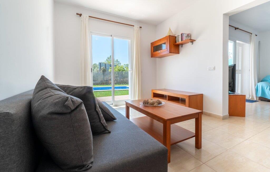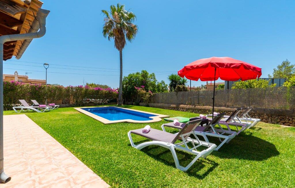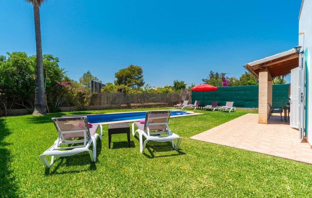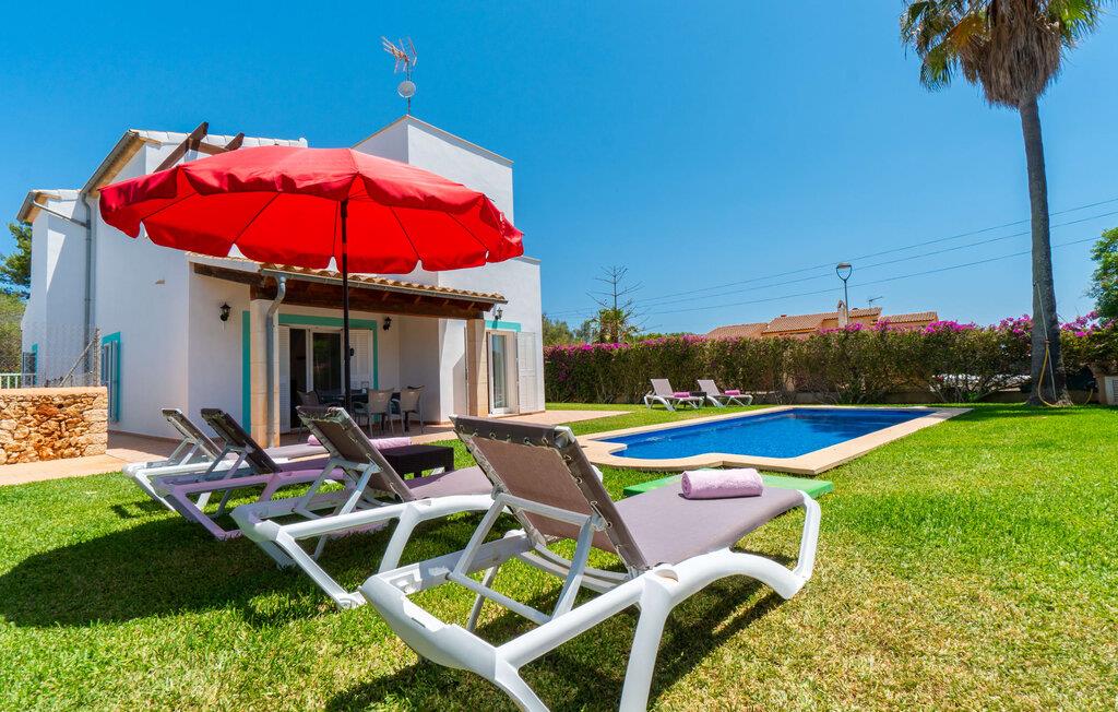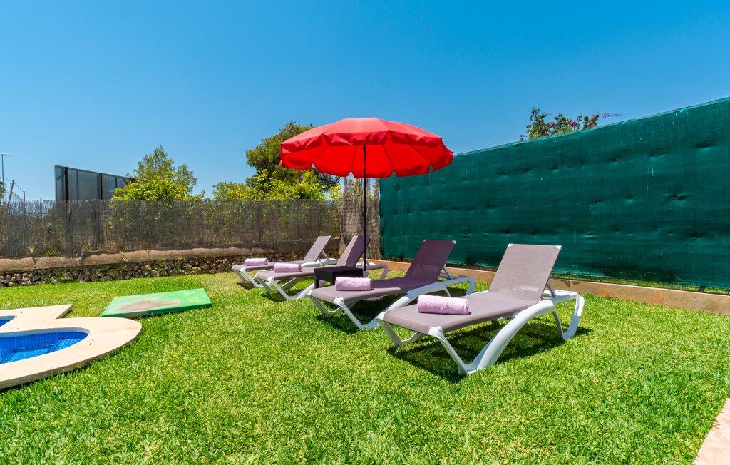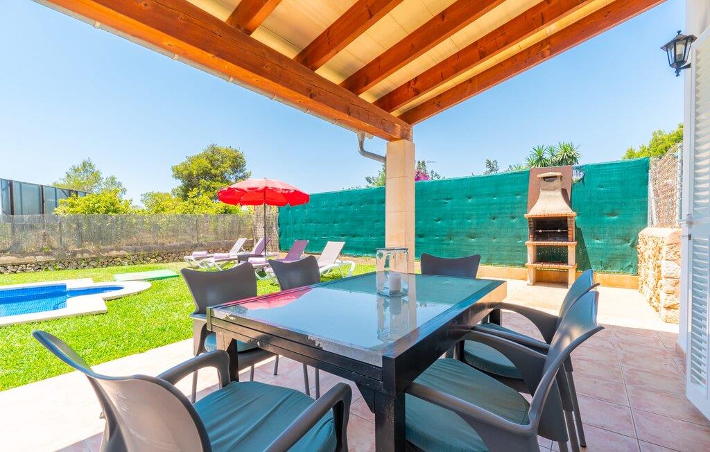Din ferie begynder enkelt og nemt, så snart I ankommer: Kun en times kørsel, udelukkende på asfaltveje, tager jer fra lufthavnen til villaen, hvor I hurtigt kan slå jer ned og slappe af. Efter jeres ankomst vil I måske nyde en kølig drink på terrassen, som takket være sit tag tilbyder et behageligt sted at slappe af selv i varmt sommervejr. Hvis vejret er godt, kan det smukke bord blive rammen om alle måltider sammen de kommende dage. Selvom en lækker morgenmad i disse omgivelser bestemt er en særlig fornøjelse, vil den nærliggende indbyggede grill sandsynligvis også opmuntre jer til at nyde kulinariske lækkerier sammen om aftenen. Hvem bliver den første til at hoppe i poolens kølige vand? Med en dybde på mellem 0,80 og 2 m og en længde på 8 m er poolen dekoreret med blå mosaikfliser og små halvcirkelformede trin en fremragende base for varme solrige dage, hvor det store palmetræ giver ekstra skygge. Til solbadning kan I placere de komfortable liggestole i haven som ønsket. Vil I se verden fra oven, så tag til tagterrassen, som ligger på husets første sal og også har udsigt til haven. Terrassen i stueplan fører direkte ind i opholds- og spisestuen, som bekvemt er opdelt i to områder, så I kan slappe af indendørs uden at komme i vejen for hinanden. Sofaen er det perfekte sted at komfortabelt se tv; Flere borde inviterer jer til at læse eller skrive - hvad med at sende et godt gammeldags postkort til jeres familie og venner derhjemme? Spisebordet kan nemt rumme hele jeres gruppe til indendørs spisning, hvilket kan være særligt fristende på en doven dag, da turen til køkkenet er behagelig kort. I brun og sølv stil tilbyder det omfattende udstyret køkken et fremragende grundlag for selvforplejning, og det store køleskab/fryser holder feriebaren pålideligt kølig. Et soveværelse med to enkeltsenge og et badeværelse er også i stueetagen. En enkel trappe fører jer op og videre til de to ekstra soveværelser - begge med dobbeltsenge på 1,80 x 2,00 m, hvoraf det ene har eget badeværelse. Villaen har i alt tre brusere og et badekar på sine tre badeværelser. Villaernes særlige tiltrækningskraft på den sydøstlige del af øen er blandt andet deres nærhed til det såkaldte "Calas de Mallorca". Disse mange små, delvist ubebyggede sandbugter, med deres ofte fine sand og lavvandede indsejling i vandet, er ideelle for familier med små børn. Den lille vej nær huset fører jer hurtigt til talrige smukke udflugts- og bademål, herunder den velbeskyttede badebugt Cala Murada, hvor det blå flag for rent vand flyver i vinden, og hvor der er liggestole, toiletfaciliteter, osv. Strandbaren dækker en lang række behov. I bør bestemt planlægge et besøg på de smukke strande ved Son S'Arenal i Porto Colom (ca. 10 km) og Cala Sa Nau i S`Horta (ca. 14 km)! Regionen omkring Cales de Mallorca med dens rigdom af huler bringer historien til live, og en tur til det nærliggende kloster San Salvador lover en fantastisk udsigt. Nyd den urbane følelse, gå til stranden og ind i landsbyen med dens supermarkeder og barer - villaen "Son Ganxo Uno" gør det muligt! Med Cala d'Or, Portocolom og Porto Cristo inden for 20 km, sørger promenader, gode restauranter og lystbådehavne for fornøjelse og nydelse. Husets styrker: Terrasse med muret grill, privat græsplæne og pool udenfor, to skriveborde til hjemmekontorer i stueetagen.