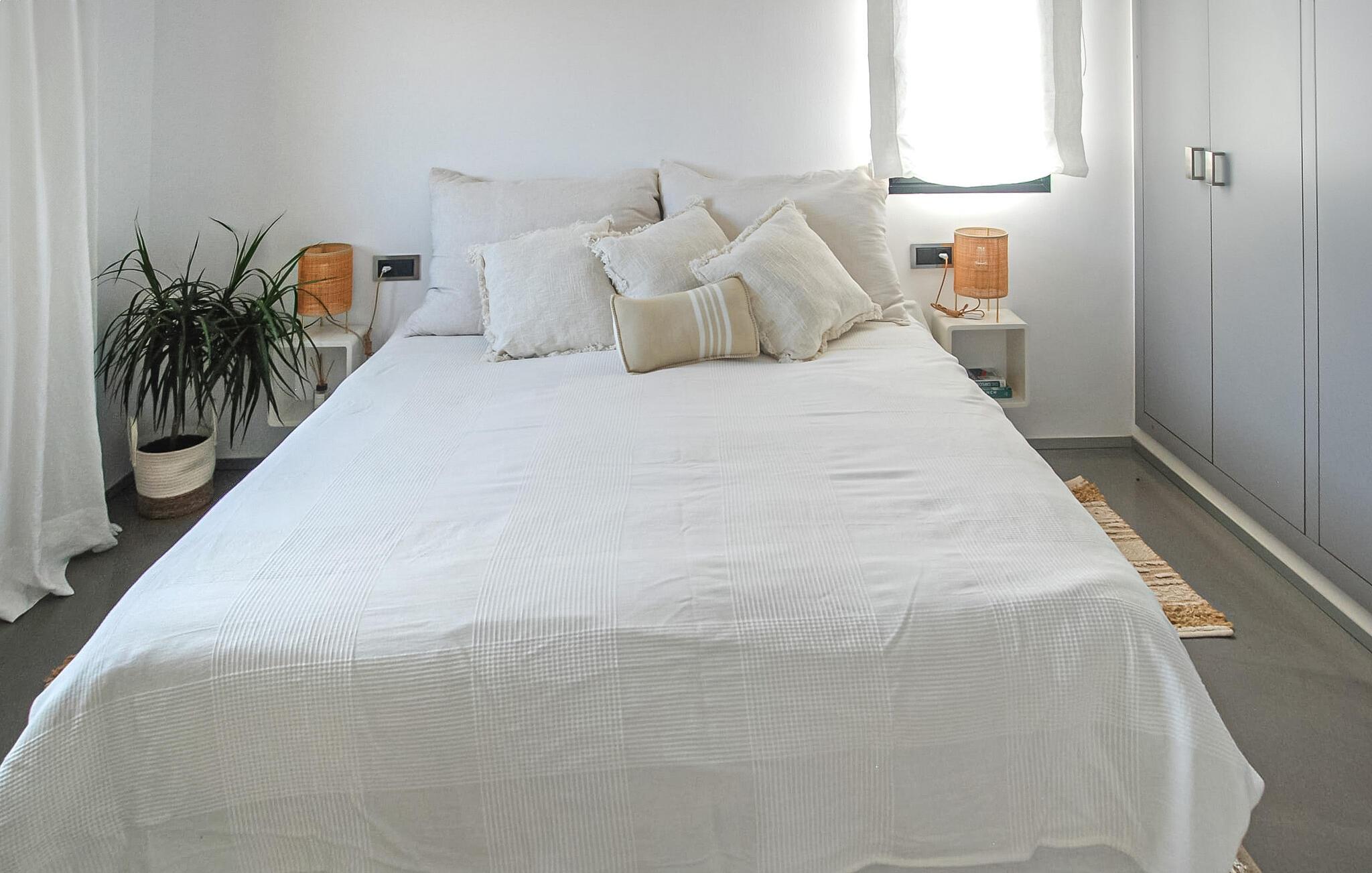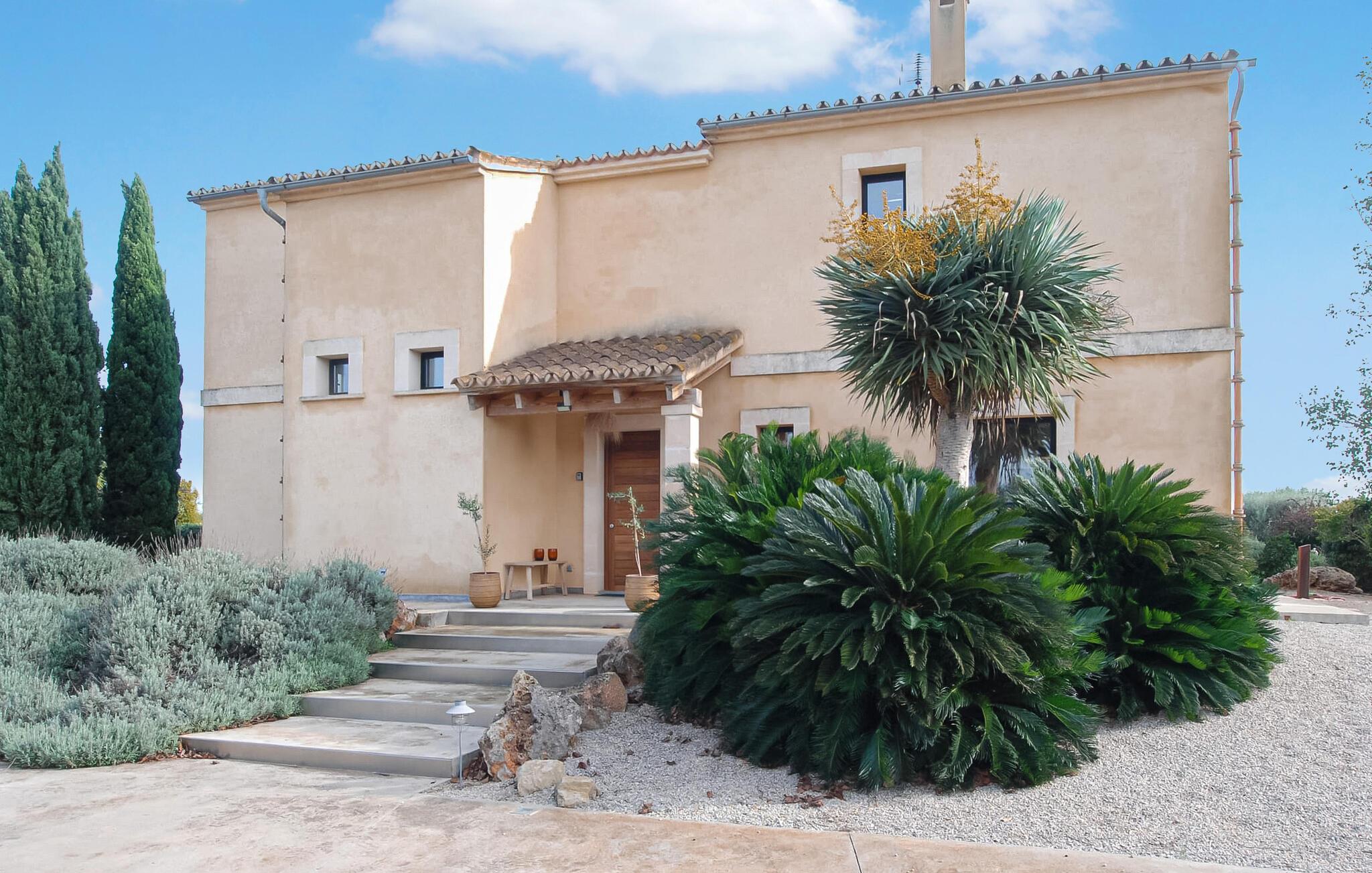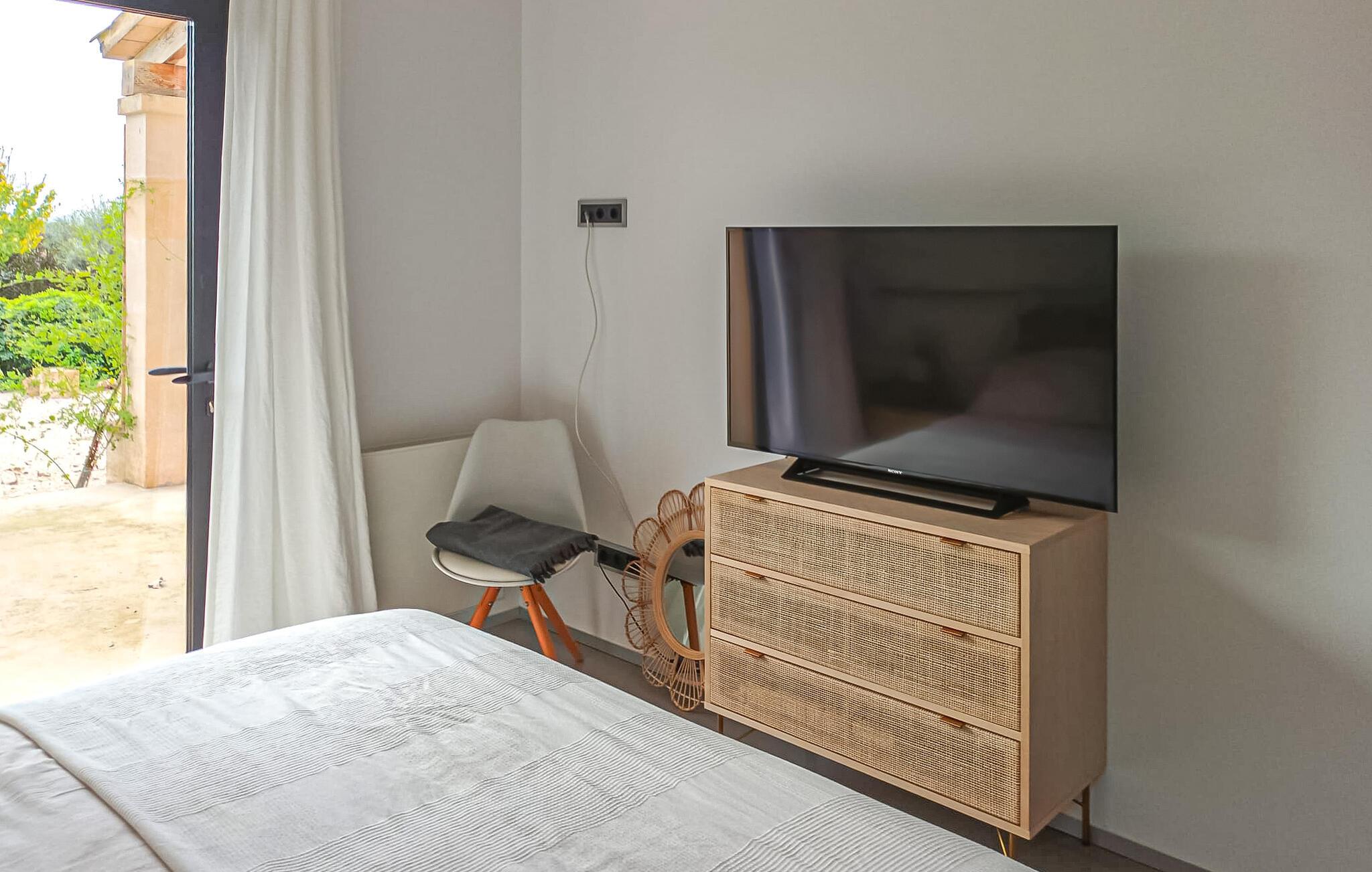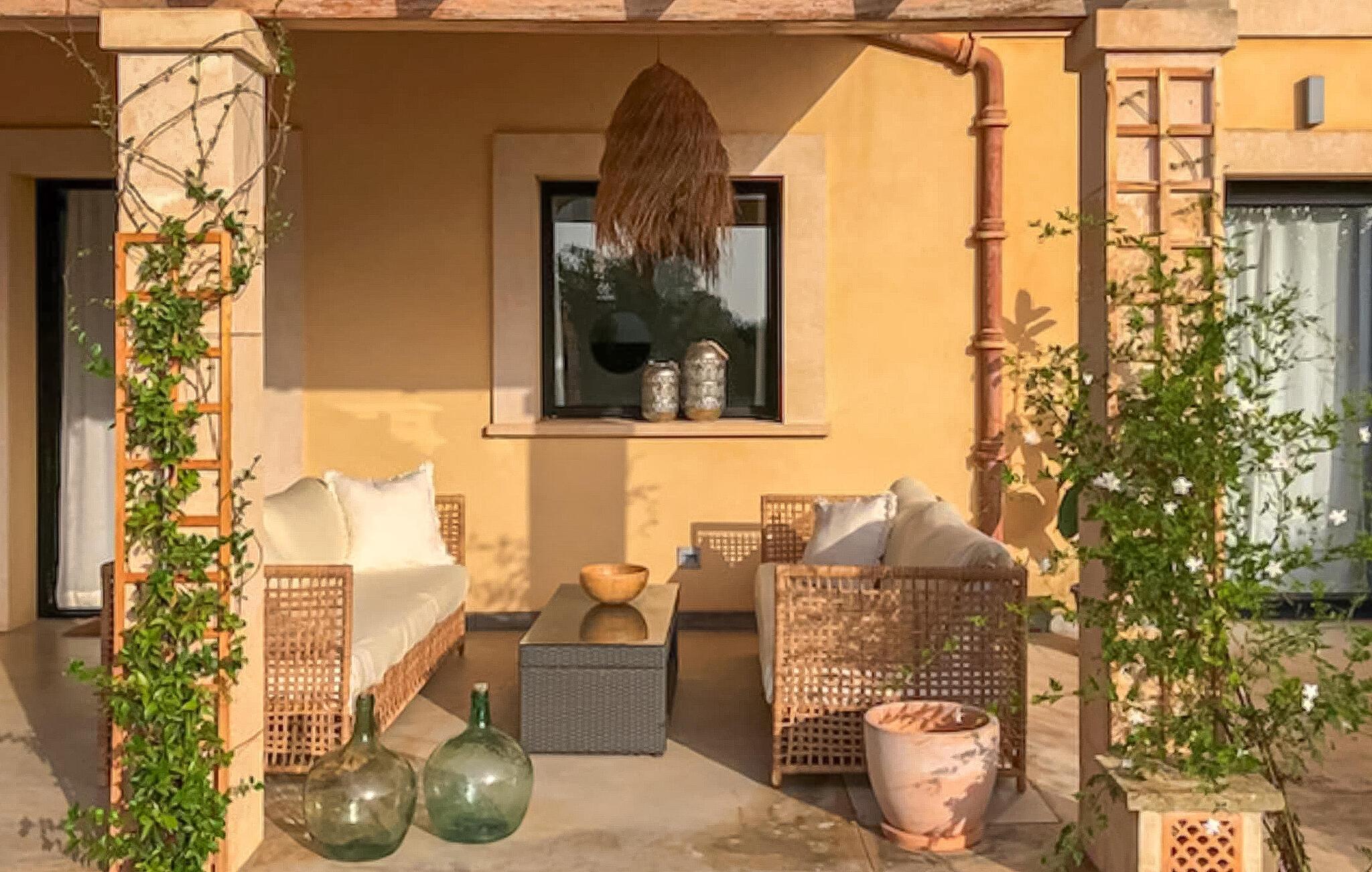 Flotte grus- og terrassearealer omgiver denne finca, som byder på et stilfuldt feriehus for op til 6 personer i det smukke sydlige Mallorca. Frugttræer som granatæbler, blommer og figner præger det rummelige område, ligesom rustikke oliventræer. Lige ved siden af huset kan I sidde hyggeligt i stuen eller spise sammen ved spisebordet. Den 20 m lange og usædvanligt store pool er et fantastisk sted at dyrke sport. Komfortable liggestole på den omkringliggende solterrasse inviterer jer til at slappe af. Hvis I ønsker det, kan I også finde et par naturlige skyggefulde områder her. Balkonterrassen byder på en vid udsigt, og der er også komfortable liggestole til rådighed. En muret kulgrill er tilgængelig til grillaftener. Husets rummelige interiør er trendy, moderne og hyggeligt. Der blev lagt megen kærlighed i udvalget af moderne møbler og tilbehør. Harmoniske farver, elegante gulve og masser af lys kendetegner også den meget smagfulde stemning, der strækker sig over to stueetager. I stueetagen er der stue og spisestue samt det stilfulde, fuldt udstyrede køkken. Til venstre for indgangen er der et soveværelse med dobbeltseng og et brusebad. På øverste etage er der yderligere to soveværelser, hvoraf det ene har eget brusebad. Huset har radiatorer og et varmt-koldt klimaanlæg og byder derfor på en behagelig opholdsoplevelse i hver sæson. Den er drevet af solenergi. Den moderne Mallorca finca "Son Grancampio" ligger i et landligt område og kun omkring 5 minutter i bil fra Campos, hvor I finder restauranter, barer og butikker til jeres daglige behov. Grundet den strategisk gode beliggenhed er vejforbindelserne ideelle. Nogle af de indbydende strande i det sydlige Mallorca ligger kun et kvarter væk fra fincaen, for eksempel det velkendte fine sandstrand Es Trenc. Bemærk venligst, at denne ejendom ikke accepterer ungdomsgrupper eller polterabender. En ungdomsgruppe på denne ejendom består af personer på 25 år eller derunder. Book ikke denne ejendom, hvis I er en ungdomsgruppe eller polterabend, da jeres reservation vil blive afvist, når den er booket, hvilket også kan være tilfældet ved ankomst til ejendommen eller under jeres ophold, og I vil ikke modtage en refusion. Elektricitet er inkluderet i prisen, hvis den anvendes hensigtsmæssigt. I det sjældne tilfælde, at dette beløb overskrides, vil I blive opkrævet gebyret kontant på stedet.