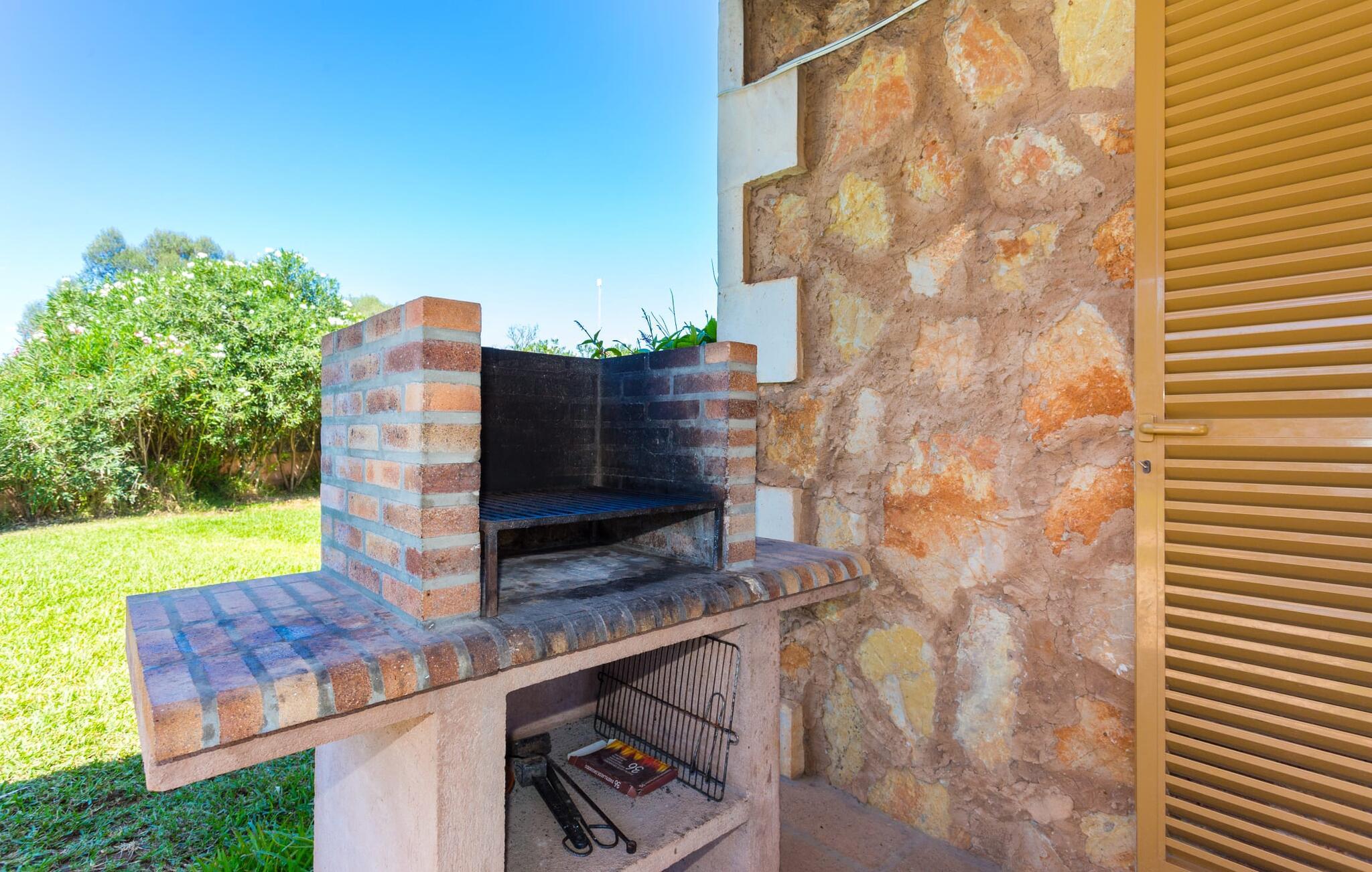 Den familievenlige, rummelige villa “Son Mas de Dalt” er omgivet af en kæmpe ejendom, der kombinerer hyggelig idyl og naturrum. Denne kombination skaber en særlig behagelig atmosfære, der inviterer jer til at slappe af og regenerere. Velholdte græsplæner, middelhavsbuske og flere høje palmer pynter i den fortryllende have. Blot få skridt fra huset finder I den ti meter lange pool med tilstødende solterrasse og solplæne, som giver jer masser af plads til at slappe af. I alt 6 poollounger venter på luksuriøs afslapning. Poolbassinet er flisebelagt med smukke lyseblå mosaiksten og er let tilgængeligt via brede trin. Fra den overdækkede terrasse kan man se poolen og børnene plaske rundt i den. Her indbyder det store spisebord til fællesspisning. Det er en fornøjelse at sidde der om morgenen og nyde morgenmaden med udsigt over den smukke have og den dybblå himmel. Om aftenen inviterer grillen til at forberede og nyde en middag med lækre regionale råvarer. Majestætiske trin fører op til husets hævede hovedindgang, en rund dobbeltdør i træ. I løbet af jeres ferie vil I højst sandsynligt skifte mellem haven og terrasseindgangen, som giver næsten direkte adgang til køkkenet. Det rummelige køkken kan bruges som stue. Det store spisebord giver et godt sted at spise sammen indendørs og samtidig nyde udsigten udenfor gennem de åbne døre. På kølige dage vil I måske tænde op i den lille pejs og nyde den behagelige varme sammen. Der er god plads til at lave mad sammen. Hvis I vil, kan I endda se tv, mens I laver mad. Alle daglige faciliteter er tilgængelige, herunder en elkedel og en italiensk kaffemaskine. Ved siden af køkkenet finder I opholdsstuen med en behagelig sofa, hvor I kan gøre jer godt tilpas når som helst på dagen. Her kan I fordybe jer i en bog eller se en attraktiv film i fjernsynet. Tre rummelige soveområder giver plads nok til at slappe af og genoplade jeres batterier. Venlige farver og masser af træ skaber en meget hyggelig atmosfære. Nyd en rolig og beroligende atmosfære uden irriterende klokker og fløjter. Denne villa kan meget komfortabelt rumme højst seks voksne og fire børn. Begge soveværelser med eget bad er lige moderne og funktionelle; begge er udstyret med badekar. Strygejern og hårtørrer er tilgængelige i huset, så I behøver ikke at medbringe jeres eget. Villaerne på den sydlige del af øen imponerer blandt andet med deres beliggenhed nær det smukke “Calas de Mallorca”. De mange små sandbugter med deres fine sand og lavvandede indsejling til vandet er ideelle til svømning og er især ideelle for familier med små børn. Fra villaen “Son Mas de Dalt” kan I også nemt nå områder med god infrastruktur. I kan for eksempel nyde jeres aften og køre til Portocolom (ca. 20 km). Villaen "Son Mas de Dalt" er beliggende i charmerende landlige omgivelser nær Campos på den sydlige del af øen. Den smukkeste naturlige strand på Mallorca ("Es Trenc") kan nås hurtigt og nemt herfra. Lufthavnen ligger en halv times kørsel fra ferieboligen.