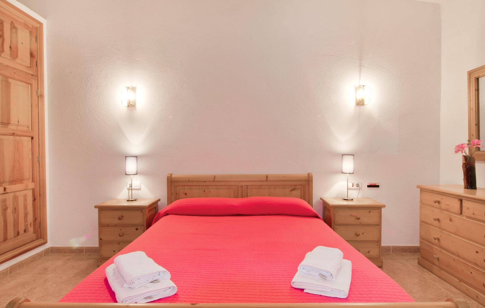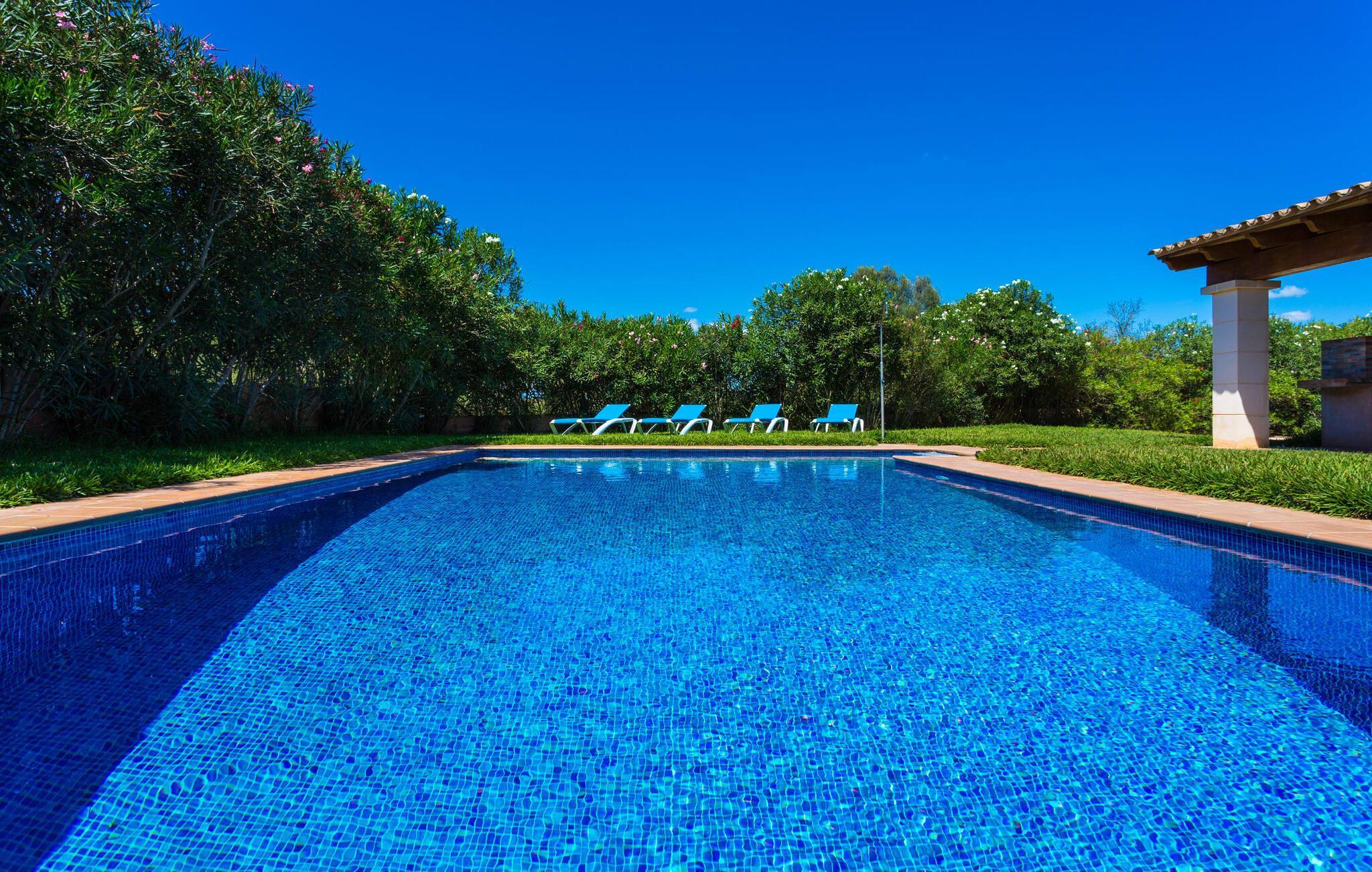 Den familievenlige, rummelige villa “Son Mas de Dalt” er omgivet af en kæmpe ejendom, der kombinerer hyggelig idyl og naturrum. Denne kombination skaber en særlig behagelig atmosfære, der inviterer dig til at slappe af og regenerere. Velholdte græsplæner, middelhavsbuske og flere høje palmer pynter i den fortryllende have. Blot få skridt fra huset finder du den ti meter lange pool med tilstødende solterrasse og solplæne, som giver dig masser af plads til at slappe af. I alt 6 poollounger venter på luksuriøs afslapning. Poolbassinet er flisebelagt med smukke lyseblå mosaiksten og er let tilgængeligt via brede trin. Fra den overdækkede terrasse kan man se poolen og børnene plaske rundt i den. Her indbyder det store spisebord til fællesspisning. Det er en fornøjelse at sidde der om morgenen og nyde morgenmaden med udsigt over den smukke have og den dybblå himmel. Om aftenen inviterer grillen til at forberede og nyde en middag med lækre regionale råvarer. Majestætiske trin fører op til husets hævede hovedindgang, en rund dobbeltdør i træ. I løbet af din ferie vil du højst sandsynligt skifte mellem haven og terrasseindgangen, som giver næsten direkte adgang til køkkenet. Dette er et Fincallorca feriehus. Det rummelige køkken kan bruges som stue. Det store spisebord giver et godt sted at spise sammen indendørs og samtidig nyde udsigten udenfor gennem de åbne døre. På kølige dage vil I måske tænde op i den lille pejs og nyde den behagelige varme sammen. Der er god plads til at lave mad sammen. Hvis du vil, kan du endda se tv, mens du laver mad. Alle daglige faciliteter er tilgængelige, herunder en elkedel og en italiensk kaffemaskine. Ved siden af køkkenet finder du opholdsstuen med en behagelig sofa, hvor du kan gøre dig godt tilpas når som helst på dagen. Her kan du fordybe dig i en bog eller se en attraktiv film i fjernsynet. Tre rummelige soveområder giver plads nok til at slappe af og genoplade dine batterier. Venlige farver og masser af træ skaber en meget hyggelig atmosfære. Nyd en rolig og beroligende atmosfære uden irriterende klokker og fløjter. Denne villa kan meget komfortabelt rumme højst seks voksne og fire børn. Begge soveværelser med eget bad er lige moderne og funktionelle; begge er udstyret med badekar. Strygejern og hårtørrer er tilgængelige i huset, så du behøver ikke at medbringe dit eget. Villaerne på den sydlige del af øen imponerer blandt andet med deres beliggenhed nær det smukke “Calas de Mallorca”. De mange små sandbugter med deres fine sand og lavvandede indsejling til vandet er ideelle til svømning og er især ideelle for familier med små børn. Fra villaen “Son Mas de Dalt” kan du også nemt nå områder med god infrastruktur. Du kan for eksempel nyde din aften og køre til Portocolom (ca. 20 km). Villaen "Son Mas de Dalt" er beliggende i charmerende landlige omgivelser nær Campos på den sydlige del af øen. Den smukkeste naturlige strand på Mallorca ("Es Trenc") kan nås hurtigt og nemt herfra. Lufthavnen ligger en halv times kørsel fra ferieboligen.