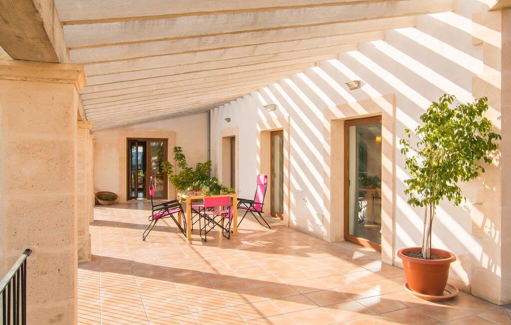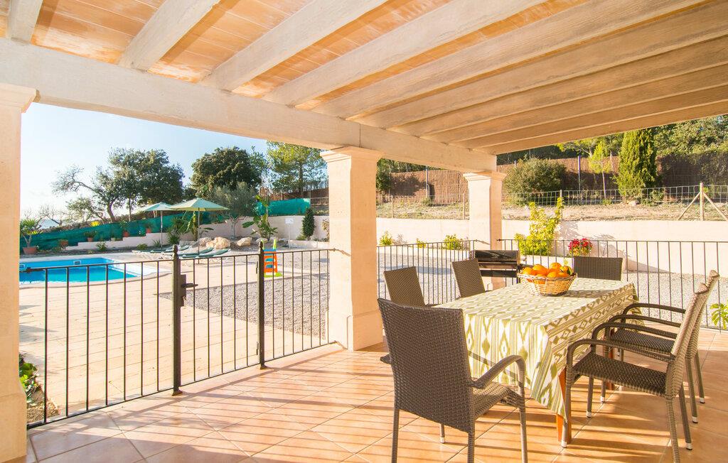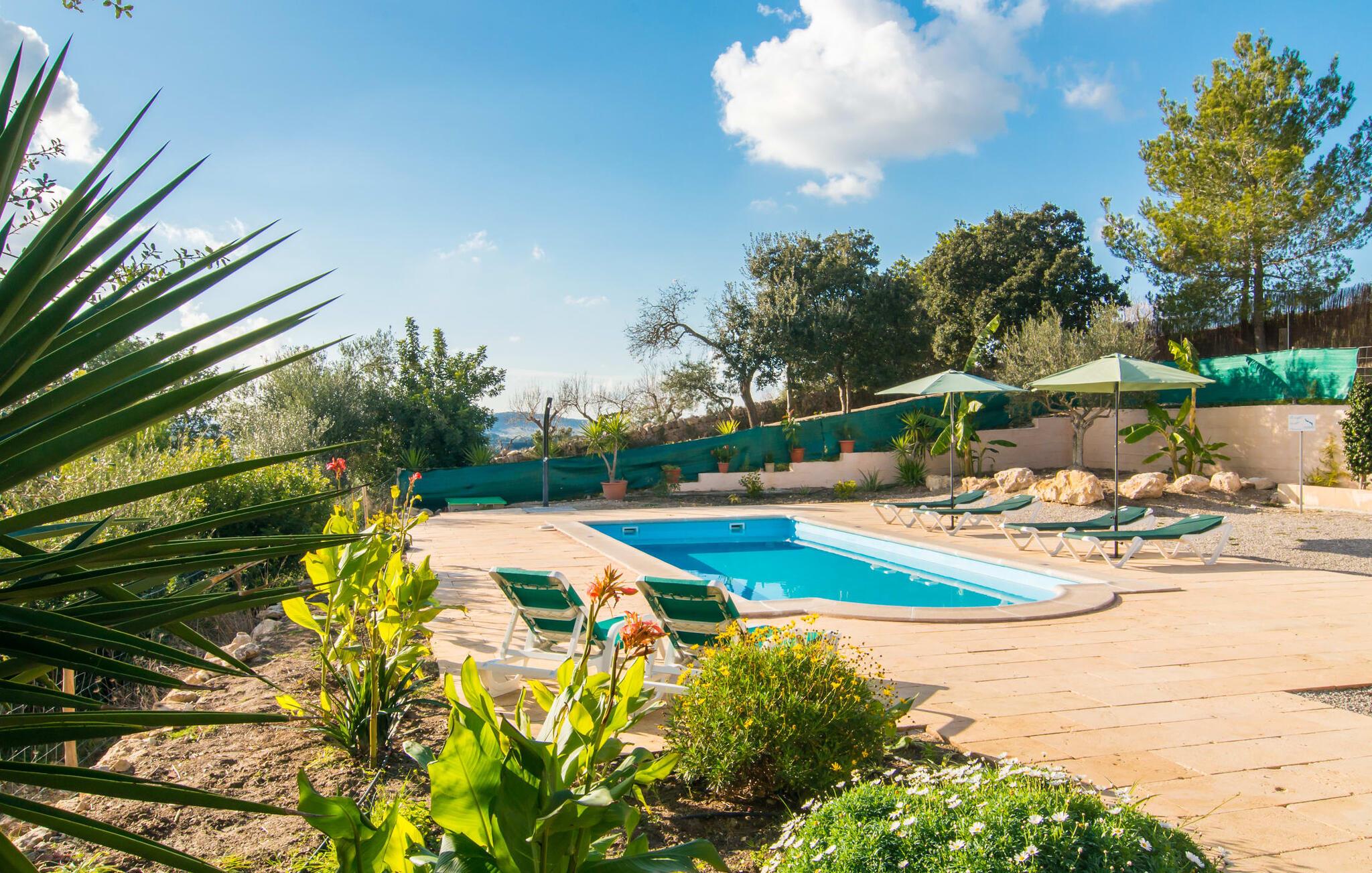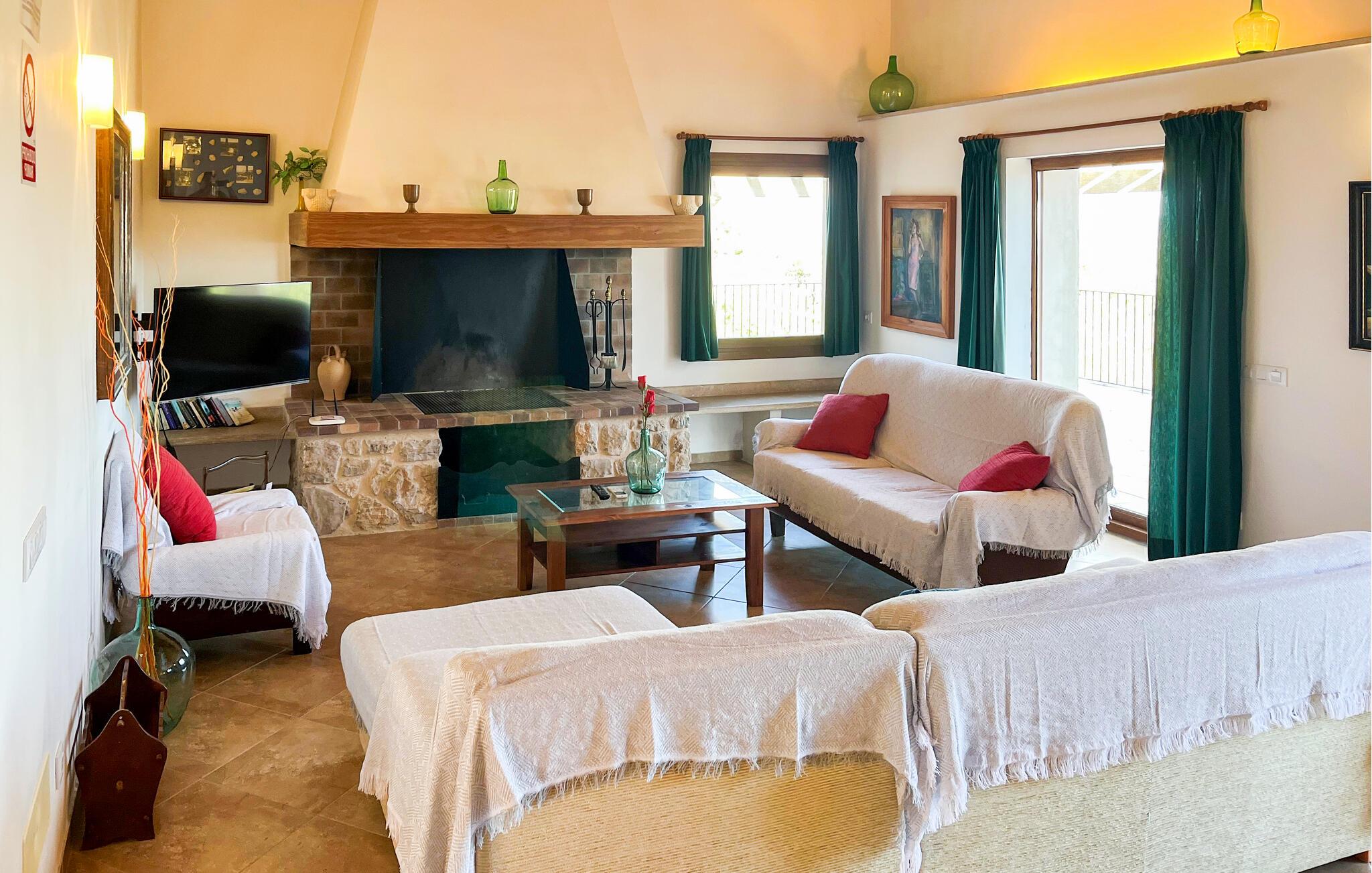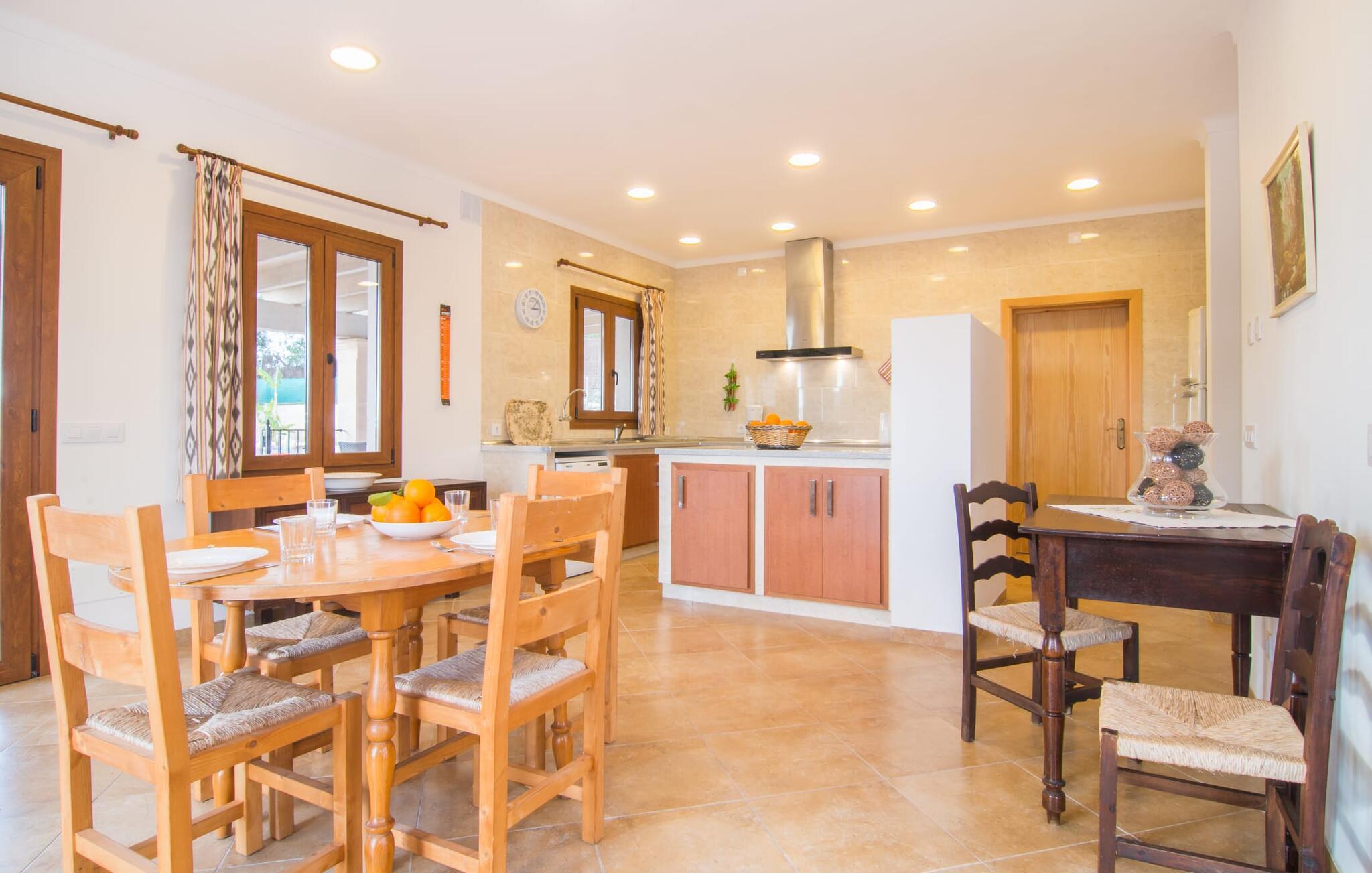 Den hyggelige villa "Son Morei" er beliggende i en vidunderlig bjergbeliggenhed over den smukke landsby Vilafranca de Bonany. Det sydvendte hus byder ikke kun på udsigt over landsbyen, men også en fænomenal udsigt over hele det centrale ø-niveau, "Plà de Mallora". Er der en bedre garanti for en afslappende ferie? Selve ejendommen er omgivet af en meget naturlig have fuld af frodig middelhavsvegetation, som flyder næsten problemfrit ud i bjergene. Direkte foran huset er der en rummelig pool, indlejret i en naturstenssolterrasse med plads til op til seks liggestole. En eller to parasoller giver skygge. Fra poolområdet går I direkte til huset med dens glatte overflade og sandstensindrammede facade. Når I forlader den forfriskende pool bag jer, kan I træde ind på verandaen med dens bærbare grill og ensemble af rattanmøbler - en vidunderlig udendørs spiseplads på ethvert tidspunkt af dagen. På højre side, med udsigt over landsbyen, blev der bygget en anden rummelig solterrasse - et spektakulært udendørs opholdsområde. Takket være en storslået altan direkte foran suiten, der fuldstændig fylder øverste etage, bliver udsigten fra denne højde endnu mere attraktiv for enhver besøgende, der elsker det brede blå derude. Terrasserne fører ind i denne fantastiske villa. Fra verandaen kommer man direkte ind i den lyse stue, hvis vægge er dekoreret med print fra gamle mestre. Dette rummelige værelse lover mange hyggelige timer med afslapning på bløde puder foran den imponerende åbne pejs ved siden af det vægmonterede LCD-tv. Selvom I finder en spiseplads her, tilbyder det solfyldte køkken også en alternativ spiseplads. Dette velproportionerede område med døre til terrassen med delvis udsigt over Vilafranca er fuldt udstyret og smagfuldt designet. Køkkenskabene er lavet af solide vægge og er koordineret med bordet, der adskiller koge- og spisepladserne. Dørene er udført i karamelfarvet træ og hele området er oplyst af loftspots. Sammen med de højglans sandstensfarvede vægfliser, som tilføjer et elegant touch til hele området. I stueetagen er der gæstetoilet, to af de tre soveværelser og et herligt smart badeværelse med bruseniche, alt flisebelagt i maritim blå og hvid. De to soveværelser - et dobbeltværelse og et med to enkeltsenge - er begge udstyret med indbyggede skabe, hvilket giver masser af opbevaringsplads til jeres feriegarderobe. Hele øverste etage er dedikeret til master bedroom, hvor et studie tilbyder ikke kun et stort soveværelse med den førnævnte balkon, men også et skrivebord, et privat fladskærms-tv og en ekstra sovesofa, hvilket gør denne villa til en misundelsesværdig beliggenhed og usædvanligt overkommelig pris, i lavsæsonen en attraktiv mulighed selv for kun to personer. Så hvis I gerne vil tilbringe jeres ferie på landet og stadig være i nærheden af den næste landsby, er "Son Morei" det rigtige sted for jer. Den frugtbare slette i midten af øen er kendt for sine duftende produkter, som ofte er tilgængelige ved siden af vejen eller, hvis I foretrækker det, på markedet på Placa Major i Vilafranca. Lækre vintomater, pimientos (grøn peber) samt abrikoser og de berømte honningmeloner er typiske for denne region, selvom landbruget har mistet noget af den betydning, det engang havde. Byen, som kun ligger to minutters kørsel derfra, er blevet skånet for masseturisme, så I kan komme i kontakt med mallorcanerne, mens I nyder jeres morgen "caffé con leche" og køber jeres morgenmadssandwich. Da huset ligger på en asfalteret vej over byen (selvom det er en blindgyde, vil der være en del trafikstøj afhængig af vindretning), er lokale forbindelsesveje nemme at nå. Hvis I vil have noget lidt mere urbant, skal I bare tage til Manacor for at shoppe. Vi hos Fincallorca ønsker jer en afslappende ferie - betagende udsigt alt inklusive - i den indbydende og hyggelige villa "Son Morei". Den hyggelige, nybyggede villa "Son Morei" med udsigt over den smukke by Vilafranca de Bonany ligger i en smuk bjergbeliggenhed i hjertet af øen. I finder butikker i byen, og der er et ugentligt marked på Placa Major om onsdagen. For mere omfattende shoppingmuligheder venter Petra eller Manacor. "Calas de Mallorca" på østkysten kan nås med bil for en dagstur til stranden; Den overvældende smukke naturlige bugt Cala Varques er ca. 25 km væk. Son Morei tilbyder jer et uforglemmeligt ophold med massage i hjemlige omgivelser.