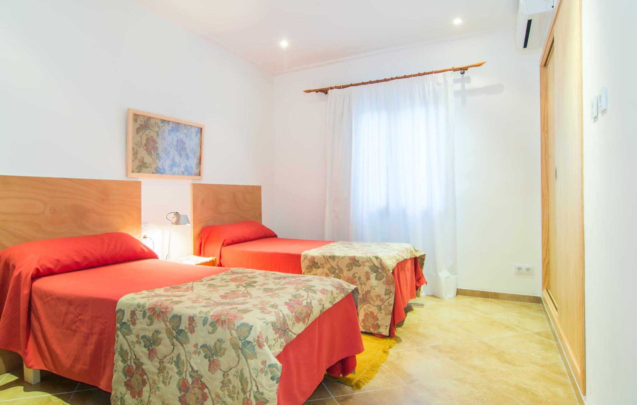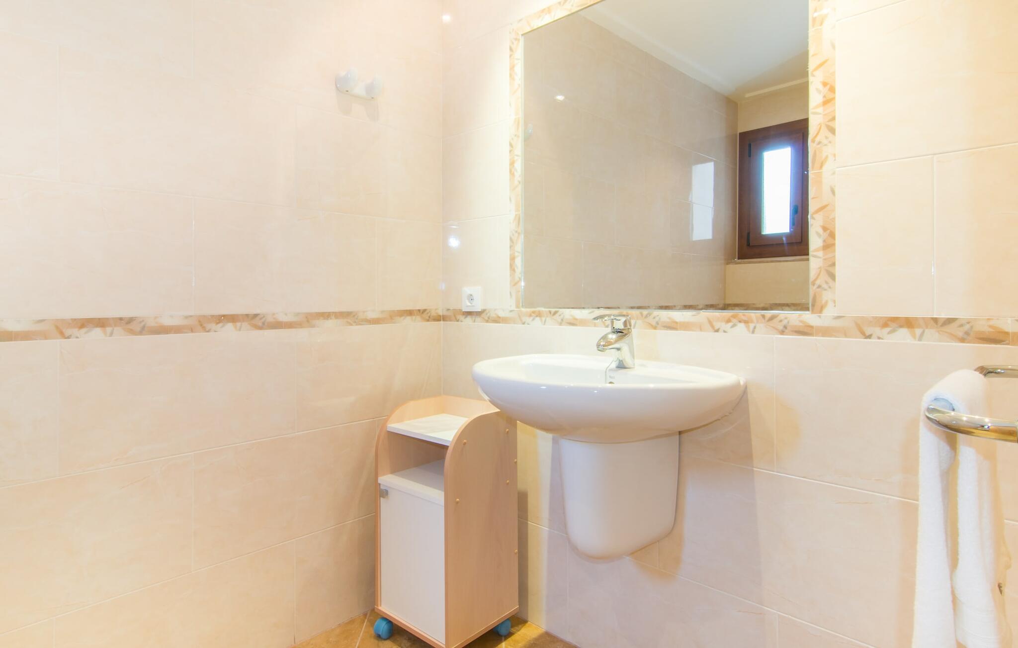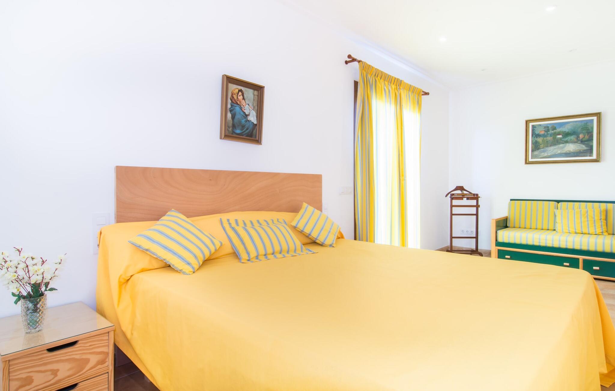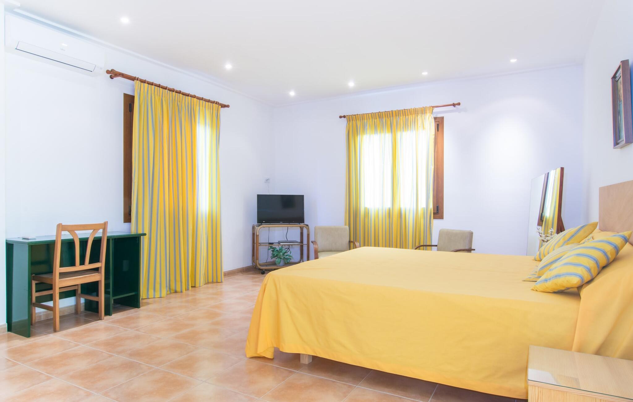 Den hyggelige villa "Son Morei" er beliggende i en vidunderlig bjergbeliggenhed over den smukke landsby Vilafranca de Bonany. Det sydvendte hus byder ikke kun på udsigt over landsbyen, men også en fænomenal udsigt over hele det centrale ø-niveau, "Plà de Mallora". Er der en bedre garanti for en afslappende ferie? Selve ejendommen er omgivet af en meget naturlig have fuld af frodig middelhavsvegetation, som flyder næsten problemfrit ud i bjergene. Direkte foran huset er der en rummelig pool, indlejret i en naturstenssolterrasse med plads til op til seks liggestole. En eller to parasoller giver skygge. Fra poolområdet går I direkte til huset med dens glatte overflade og sandstensindrammede facade. Når I forlader den forfriskende pool bag jer, kan I træde ind på verandaen med dens bærbare grill og ensemble af rattanmøbler - en vidunderlig udendørs spiseplads på ethvert tidspunkt af dagen. På højre side, med udsigt over landsbyen, blev der bygget en anden rummelig solterrasse - et spektakulært udendørs opholdsområde. Takket være en storslået altan direkte foran suiten, der fuldstændig fylder øverste etage, bliver udsigten fra denne højde endnu mere attraktiv for enhver besøgende, der elsker det brede blå derude. Terrasserne fører ind i denne fantastiske villa. Fra verandaen kommer man direkte ind i den lyse stue, hvis vægge er dekoreret med print fra gamle mestre. Dette rummelige værelse lover mange hyggelige timer med afslapning på bløde puder foran den imponerende åbne pejs ved siden af det vægmonterede LCD-tv. Selvom I finder en spiseplads her, tilbyder det solfyldte køkken også en alternativ spiseplads. Dette velproportionerede område med døre til terrassen med delvis udsigt over Vilafranca er fuldt udstyret og smagfuldt designet. Køkkenskabene er lavet af solide vægge og er koordineret med bordet, der adskiller koge- og spisepladserne. Dørene er udført i karamelfarvet træ og hele området er oplyst af loftspots. Sammen med de højglans sandstensfarvede vægfliser, som tilføjer et elegant touch til hele området. I stueetagen er der gæstetoilet, to af de tre soveværelser og et herligt smart badeværelse med bruseniche, alt flisebelagt i maritim blå og hvid. De to soveværelser - et dobbeltværelse og et med to enkeltsenge - er begge udstyret med indbyggede skabe, hvilket giver masser af opbevaringsplads til jeres feriegarderobe. Hele øverste etage er dedikeret til master bedroom, hvor et studie tilbyder ikke kun et stort soveværelse med den førnævnte balkon, men også et skrivebord, et privat fladskærms-tv og en ekstra sovesofa, hvilket gør denne villa til en misundelsesværdig beliggenhed og usædvanligt overkommelig pris, i lavsæsonen en attraktiv mulighed selv for kun to personer. Så hvis I gerne vil tilbringe jeres ferie på landet og stadig være i nærheden af den næste landsby, er "Son Morei" det rigtige sted for jer. Den frugtbare slette i midten af øen er kendt for sine duftende produkter, som ofte er tilgængelige ved siden af vejen eller, hvis I foretrækker det, på markedet på Placa Major i Vilafranca. Lækre vintomater, pimientos (grøn peber) samt abrikoser og de berømte honningmeloner er typiske for denne region, selvom landbruget har mistet noget af den betydning, det engang havde. Byen, som kun ligger to minutters kørsel derfra, er blevet skånet for masseturisme, så I kan komme i kontakt med mallorcanerne, mens I nyder jeres morgen "caffé con leche" og køber jeres morgenmadssandwich. Da huset ligger på en asfalteret vej over byen (selvom det er en blindgyde, vil der være en del trafikstøj afhængig af vindretning), er lokale forbindelsesveje nemme at nå. Hvis I vil have noget lidt mere urbant, skal I bare tage til Manacor for at shoppe. Vi hos Fincallorca ønsker jer en afslappende ferie - betagende udsigt alt inklusive - i den indbydende og hyggelige villa "Son Morei". Den hyggelige, nybyggede villa "Son Morei" med udsigt over den smukke by Vilafranca de Bonany ligger i en smuk bjergbeliggenhed i hjertet af øen. I finder butikker i byen, og der er et ugentligt marked på Placa Major om onsdagen. For mere omfattende shoppingmuligheder venter Petra eller Manacor. "Calas de Mallorca" på østkysten kan nås med bil for en dagstur til stranden; Den overvældende smukke naturlige bugt Cala Varques er ca. 25 km væk. Son Morei tilbyder jer et uforglemmeligt ophold med massage i hjemlige omgivelser.