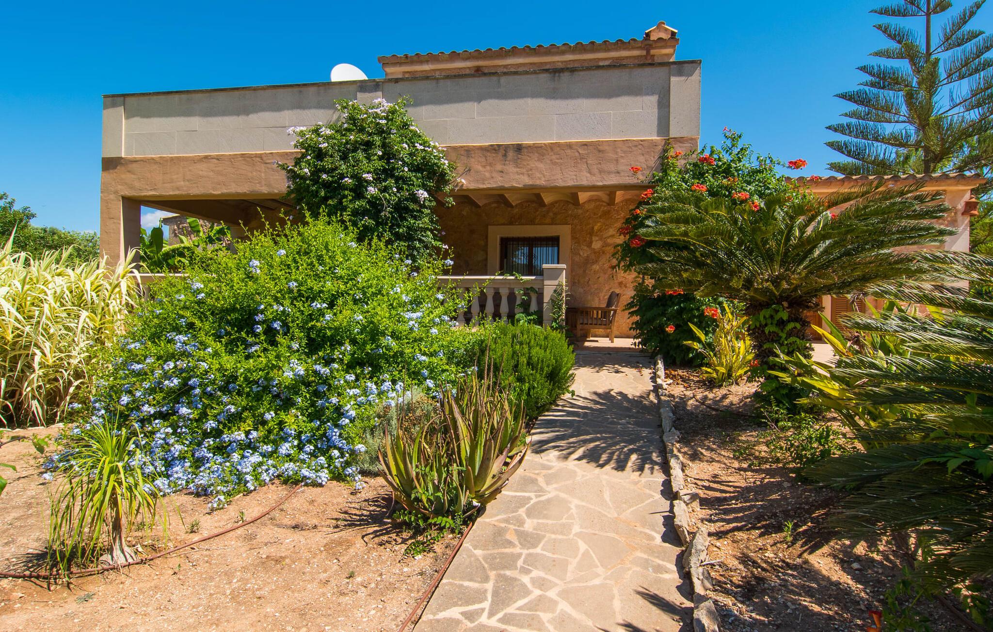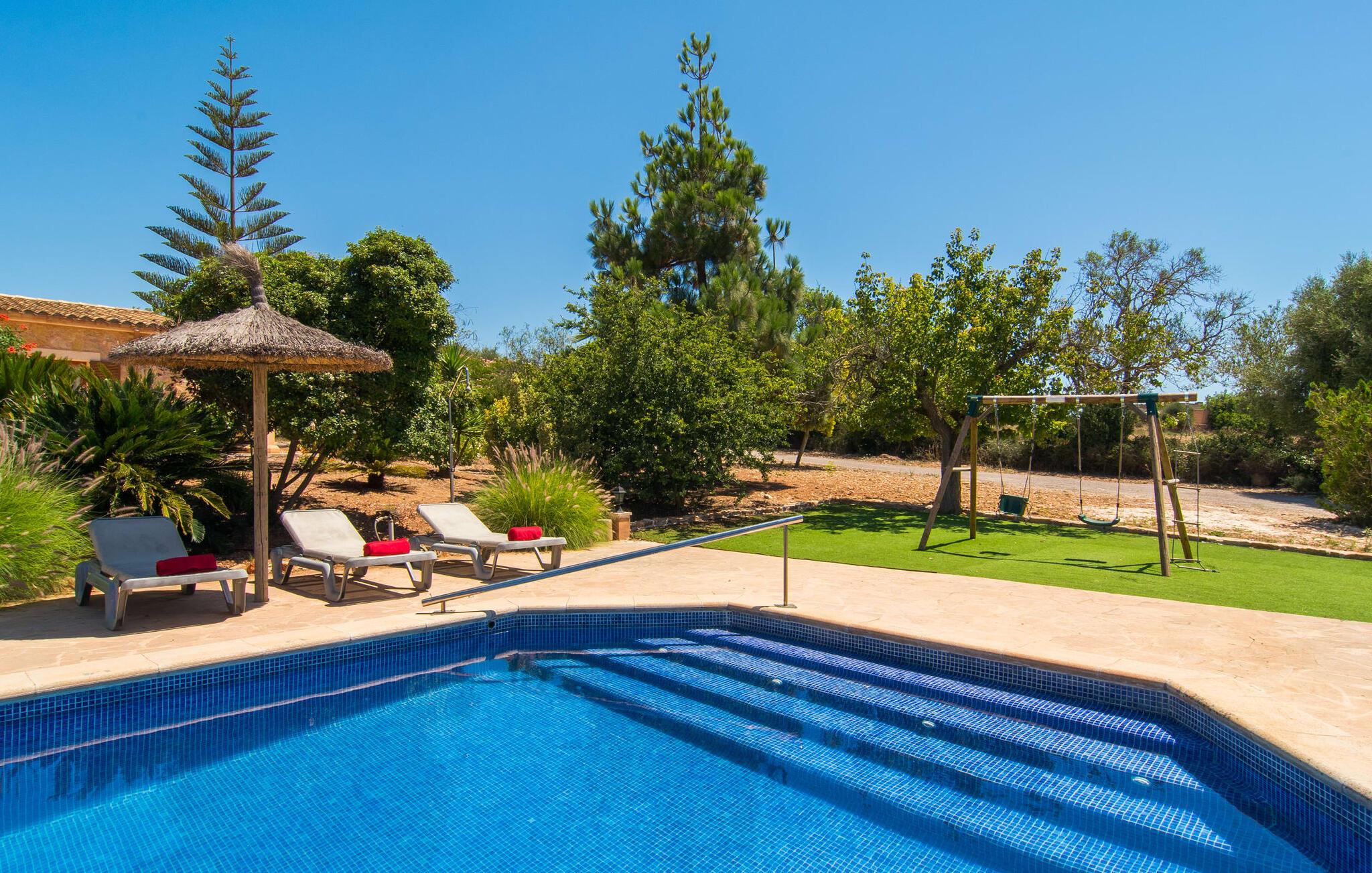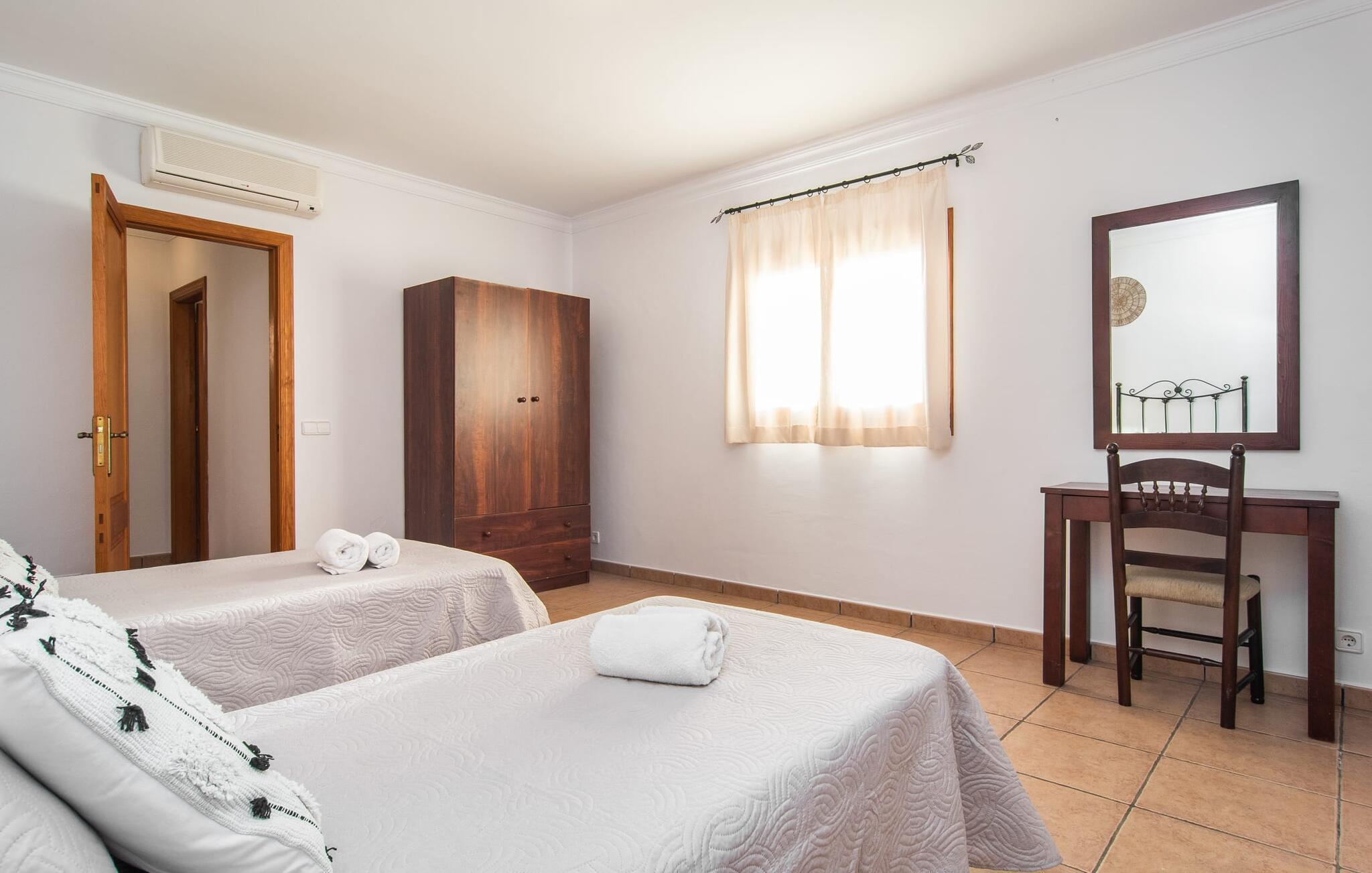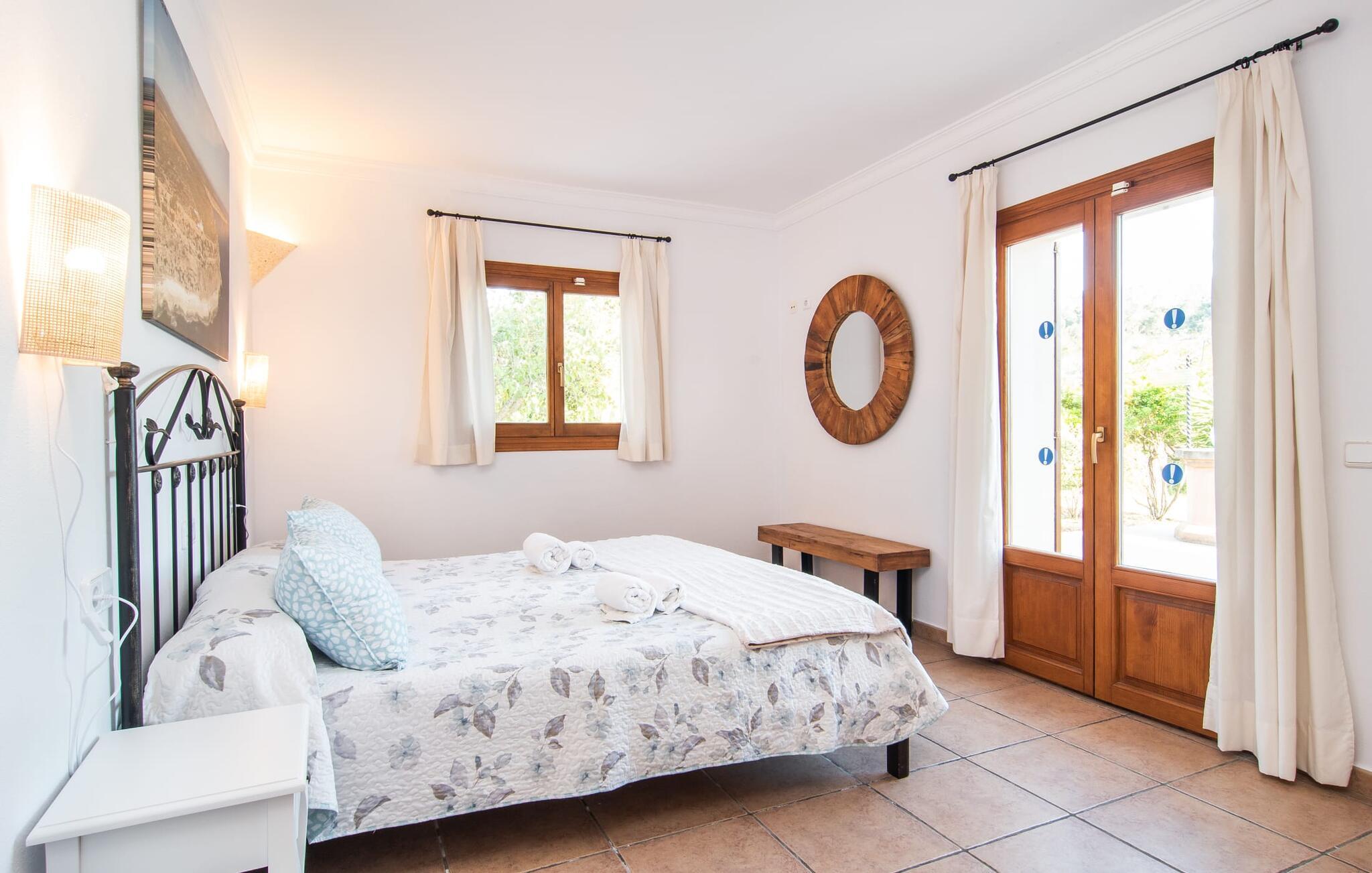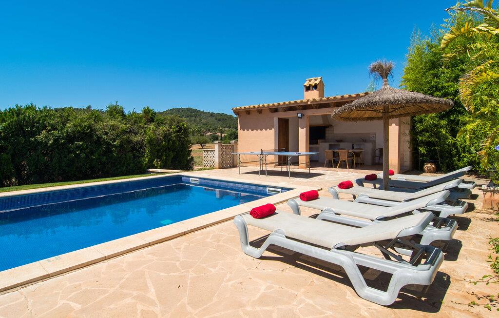 Fold jer ud i 17.000 m² roligt uderum, som byder på varierede loungeområder, smukke træer og et skønt poolområde. På 10 x 5 meter kan I gennemføre både sporty og afslappede kurser om morgenen og starte den nye dag veludhvilet. Morgenmaden vil helt sikkert smage særligt godt på den store veranda med en magisk udsigt - flere siddemuligheder inviterer jer til at slappe af. Om dagen kan I nyde liggestolene eller den overdækkede terrasse ved det hyggelige poolhus, hvor I også om aftenen kan sidde og fremtrylle grillspecialiteter i det praktiske udekøkken. De små, der rejser med jer, vil nyde en række forskellige legemuligheder. I kan i øvrigt få endnu mere panoramaudsigt fra altanen - hold øjnene åbne og fremsyn! Indersiden af fincaen er også meget venlig. Når man træder ind i huset gennem hovedindgangen, befinder man sig først i en rummelig entre, hvorfra trappen fører op til overetagen. På denne etage finder I også det store køkken, to soveværelser med hver to enkeltsenge, et soveværelse med en dobbeltseng, et eget badeværelse og endnu et badeværelse. Stuen og spisestuen, der ligger direkte på verandaen, er harmonisk forbundet med hinanden - et smukt loungeområde til at tilbringe tid sammen indendørs. Den første stueetage rummer et soveværelse med dobbeltseng og badeværelse en suite. Den enkle, rolige stil på denne finca med pool gør det nemt for jer at komme her for at slappe af og få mest muligt ud af den smukke tid på året. Alt dette til et godt pris-ydelsesforhold gør dette hus til et rigtigt tip til os! Denne solide feriefinca med pool byder velkommen i en landlig atmosfære og ligger mindre end 3 km fra den lille by Cas Concos des Cavaller, hvor I kan få alt, hvad I behøver til jeres daglige behov. Efter cirka 14 km er I i Campos, en charmerende by med talrige barer, restauranter og butikker. Feanitx ligger 11 km derfra. I kystbyen Porto Colom - kun et kvarters kørsel væk - kan I slentre langs promenaden eller nyde en svømmetur i Middelhavet.