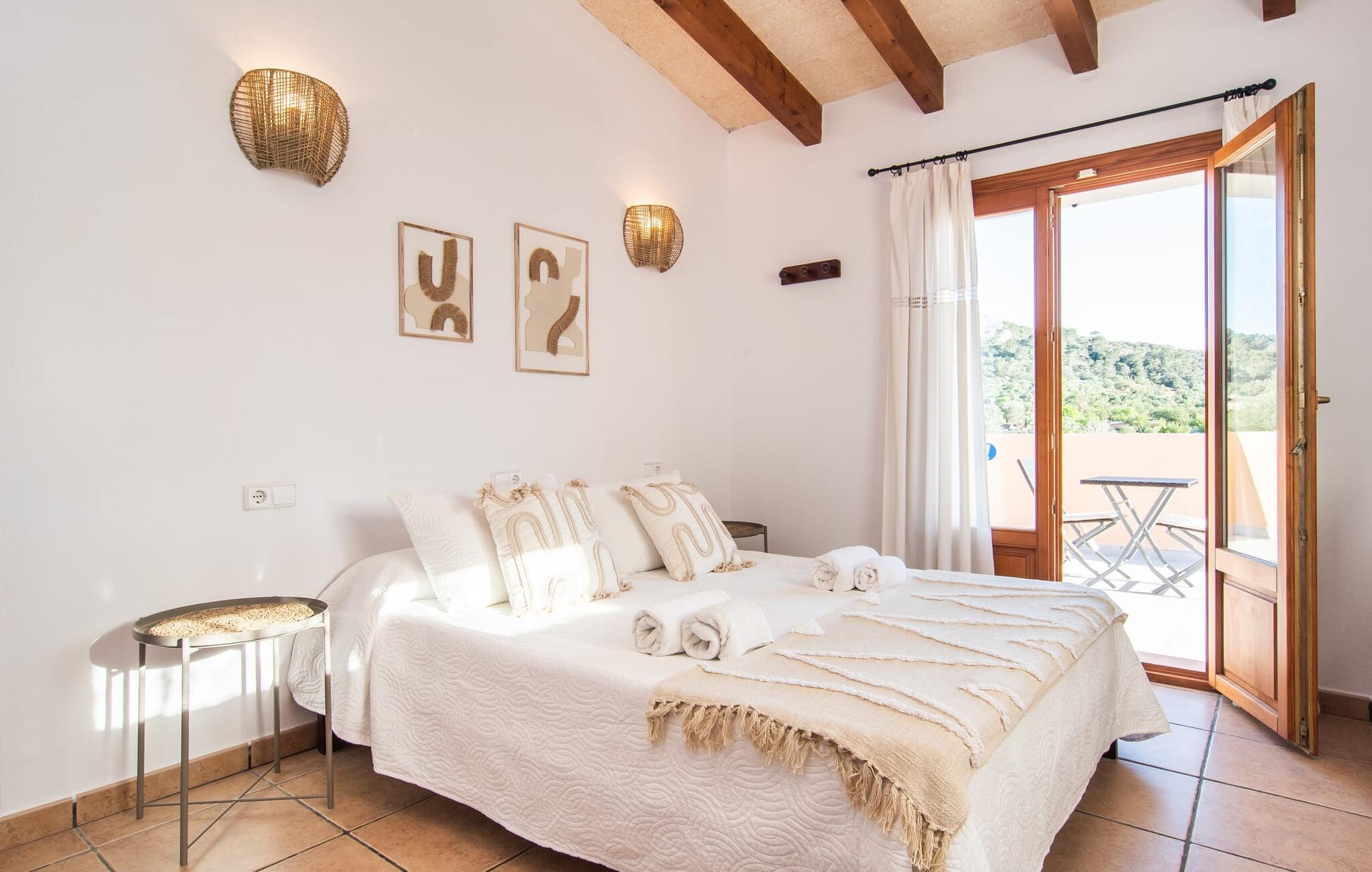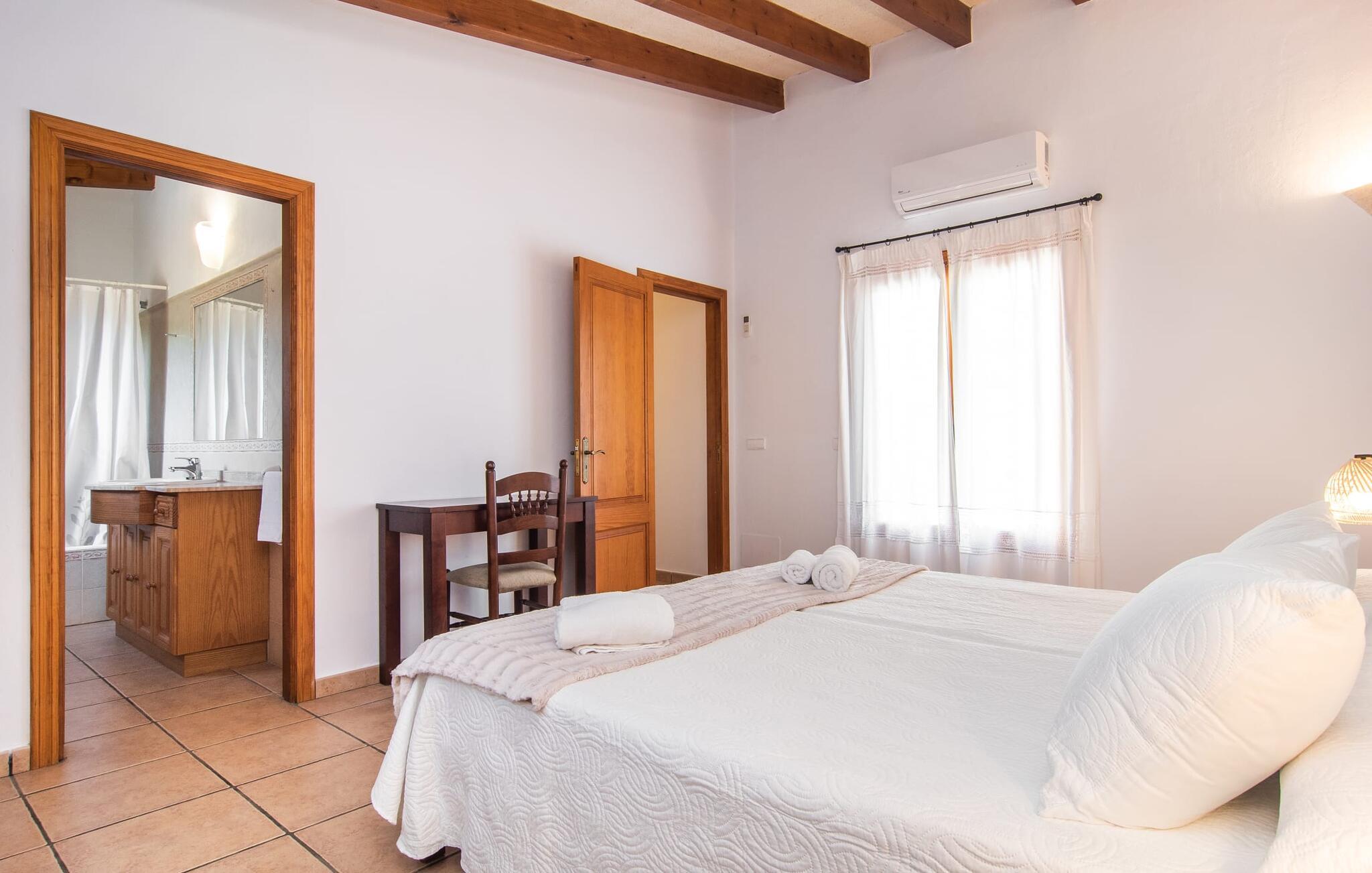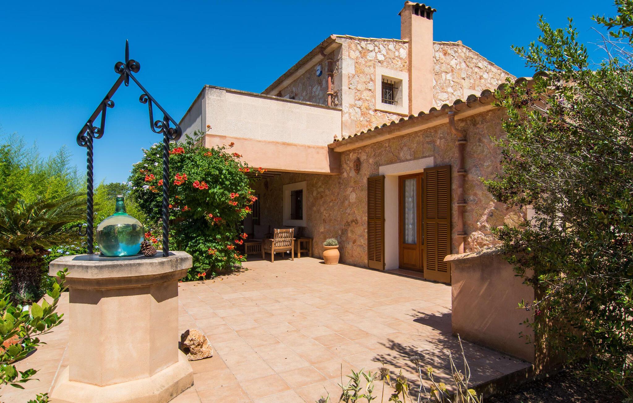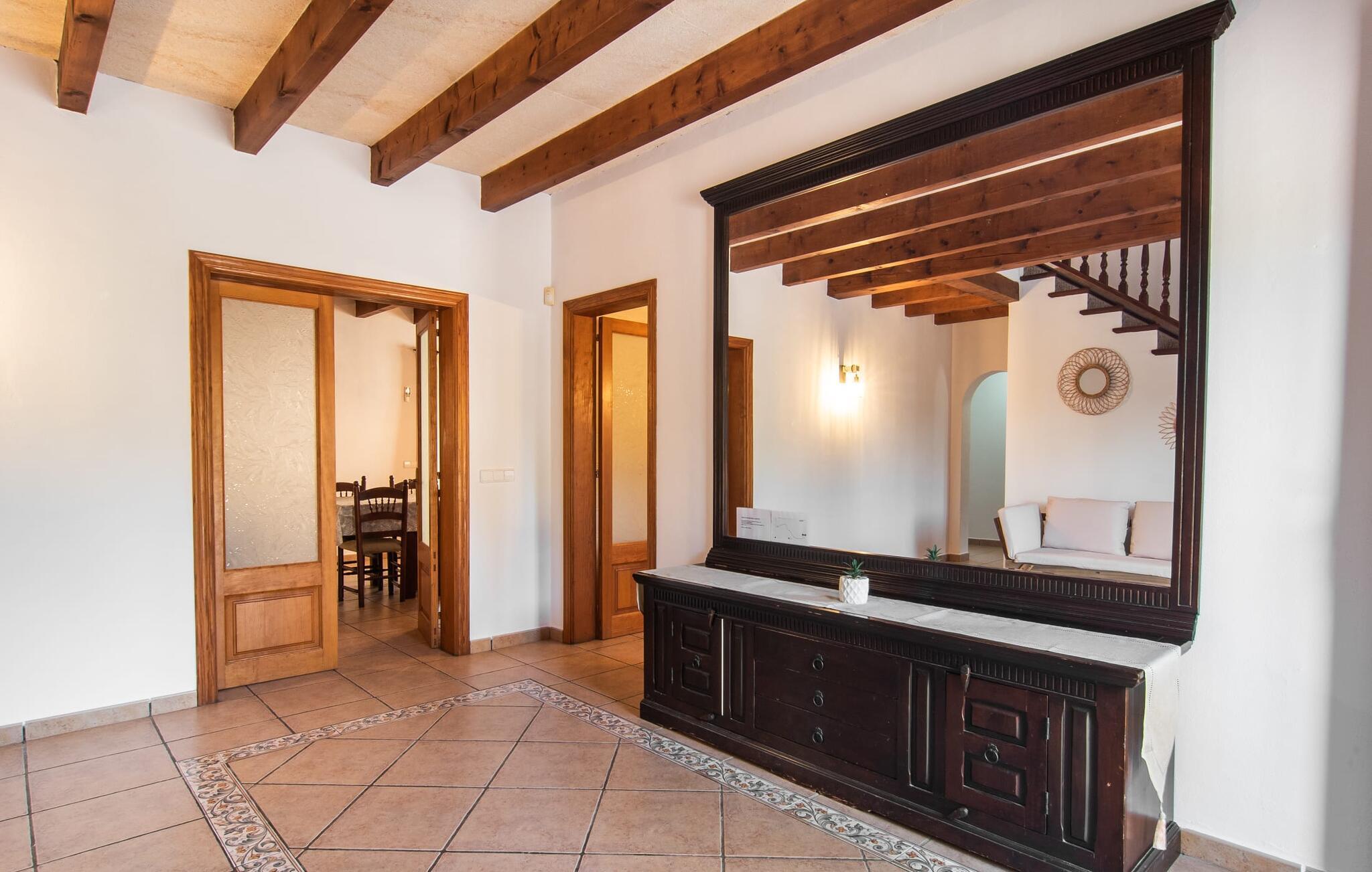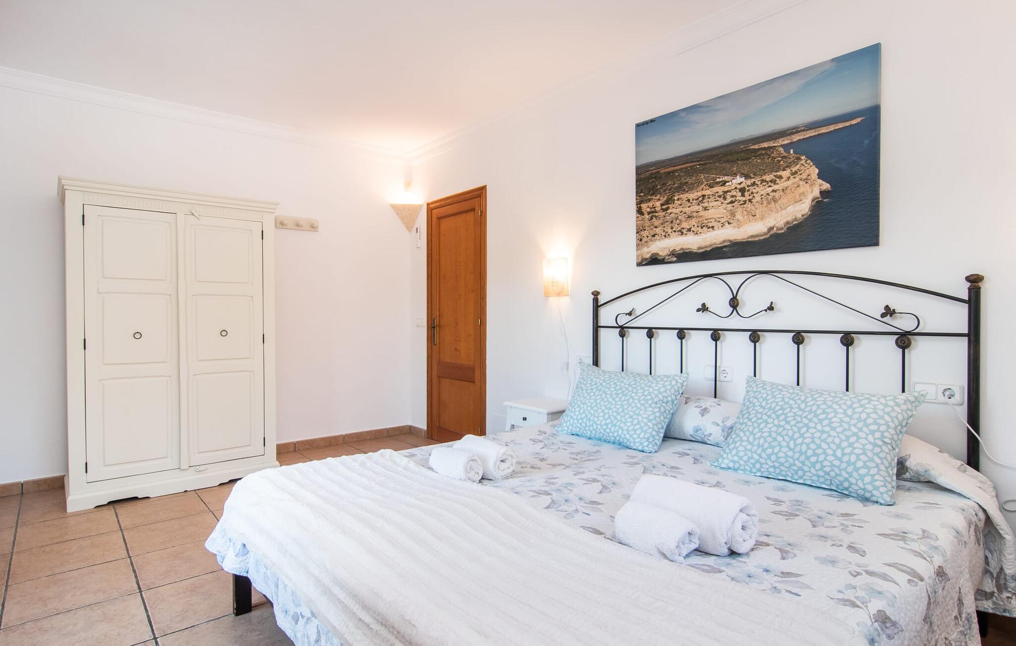 Fold jer ud i 17.000 m² roligt uderum, som byder på varierede loungeområder, smukke træer og et skønt poolområde. På 10 x 5 meter kan I gennemføre både sporty og afslappede kurser om morgenen og starte den nye dag veludhvilet. Morgenmaden vil helt sikkert smage særligt godt på den store veranda med en magisk udsigt - flere siddemuligheder inviterer jer til at slappe af. Om dagen kan I nyde liggestolene eller den overdækkede terrasse ved det hyggelige poolhus, hvor I også om aftenen kan sidde og fremtrylle grillspecialiteter i det praktiske udekøkken. De små, der rejser med jer, vil nyde en række forskellige legemuligheder. I kan i øvrigt få endnu mere panoramaudsigt fra altanen - hold øjnene åbne og fremsyn! Indersiden af fincaen er også meget venlig. Når man træder ind i huset gennem hovedindgangen, befinder man sig først i en rummelig entre, hvorfra trappen fører op til overetagen. På denne etage finder I også det store køkken, to soveværelser med hver to enkeltsenge, et soveværelse med en dobbeltseng, et eget badeværelse og endnu et badeværelse. Stuen og spisestuen, der ligger direkte på verandaen, er harmonisk forbundet med hinanden - et smukt loungeområde til at tilbringe tid sammen indendørs. Den første stueetage rummer et soveværelse med dobbeltseng og badeværelse en suite. Den enkle, rolige stil på denne finca med pool gør det nemt for jer at komme her for at slappe af og få mest muligt ud af den smukke tid på året. Alt dette til et godt pris-ydelsesforhold gør dette hus til et rigtigt tip til os! Denne solide feriefinca med pool byder velkommen i en landlig atmosfære og ligger mindre end 3 km fra den lille by Cas Concos des Cavaller, hvor I kan få alt, hvad I behøver til jeres daglige behov. Efter cirka 14 km er I i Campos, en charmerende by med talrige barer, restauranter og butikker. Feanitx ligger 11 km derfra. I kystbyen Porto Colom - kun et kvarters kørsel væk - kan I slentre langs promenaden eller nyde en svømmetur i Middelhavet.