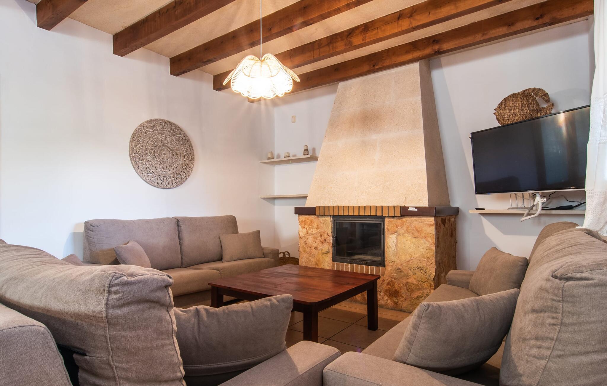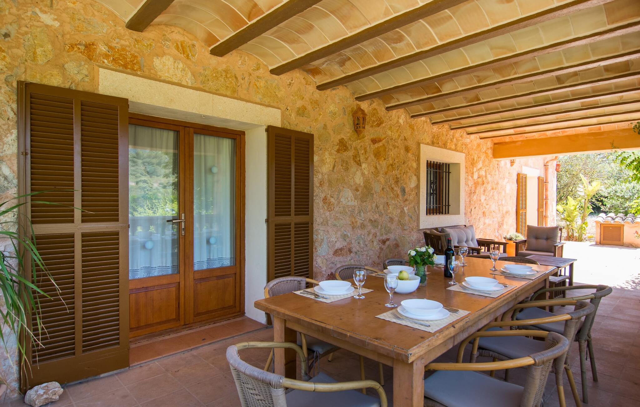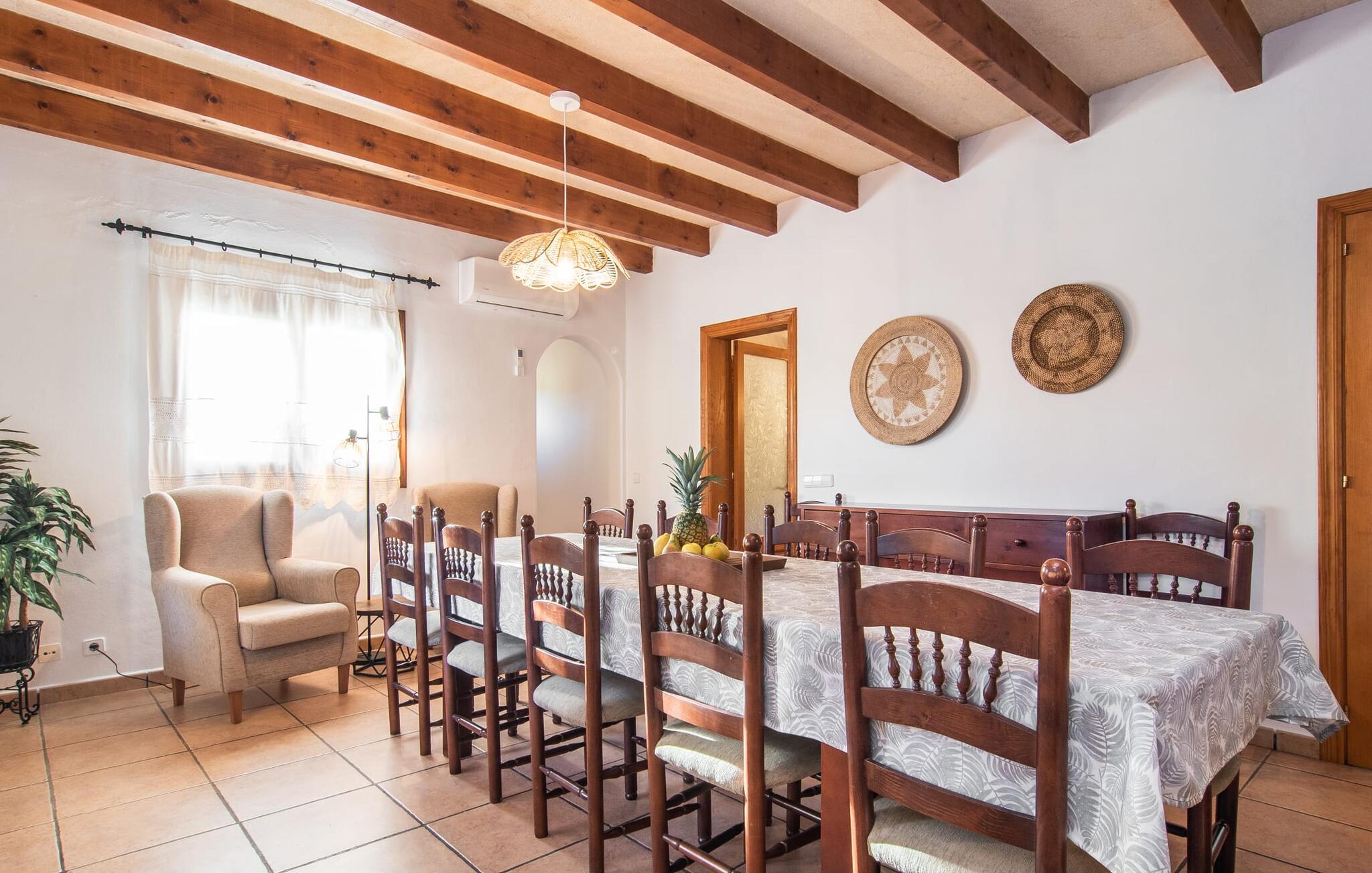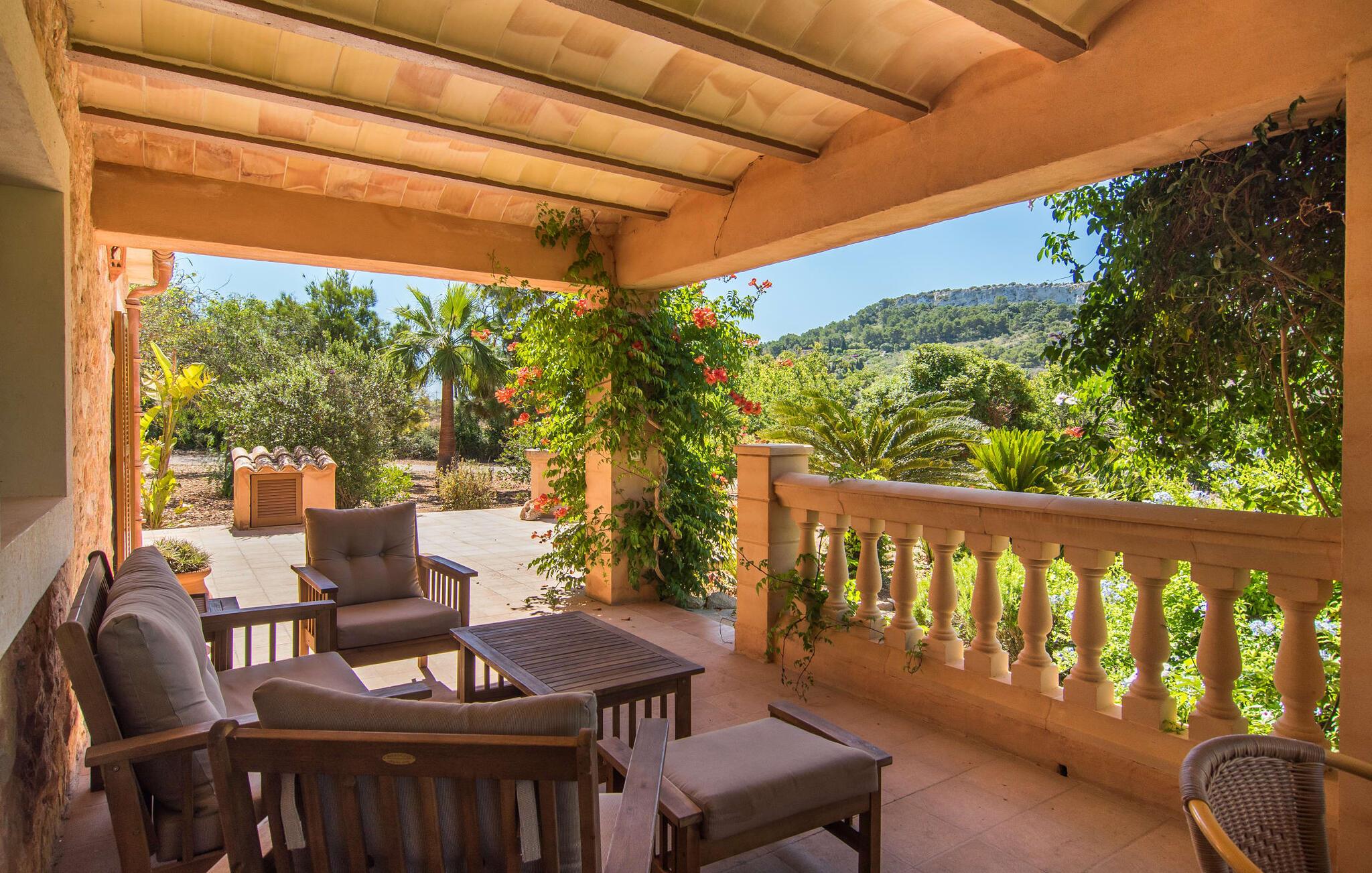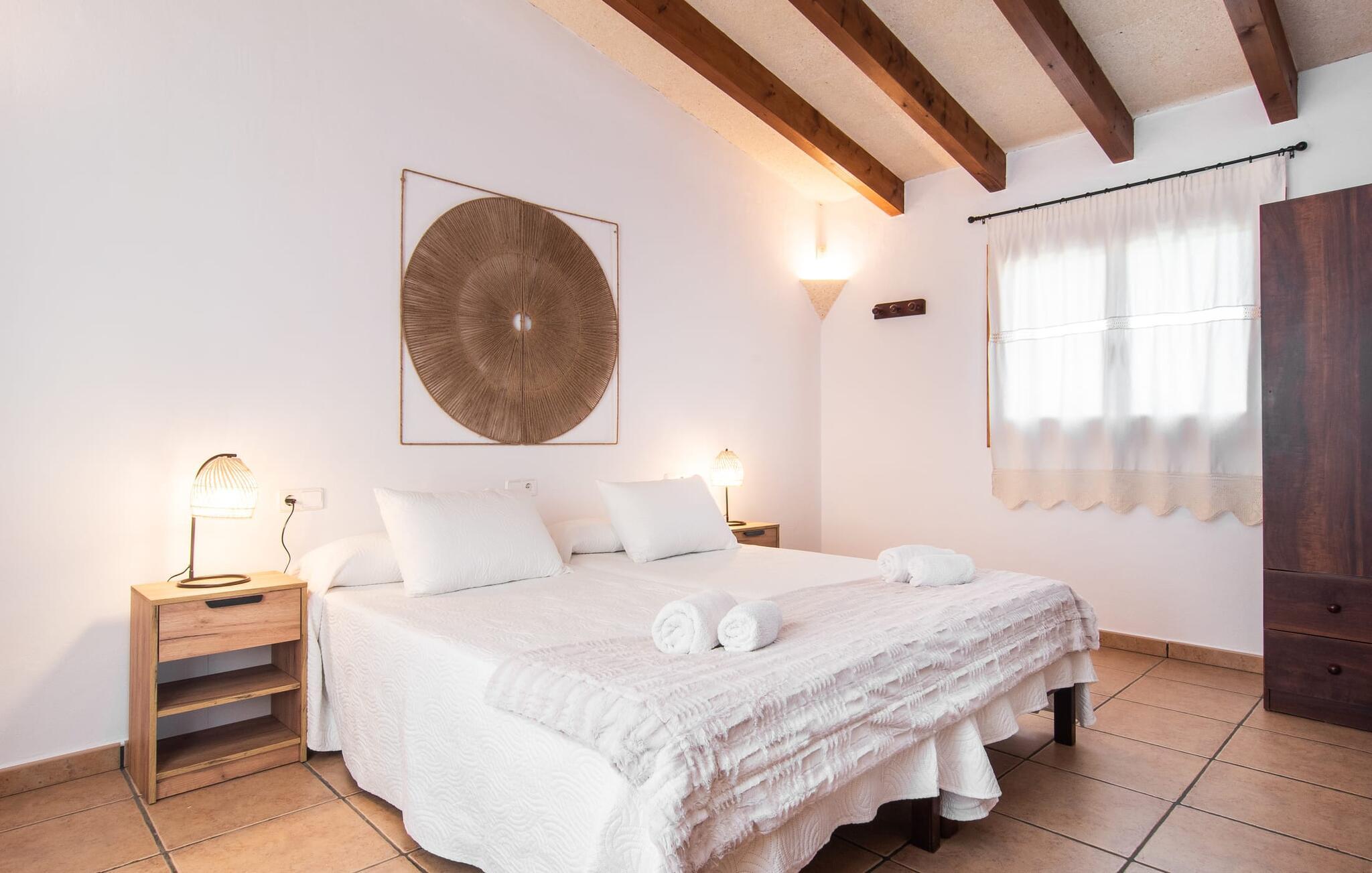 Fold jer ud i 17.000 m² roligt uderum, som byder på varierede loungeområder, smukke træer og et skønt poolområde. På 10 x 5 meter kan I gennemføre både sporty og afslappede kurser om morgenen og starte den nye dag veludhvilet. Morgenmaden vil helt sikkert smage særligt godt på den store veranda med en magisk udsigt - flere siddemuligheder inviterer jer til at slappe af. Om dagen kan I nyde liggestolene eller den overdækkede terrasse ved det hyggelige poolhus, hvor I også om aftenen kan sidde og fremtrylle grillspecialiteter i det praktiske udekøkken. De små, der rejser med jer, vil nyde en række forskellige legemuligheder. I kan i øvrigt få endnu mere panoramaudsigt fra altanen - hold øjnene åbne og fremsyn! Indersiden af fincaen er også meget venlig. Når man træder ind i huset gennem hovedindgangen, befinder man sig først i en rummelig entre, hvorfra trappen fører op til overetagen. På denne etage finder I også det store køkken, to soveværelser med hver to enkeltsenge, et soveværelse med en dobbeltseng, et eget badeværelse og endnu et badeværelse. Stuen og spisestuen, der ligger direkte på verandaen, er harmonisk forbundet med hinanden - et smukt loungeområde til at tilbringe tid sammen indendørs. Den første stueetage rummer et soveværelse med dobbeltseng og badeværelse en suite. Den enkle, rolige stil på denne finca med pool gør det nemt for jer at komme her for at slappe af og få mest muligt ud af den smukke tid på året. Alt dette til et godt pris-ydelsesforhold gør dette hus til et rigtigt tip til os! Denne solide feriefinca med pool byder velkommen i en landlig atmosfære og ligger mindre end 3 km fra den lille by Cas Concos des Cavaller, hvor I kan få alt, hvad I behøver til jeres daglige behov. Efter cirka 14 km er I i Campos, en charmerende by med talrige barer, restauranter og butikker. Feanitx ligger 11 km derfra. I kystbyen Porto Colom - kun et kvarters kørsel væk - kan I slentre langs promenaden eller nyde en svømmetur i Middelhavet.