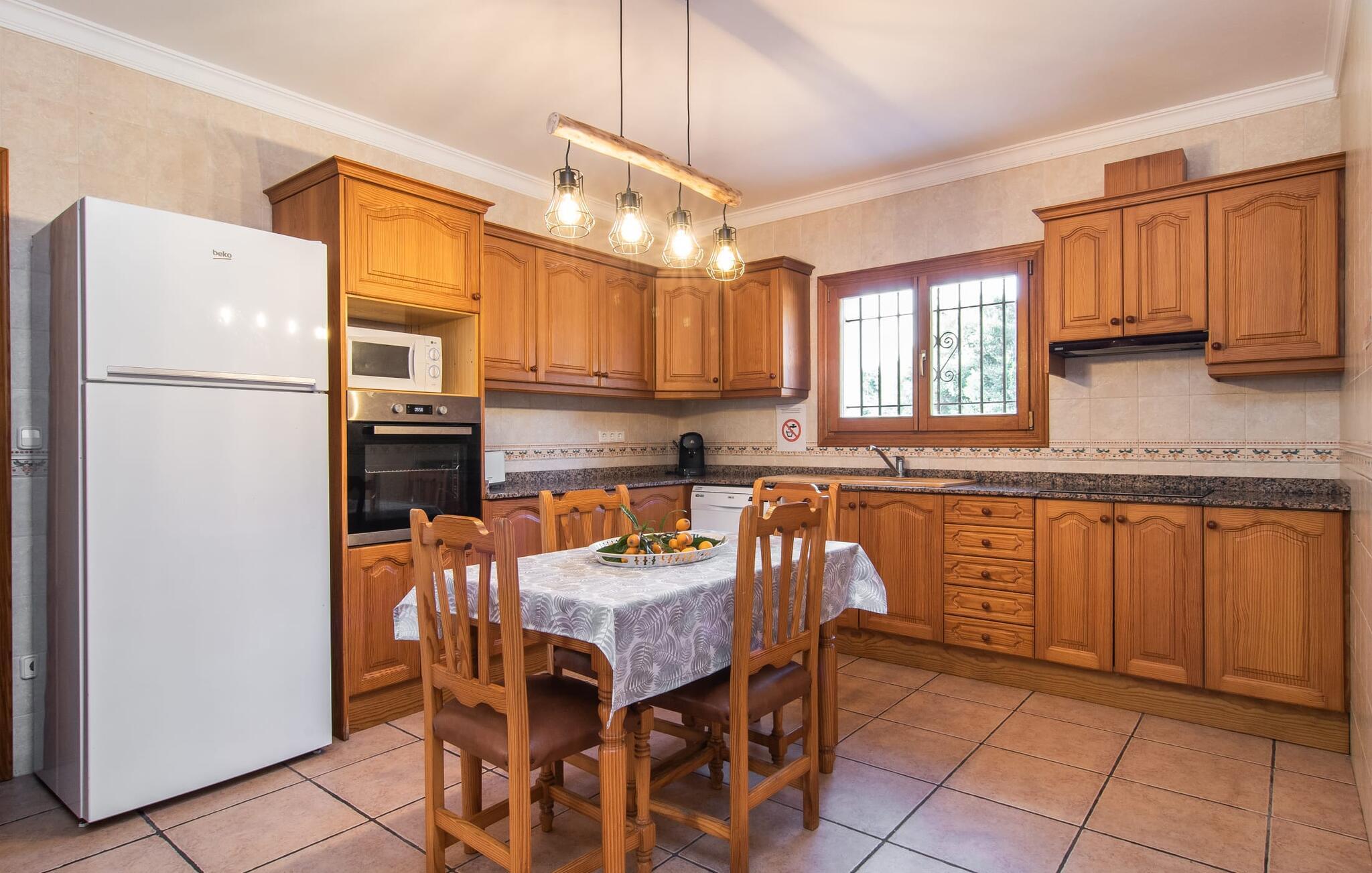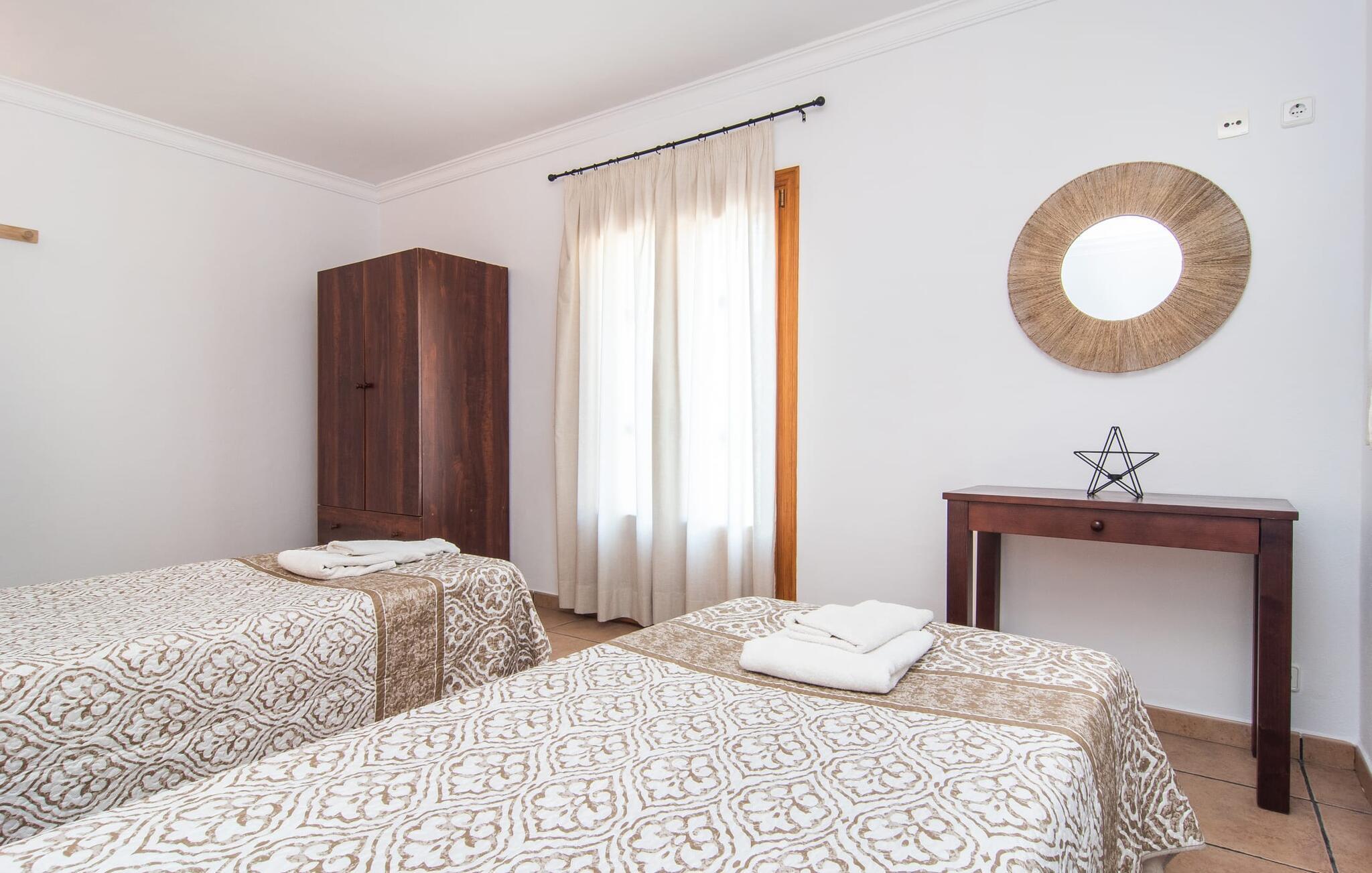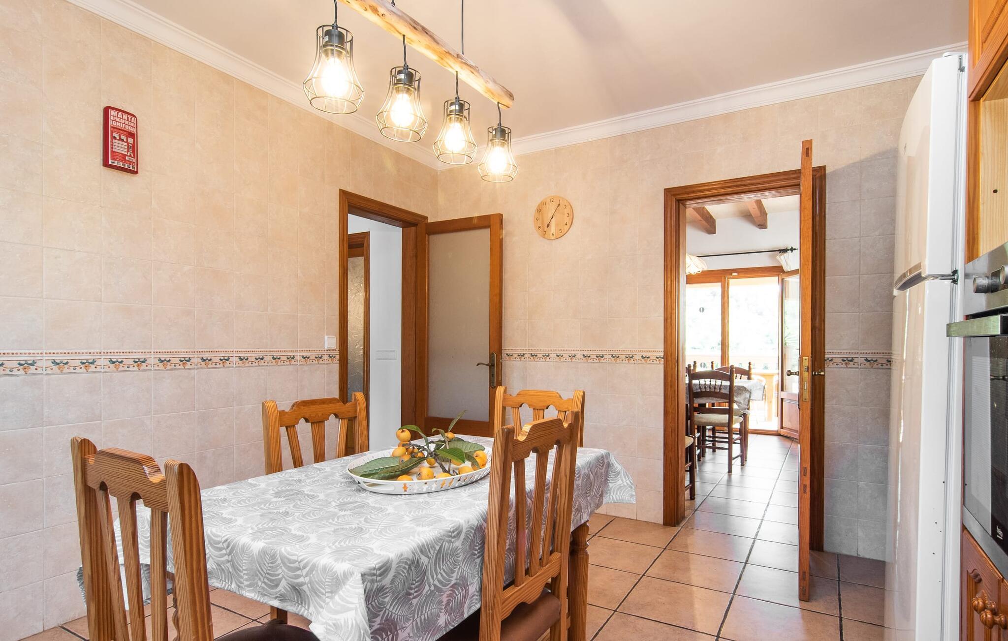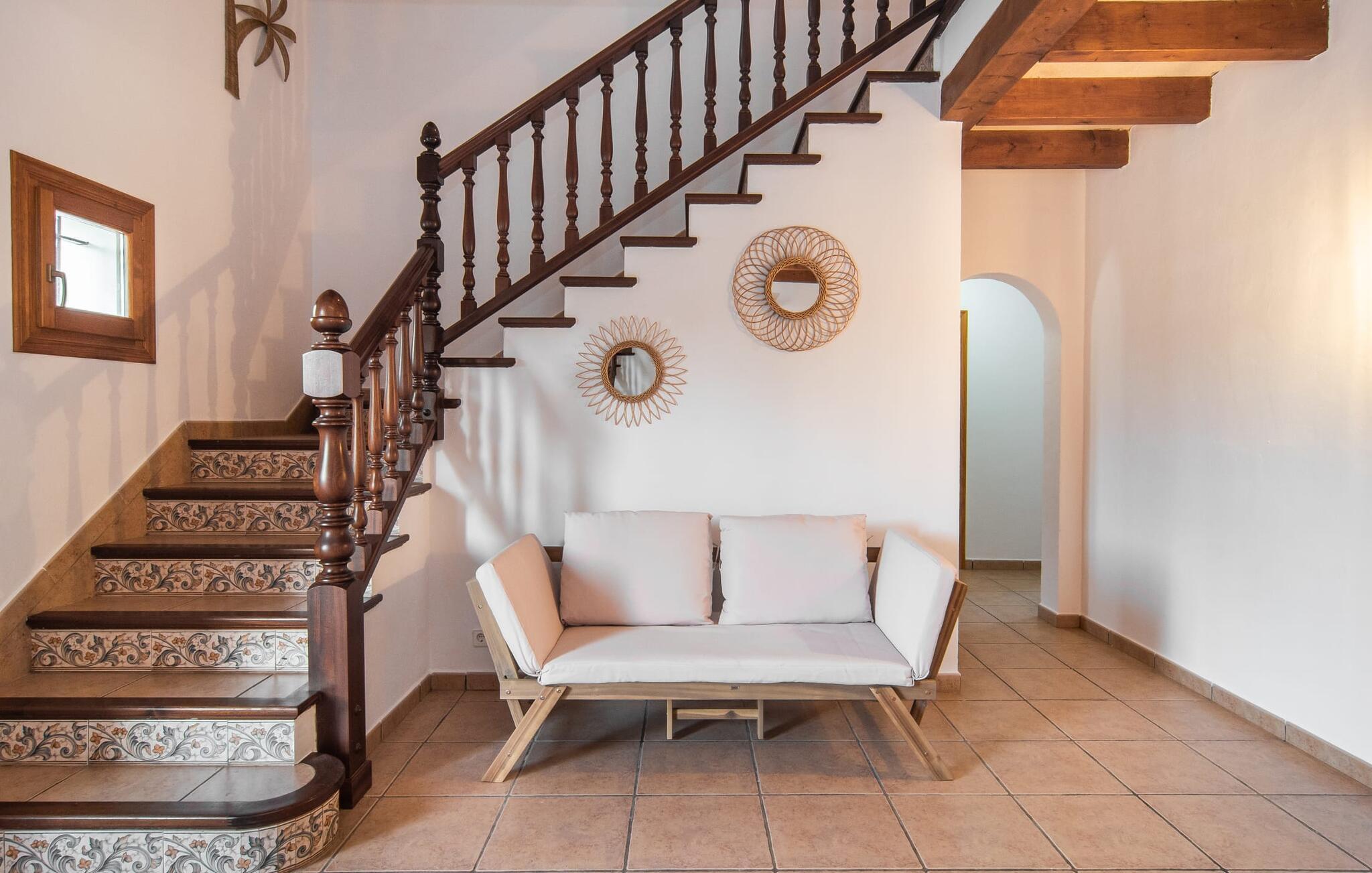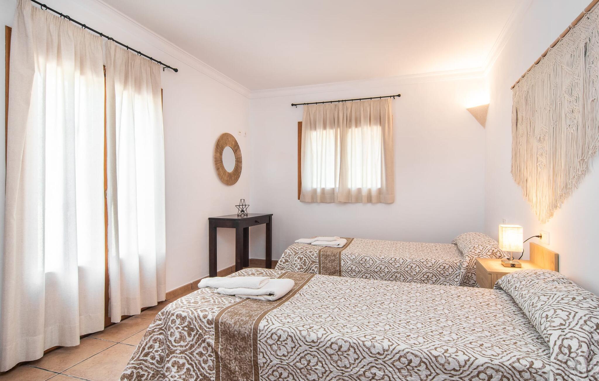 Fold jer ud i 17.000 m² roligt uderum, som byder på varierede loungeområder, smukke træer og et skønt poolområde. På 10 x 5 meter kan I gennemføre både sporty og afslappede kurser om morgenen og starte den nye dag veludhvilet. Morgenmaden vil helt sikkert smage særligt godt på den store veranda med en magisk udsigt - flere siddemuligheder inviterer jer til at slappe af. Om dagen kan I nyde liggestolene eller den overdækkede terrasse ved det hyggelige poolhus, hvor I også om aftenen kan sidde og fremtrylle grillspecialiteter i det praktiske udekøkken. De små, der rejser med jer, vil nyde en række forskellige legemuligheder. I kan i øvrigt få endnu mere panoramaudsigt fra altanen - hold øjnene åbne og fremsyn! Indersiden af fincaen er også meget venlig. Når man træder ind i huset gennem hovedindgangen, befinder man sig først i en rummelig entre, hvorfra trappen fører op til overetagen. På denne etage finder I også det store køkken, to soveværelser med hver to enkeltsenge, et soveværelse med en dobbeltseng, et eget badeværelse og endnu et badeværelse. Stuen og spisestuen, der ligger direkte på verandaen, er harmonisk forbundet med hinanden - et smukt loungeområde til at tilbringe tid sammen indendørs. Den første stueetage rummer et soveværelse med dobbeltseng og badeværelse en suite. Den enkle, rolige stil på denne finca med pool gør det nemt for jer at komme her for at slappe af og få mest muligt ud af den smukke tid på året. Alt dette til et godt pris-ydelsesforhold gør dette hus til et rigtigt tip til os! Denne solide feriefinca med pool byder velkommen i en landlig atmosfære og ligger mindre end 3 km fra den lille by Cas Concos des Cavaller, hvor I kan få alt, hvad I behøver til jeres daglige behov. Efter cirka 14 km er I i Campos, en charmerende by med talrige barer, restauranter og butikker. Feanitx ligger 11 km derfra. I kystbyen Porto Colom - kun et kvarters kørsel væk - kan I slentre langs promenaden eller nyde en svømmetur i Middelhavet.
