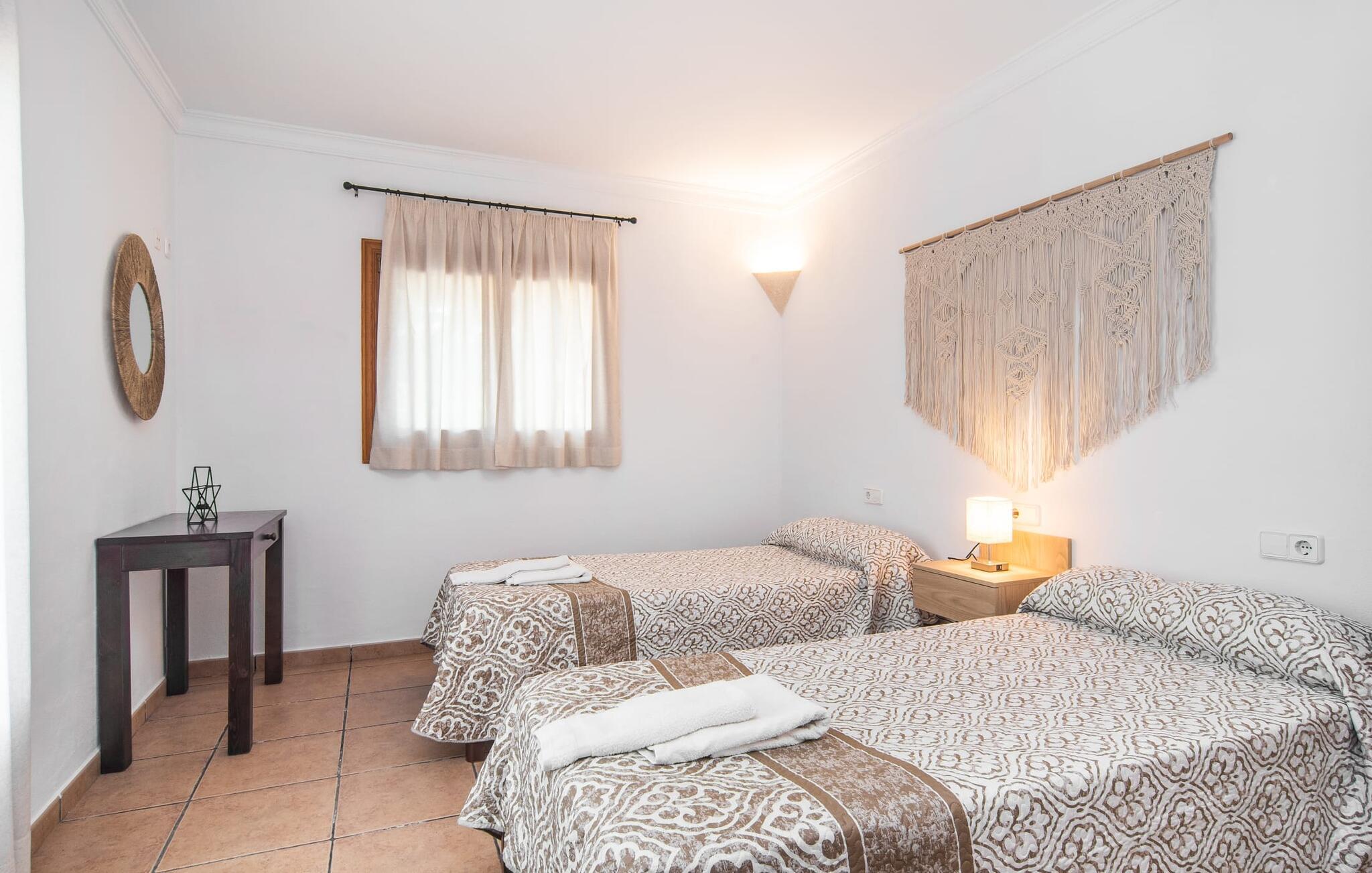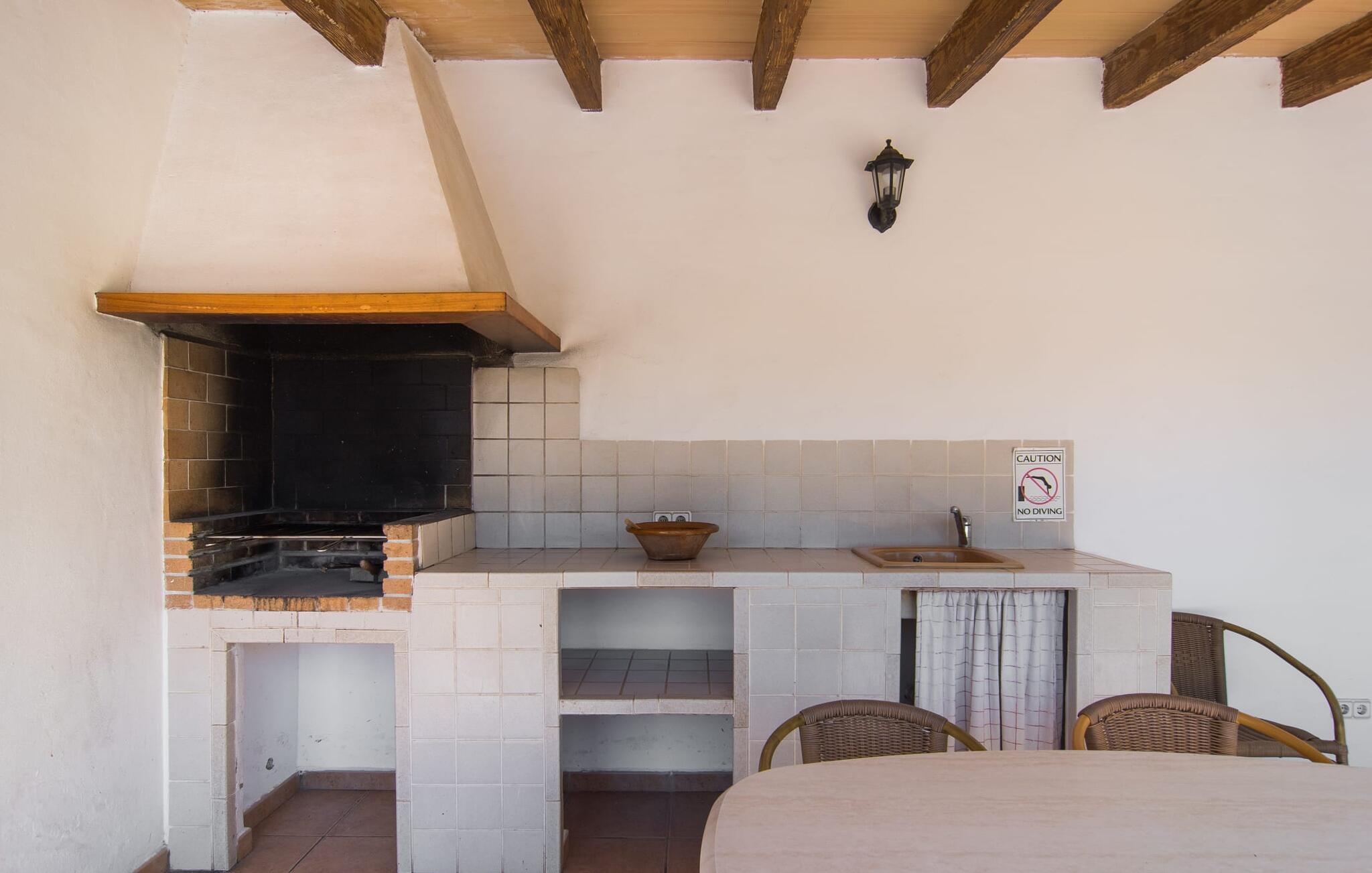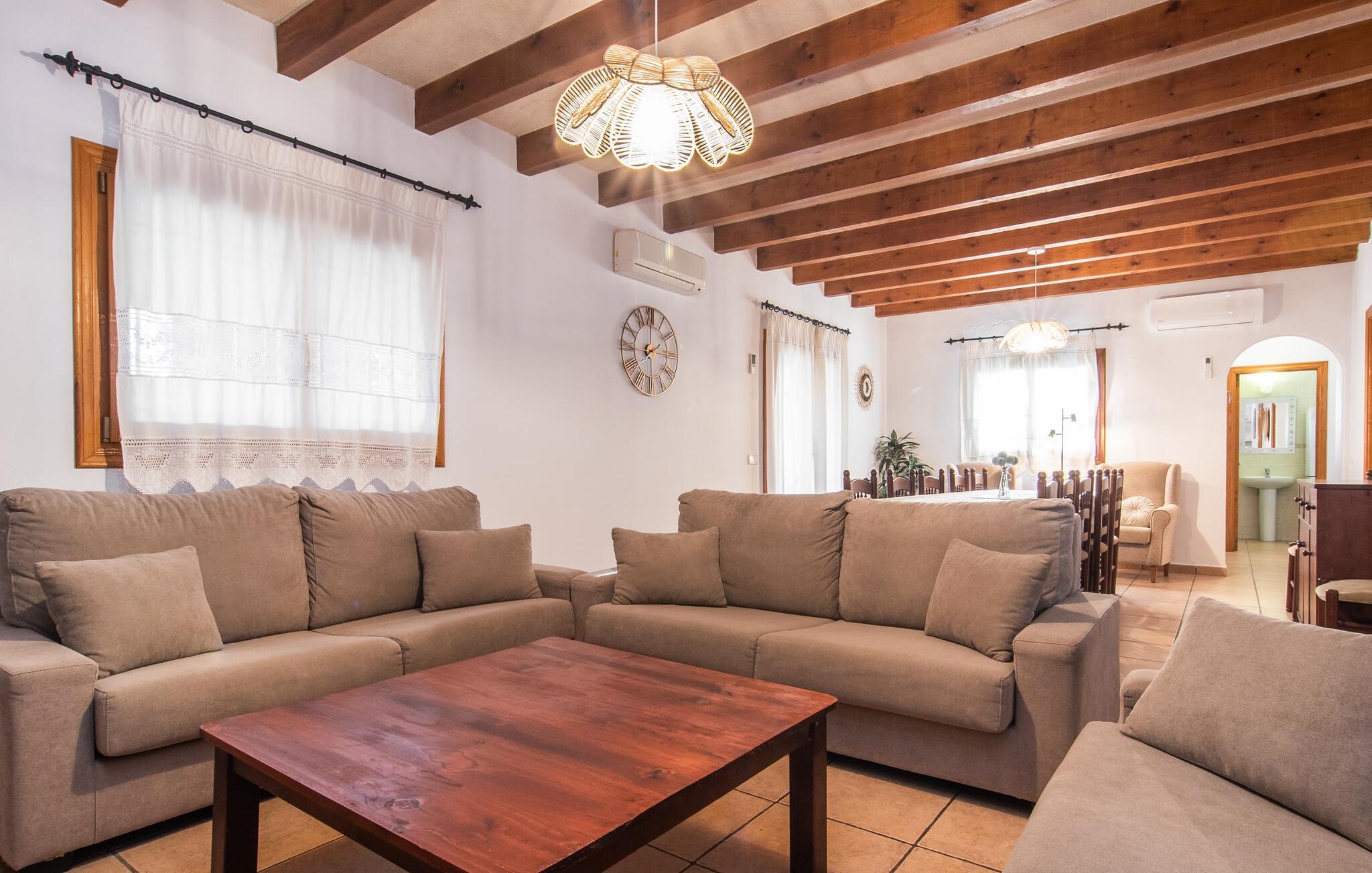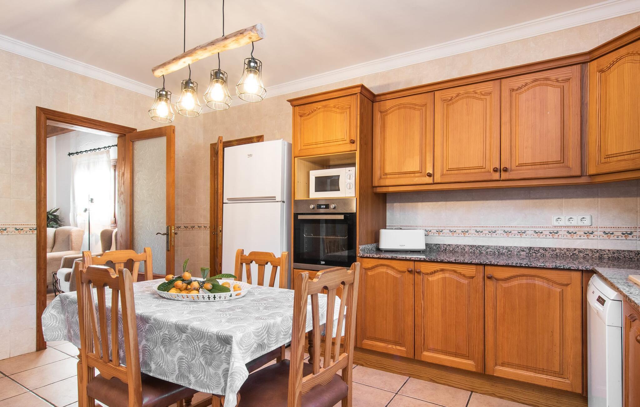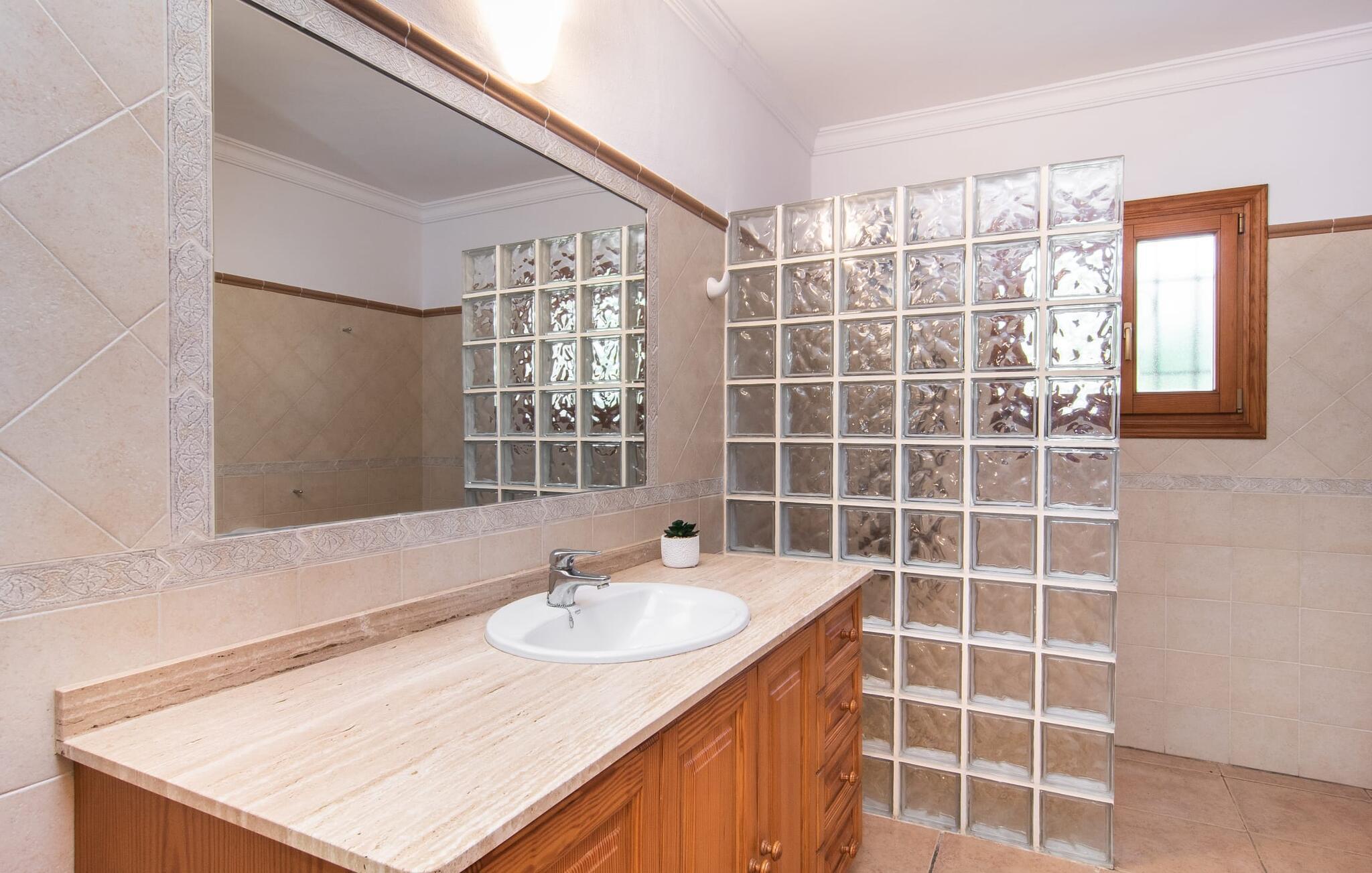 Fold jer ud i 17.000 m² roligt uderum, som byder på varierede loungeområder, smukke træer og et skønt poolområde. På 10 x 5 meter kan I gennemføre både sporty og afslappede kurser om morgenen og starte den nye dag veludhvilet. Morgenmaden vil helt sikkert smage særligt godt på den store veranda med en magisk udsigt - flere siddemuligheder inviterer jer til at slappe af. Om dagen kan I nyde liggestolene eller den overdækkede terrasse ved det hyggelige poolhus, hvor I også om aftenen kan sidde og fremtrylle grillspecialiteter i det praktiske udekøkken. De små, der rejser med jer, vil nyde en række forskellige legemuligheder. I kan i øvrigt få endnu mere panoramaudsigt fra altanen - hold øjnene åbne og fremsyn! Indersiden af fincaen er også meget venlig. Når man træder ind i huset gennem hovedindgangen, befinder man sig først i en rummelig entre, hvorfra trappen fører op til overetagen. På denne etage finder I også det store køkken, to soveværelser med hver to enkeltsenge, et soveværelse med en dobbeltseng, et eget badeværelse og endnu et badeværelse. Stuen og spisestuen, der ligger direkte på verandaen, er harmonisk forbundet med hinanden - et smukt loungeområde til at tilbringe tid sammen indendørs. Den første stueetage rummer et soveværelse med dobbeltseng og badeværelse en suite. Den enkle, rolige stil på denne finca med pool gør det nemt for jer at komme her for at slappe af og få mest muligt ud af den smukke tid på året. Alt dette til et godt pris-ydelsesforhold gør dette hus til et rigtigt tip til os! Denne solide feriefinca med pool byder velkommen i en landlig atmosfære og ligger mindre end 3 km fra den lille by Cas Concos des Cavaller, hvor I kan få alt, hvad I behøver til jeres daglige behov. Efter cirka 14 km er I i Campos, en charmerende by med talrige barer, restauranter og butikker. Feanitx ligger 11 km derfra. I kystbyen Porto Colom - kun et kvarters kørsel væk - kan I slentre langs promenaden eller nyde en svømmetur i Middelhavet.