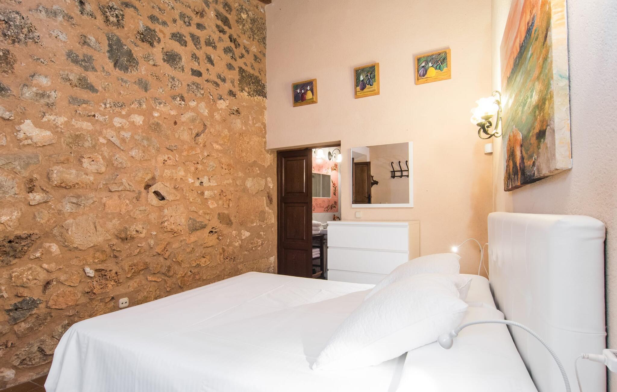 Navnet på det drømmende bondehus "Son Rossinyol" oversættes som "nattergal" - og den mallorcanske feriedestination med sin smukke have fuld af middelhavsfrodighed ligner faktisk et fortryllet sted fra en historisk roman. Frodige grønne græsplæner, en børnevenlig pool med indviklede mosaikker, gamle træer, hvor du kan slappe af i en hængekøje - hvem ville ikke blive begejstret? Solbad på de komfortable liggestole eller læs en god bog, mens børnene hygger sig i poolen. Alt dette foregår i uberørte omgivelser fuld af vindmøller og landbrugskarakter, på den sublime baggrund af Tramuntana-bjergene, som du tydeligt kan se i horisonten. I dette mallorcanske feriehus kan du nyde at sidde ved spisebordet under den skyggefulde terrasse og forberede en lækker BBQ i udekøkkenet med murstensgrill. Mens solen fortsætter med at synke, kan du også nyde en hyggelig sundowner på bodega-stil murstensbænken - undslip hverdagens stress og jag på din velfortjente ferie. Dette er et Fincallorca feriehus. Selve det gamle stenhus har også en historisk flair og er ideel til en familie. Stilen er rustik og hyggelig og passer perfekt ind i denne jordnære region og landsbyen Llubí med sine 2.300 indbyggere. Masser af træ og fritlagte stenbrud i den hyggelige opholdsstue udgør sammen med spisepladsen og det åbne køkken hjertet i det landlige sommerhus. Indretningen kan være enkel, men detaljerne bidrager til den rustikke karakter, hvilket den åbne pejs naturligvis også bidrager til. I dette åbne område fører en trappe til et galleri, hvor der er placeret to senge. For dem, der kan lide noget mere tilbagetrukket, er der to soveværelser med aircondition - så der er god plads til familien, som gerne må tage deres kæledyr med. To walk-in brusere fuldender komforten, ideel for alle, der ønsker at opleve mallorcinsk landliv uden at lægge pres på deres budget. Simpelthen yndig! I hjertet af øen venter den familievenlige perle "Son Rossinyol" på dig med en middelhavshave, børnesikret pool og et smukt udekøkken med grill. Det attraktive bondehus ligger kun 5 minutter fra den sentimentale lille by Llubí, som du også kan nå til fods. På grund af nærheden til den akustisk mærkbare landevej kan du meget hurtigt besøge attraktive steder som Sineu eller Inca. Alcúdia-bugten med dens brede udvalg af drømmestrande ligger også kun 20 minutter væk i bil.