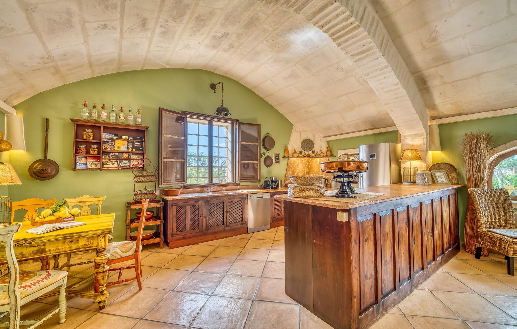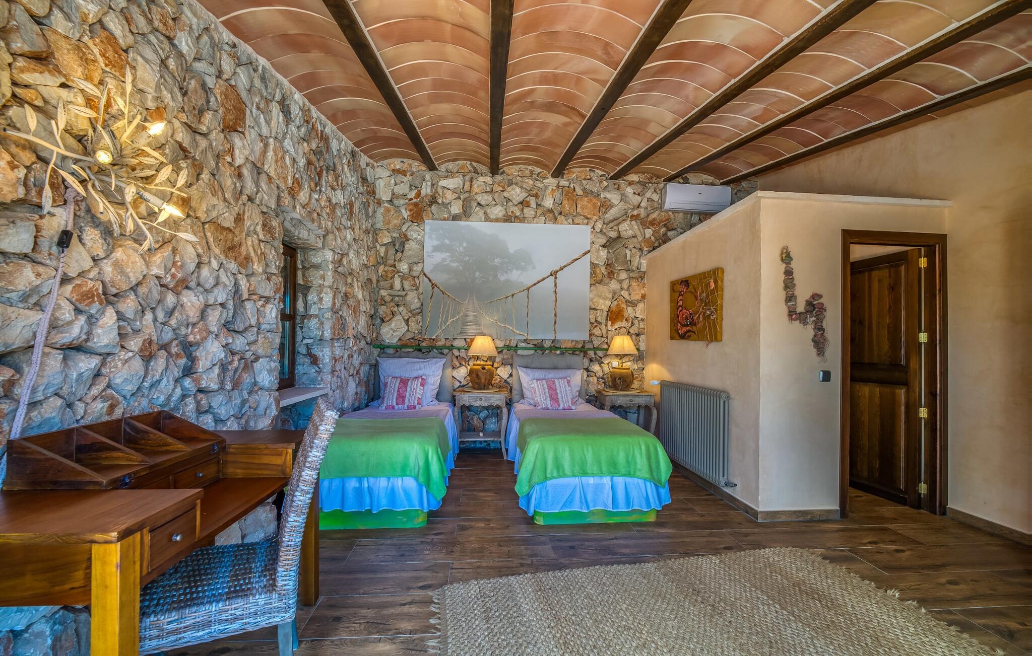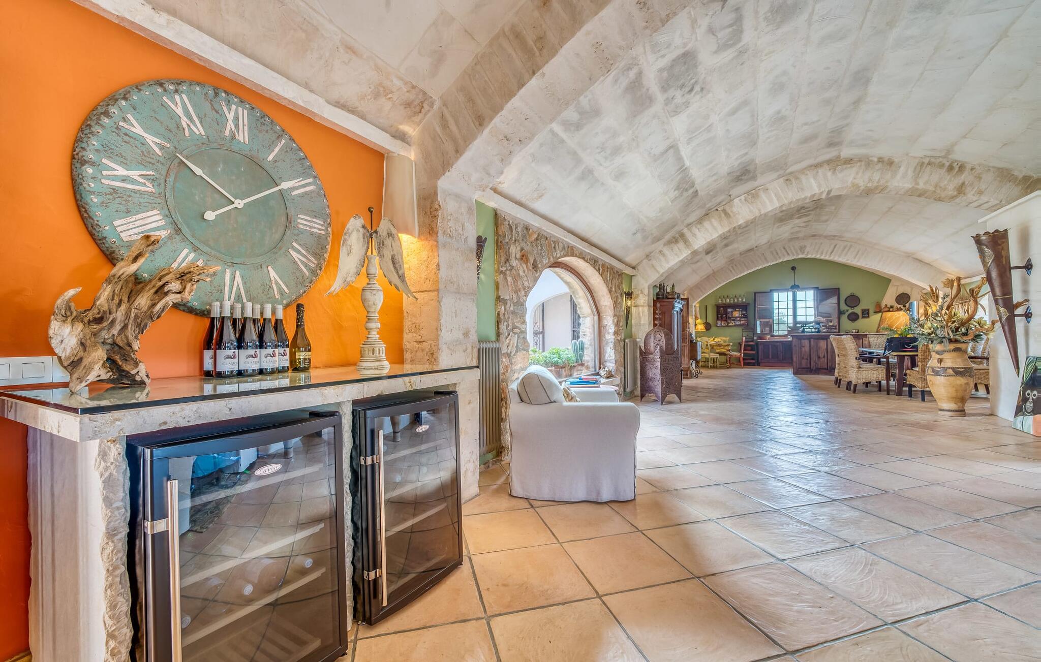 Villaen emmer af en nærmest fortryllet atmosfære indenfor. Alt er dejligt lyst og hyggeligt indrettet - og også meget smagfuldt og individuelt. Mange vinduer slipper masser af lys ind og byder på en fantastisk udsigt til både haven og ejendommens romantiske gårdhave. Opholds- og spiseafdelingen samt køkkenet er indrettet i et stort, aflangt åbent rum. I stuen finder I flere komfortable sofaer og lænestole - hvor I enten kan slappe af og se tv eller spille klaver ved det knitrende bål. Ligesom køkkenet med det brede bord og ekstra bord, har spisepladsen også et rustikt udseende: varmt træ og komfortable kurvestole lægger op til at sidde behageligt sammen. Når I ikke længere kan holde øjnene åbne, så tag til et af de charmerende dobbeltværelser, hver med separat adgang udefra. En af dem er lige foran poolen. Hvert værelse har også et smart privat badeværelse.