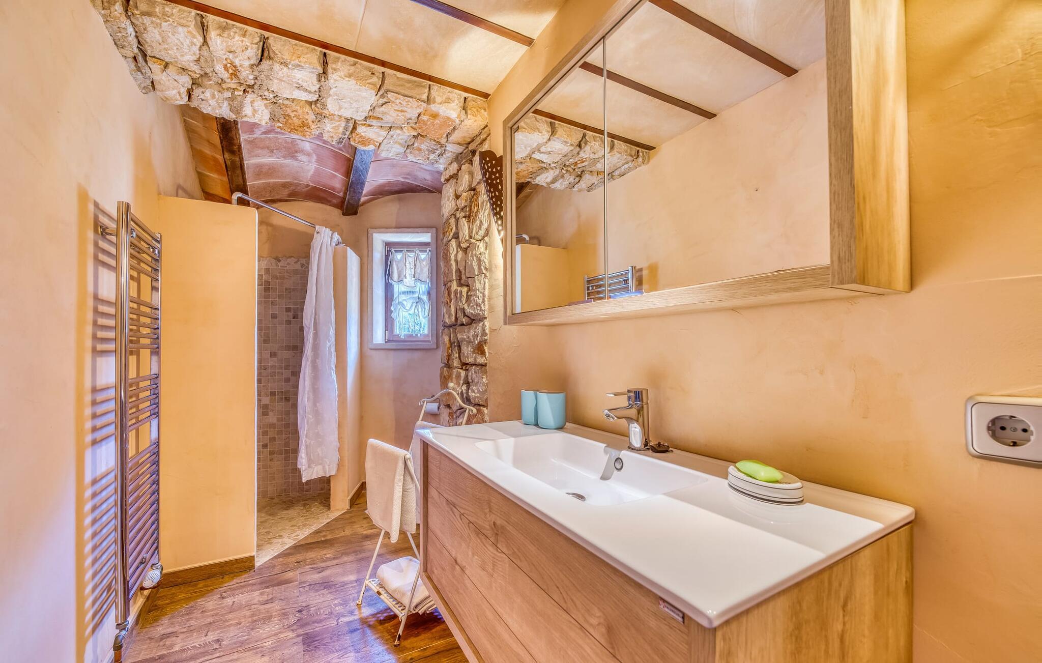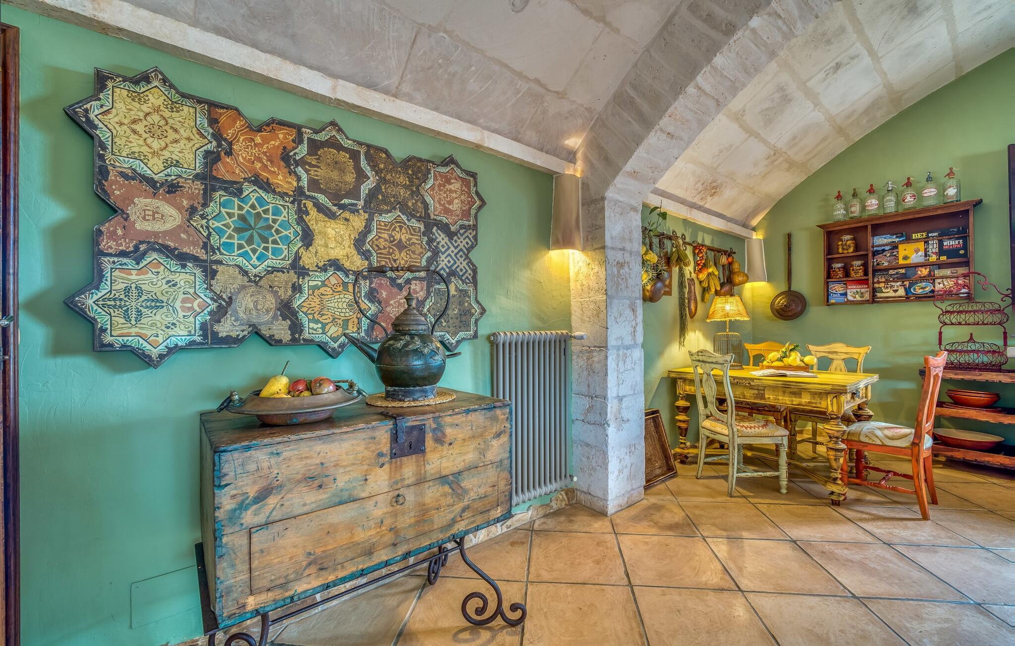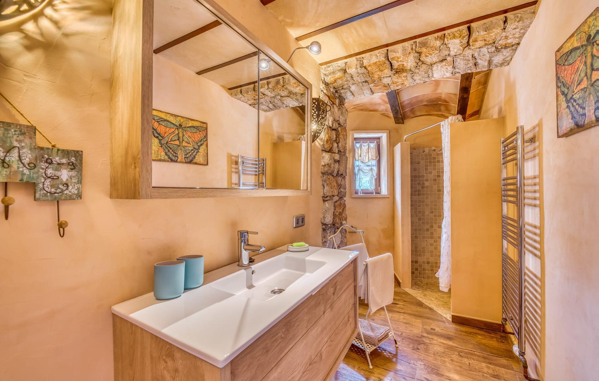 Villaen emmer af en nærmest fortryllet atmosfære indenfor. Alt er dejligt lyst og hyggeligt indrettet - og også meget smagfuldt og individuelt. Mange vinduer slipper masser af lys ind og byder på en fantastisk udsigt til både haven og ejendommens romantiske gårdhave. Opholds- og spiseafdelingen samt køkkenet er indrettet i et stort, aflangt åbent rum. I stuen finder I flere komfortable sofaer og lænestole - hvor I enten kan slappe af og se tv eller spille klaver ved det knitrende bål. Ligesom køkkenet med det brede bord og ekstra bord, har spisepladsen også et rustikt udseende: varmt træ og komfortable kurvestole lægger op til at sidde behageligt sammen. Når I ikke længere kan holde øjnene åbne, så tag til et af de charmerende dobbeltværelser, hver med separat adgang udefra. En af dem er lige foran poolen. Hvert værelse har også et smart privat badeværelse.