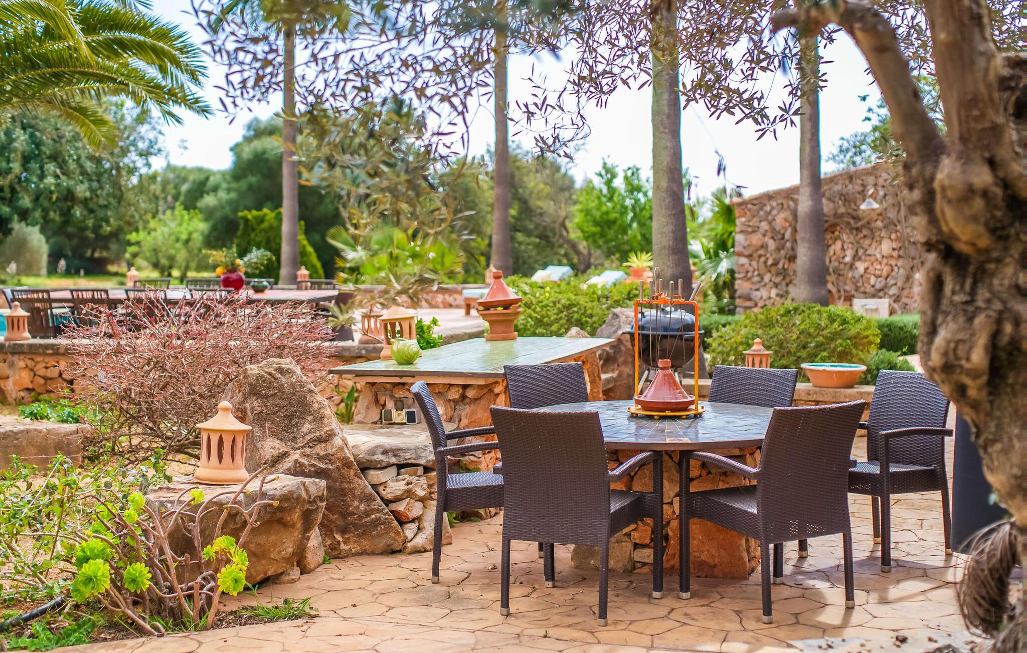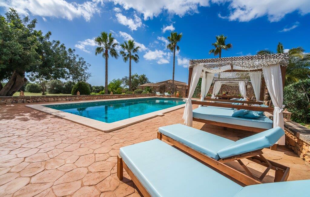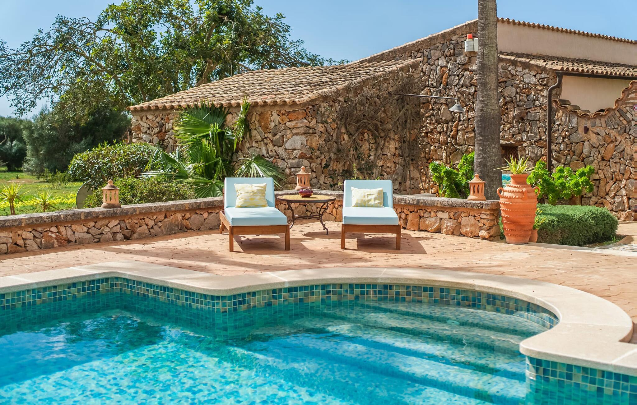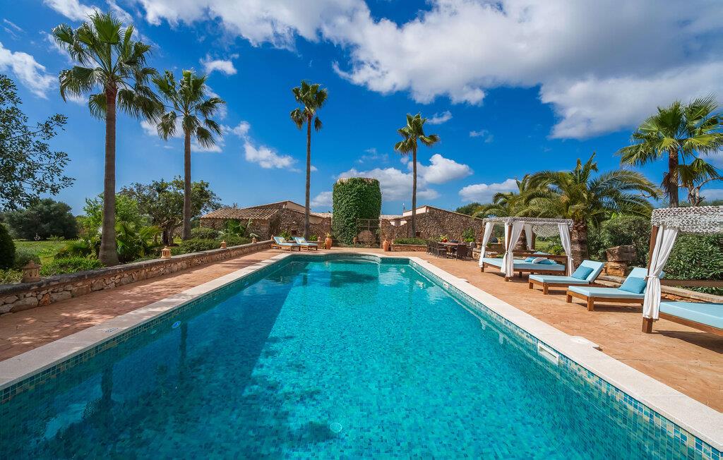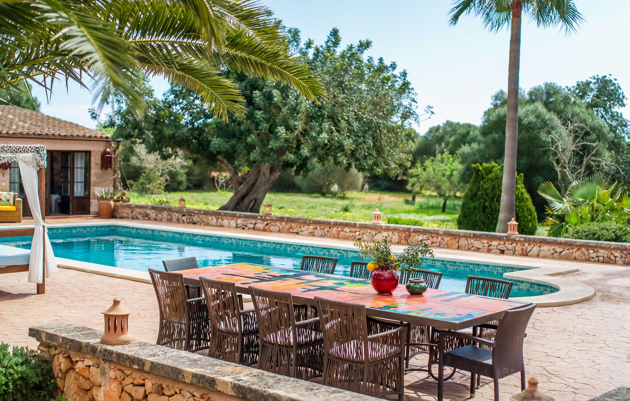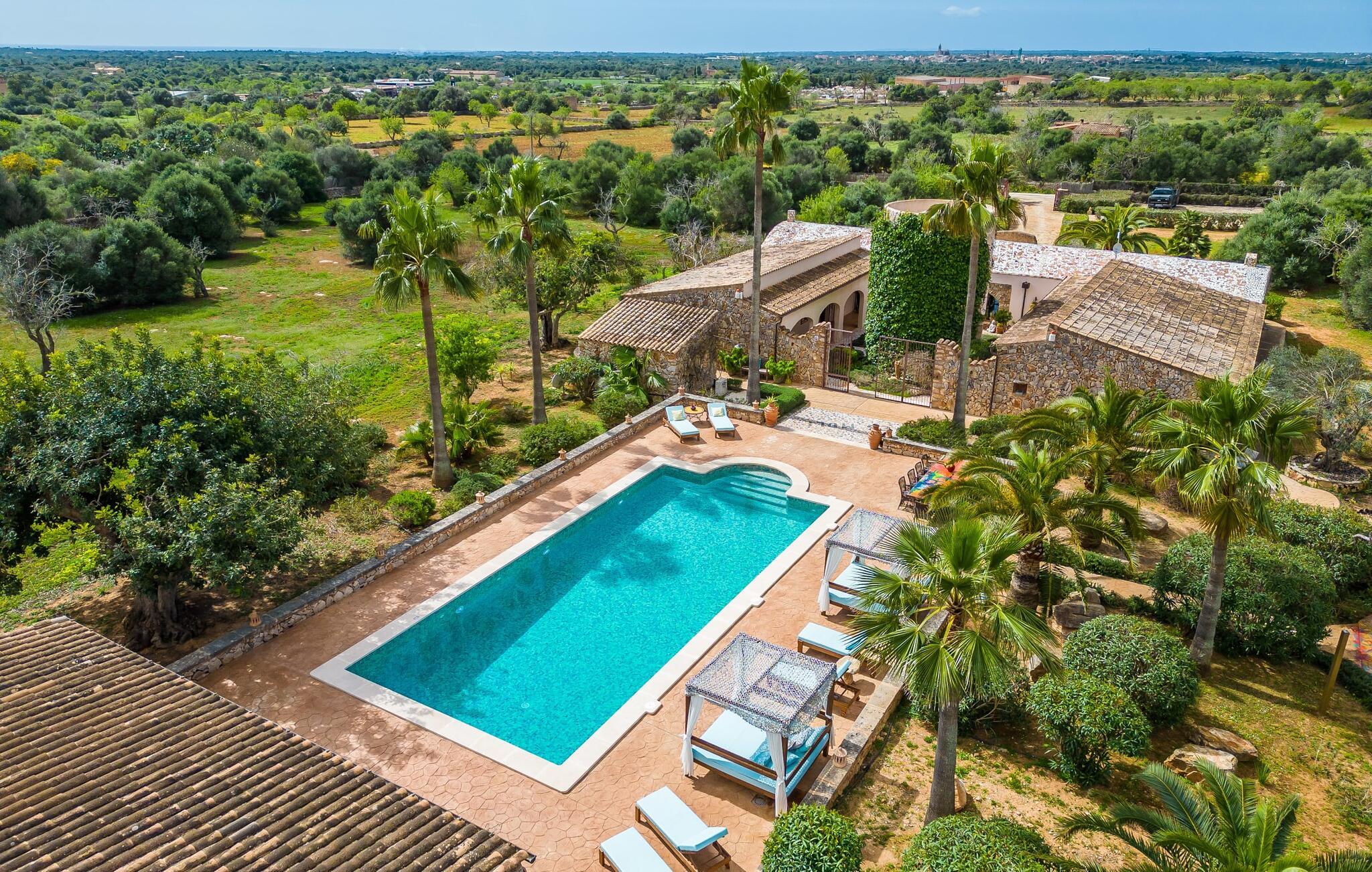 Hvis den vidunderlige villa "Son Sans" er et billede på livet på landet i den sydlige del af Mallorca, så vil selv overbeviste byboere nok ikke have lyst til at forlade stedet. Naturstenshuset i 1 plan er simpelthen for smukt: Det ligger på en kæmpe grund, dækket af palmer, der rejser sig til den blå himmel, mange typiske middelhavsplanter og kærligt passet kaktusser, som også kan findes omkring de rummelige terrassearealer – herunder en lille tagterrasse på et lille tårn. Der er charmerende retreater overalt, en smuk siddeplads her, en lille vandresti der - alt er arrangeret med stor sans for detaljer, fra mosaikstenene omkring blomsterbedet til den indbydende hængekøje i buen. Et andet højdepunkt er uden tvivl den store pool, omkring hvilken der er arrangeret komfortable liggestole og skyggefulde parasoller, ligesom et langt spisebord til hyggelige aftener i det fri.