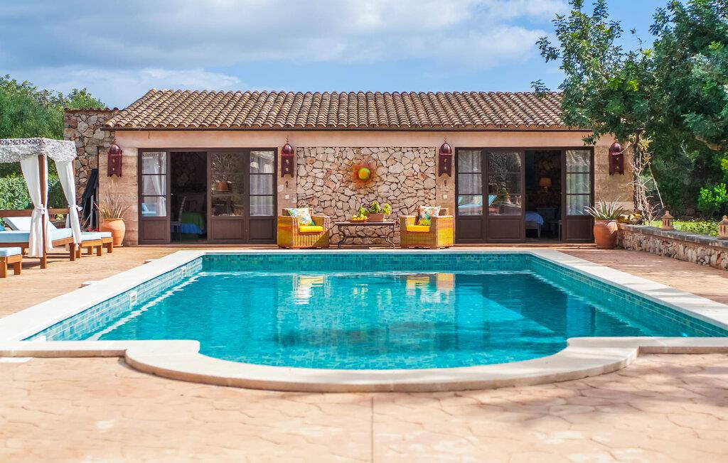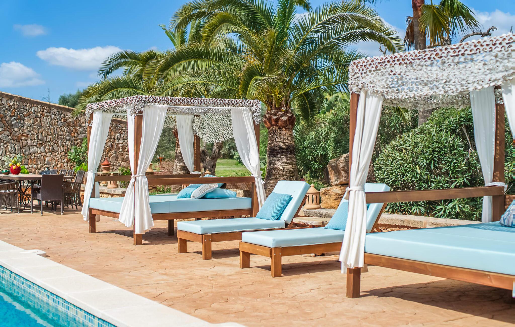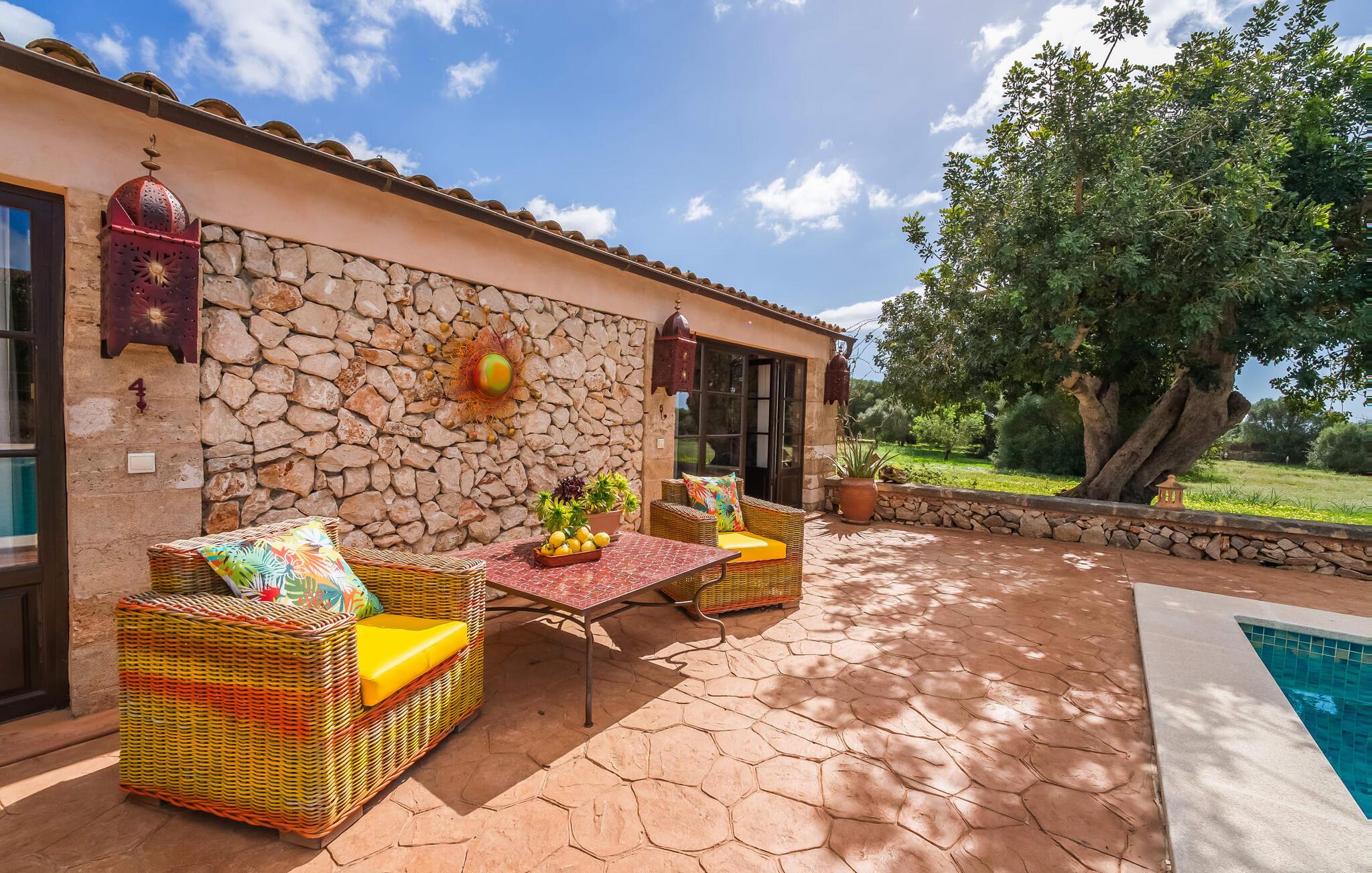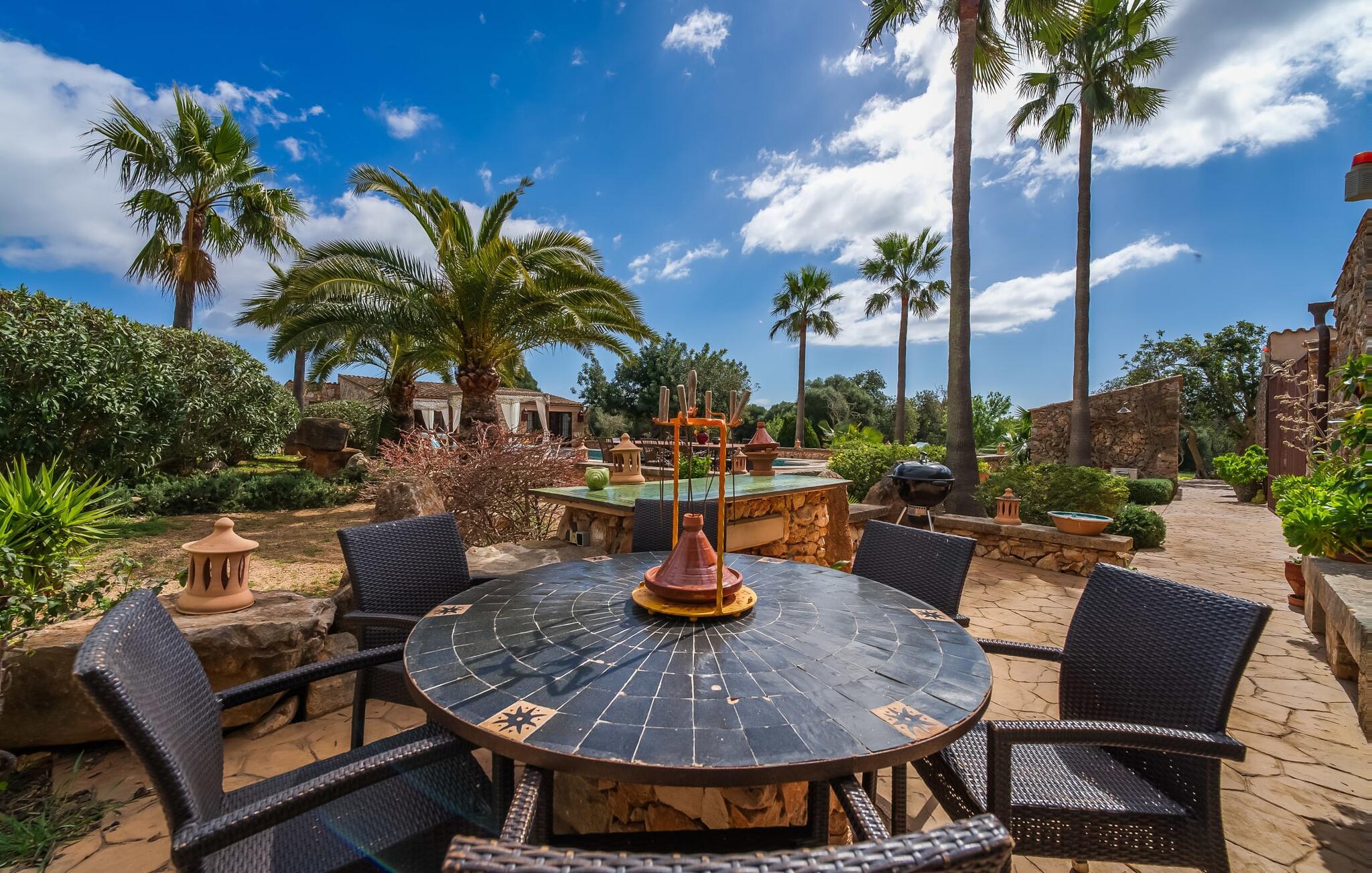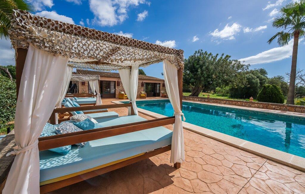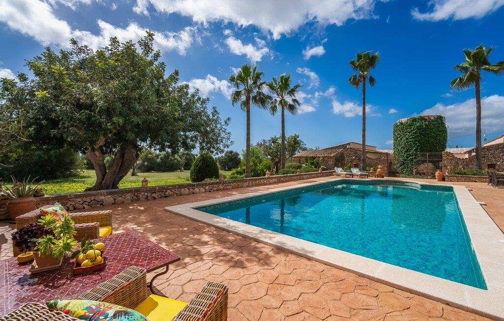 Hvis den vidunderlige villa "Son Sans" er et billede på livet på landet i den sydlige del af Mallorca, så vil selv overbeviste byboere nok ikke have lyst til at forlade stedet. Naturstenshuset i 1 plan er simpelthen for smukt: Det ligger på en kæmpe grund, dækket af palmer, der rejser sig til den blå himmel, mange typiske middelhavsplanter og kærligt passet kaktusser, som også kan findes omkring de rummelige terrassearealer – herunder en lille tagterrasse på et lille tårn. Der er charmerende retreater overalt, en smuk siddeplads her, en lille vandresti der - alt er arrangeret med stor sans for detaljer, fra mosaikstenene omkring blomsterbedet til den indbydende hængekøje i buen. Et andet højdepunkt er uden tvivl den store pool, omkring hvilken der er arrangeret komfortable liggestole og skyggefulde parasoller, ligesom et langt spisebord til hyggelige aftener i det fri.