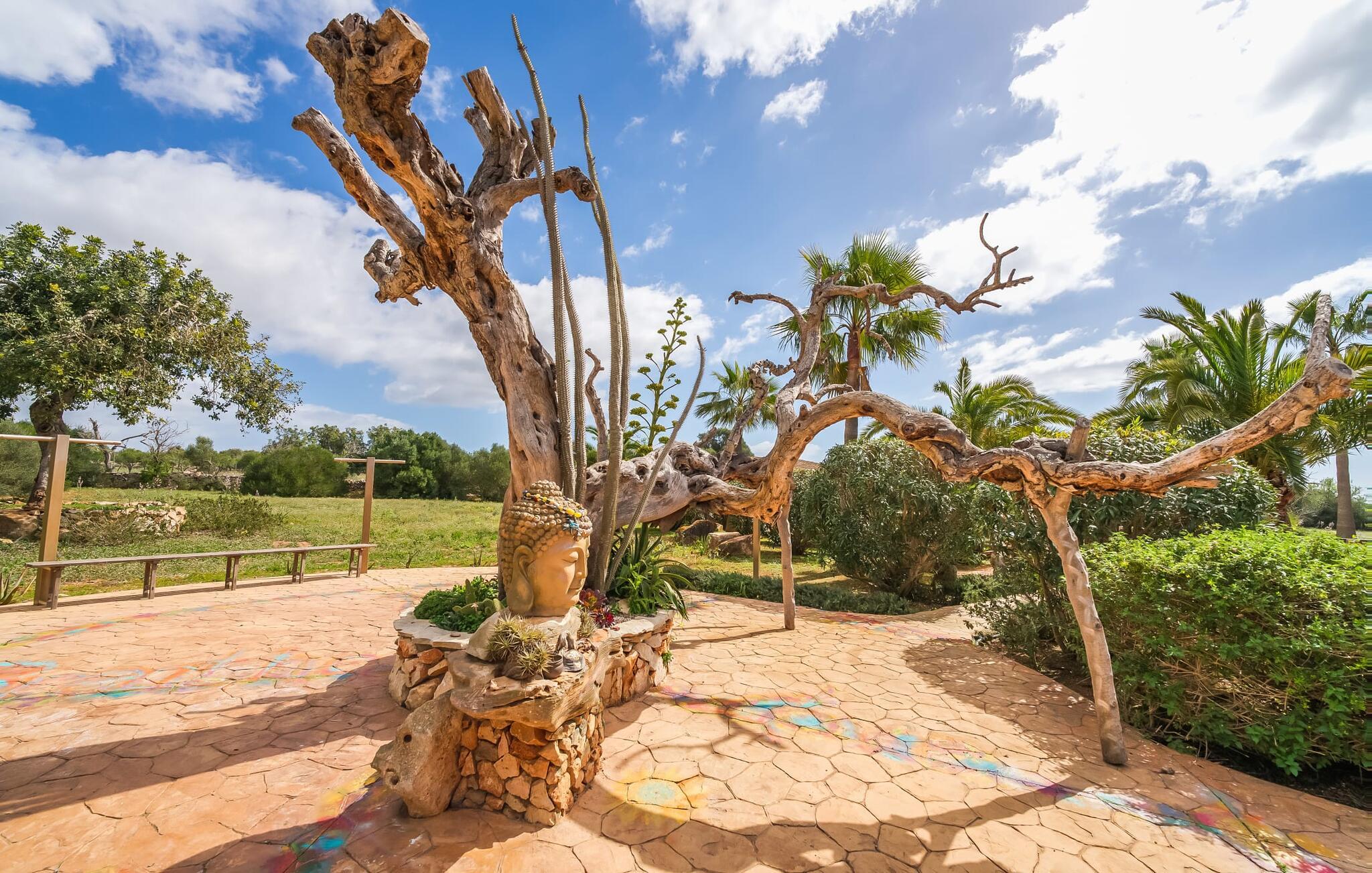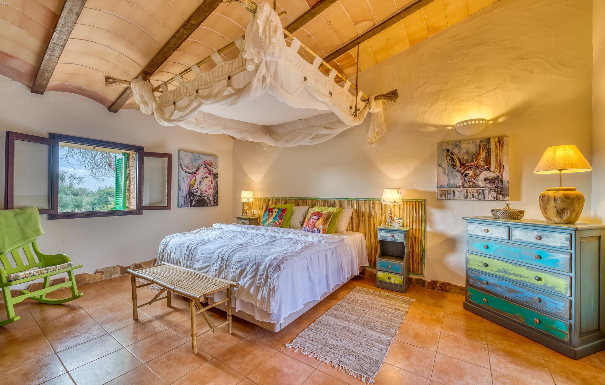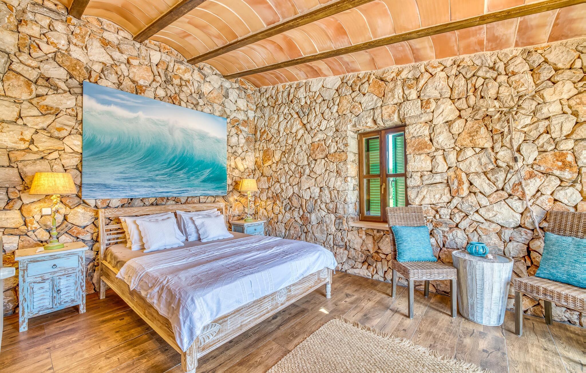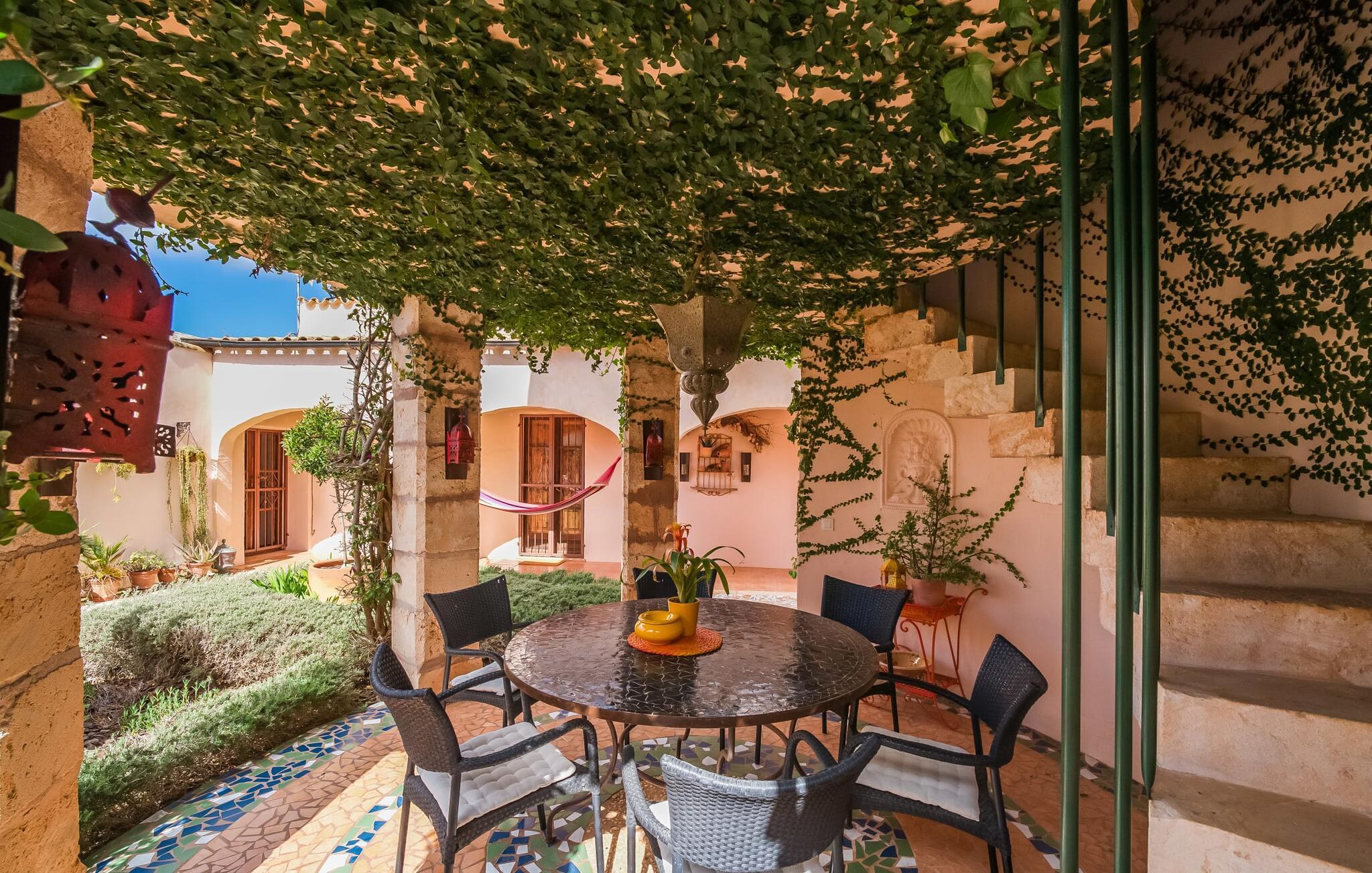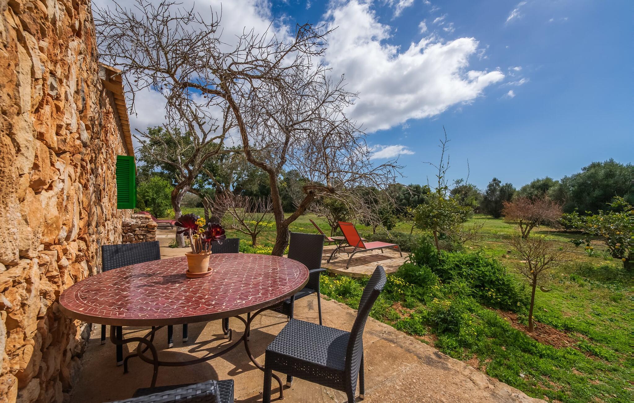 Hvis den vidunderlige villa "Son Sans" er et billede på livet på landet i den sydlige del af Mallorca, så vil selv overbeviste byboere nok ikke have lyst til at forlade stedet. Naturstenshuset i 1 plan er simpelthen for smukt: Det ligger på en kæmpe grund, dækket af palmer, der rejser sig til den blå himmel, mange typiske middelhavsplanter og kærligt passet kaktusser, som også kan findes omkring de rummelige terrassearealer – herunder en lille tagterrasse på et lille tårn. Der er charmerende retreater overalt, en smuk siddeplads her, en lille vandresti der - alt er arrangeret med stor sans for detaljer, fra mosaikstenene omkring blomsterbedet til den indbydende hængekøje i buen. Et andet højdepunkt er uden tvivl den store pool, omkring hvilken der er arrangeret komfortable liggestole og skyggefulde parasoller, ligesom et langt spisebord til hyggelige aftener i det fri.