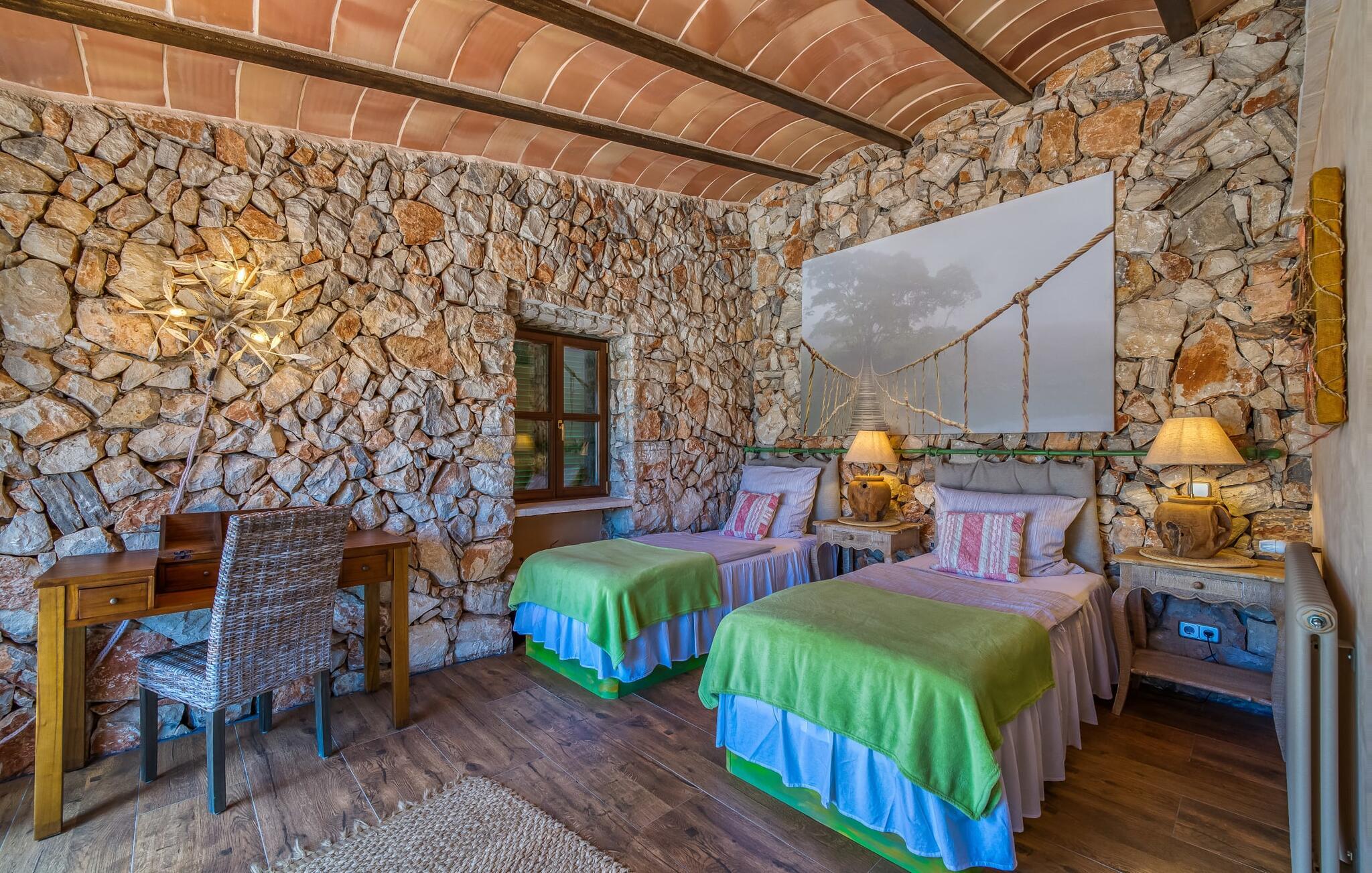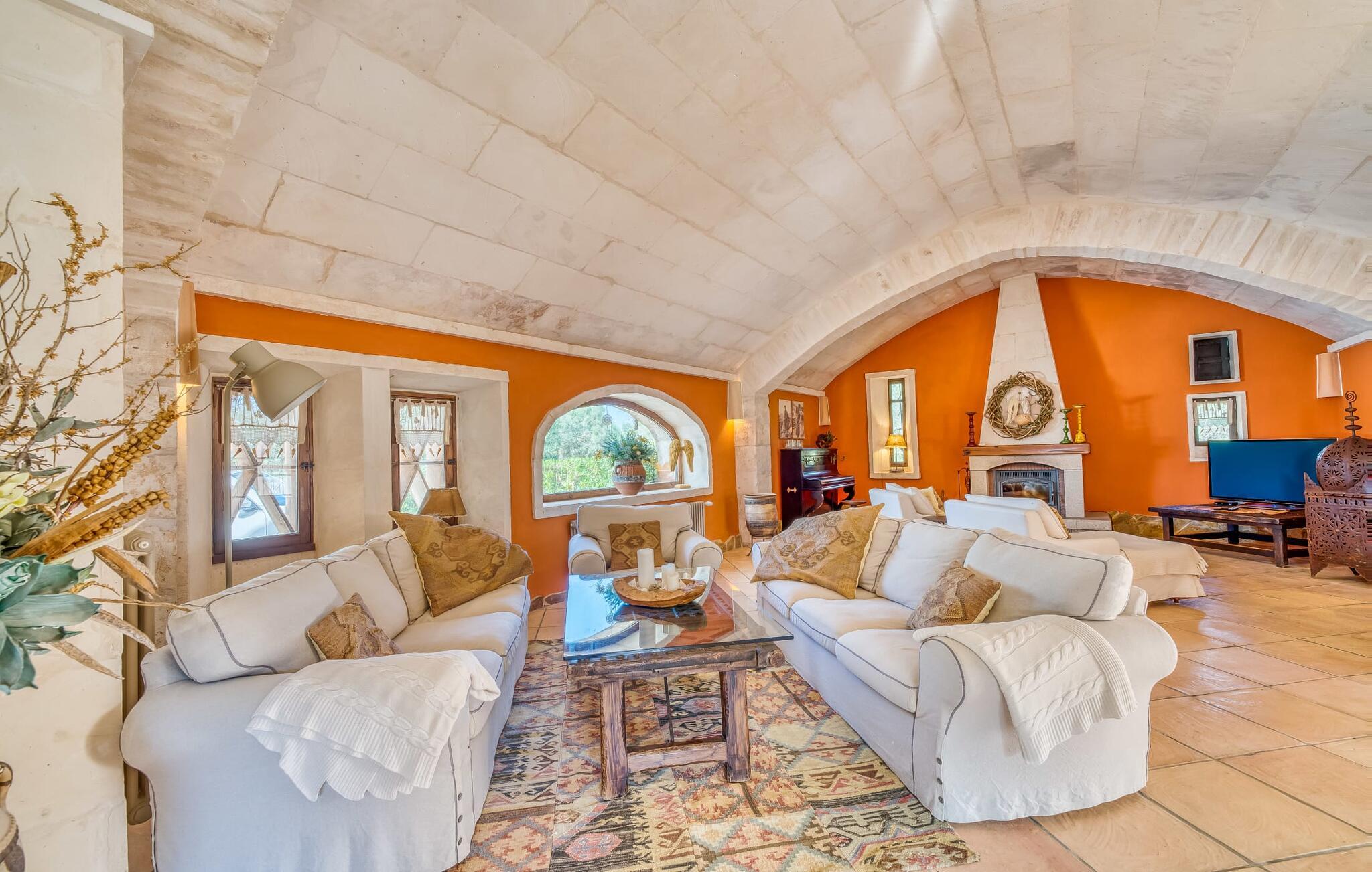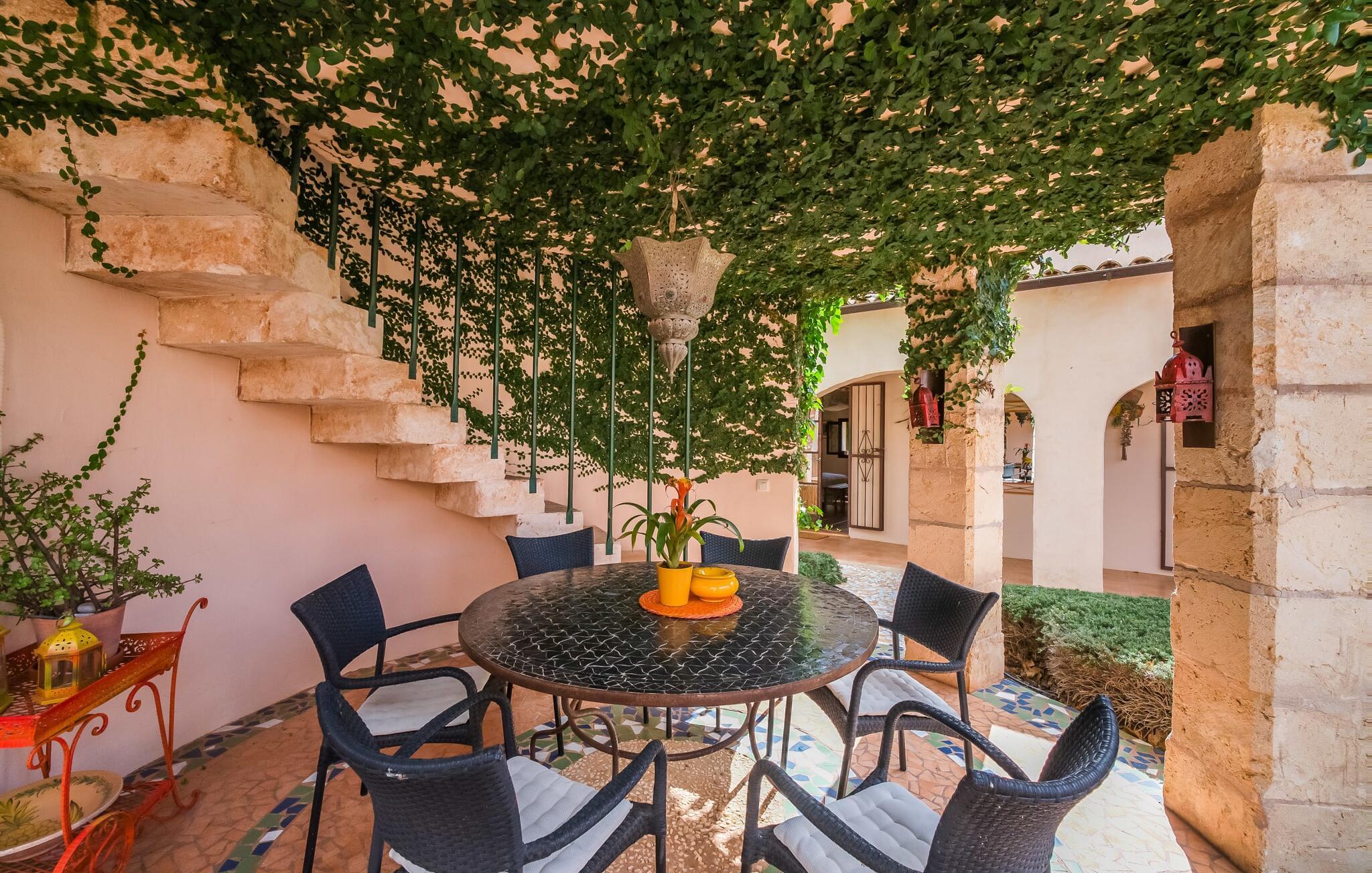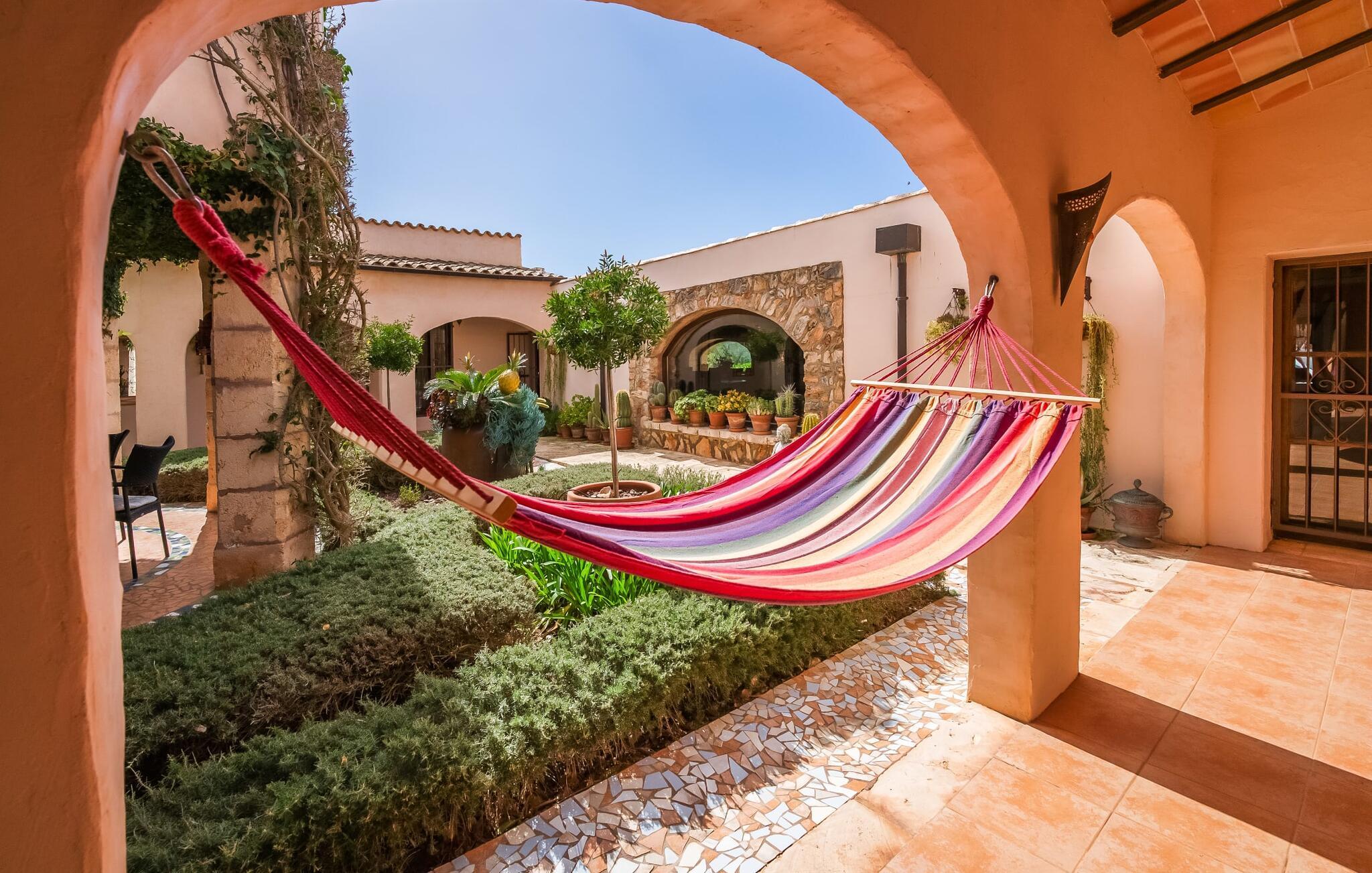 Hvis den vidunderlige villa "Son Sans" er et billede på livet på landet i den sydlige del af Mallorca, så vil selv overbeviste byboere nok ikke have lyst til at forlade stedet. Naturstenshuset i 1 plan er simpelthen for smukt: Det ligger på en kæmpe grund, dækket af palmer, der rejser sig til den blå himmel, mange typiske middelhavsplanter og kærligt passet kaktusser, som også kan findes omkring de rummelige terrassearealer – herunder en lille tagterrasse på et lille tårn. Der er charmerende retreater overalt, en smuk siddeplads her, en lille vandresti der - alt er arrangeret med stor sans for detaljer, fra mosaikstenene omkring blomsterbedet til den indbydende hængekøje i buen. Et andet højdepunkt er uden tvivl den store pool, omkring hvilken der er arrangeret komfortable liggestole og skyggefulde parasoller, ligesom et langt spisebord til hyggelige aftener i det fri.