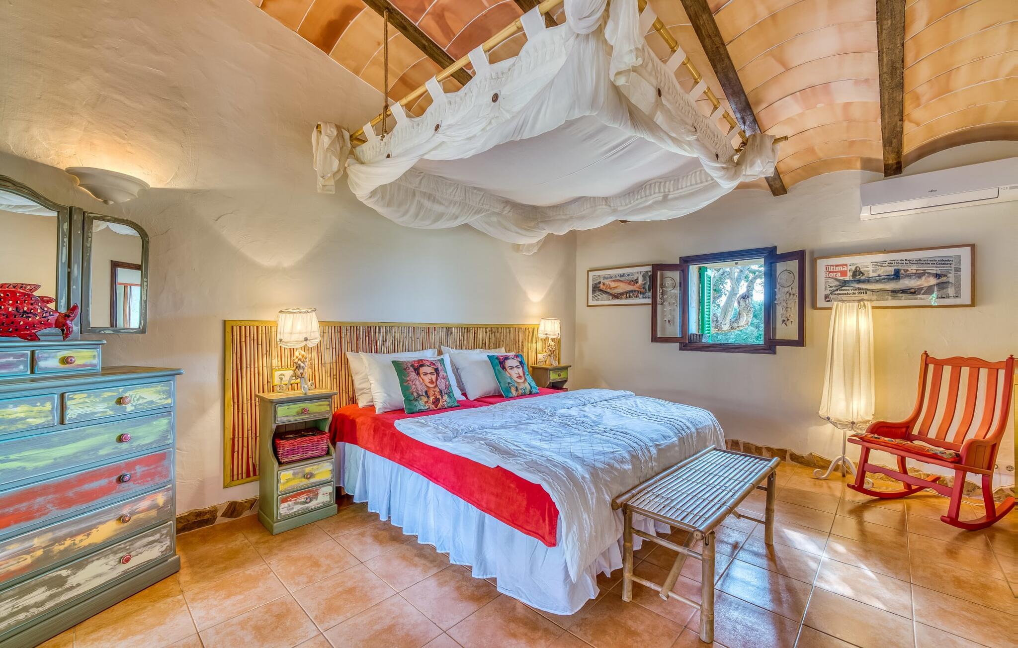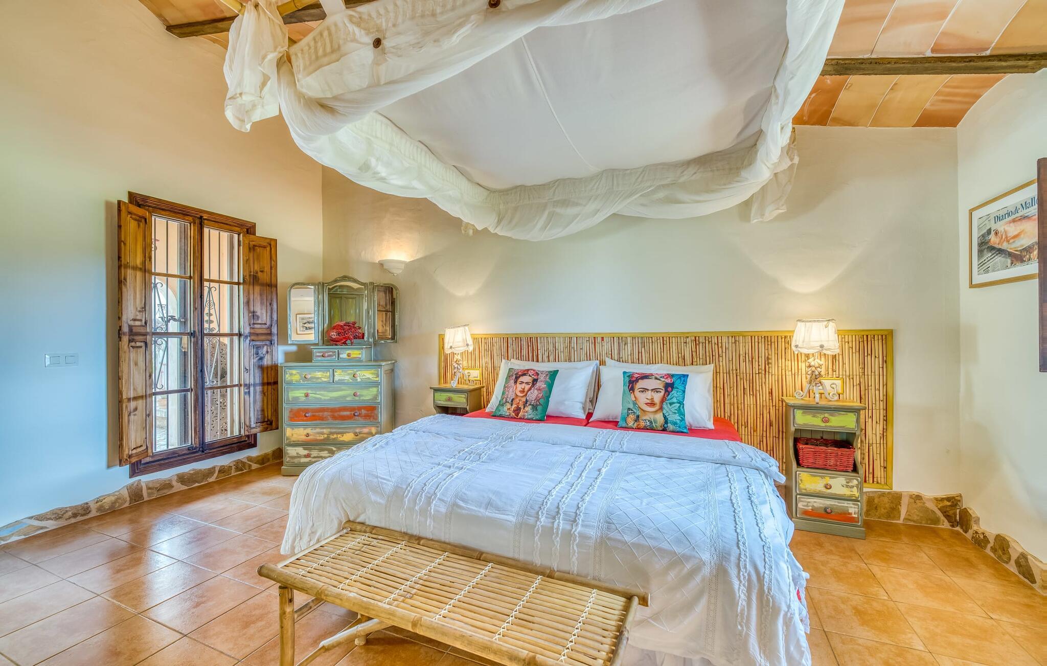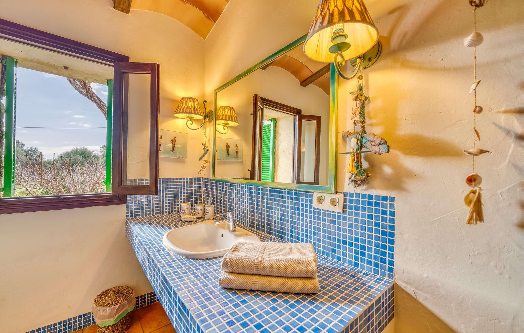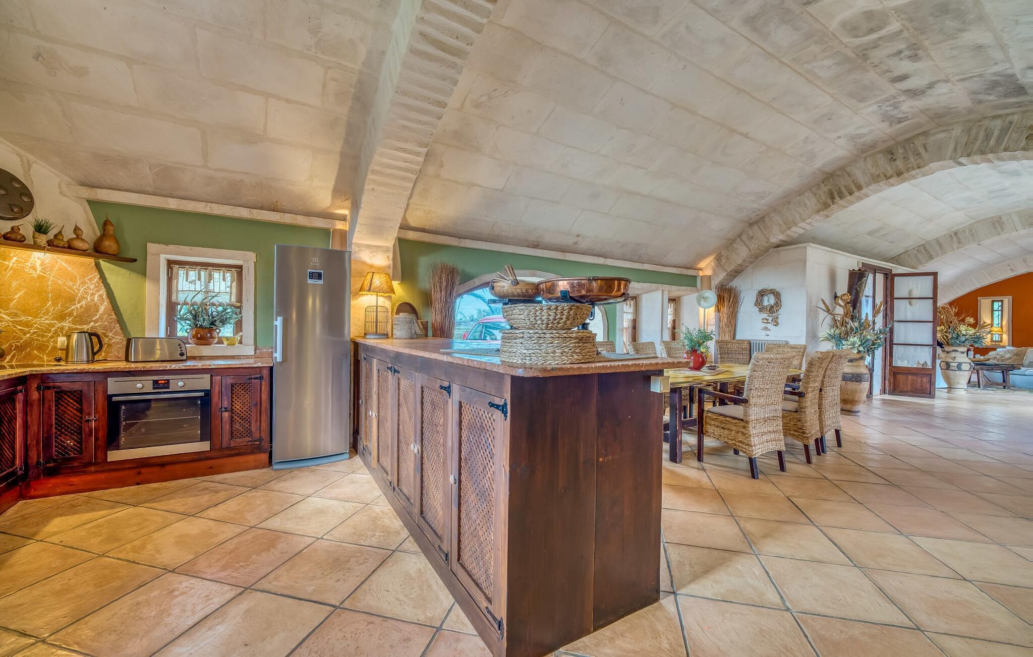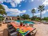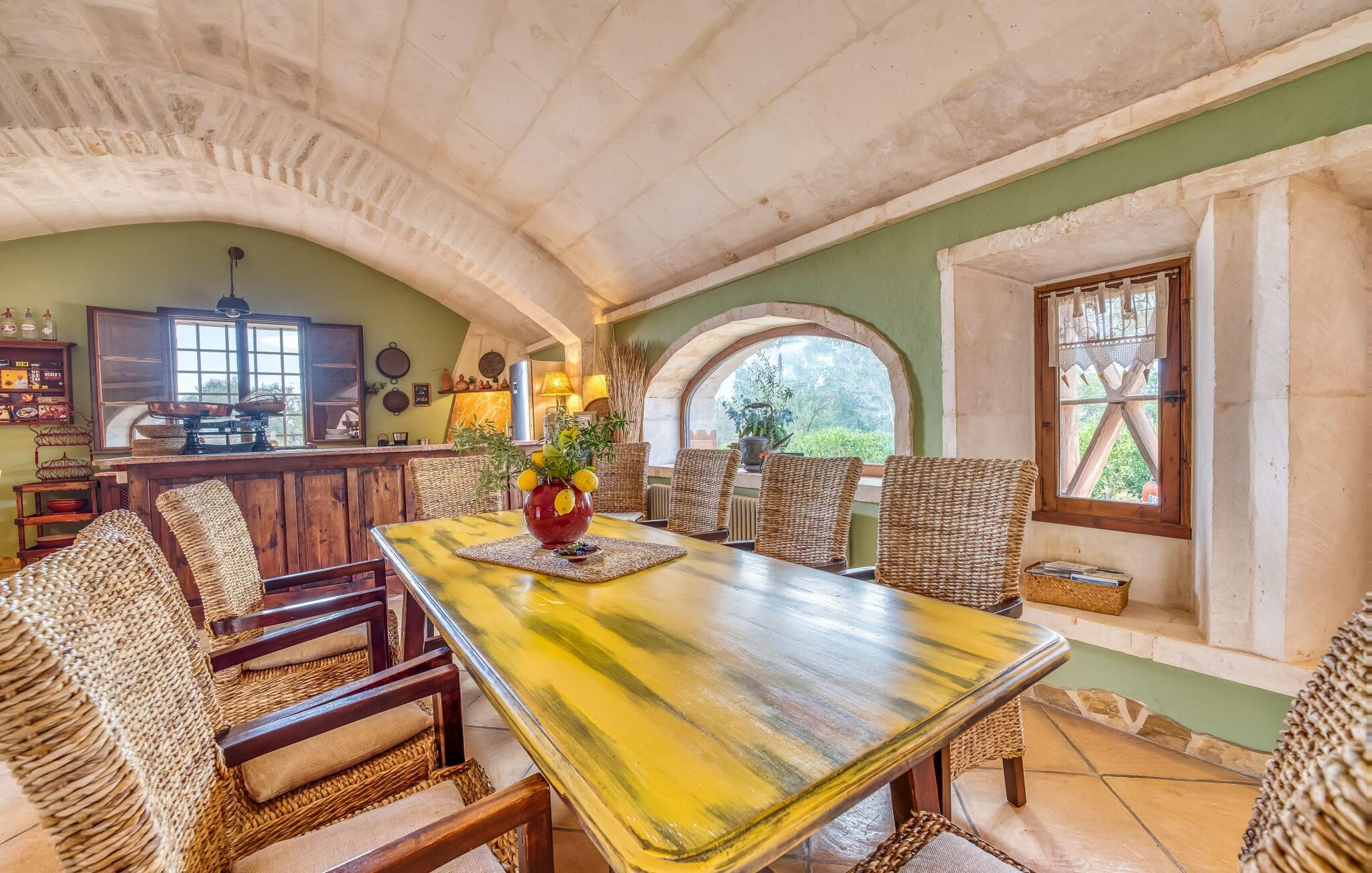 Hvis den vidunderlige villa "Son Sans" er et billede på livet på landet i den sydlige del af Mallorca, så vil selv overbeviste byboere nok ikke have lyst til at forlade stedet. Naturstenshuset i 1 plan er simpelthen for smukt: Det ligger på en kæmpe grund, dækket af palmer, der rejser sig til den blå himmel, mange typiske middelhavsplanter og kærligt passet kaktusser, som også kan findes omkring de rummelige terrassearealer – herunder en lille tagterrasse på et lille tårn. Der er charmerende retreater overalt, en smuk siddeplads her, en lille vandresti der - alt er arrangeret med stor sans for detaljer, fra mosaikstenene omkring blomsterbedet til den indbydende hængekøje i buen. Et andet højdepunkt er uden tvivl den store pool, omkring hvilken der er arrangeret komfortable liggestole og skyggefulde parasoller, ligesom et langt spisebord til hyggelige aftener i det fri.