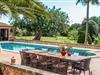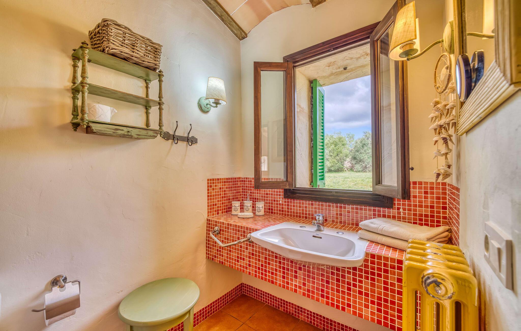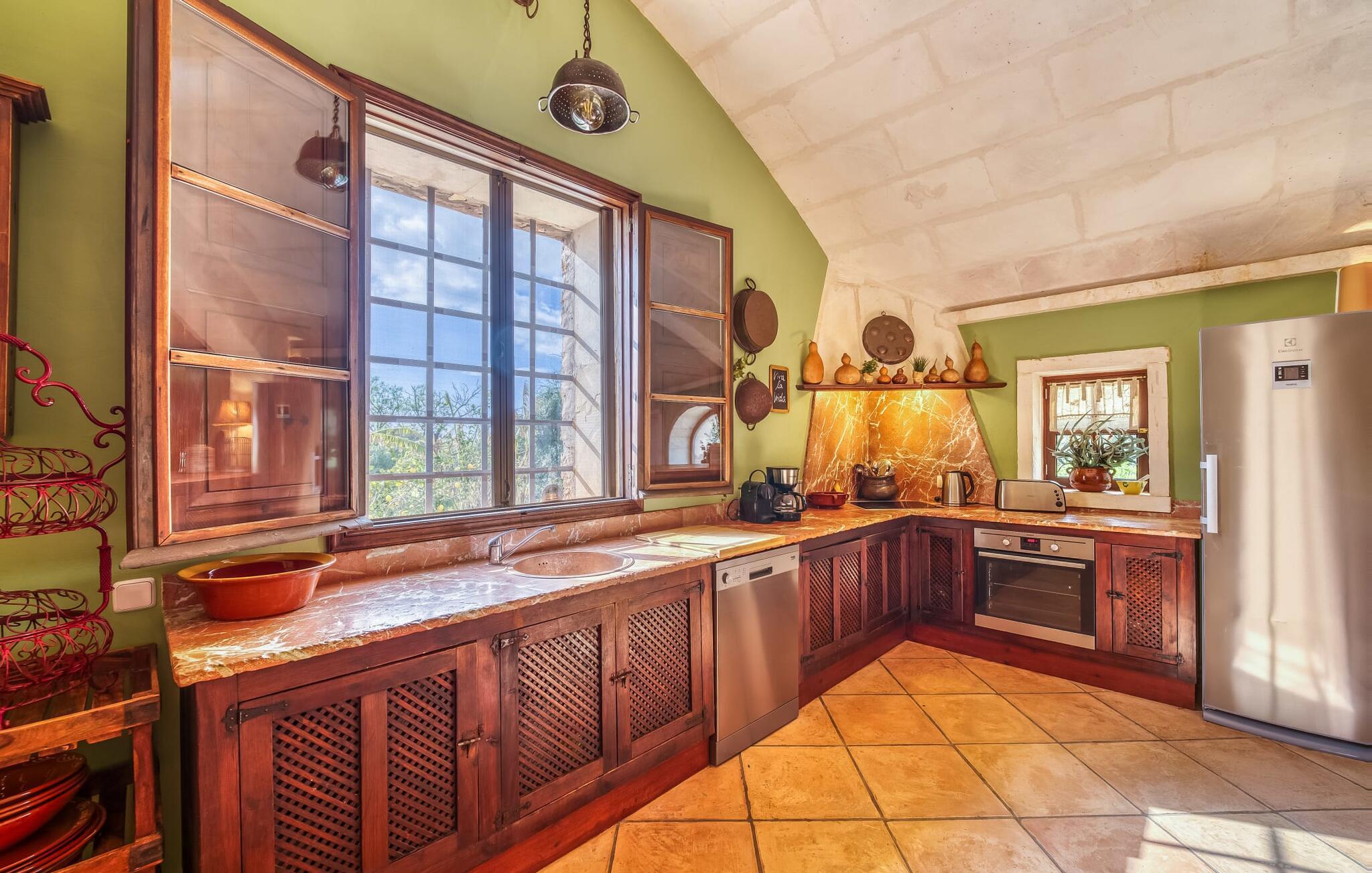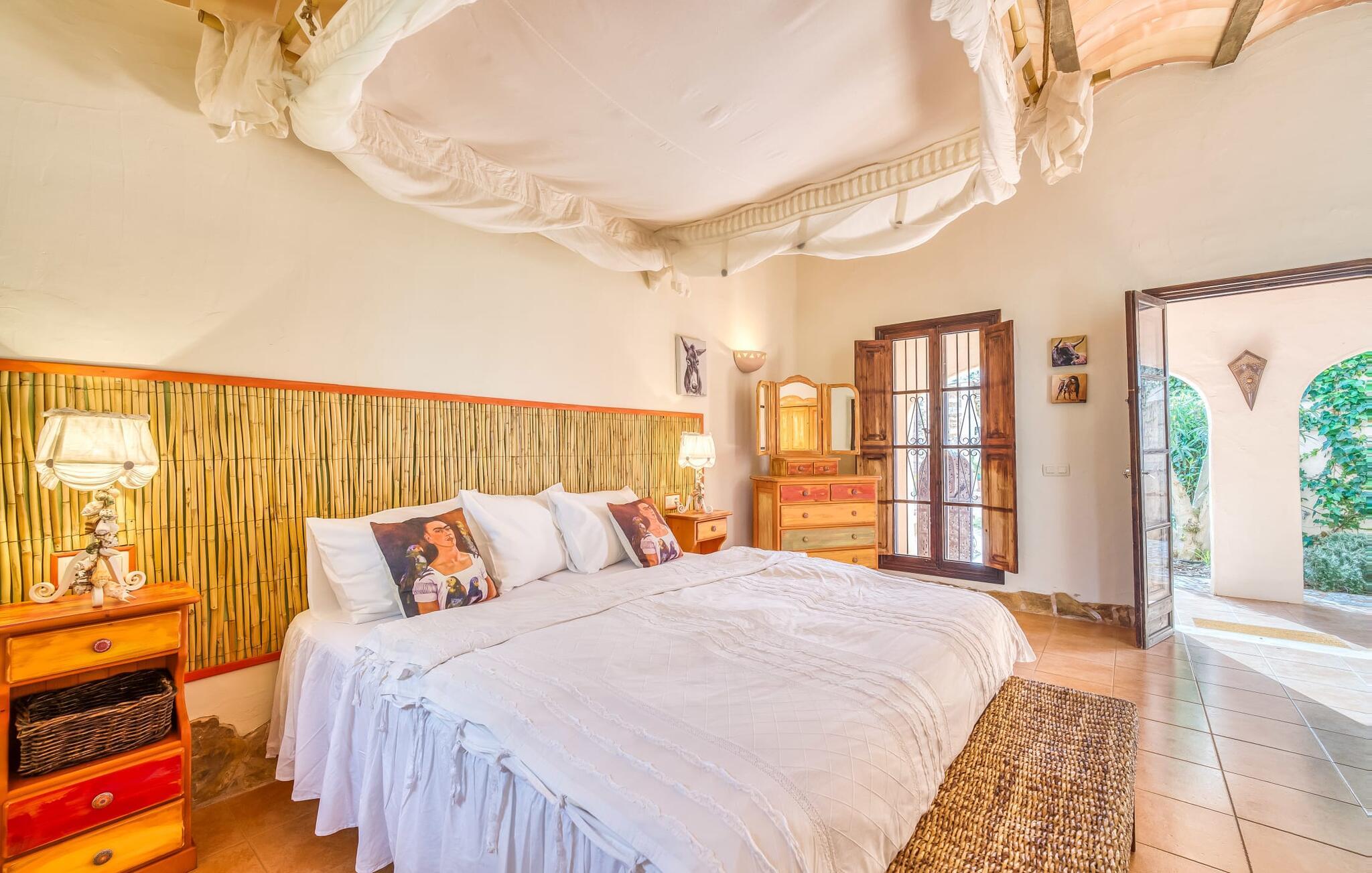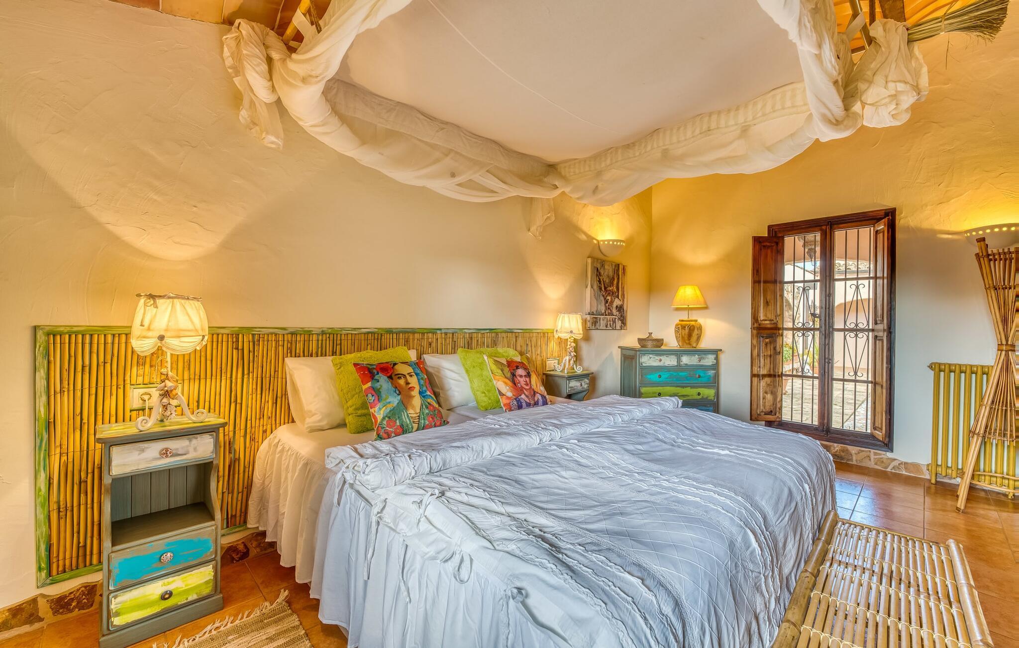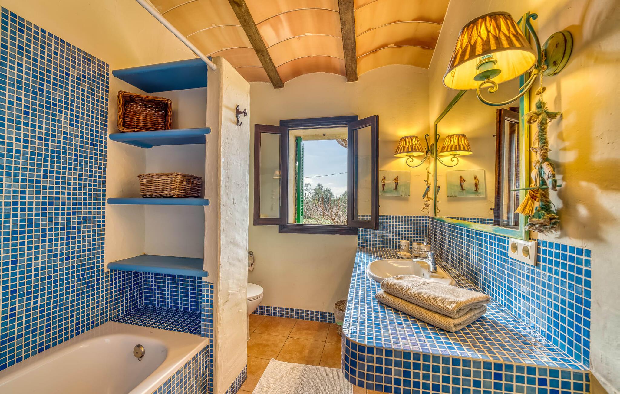 Hvis den vidunderlige villa "Son Sans" er et billede på livet på landet i den sydlige del af Mallorca, så vil selv overbeviste byboere nok ikke have lyst til at forlade stedet. Naturstenshuset i 1 plan er simpelthen for smukt: Det ligger på en kæmpe grund, dækket af palmer, der rejser sig til den blå himmel, mange typiske middelhavsplanter og kærligt passet kaktusser, som også kan findes omkring de rummelige terrassearealer – herunder en lille tagterrasse på et lille tårn. Der er charmerende retreater overalt, en smuk siddeplads her, en lille vandresti der - alt er arrangeret med stor sans for detaljer, fra mosaikstenene omkring blomsterbedet til den indbydende hængekøje i buen. Et andet højdepunkt er uden tvivl den store pool, omkring hvilken der er arrangeret komfortable liggestole og skyggefulde parasoller, ligesom et langt spisebord til hyggelige aftener i det fri.