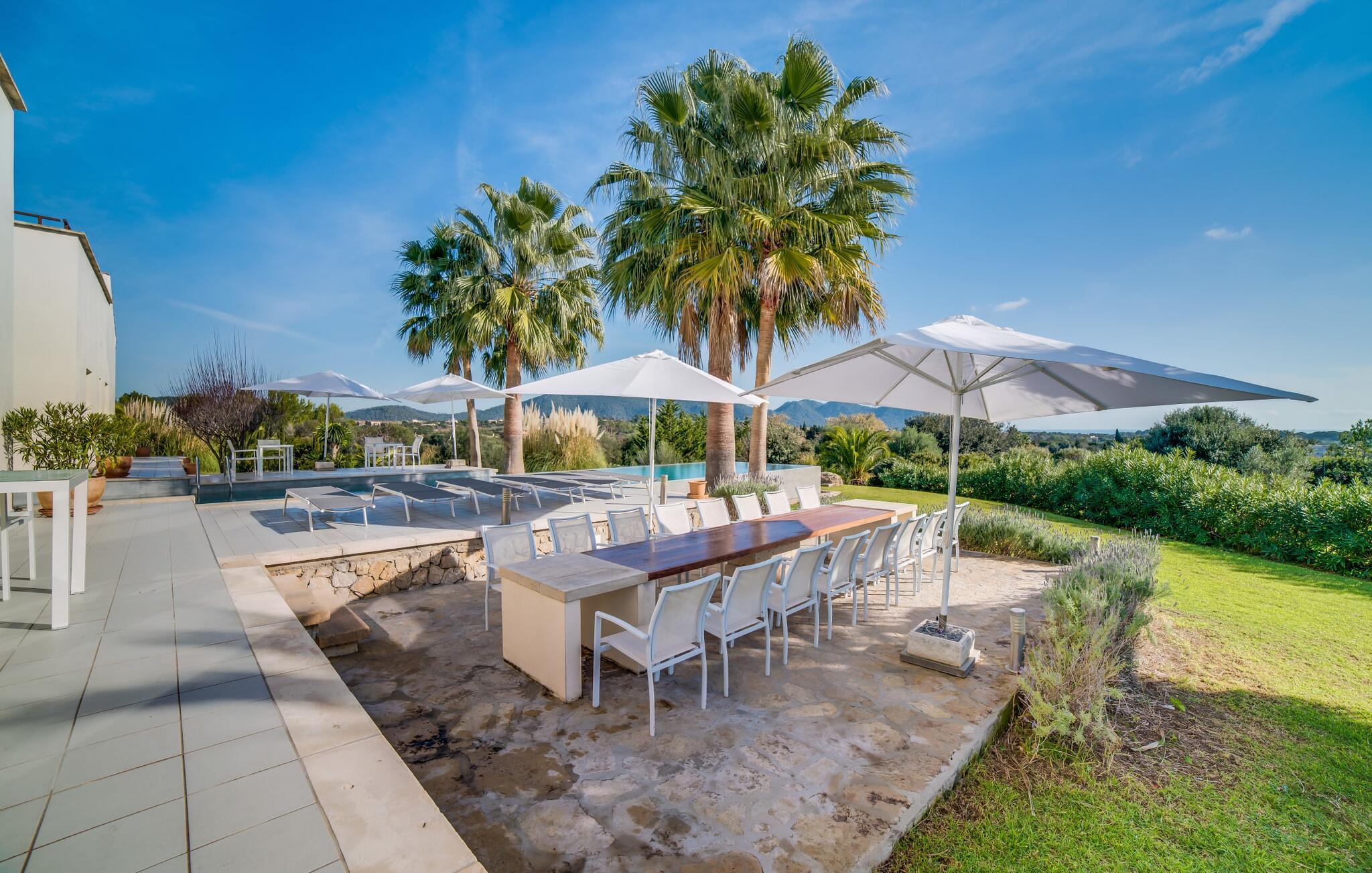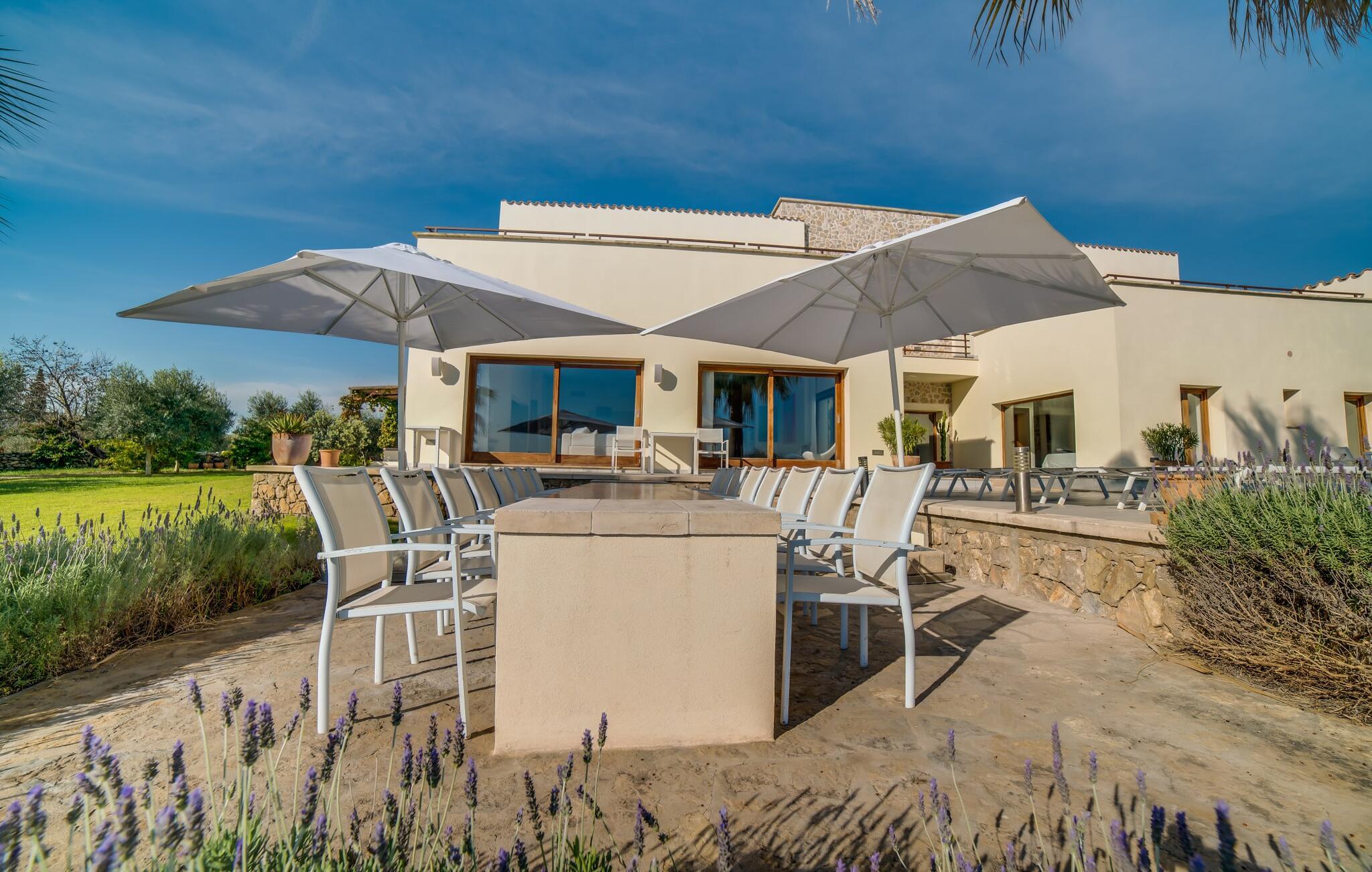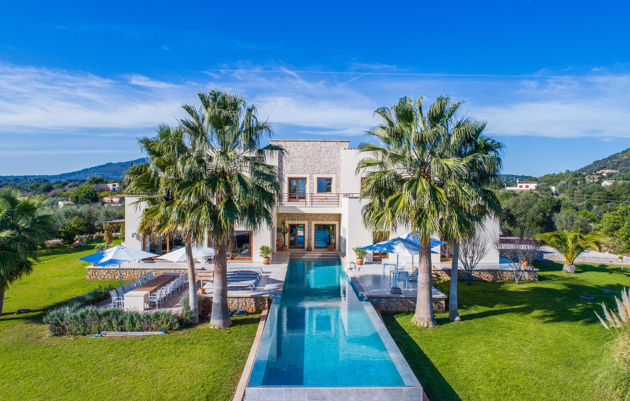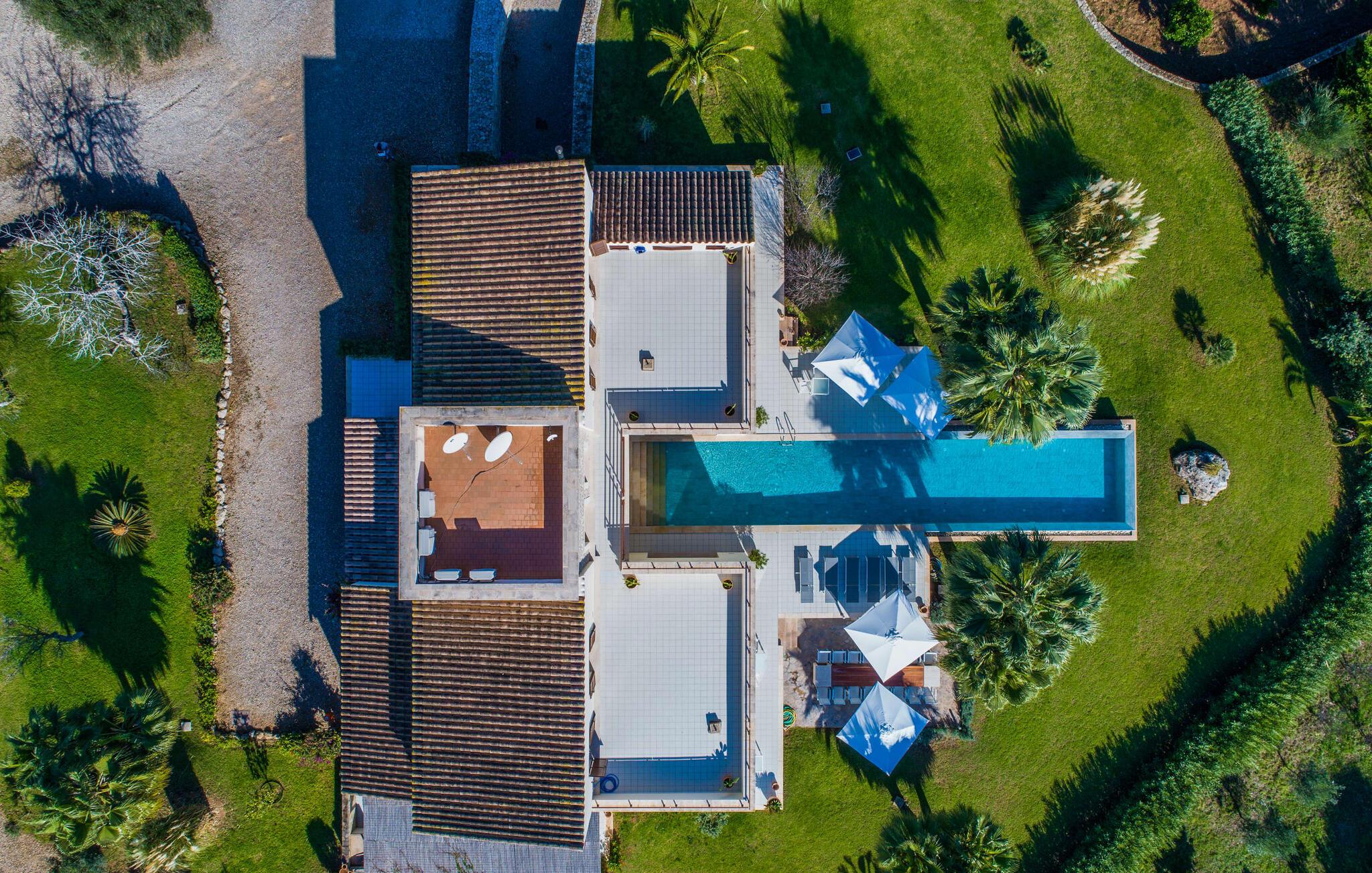 Indkørslen giver jer udsigt til den indbydende, rummelige luksusvilla "Son Sard Nou", som ligger stolt på en smuk bjergskråning ejendom med palmer og oliventræer, lavendel og cypresser. Infinity-poolen strækker sig fra villaen ind i den fantastiske have, der tilbyder et fantastisk landskab og havudsigt. Adgang til poolen er mulig via trapper eller en stige. Der er store terrasser rundt om poolen med liggestole, parasoller, siddepladser og et stort spisebord. Til den ene side af villaen er der endnu en terrasse med et stråtækt, vindækket område med en chill-out zone og et rundt spisebord. Her kan I slappe af med en grillaften med musik fra husets indbyggede højtalere. Gulv-til-loft vinduer oversvømmer villaen med lys, hvilket skaber en varm og indbydende atmosfære. Den åbne stue og spisestue er moderne og gennemtænkt designet med et overdådigt træbord og bænke mellem stue og køkken. Det fuldt udstyrede køkken er udstyret med højkvalitets apparater, hvilket gør det perfekt til selvforplejning. Villaen har seks klimatiserede soveværelser fordelt på to etager, hver med eget badeværelse og udgang til en rummelig solterrasse med en fantastisk udsigt. Den storslåede luksusvilla "Son Sard Nou" ligger kun 3 km fra smukke strande. På lidt over 4 km kan I også nå den rolige landsby Son Servera eller den populære kystby Cala Millor, som har en række restauranter, barer og butikker og et marked hver fredag morgen. "Son Sard Nou" er også ideel for golfspillere: en række golfbaner er i umiddelbar nærhed.