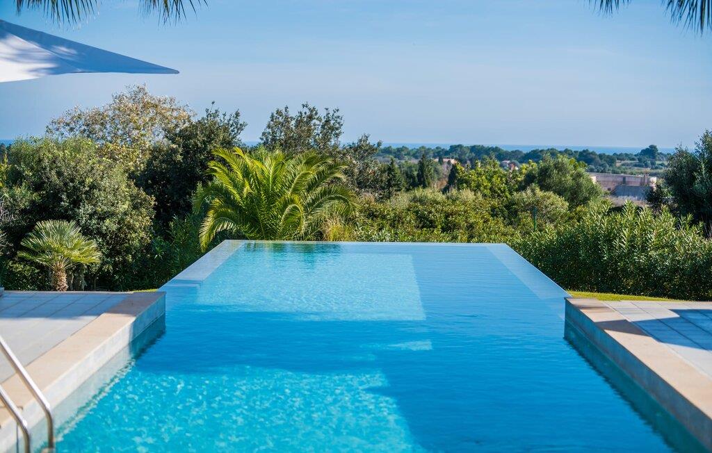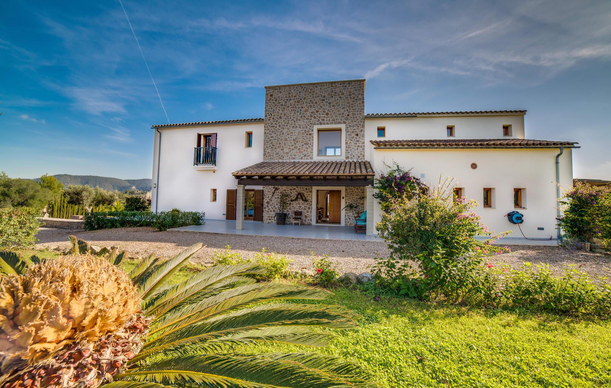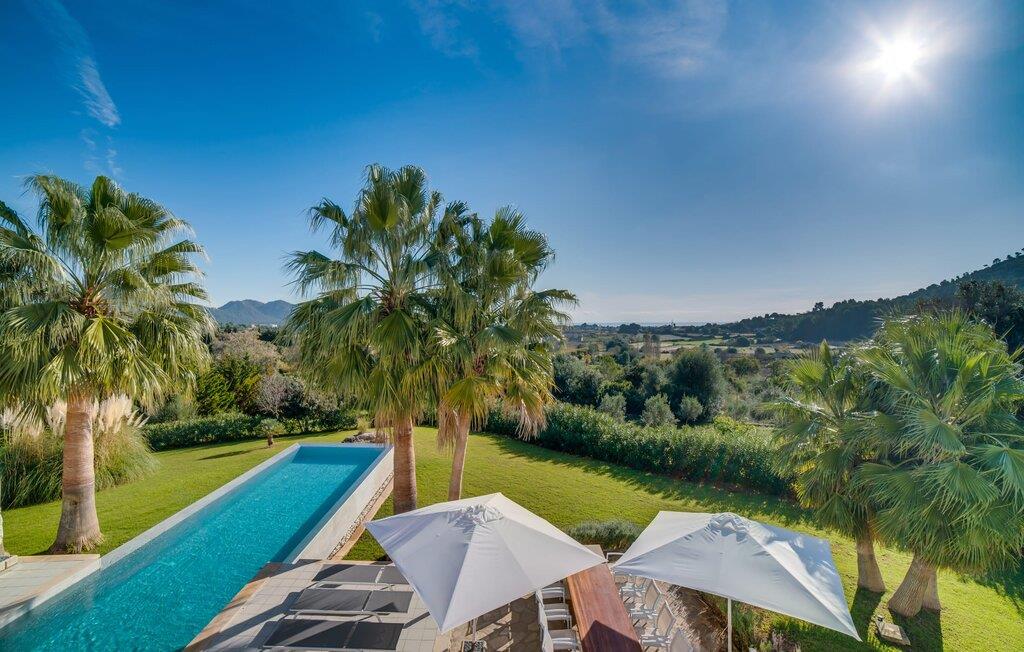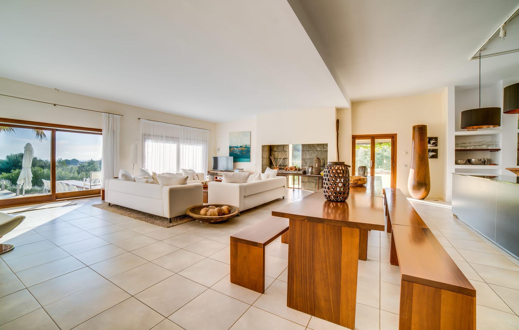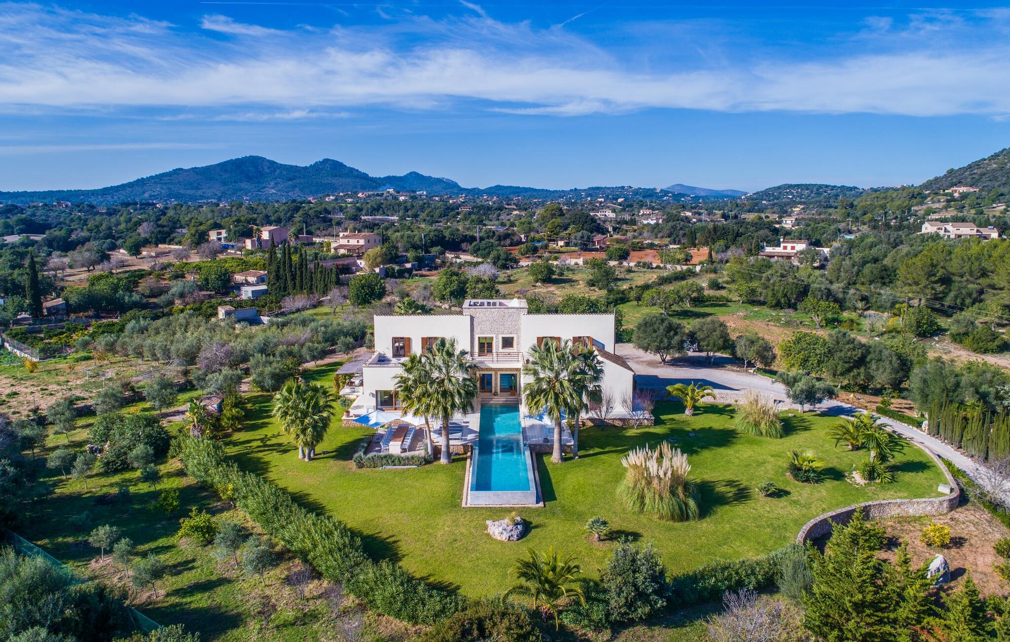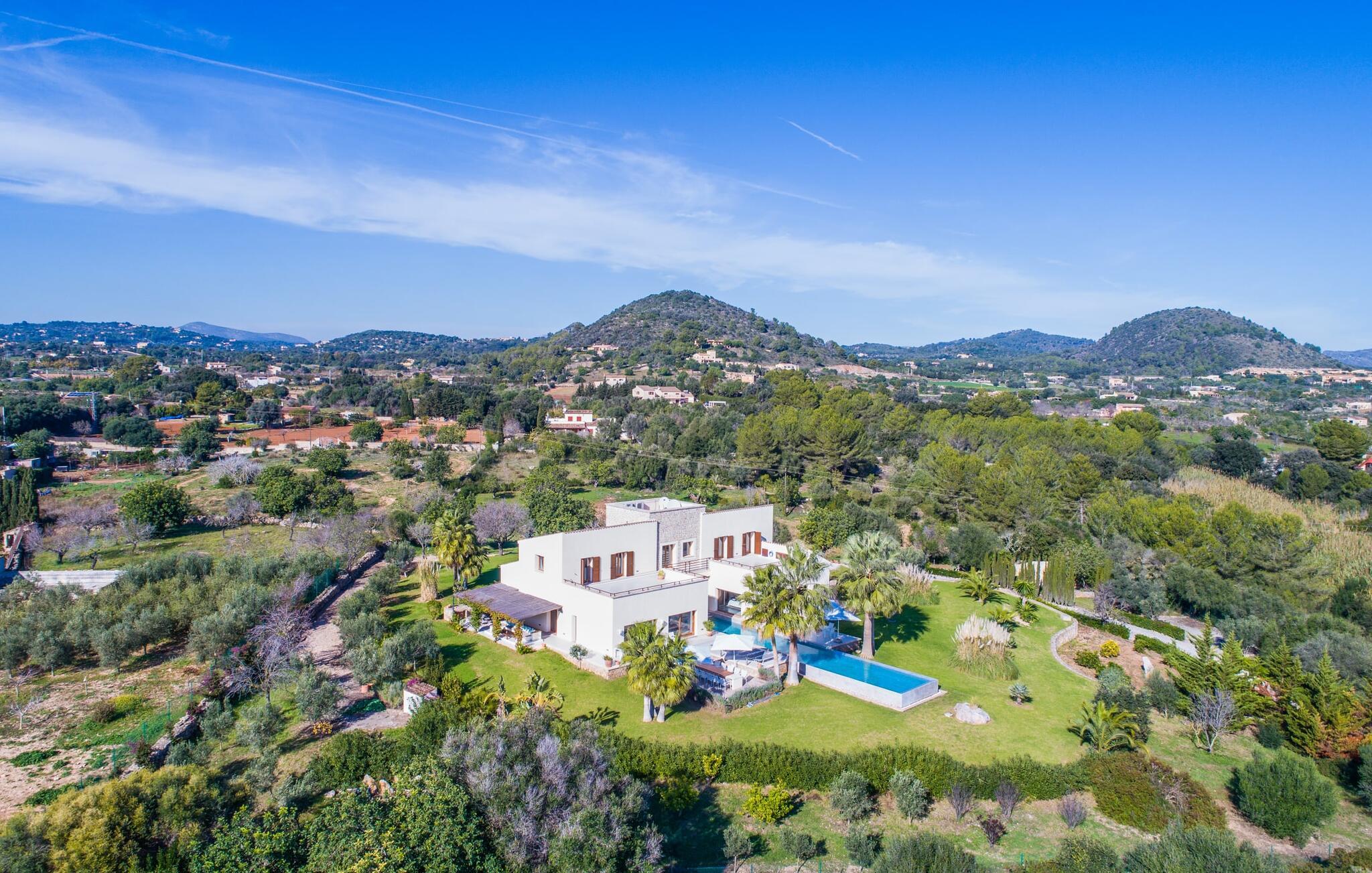 Indkørslen giver jer udsigt til den indbydende, rummelige luksusvilla "Son Sard Nou", som ligger stolt på en smuk bjergskråning ejendom med palmer og oliventræer, lavendel og cypresser. Infinity-poolen strækker sig fra villaen ind i den fantastiske have, der tilbyder et fantastisk landskab og havudsigt. Adgang til poolen er mulig via trapper eller en stige. Der er store terrasser rundt om poolen med liggestole, parasoller, siddepladser og et stort spisebord. Til den ene side af villaen er der endnu en terrasse med et stråtækt, vindækket område med en chill-out zone og et rundt spisebord. Her kan I slappe af med en grillaften med musik fra husets indbyggede højtalere. Gulv-til-loft vinduer oversvømmer villaen med lys, hvilket skaber en varm og indbydende atmosfære. Den åbne stue og spisestue er moderne og gennemtænkt designet med et overdådigt træbord og bænke mellem stue og køkken. Det fuldt udstyrede køkken er udstyret med højkvalitets apparater, hvilket gør det perfekt til selvforplejning. Villaen har seks klimatiserede soveværelser fordelt på to etager, hver med eget badeværelse og udgang til en rummelig solterrasse med en fantastisk udsigt. Den storslåede luksusvilla "Son Sard Nou" ligger kun 3 km fra smukke strande. På lidt over 4 km kan I også nå den rolige landsby Son Servera eller den populære kystby Cala Millor, som har en række restauranter, barer og butikker og et marked hver fredag morgen. "Son Sard Nou" er også ideel for golfspillere: en række golfbaner er i umiddelbar nærhed.