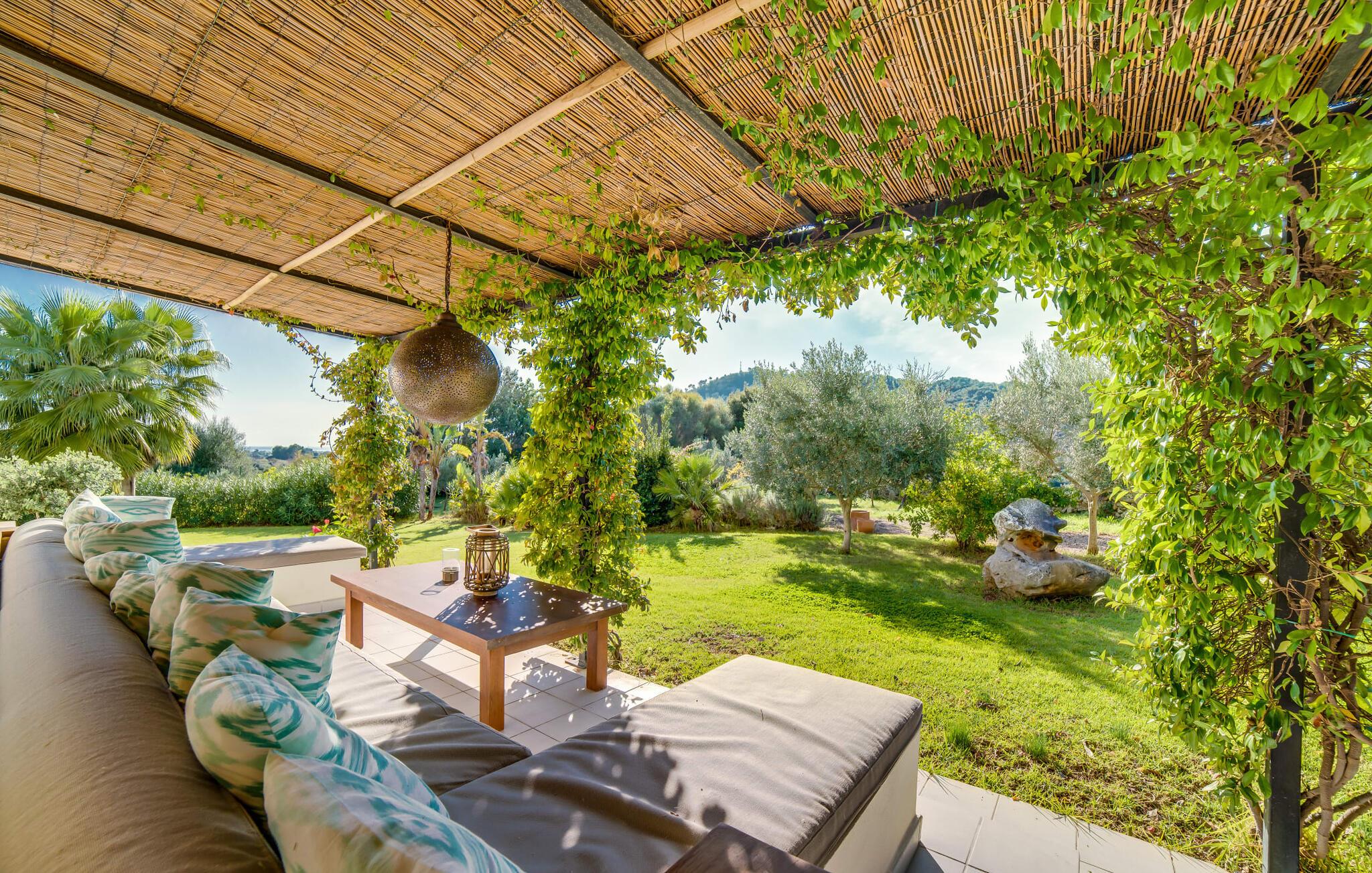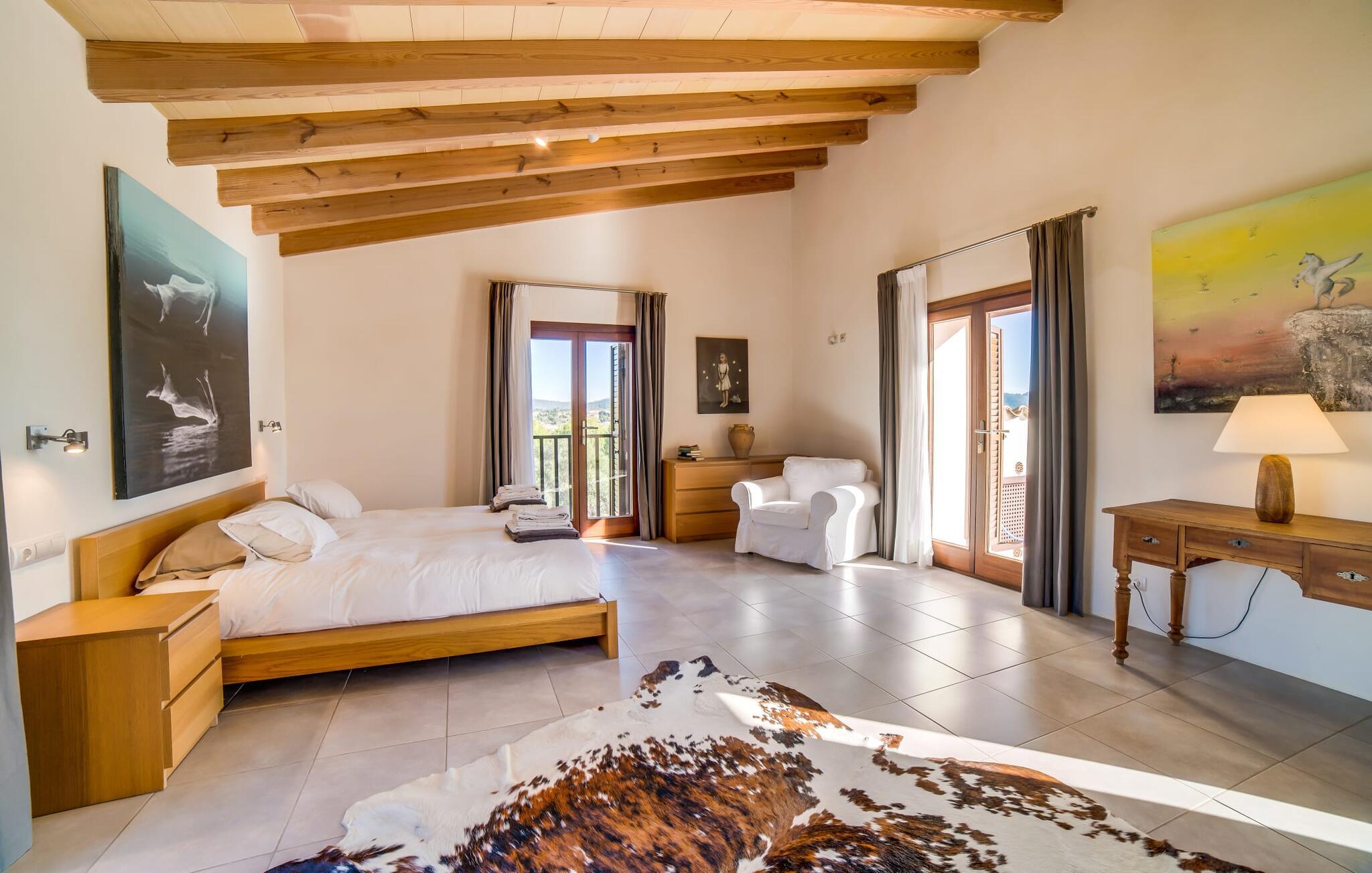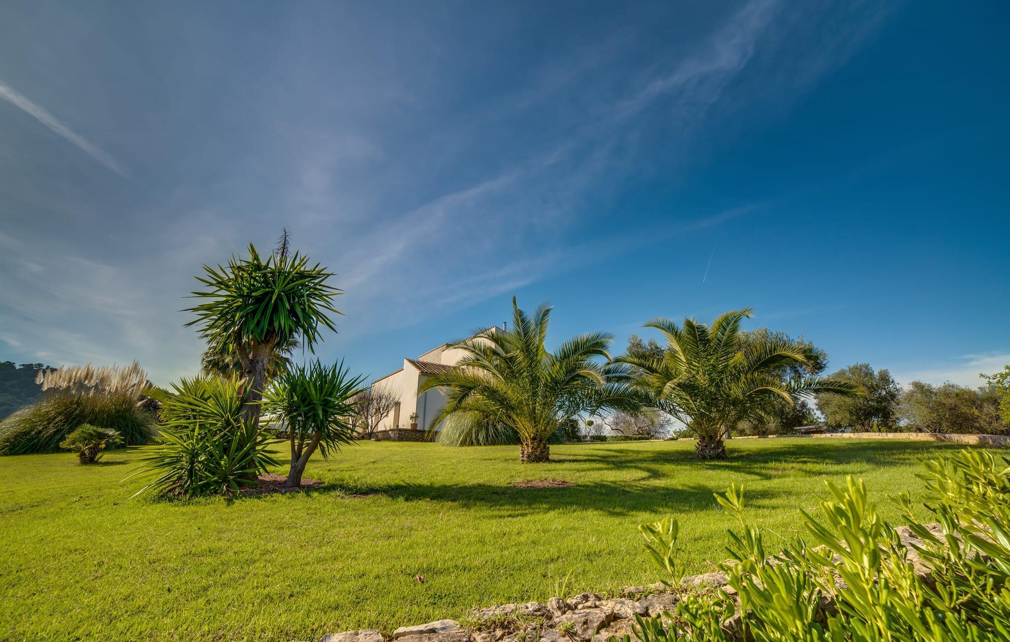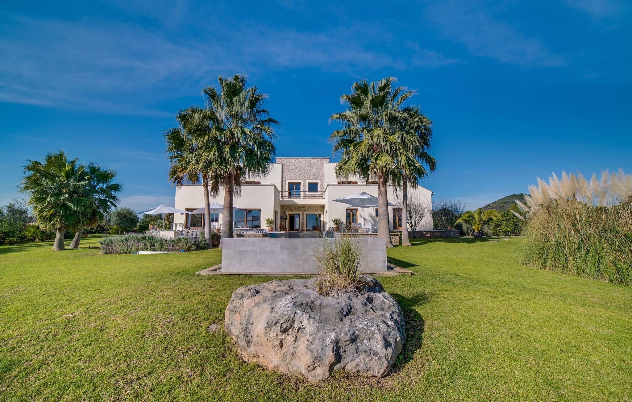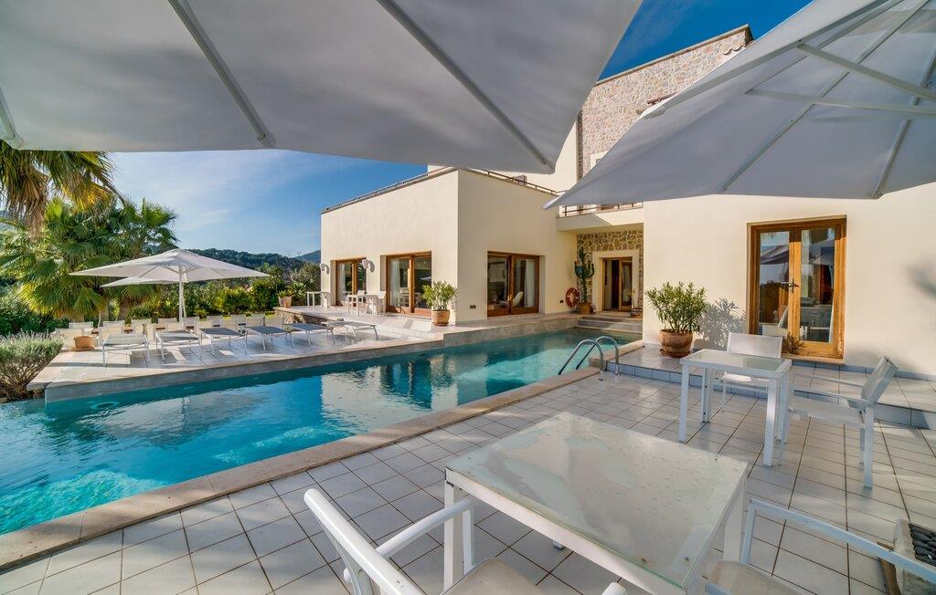 Indkørslen giver jer udsigt til den indbydende, rummelige luksusvilla "Son Sard Nou", som ligger stolt på en smuk bjergskråning ejendom med palmer og oliventræer, lavendel og cypresser. Infinity-poolen strækker sig fra villaen ind i den fantastiske have, der tilbyder et fantastisk landskab og havudsigt. Adgang til poolen er mulig via trapper eller en stige. Der er store terrasser rundt om poolen med liggestole, parasoller, siddepladser og et stort spisebord. Til den ene side af villaen er der endnu en terrasse med et stråtækt, vindækket område med en chill-out zone og et rundt spisebord. Her kan I slappe af med en grillaften med musik fra husets indbyggede højtalere. Gulv-til-loft vinduer oversvømmer villaen med lys, hvilket skaber en varm og indbydende atmosfære. Den åbne stue og spisestue er moderne og gennemtænkt designet med et overdådigt træbord og bænke mellem stue og køkken. Det fuldt udstyrede køkken er udstyret med højkvalitets apparater, hvilket gør det perfekt til selvforplejning. Villaen har seks klimatiserede soveværelser fordelt på to etager, hver med eget badeværelse og udgang til en rummelig solterrasse med en fantastisk udsigt. Den storslåede luksusvilla "Son Sard Nou" ligger kun 3 km fra smukke strande. På lidt over 4 km kan I også nå den rolige landsby Son Servera eller den populære kystby Cala Millor, som har en række restauranter, barer og butikker og et marked hver fredag morgen. "Son Sard Nou" er også ideel for golfspillere: en række golfbaner er i umiddelbar nærhed.