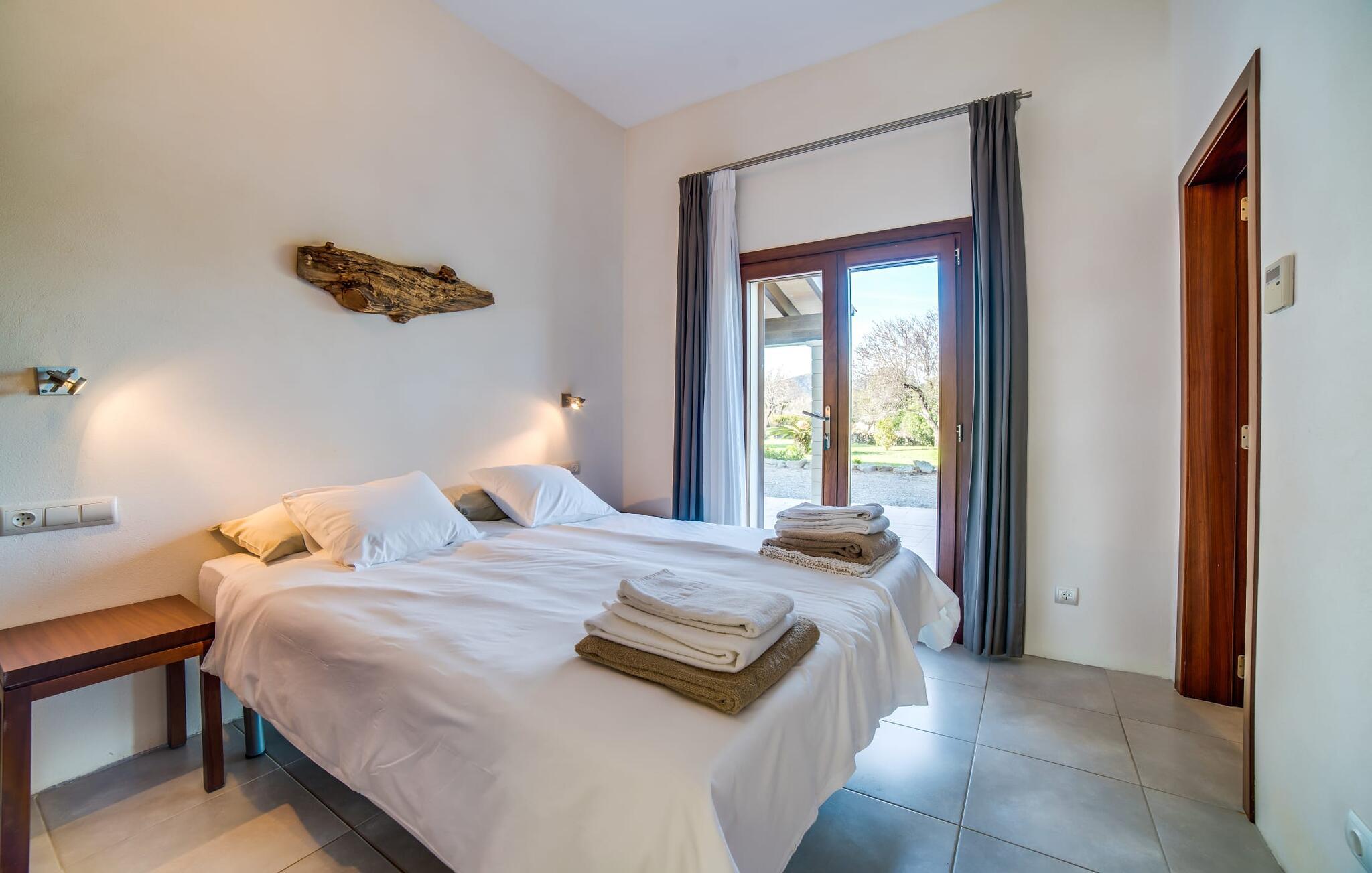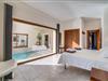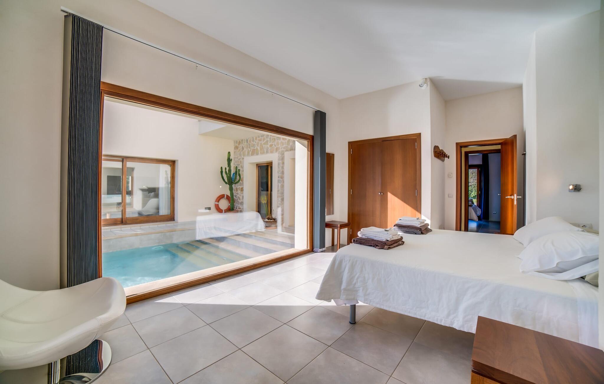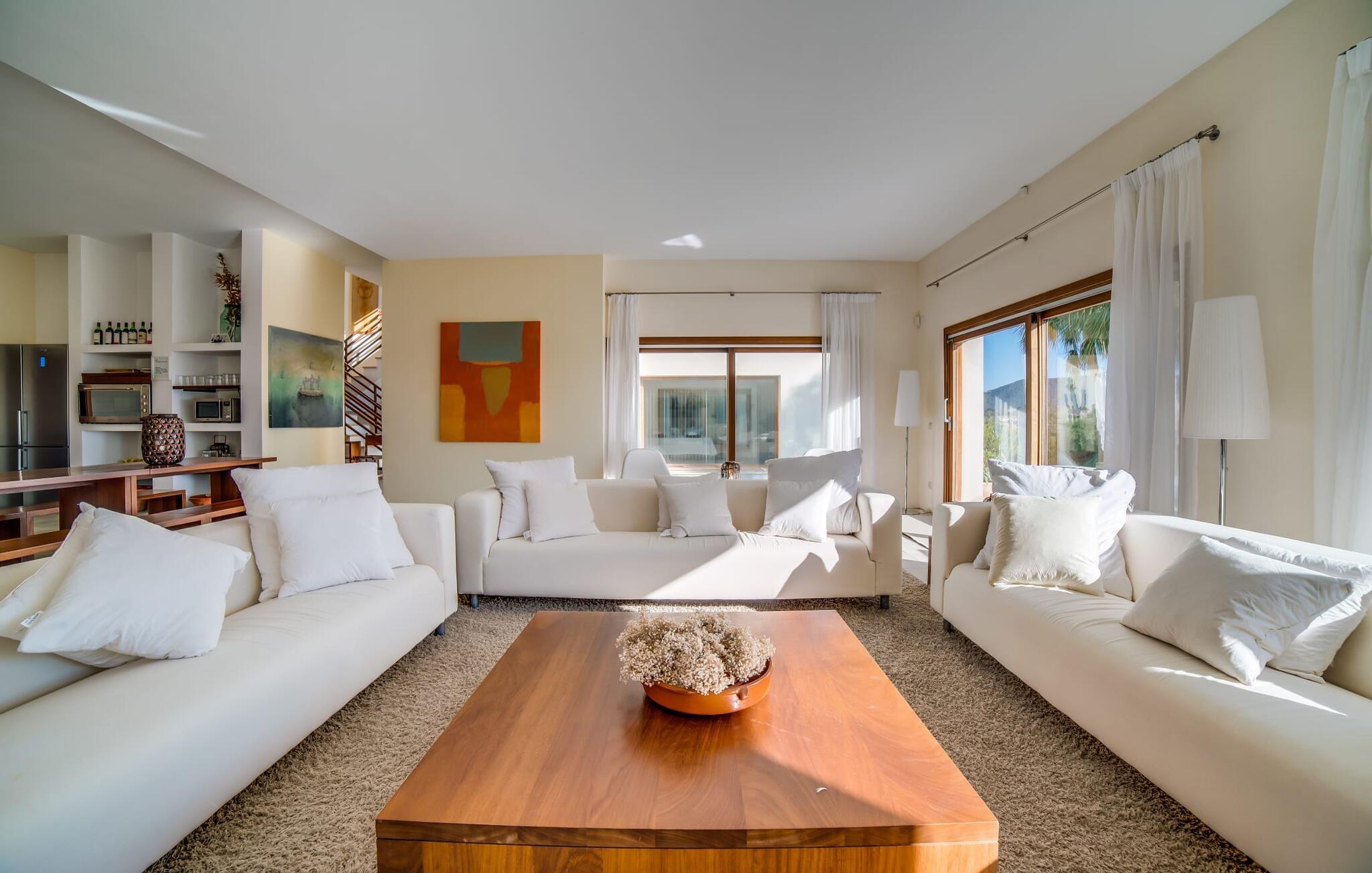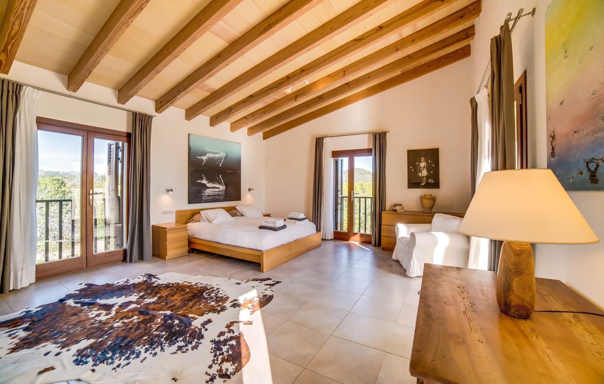 Indkørslen giver jer udsigt til den indbydende, rummelige luksusvilla "Son Sard Nou", som ligger stolt på en smuk bjergskråning ejendom med palmer og oliventræer, lavendel og cypresser. Infinity-poolen strækker sig fra villaen ind i den fantastiske have, der tilbyder et fantastisk landskab og havudsigt. Adgang til poolen er mulig via trapper eller en stige. Der er store terrasser rundt om poolen med liggestole, parasoller, siddepladser og et stort spisebord. Til den ene side af villaen er der endnu en terrasse med et stråtækt, vindækket område med en chill-out zone og et rundt spisebord. Her kan I slappe af med en grillaften med musik fra husets indbyggede højtalere. Gulv-til-loft vinduer oversvømmer villaen med lys, hvilket skaber en varm og indbydende atmosfære. Den åbne stue og spisestue er moderne og gennemtænkt designet med et overdådigt træbord og bænke mellem stue og køkken. Det fuldt udstyrede køkken er udstyret med højkvalitets apparater, hvilket gør det perfekt til selvforplejning. Villaen har seks klimatiserede soveværelser fordelt på to etager, hver med eget badeværelse og udgang til en rummelig solterrasse med en fantastisk udsigt. Den storslåede luksusvilla "Son Sard Nou" ligger kun 3 km fra smukke strande. På lidt over 4 km kan I også nå den rolige landsby Son Servera eller den populære kystby Cala Millor, som har en række restauranter, barer og butikker og et marked hver fredag morgen. "Son Sard Nou" er også ideel for golfspillere: en række golfbaner er i umiddelbar nærhed.