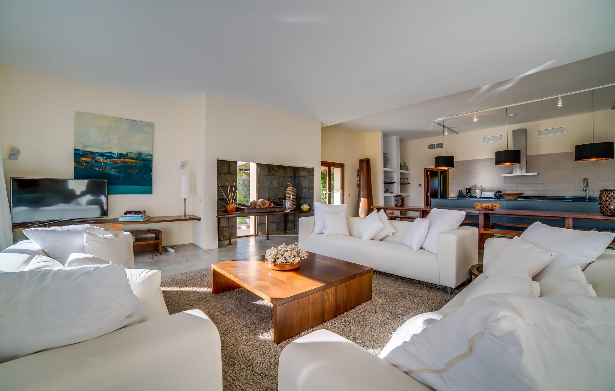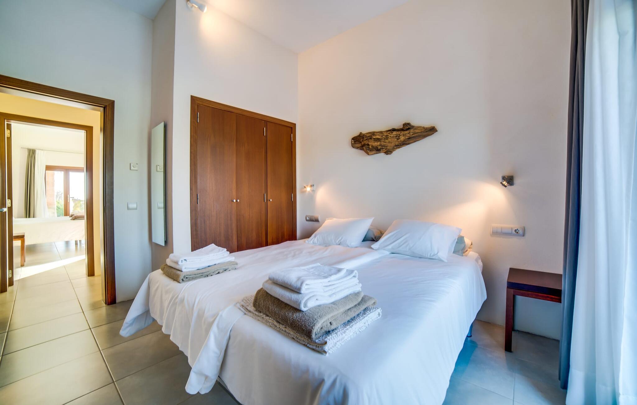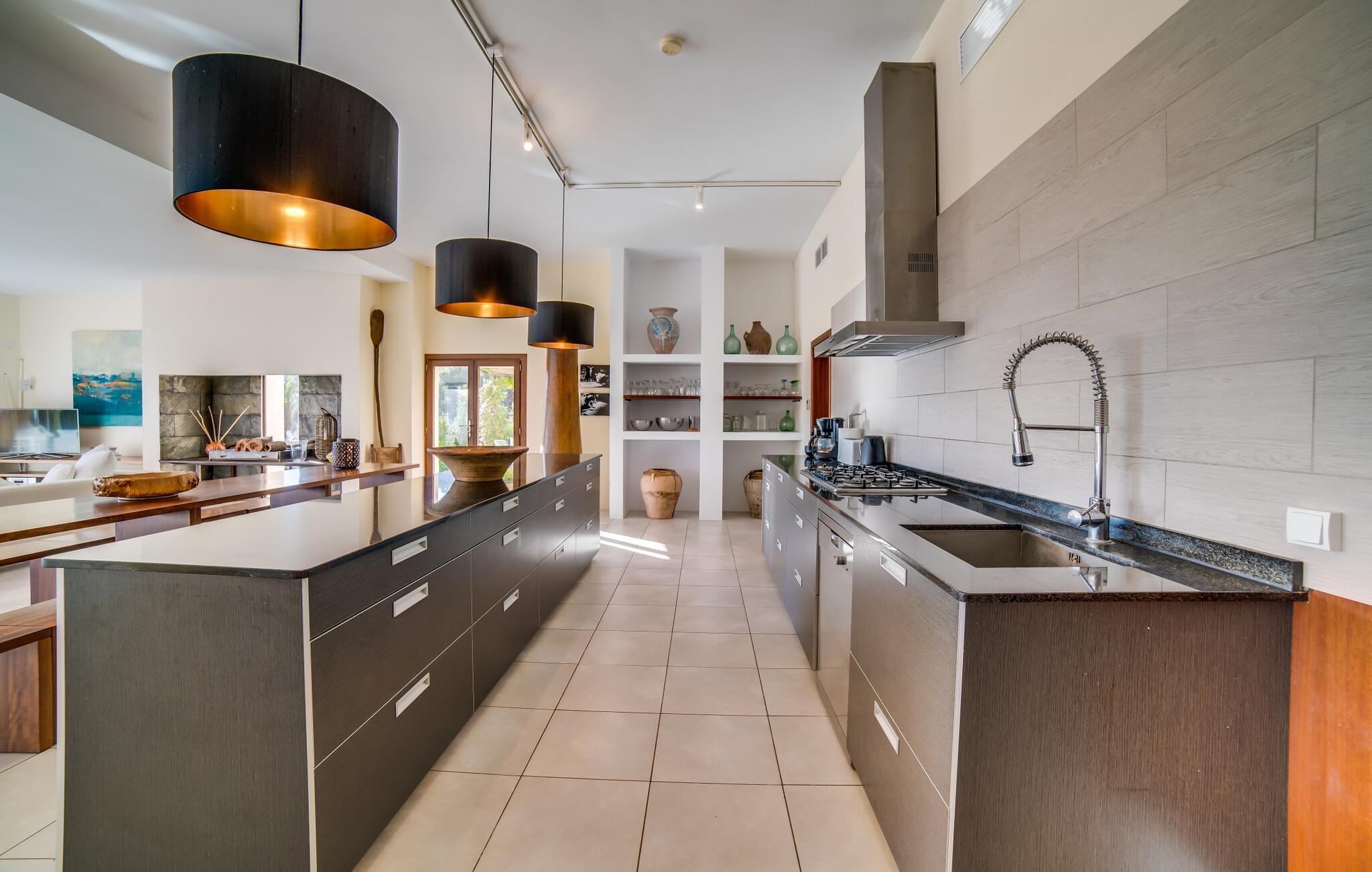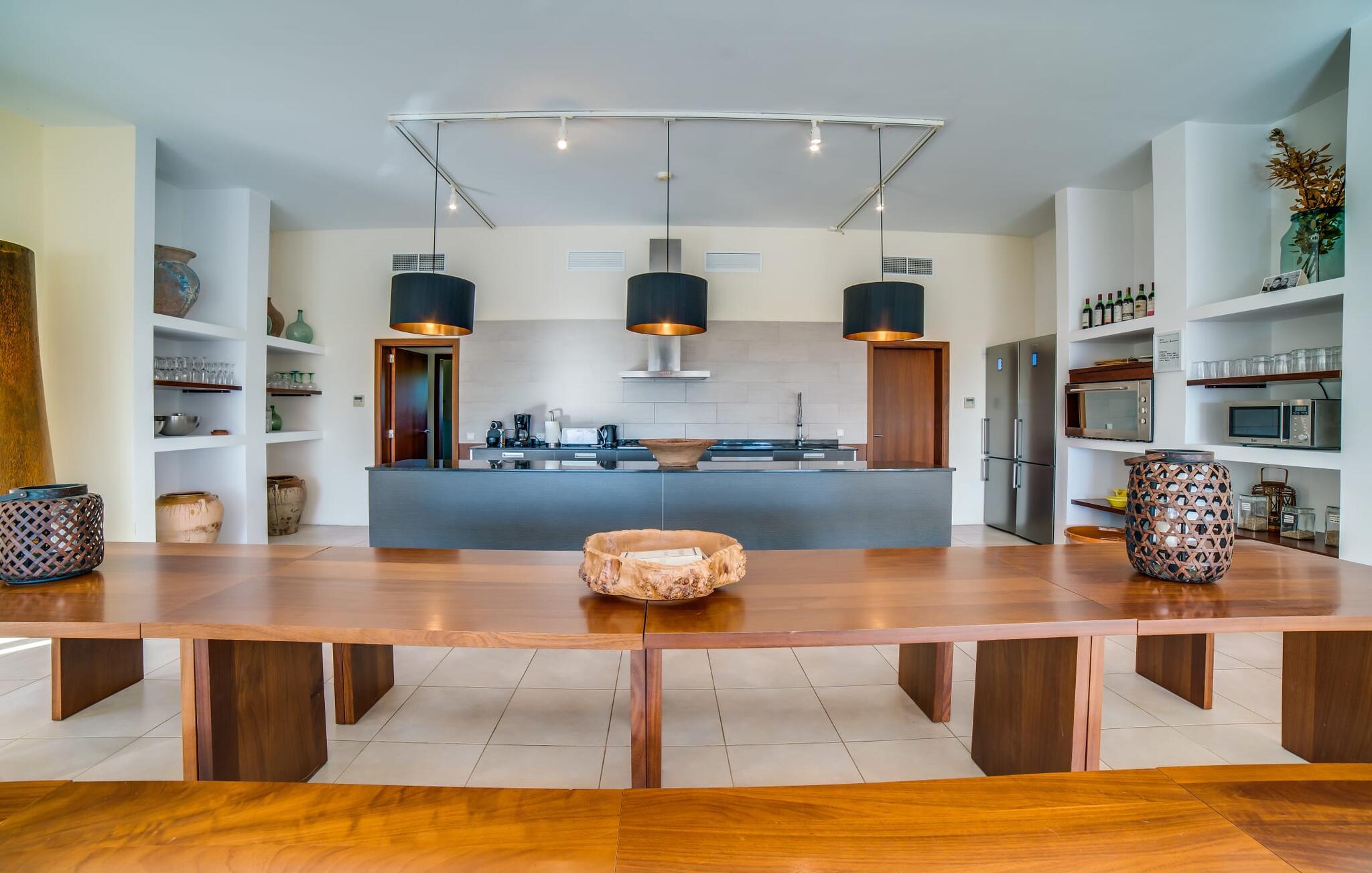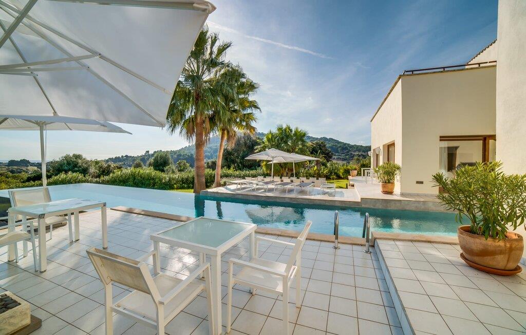 Indkørslen giver jer udsigt til den indbydende, rummelige luksusvilla "Son Sard Nou", som ligger stolt på en smuk bjergskråning ejendom med palmer og oliventræer, lavendel og cypresser. Infinity-poolen strækker sig fra villaen ind i den fantastiske have, der tilbyder et fantastisk landskab og havudsigt. Adgang til poolen er mulig via trapper eller en stige. Der er store terrasser rundt om poolen med liggestole, parasoller, siddepladser og et stort spisebord. Til den ene side af villaen er der endnu en terrasse med et stråtækt, vindækket område med en chill-out zone og et rundt spisebord. Her kan I slappe af med en grillaften med musik fra husets indbyggede højtalere. Gulv-til-loft vinduer oversvømmer villaen med lys, hvilket skaber en varm og indbydende atmosfære. Den åbne stue og spisestue er moderne og gennemtænkt designet med et overdådigt træbord og bænke mellem stue og køkken. Det fuldt udstyrede køkken er udstyret med højkvalitets apparater, hvilket gør det perfekt til selvforplejning. Villaen har seks klimatiserede soveværelser fordelt på to etager, hver med eget badeværelse og udgang til en rummelig solterrasse med en fantastisk udsigt. Den storslåede luksusvilla "Son Sard Nou" ligger kun 3 km fra smukke strande. På lidt over 4 km kan I også nå den rolige landsby Son Servera eller den populære kystby Cala Millor, som har en række restauranter, barer og butikker og et marked hver fredag morgen. "Son Sard Nou" er også ideel for golfspillere: en række golfbaner er i umiddelbar nærhed.