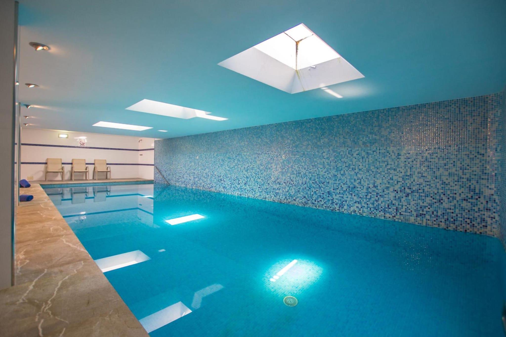 Indendørs pool og havudsigt
