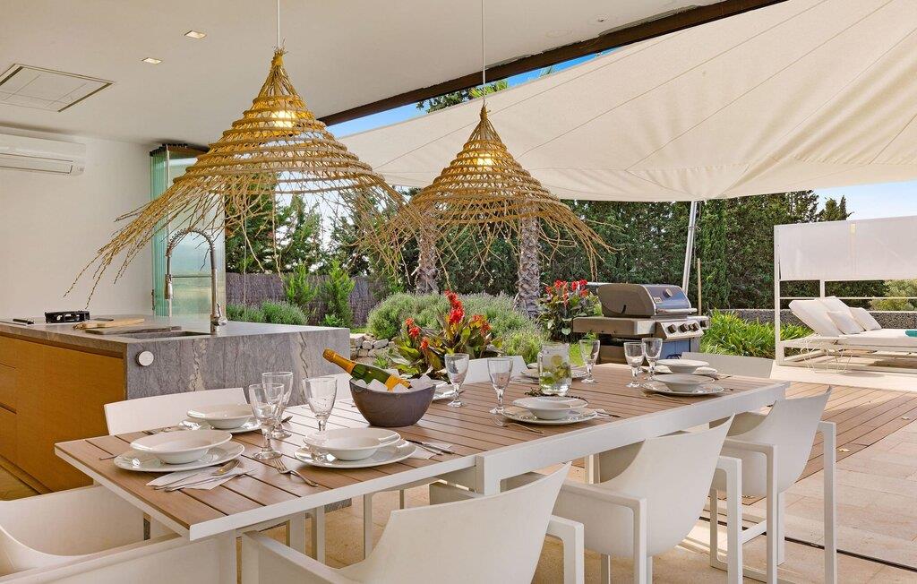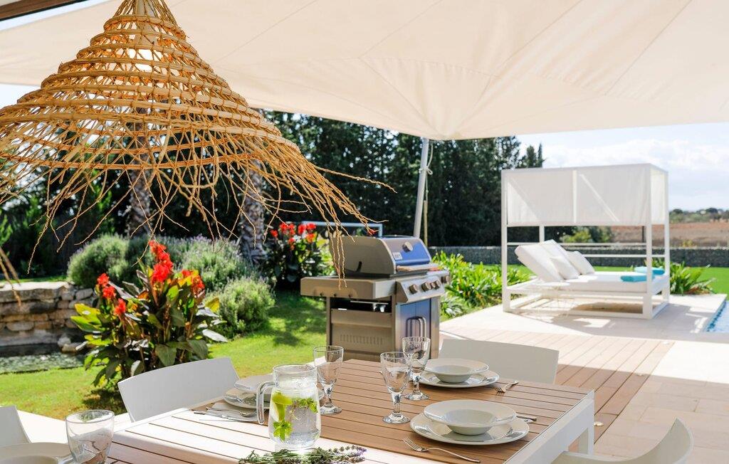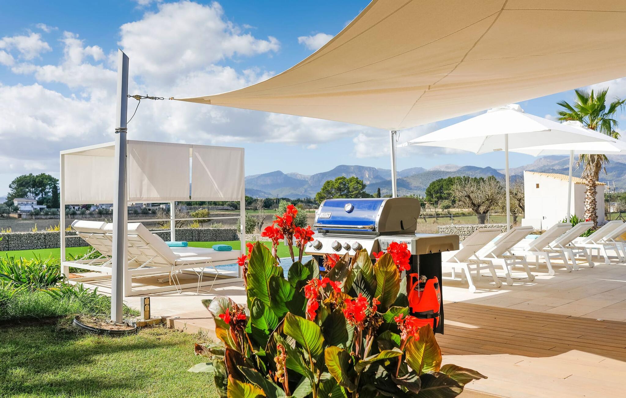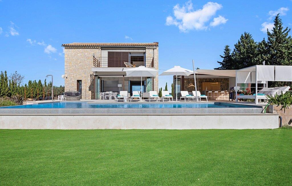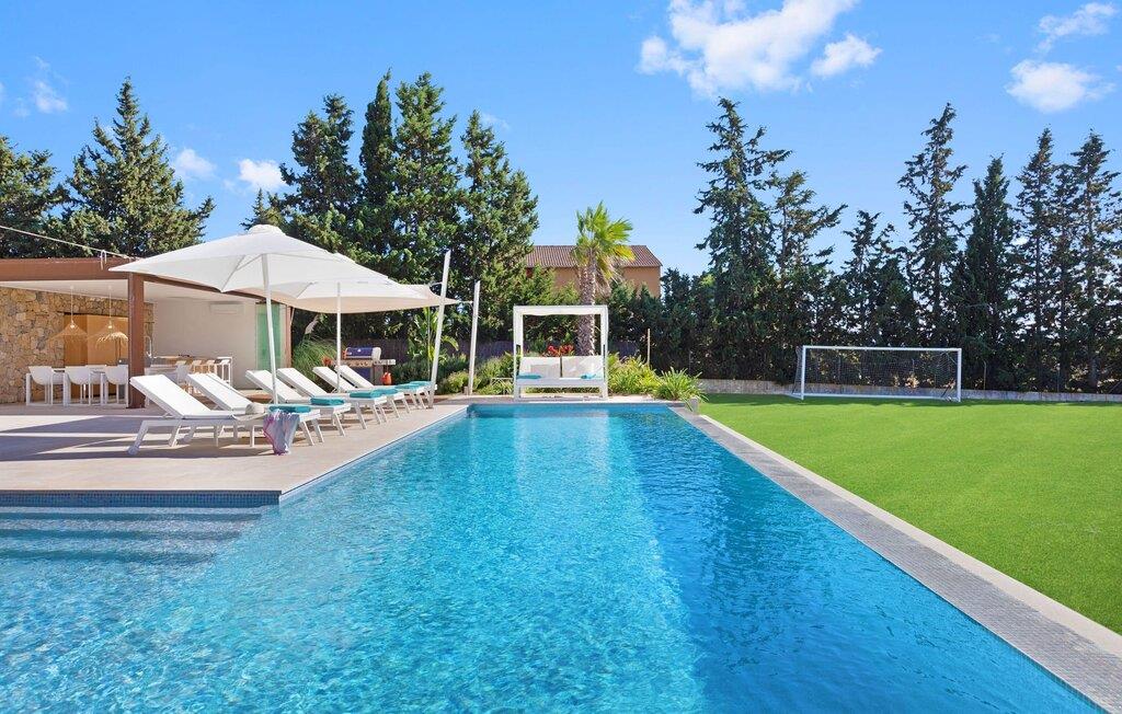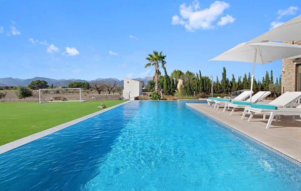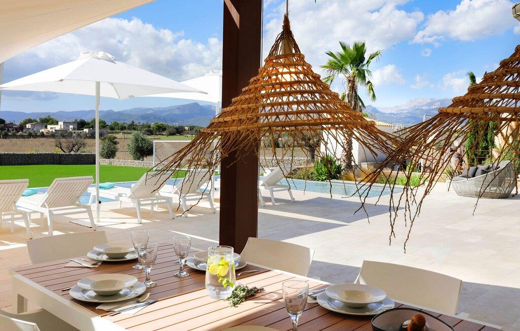 Har I en stjernebesat ferie i tankerne, så se nærmere på dette enestående feriehus. Denne Mallorca-gård er en rigtig allrounder, der vil glæde feriegæster med kræsne forventninger. “Son Set” viser allerede talent på udeområdet, som bestemt scorer point ikke kun med sin størrelse, men også med sine velholdte arealer som den stedsegrønne (kunstige) græsplæne med fodboldbane, stilfulde terrasser med og uden tag . Et af højdepunkterne ved denne feriefinca er den store pool med trapper og tilstødende solterrasse, som ikke kun byder på komfortable liggestole, men også en balinesisk seng. Et ekstraordinært og perfekt udstyret udekøkken med kogeø og bord, vinkøleskab, køleskab, opvaskemaskine, ovn, Weber grill og spisebord er endnu et højdepunkt, der kan lukkes med glasskydedøre. Den overdækkede, komfortabelt møblerede terrasse direkte ved huset kan også bruges som indendørs eller udendørs område. Udvidelsen af denne terrasse danner stuen, som på imponerende vis afspejler stuehusets højkvalitets, smagfulde stil. Lyse, harmoniske farver samt unikke møbler og dekorative stykker skaber en trendy flair. Den åbne og lyse stue-spisestue flyder glat ud i køkkenet med en centralt placeret kogeø. Det elegante og hyggelige udtryk fortsætter i soveværelserne: I stueetagen er der et soveværelse med dobbeltseng og et badeværelse, på øverste etage er der yderligere tre dobbeltværelser, hvoraf det ene har eget badeværelse og egen terrasse. Et andet badeværelse fuldender disse opholdsrum. I kælderen finder I et praktisk vaskerum og et airconditioneret fitnessområde med forskellige træningselementer samt siddepladser og et komplet badeværelse. Denne bondegård på Mallorca er et absolut must for enhver, der lægger særlig vægt på eksklusive møbler kombineret med generøsitet og ynde. I landlig beliggenhed nær byen Costitx finder I det stilfulde bondehus "Son Set" med 2.000 m2 yderst velholdt have med græsplæne og middelhavsplanter. Øens hovedstad og sandstrandene i Alcúdia-bugten er omkring en halv times kørsel væk. I Costitx, som ligger omkring 10 minutter væk i bil, kan I gøre jeres indkøb om lørdagen, for eksempel på det lokale ugentlige marked. Centrum af Inca er kun omkring 4 km væk.
