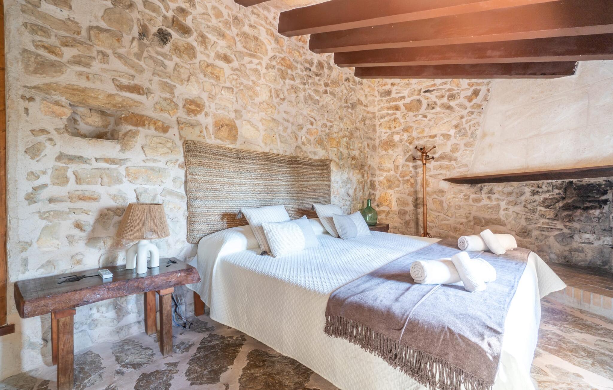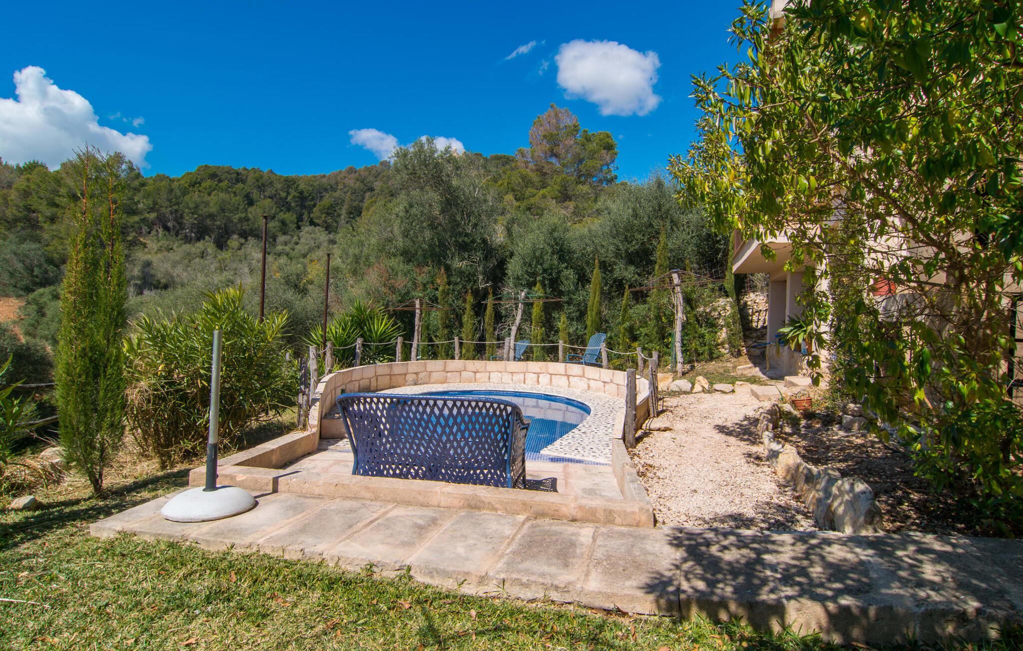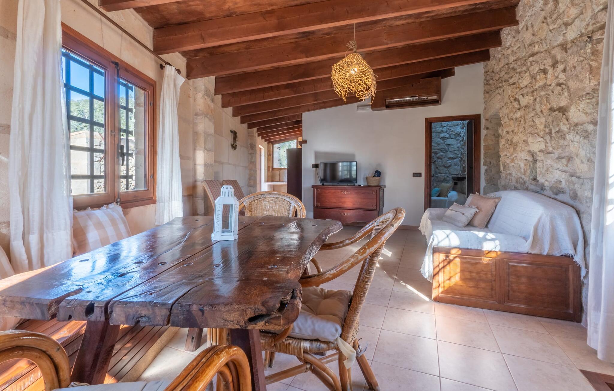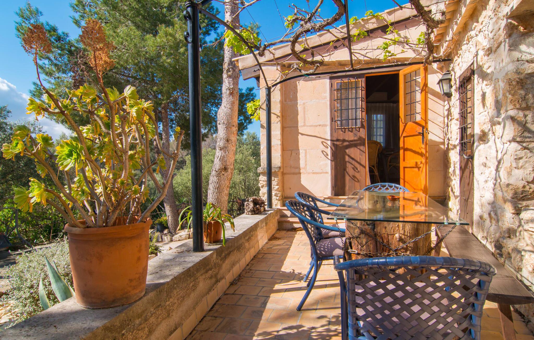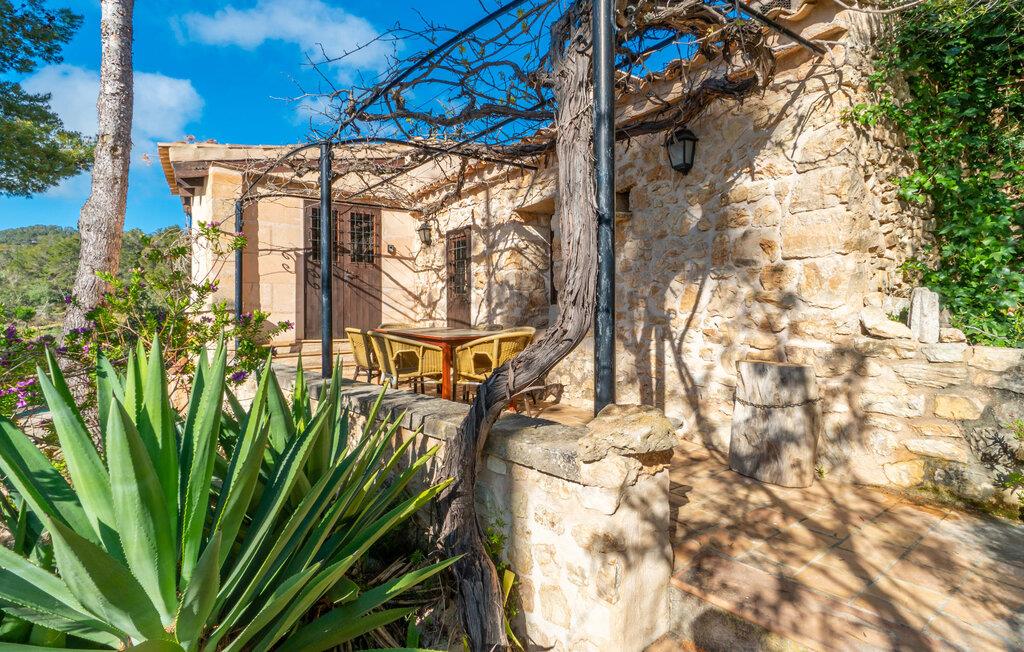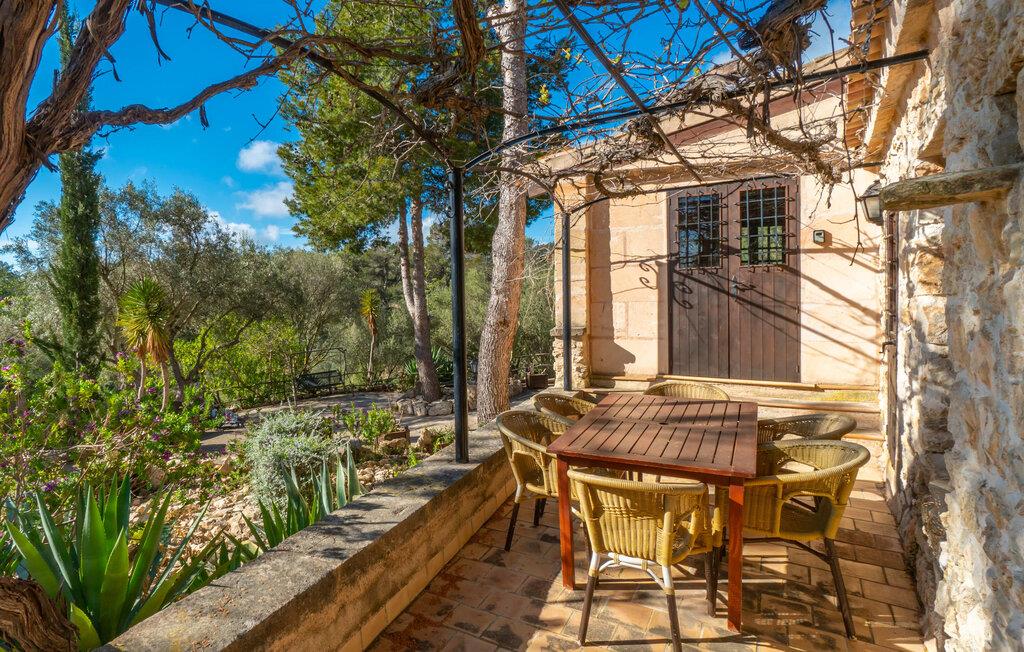 Lejligheden "Es Colomé" er beliggende i den charmerende agroturismo "Son Torrat", nær Petra i hjertet af Mallorca. Denne ejendom har smukt rustikke naturstensbygninger på en bjergskråning omgivet af frodige middelhavslandskaber, herunder sin egen frugthave. Gæsterne har plads nok til afslappede gåture eller kan nyde sportsaktiviteter som bordtennis og volleyball på hotellets egen bane. Den fælles pool med liggestole og parasoller tilbyder et forfriskende tilflugtssted, mens en separat babypool henvender sig til yngre gæster. Et iøjnefaldende træk er spabadet, der er beliggende i en stenhule, der minder om en romantisk grotte. jeres lejlighed har en privat solterrasse med spisemøbler, hvilket bidrager til den hyggelige atmosfære. Indretningen afspejler ejendommens rustikke charme, med ru pudsede vægge, naturstensaccenter og klassiske møbler, der skaber en harmonisk landlig atmosfære. Layoutet er praktisk, med alle bekvemmeligheder på ét plan, herunder en stue og spisestue med en komfortabel sofa og spisebord, et lille køkken, to soveværelser med dobbeltsenge og to badeværelser. En off-road lejebil anbefales for at få adgang til agroturismo. Hvis I elsker fred og natur og sætter pris på smukke landskaber, så er I kommet til det rette sted. Den smukt rustikke ferielejlighed "Es Colomé" ligger i absolut fred og ro på en blid skråning i den smukke natur i centrum af øen. Middelalderbyen Petra, som er særligt kendt for sine regionalt dyrkede vine Cabernet Sauvignon, Chardonnay. og Merlot, kan nås efter 4, 2 km, mens den nærmeste strand ligger 20 km væk.