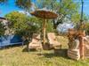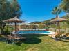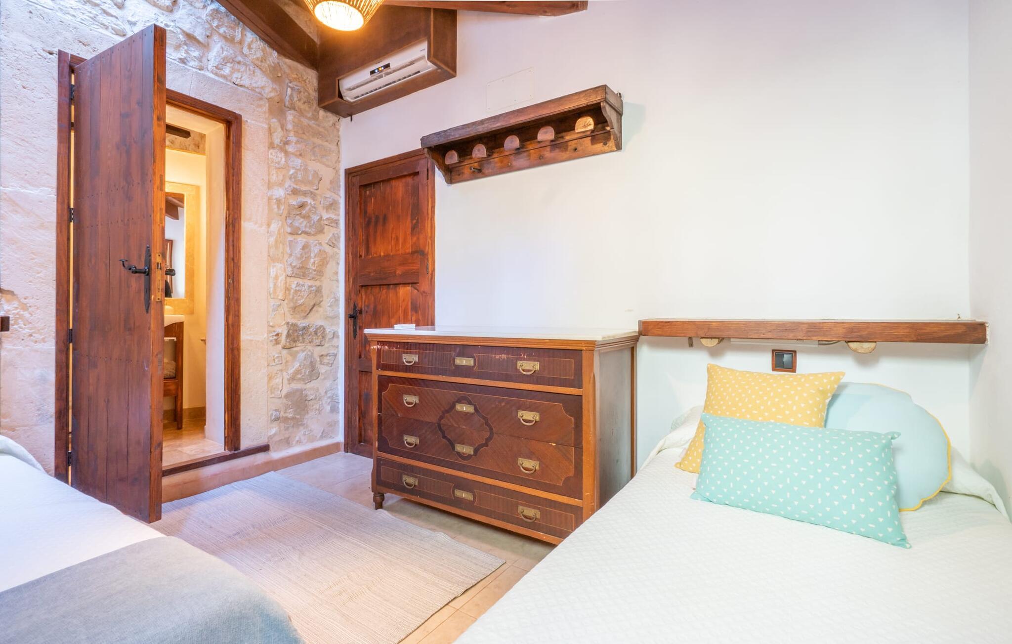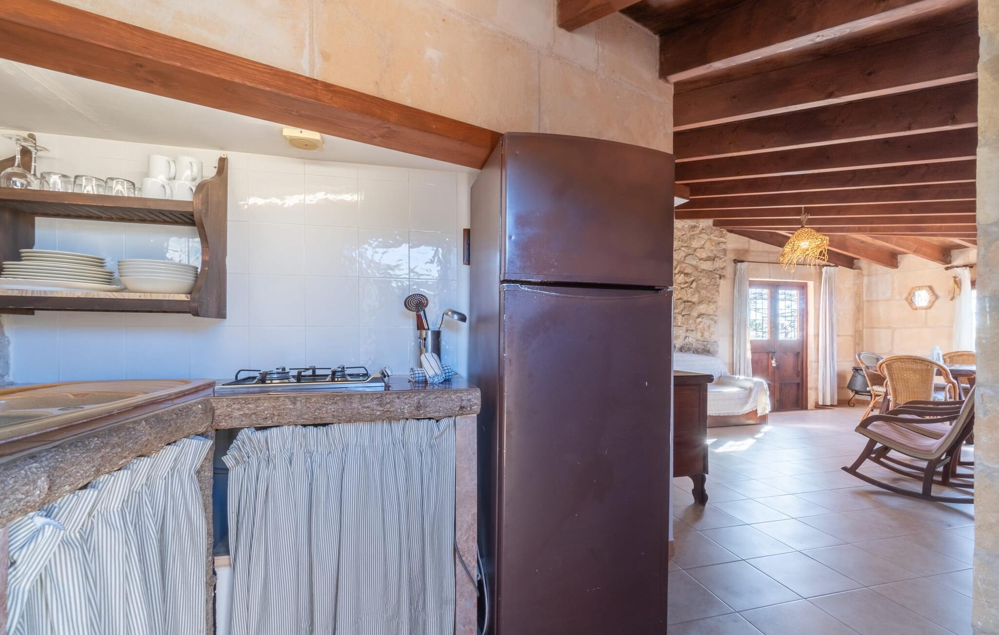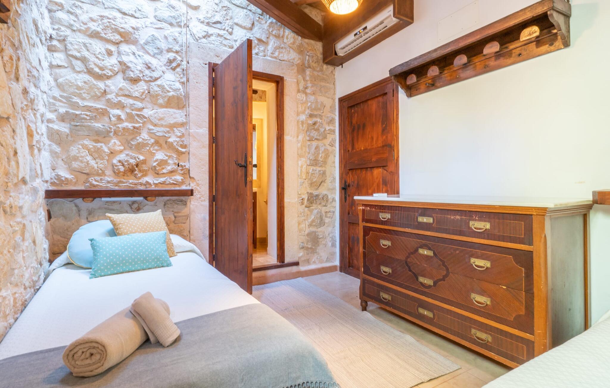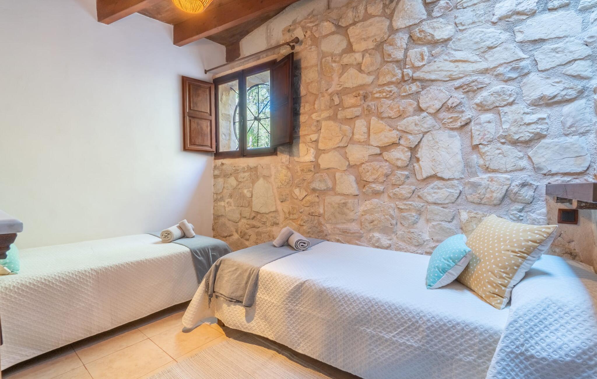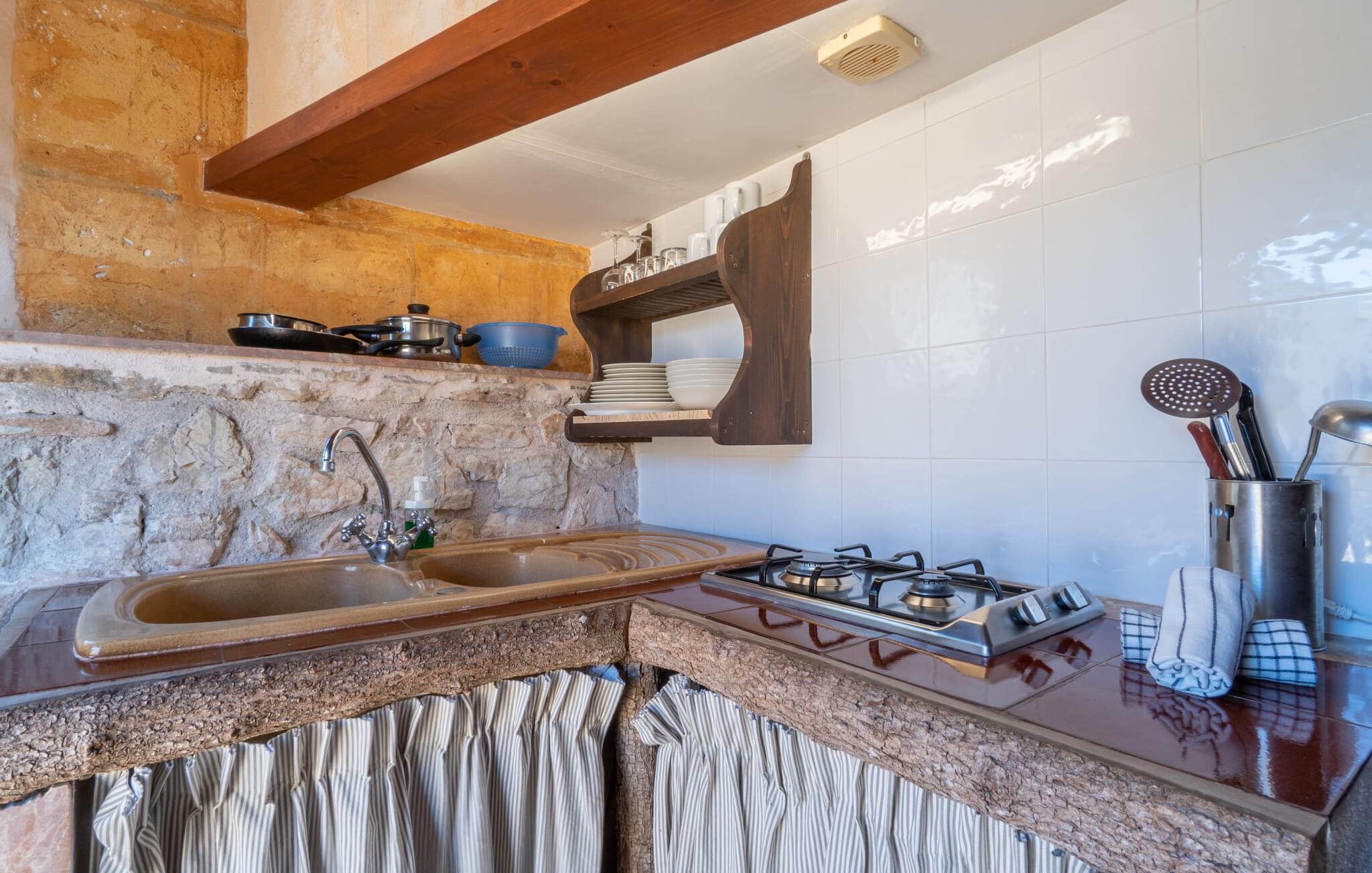 Lejligheden "Es Colomé" er beliggende i den charmerende agroturismo "Son Torrat", nær Petra i hjertet af Mallorca. Denne ejendom har smukt rustikke naturstensbygninger på en bjergskråning omgivet af frodige middelhavslandskaber, herunder sin egen frugthave. Gæsterne har plads nok til afslappede gåture eller kan nyde sportsaktiviteter som bordtennis og volleyball på hotellets egen bane. Den fælles pool med liggestole og parasoller tilbyder et forfriskende tilflugtssted, mens en separat babypool henvender sig til yngre gæster. Et iøjnefaldende træk er spabadet, der er beliggende i en stenhule, der minder om en romantisk grotte. jeres lejlighed har en privat solterrasse med spisemøbler, hvilket bidrager til den hyggelige atmosfære. Indretningen afspejler ejendommens rustikke charme, med ru pudsede vægge, naturstensaccenter og klassiske møbler, der skaber en harmonisk landlig atmosfære. Layoutet er praktisk, med alle bekvemmeligheder på ét plan, herunder en stue og spisestue med en komfortabel sofa og spisebord, et lille køkken, to soveværelser med dobbeltsenge og to badeværelser. En off-road lejebil anbefales for at få adgang til agroturismo. Hvis I elsker fred og natur og sætter pris på smukke landskaber, så er I kommet til det rette sted. Den smukt rustikke ferielejlighed "Es Colomé" ligger i absolut fred og ro på en blid skråning i den smukke natur i centrum af øen. Middelalderbyen Petra, som er særligt kendt for sine regionalt dyrkede vine Cabernet Sauvignon, Chardonnay. og Merlot, kan nås efter 4, 2 km, mens den nærmeste strand ligger 20 km væk.