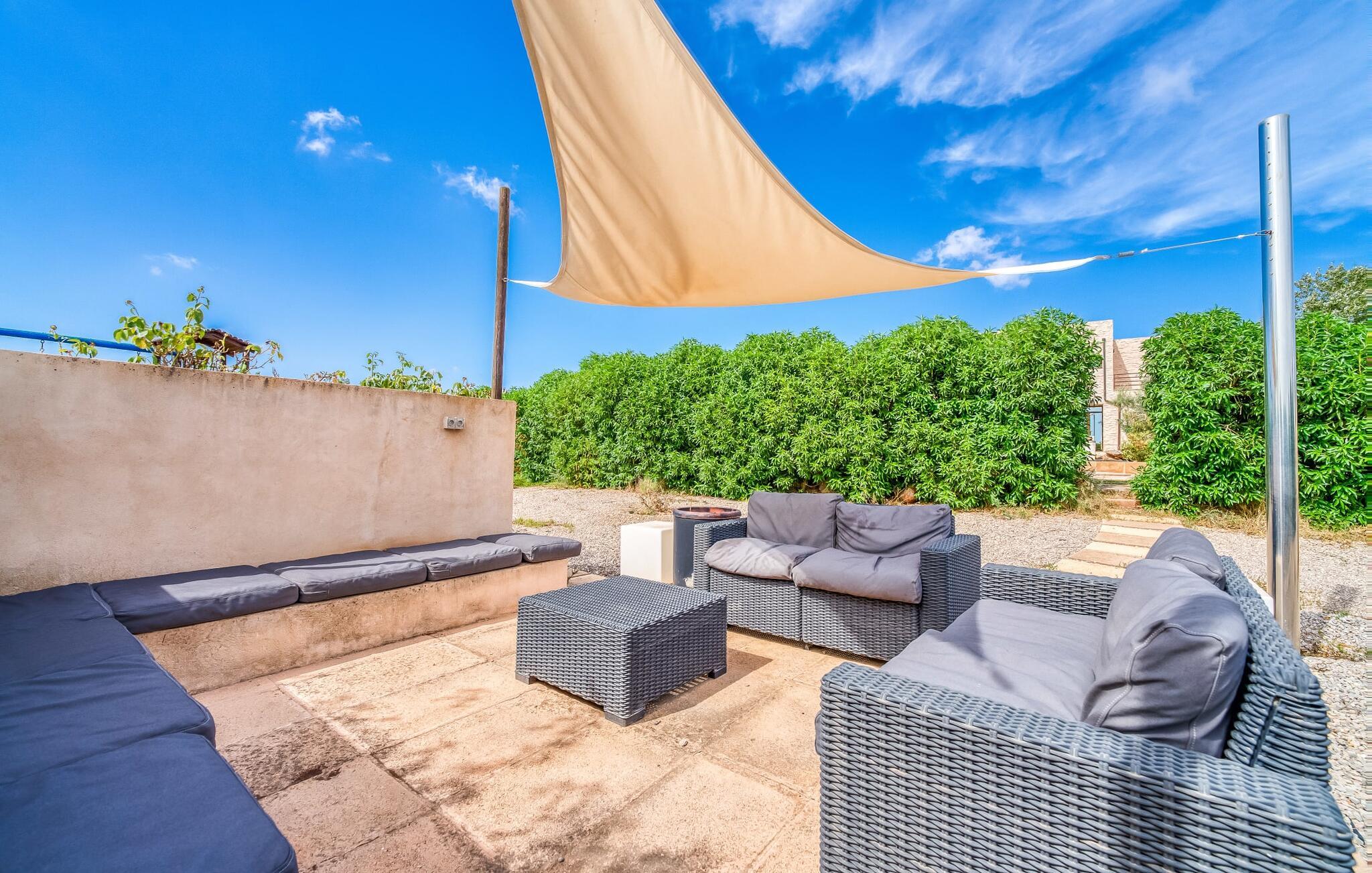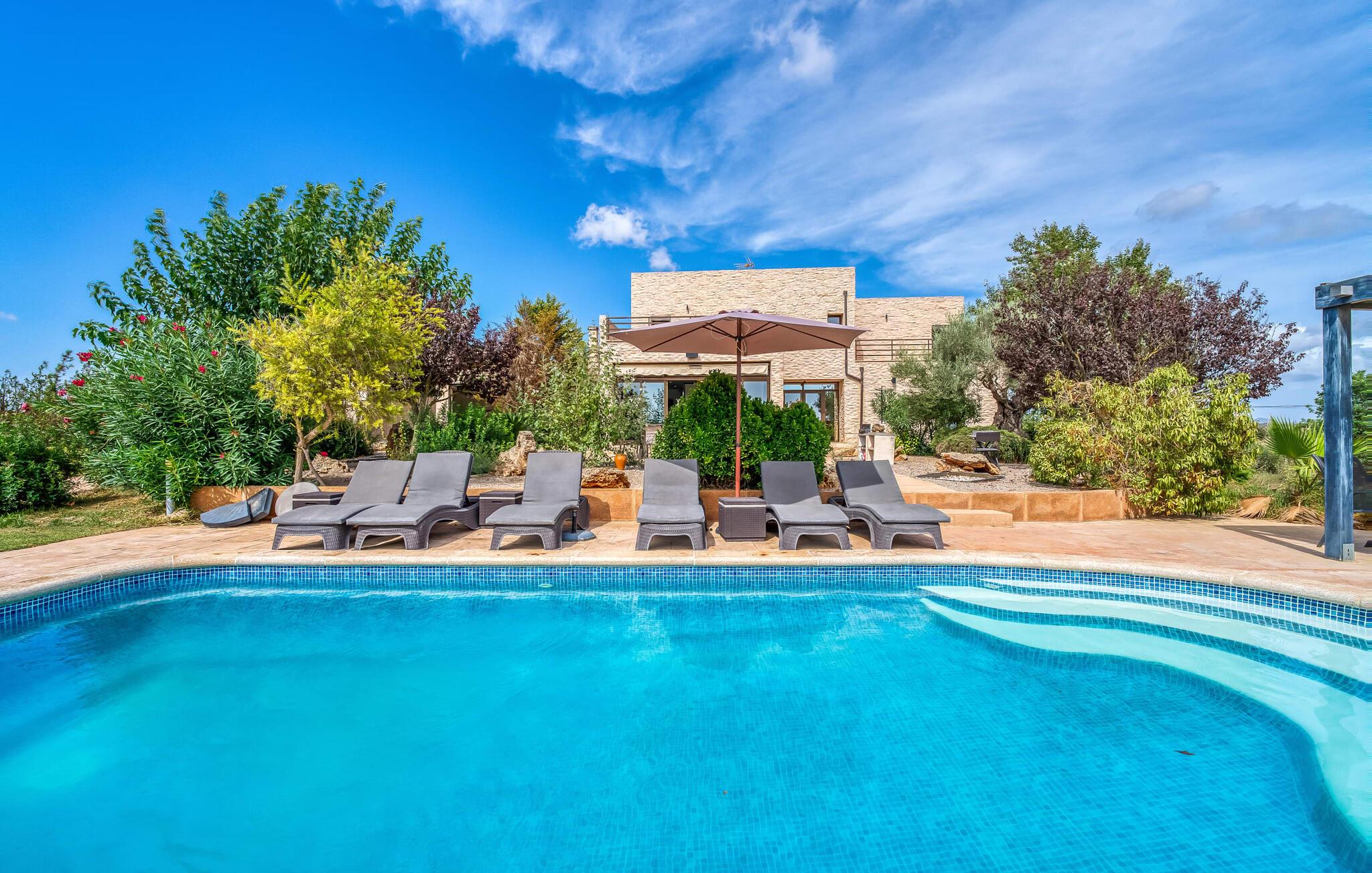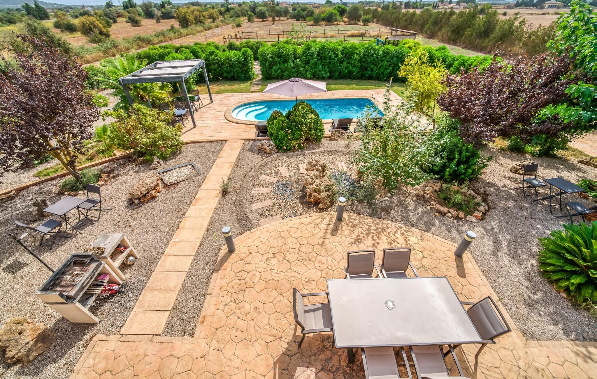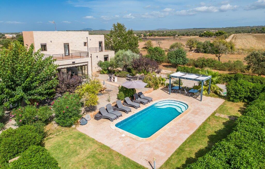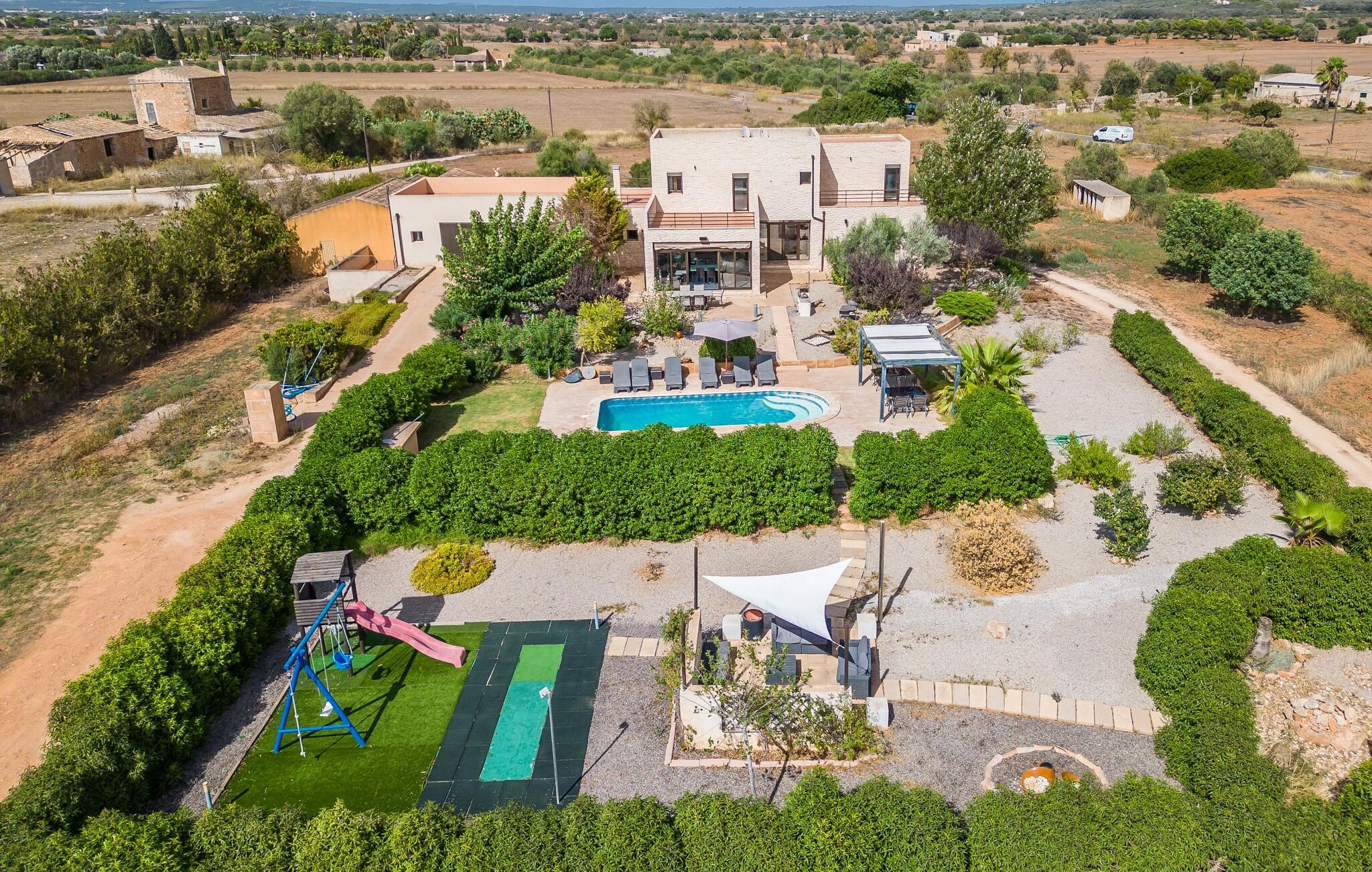 Villa "Son Virgili" tilbyder et moderne, familievenligt tilflugtssted med faciliteter af høj kvalitet, ideelt for dem, der søger både luksus og komfort. Denne sandstensfarvede villa er opdelt i kubiske sektioner og har gulv-til-loft-vinduer, der tilbyder en betagende udsigt over den omkringliggende natur. Altanerne byder på panoramaudsigt, mens udendørsarealet er velegnet til både voksne og børn. En rummelig legeplads inviterer børn til at lege, og den ovale pool med brede trin for nem adgang er ideel for alle aldre. Solterrassen, der er udstyret med liggestole og parasoller, byder på masser af plads til at slappe af. Et afslapningsområde omgivet af stenmure tilbyder privatliv og beskyttelse mod vinden, mens en rolig hængekøje ved siden af huset er perfekt til et roligt tilflugtssted. Indvendigt er villaens moderne design både rummelig og indbydende. Stueetagen i åbent plan har et komfortabelt opholdsområde, en stilfuld spiseplads og et køkken af høj kvalitet med ø, perfekt til tilberedning af måltider. Børneværelset byder med sin legende gule og grønne indretning på to enkeltsenge, mens de to voksne soveværelser byder på masser af plads og opbevaring. Det store soveværelse har eget badeværelse, og de andre soveværelser deler badeværelse. Med sin rolige, rustikke beliggenhed lover "Son Virgili" en afslappende ferie for hele familien. Den moderne finca "Son Virgili" ligger i smukke landlige omgivelser nær byen Campos. Fra villaen kan I køre til smukke strande som Sa Rapita eller den naturlige sandstrand "Es Trenc". For shopping er Campos stedet at tage hen med et ugentligt marked, der finder sted hver torsdag og lørdag.