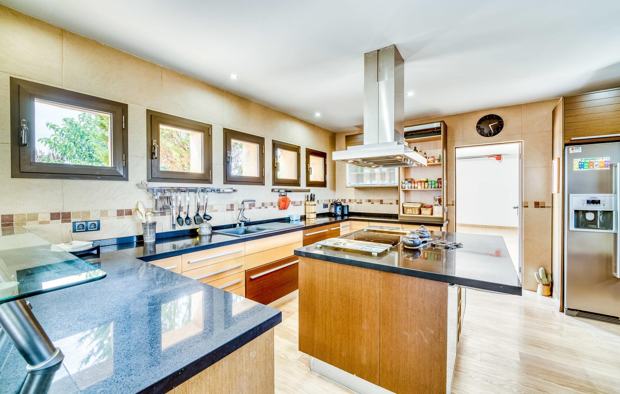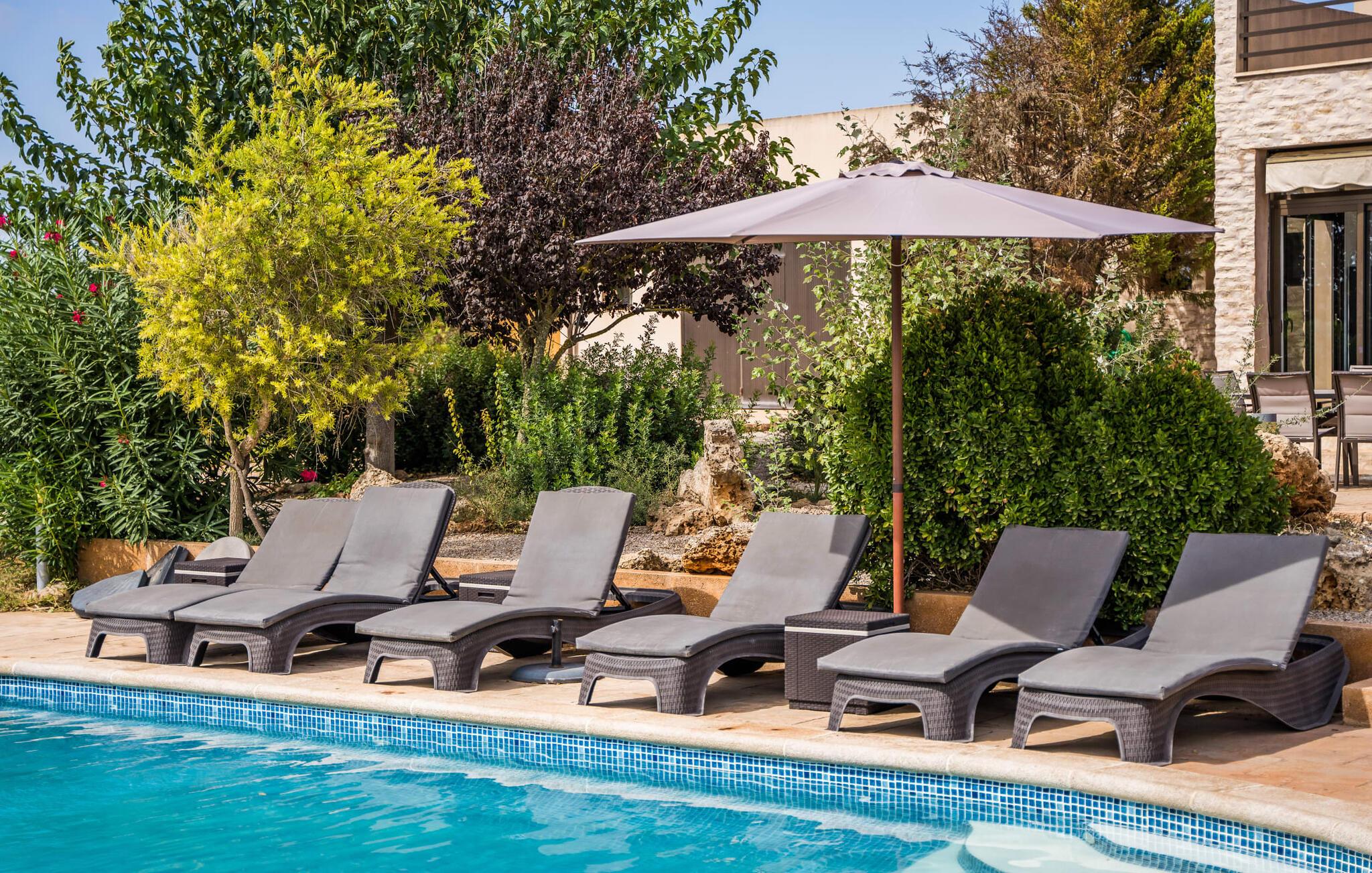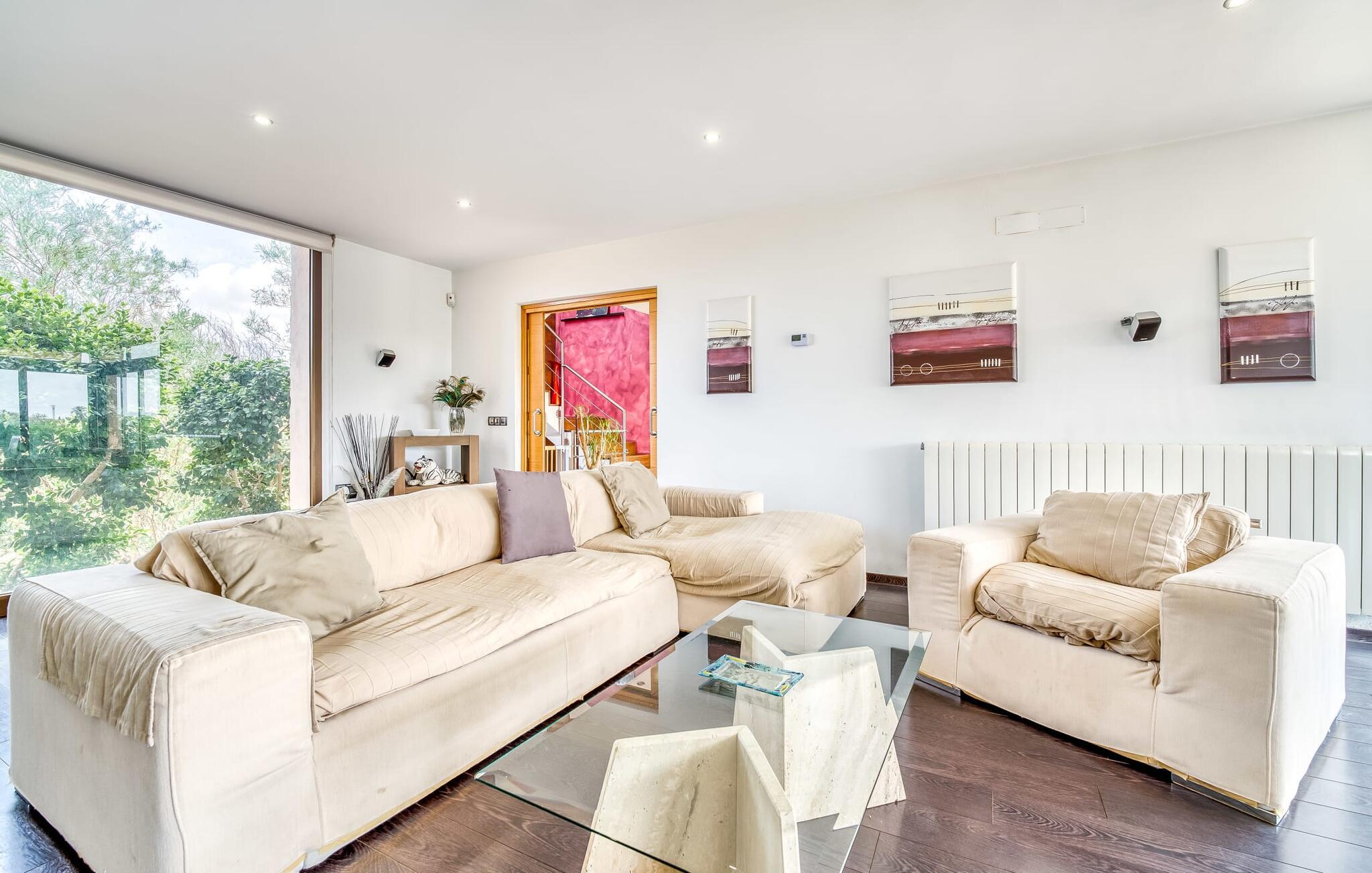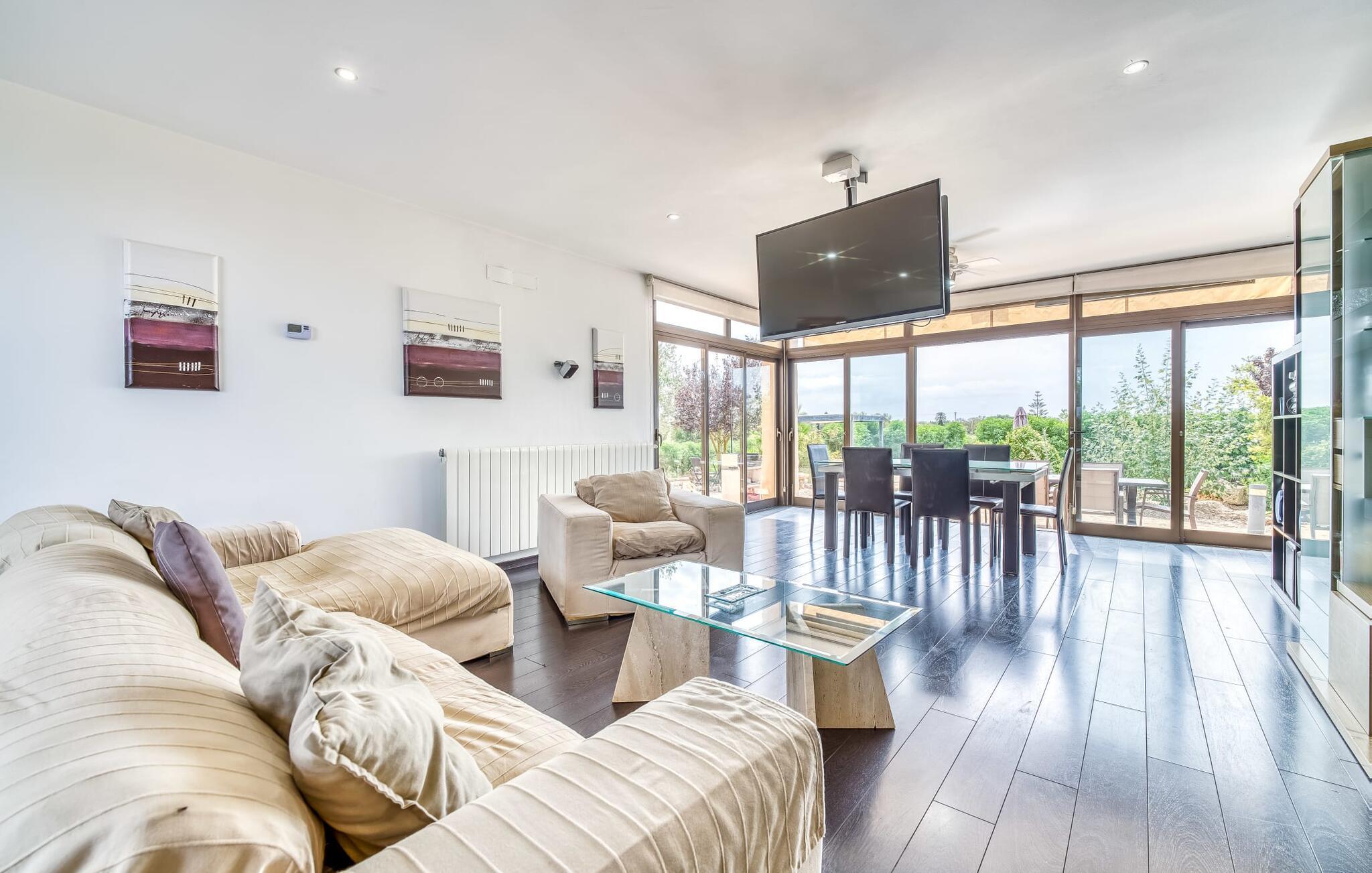 Villa "Son Virgili" tilbyder et moderne, familievenligt tilflugtssted med faciliteter af høj kvalitet, ideelt for dem, der søger både luksus og komfort. Denne sandstensfarvede villa er opdelt i kubiske sektioner og har gulv-til-loft-vinduer, der tilbyder en betagende udsigt over den omkringliggende natur. Altanerne byder på panoramaudsigt, mens udendørsarealet er velegnet til både voksne og børn. En rummelig legeplads inviterer børn til at lege, og den ovale pool med brede trin for nem adgang er ideel for alle aldre. Solterrassen, der er udstyret med liggestole og parasoller, byder på masser af plads til at slappe af. Et afslapningsområde omgivet af stenmure tilbyder privatliv og beskyttelse mod vinden, mens en rolig hængekøje ved siden af huset er perfekt til et roligt tilflugtssted. Indvendigt er villaens moderne design både rummelig og indbydende. Stueetagen i åbent plan har et komfortabelt opholdsområde, en stilfuld spiseplads og et køkken af høj kvalitet med ø, perfekt til tilberedning af måltider. Børneværelset byder med sin legende gule og grønne indretning på to enkeltsenge, mens de to voksne soveværelser byder på masser af plads og opbevaring. Det store soveværelse har eget badeværelse, og de andre soveværelser deler badeværelse. Med sin rolige, rustikke beliggenhed lover "Son Virgili" en afslappende ferie for hele familien. Den moderne finca "Son Virgili" ligger i smukke landlige omgivelser nær byen Campos. Fra villaen kan I køre til smukke strande som Sa Rapita eller den naturlige sandstrand "Es Trenc". For shopping er Campos stedet at tage hen med et ugentligt marked, der finder sted hver torsdag og lørdag.