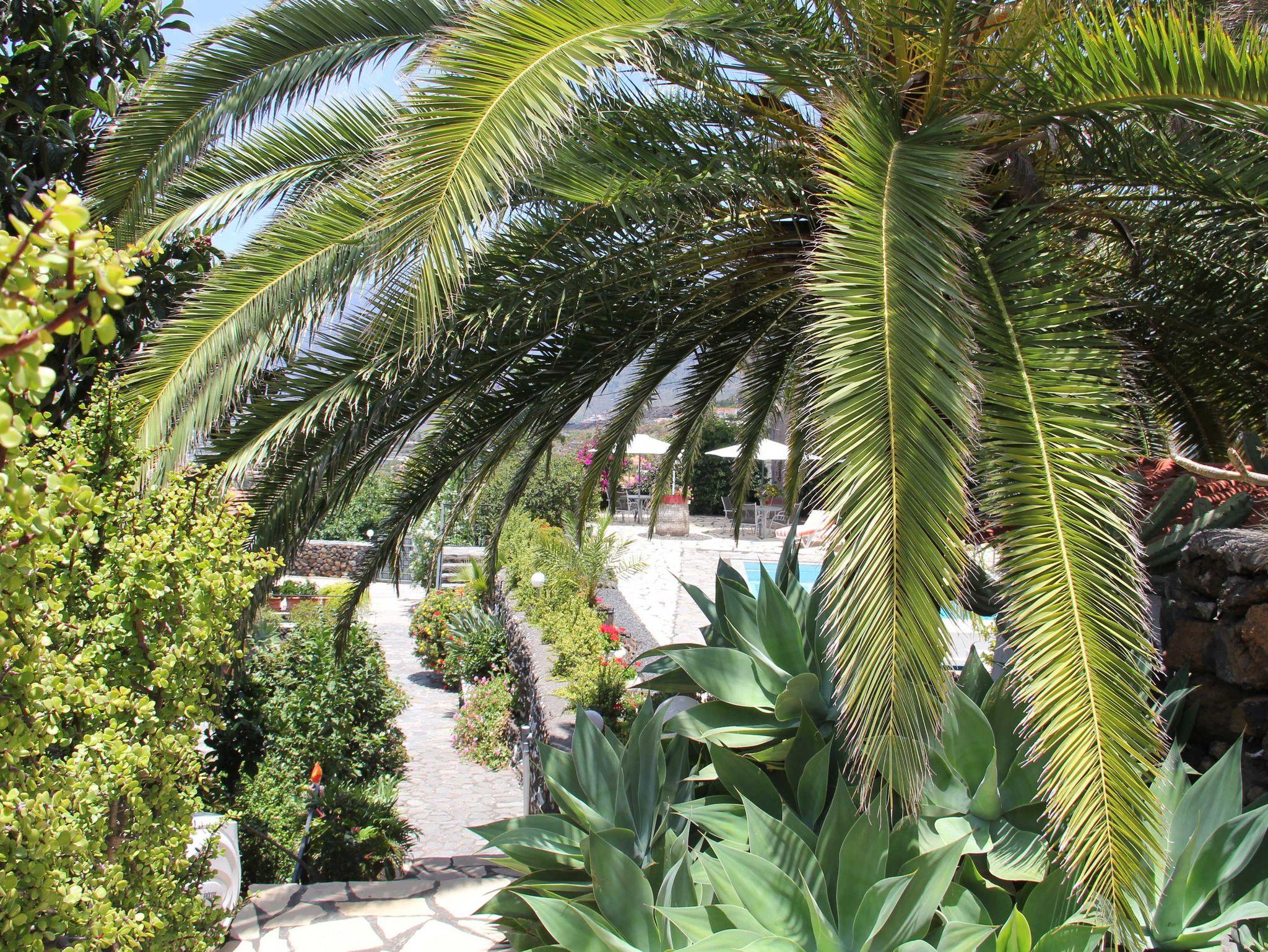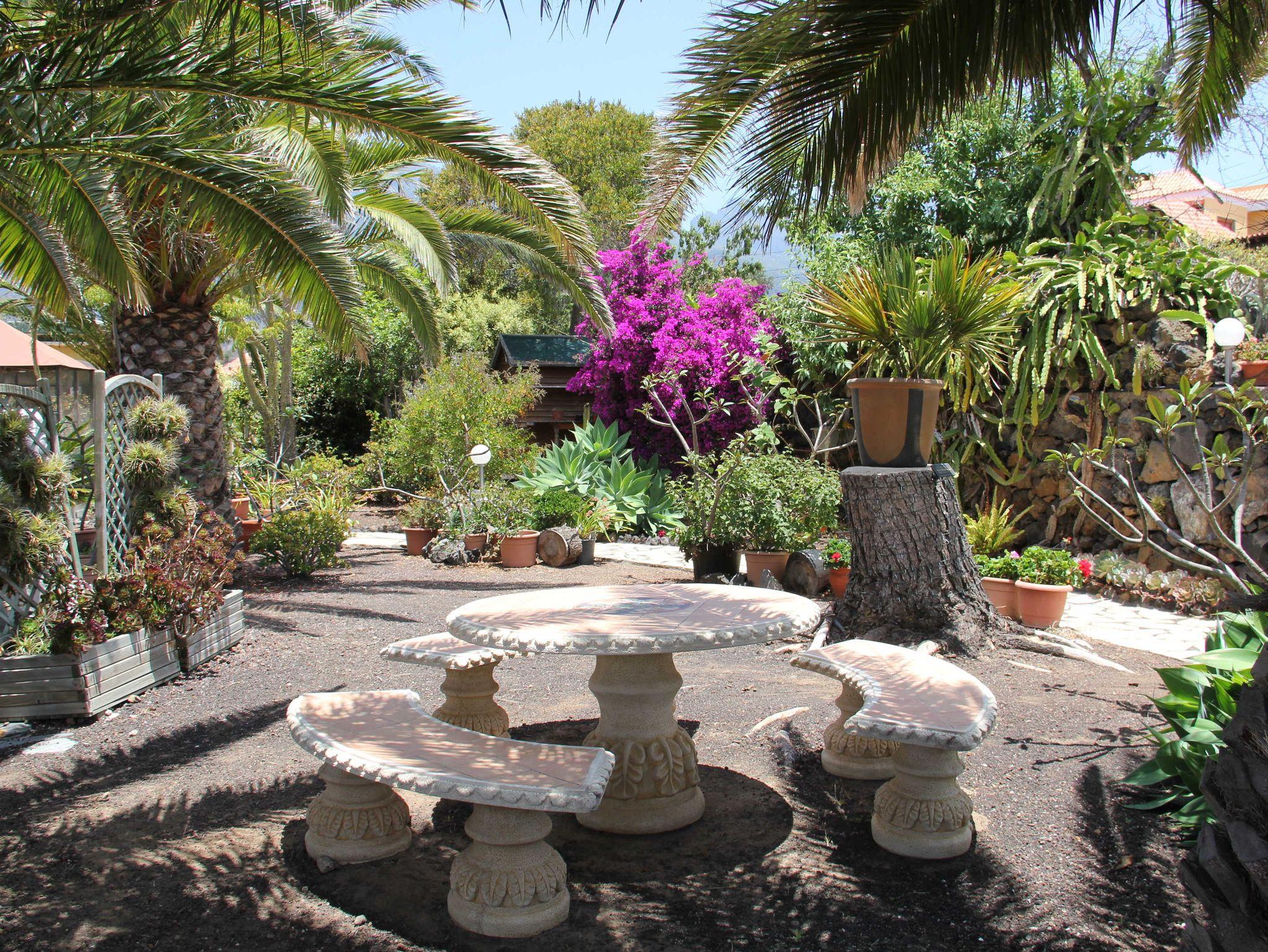 Die ca. 2600qm umfassende Gartenanlage bietet sowohl sonnige als auch schattige Plätze. Sie ist großzügig angelegt und bietet kleine Überraschungen, wie die Vogelvoliere, in der Nymphensittiche und Zwergpapageien munter tirillieren. Kleine Wege führen durch die einheimische Pflanzenwelt mit kleineren und größeren Blüten, Früchten und Sträuchern. Tomaten, Avocados, Nisperos und Feigen laden je nach Jahreszeit ein, sich zu bedienen. Außerdem gibt es einen kleinen Grillplatz im Garten.