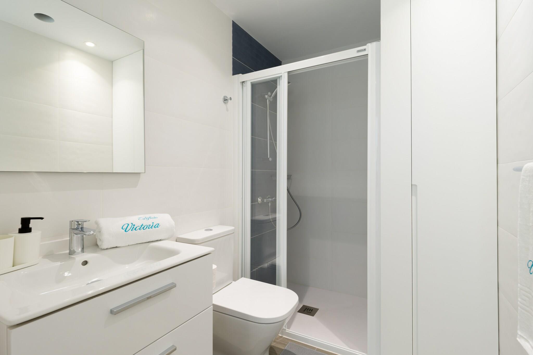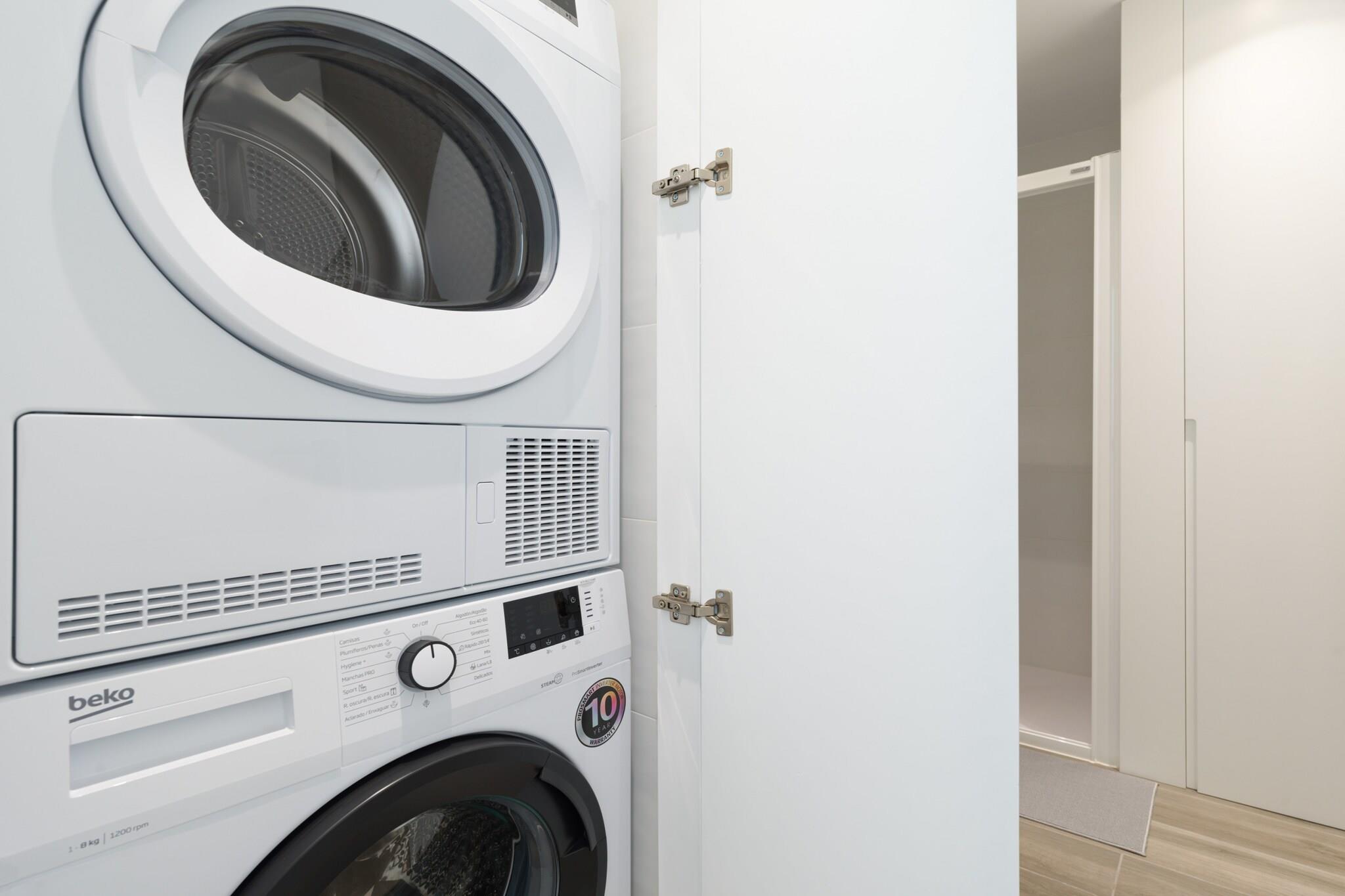 På 1. etage: (Stue(enkeltsovesofa, Fjernsyn(fladskærm, Smart-TV), spisebord, sofahjørne, radio), åbent køkken(elkedel, brødrister, kaffemaskine, mikrobølgeovn, køle-fryseskab, elektriske kogeplader, ), soveværelse(dobbeltseng), badeværelse(bruser, føntørrer)) Internetadgang, tørretumbler, vaskemaskine, balkon, terrasse, elevator, strygejern
