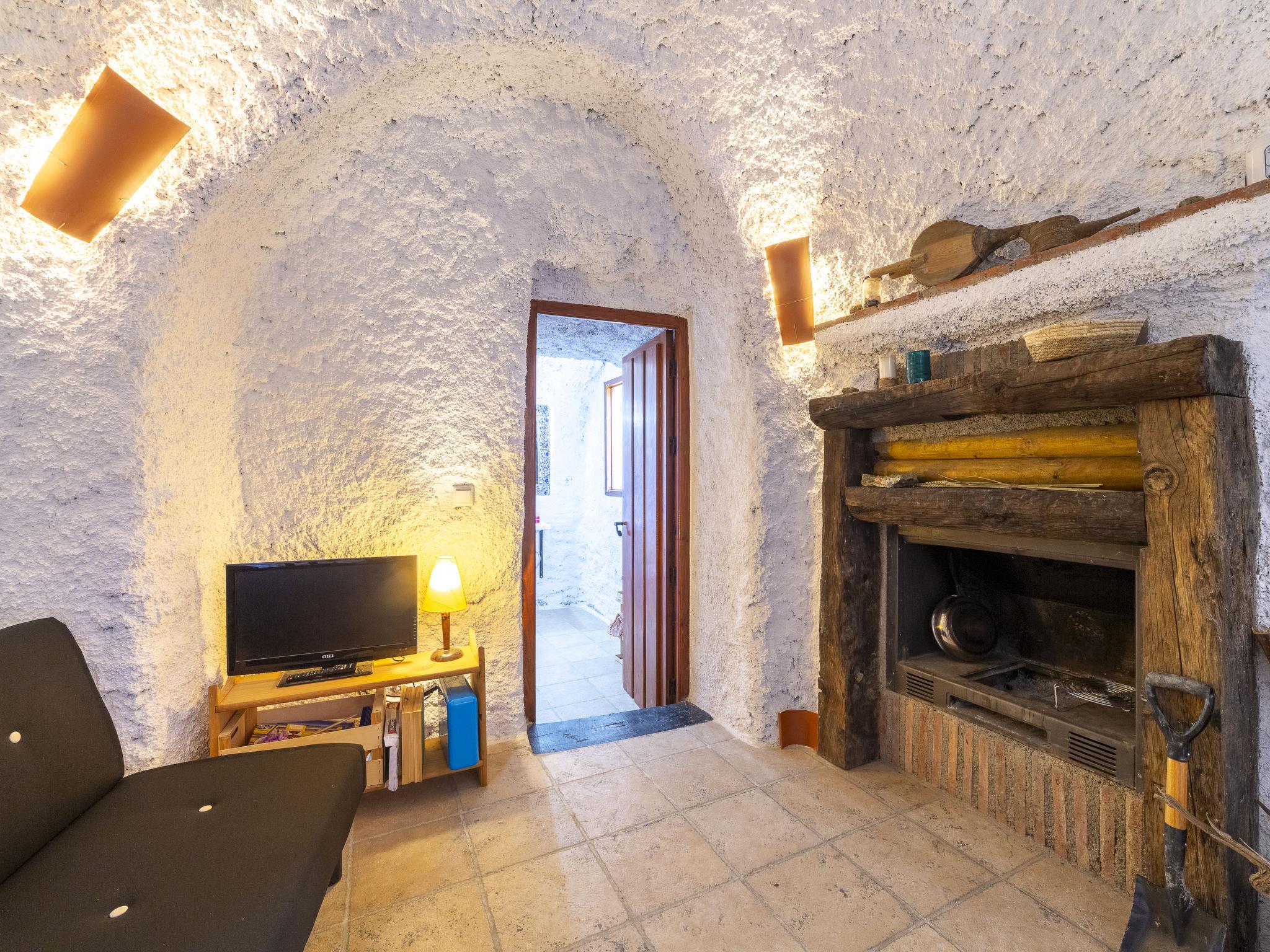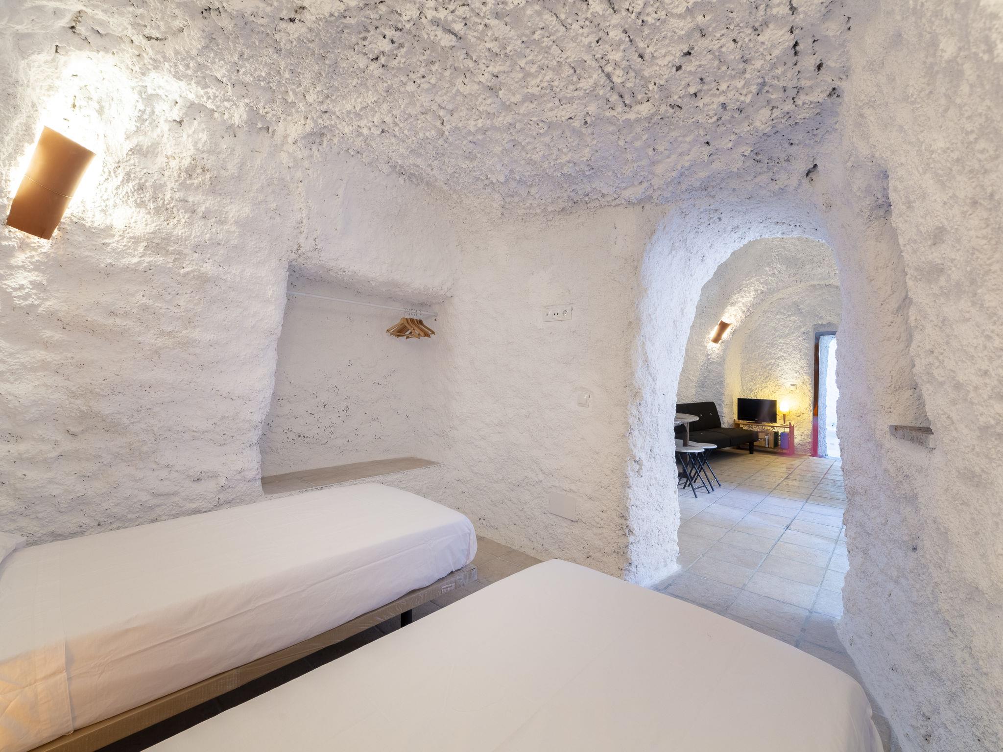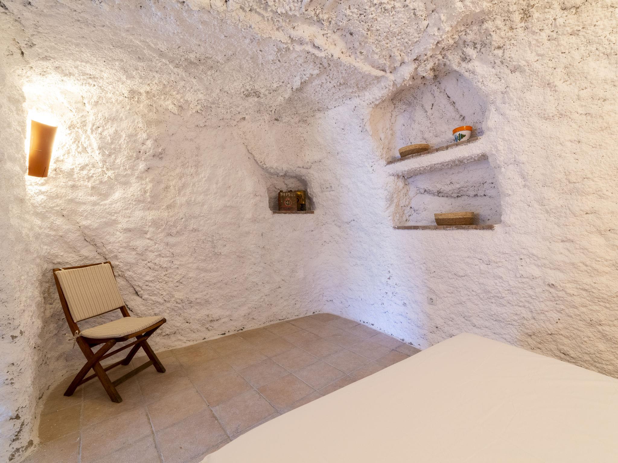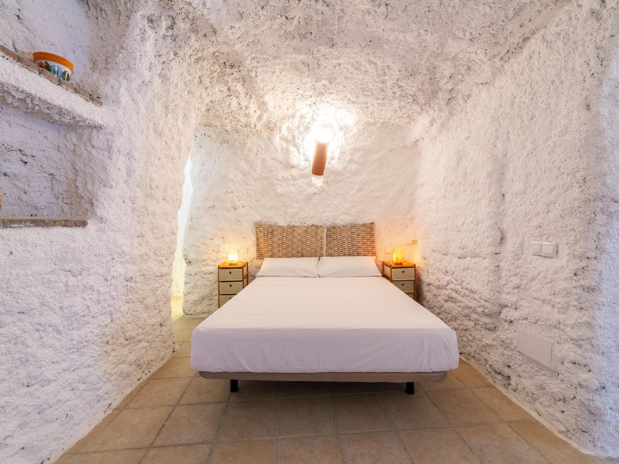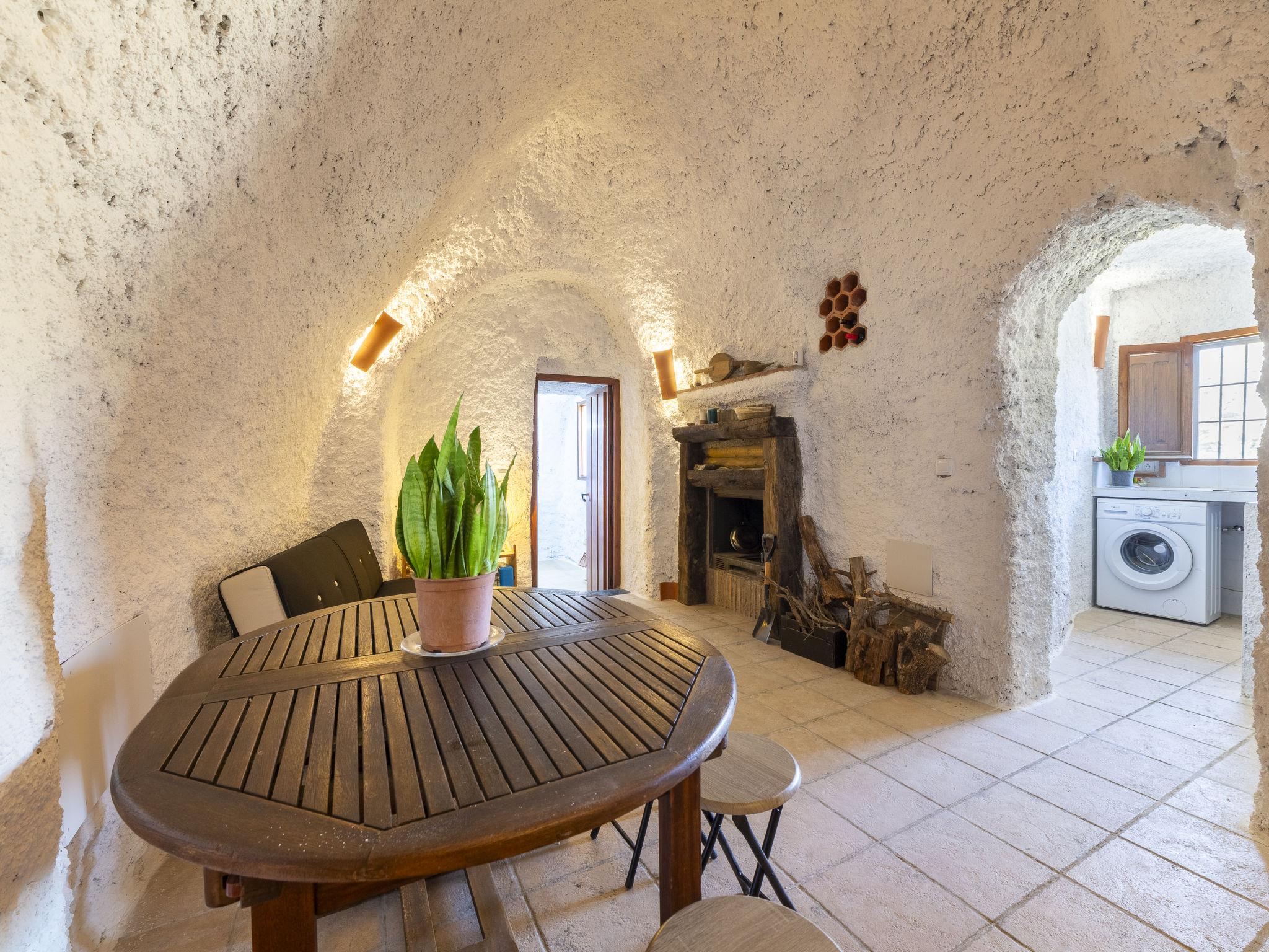 "Cueva María Zambrano", 3-room house 70 m2. Living/dining room with dining table, digital TV, flat screen and heating stove. 1 room with 2 beds (90 cm, length 190 cm). 1 room with 1 french bed (150 cm, length 190 cm). Kitchen (4 ceramic glass hob hotplates, toaster, microwave, freezer, electric coffee machine). Shower/bidet/WC. Wood heating. Terrace. Terrace furniture. Facilities: washing machine, iron, children's high chair, baby cot for up to 2 year olds, hair dryer. Internet (WiFi, free). Please note: non-smokers only. VTAR/AL/01186 // Reg. Nr.: ESFCTU000004003000388815000000000000000VTAR/AL/011868
