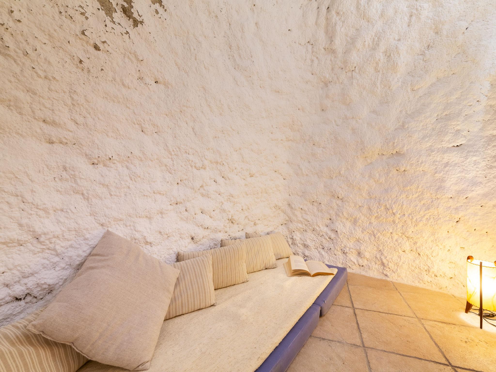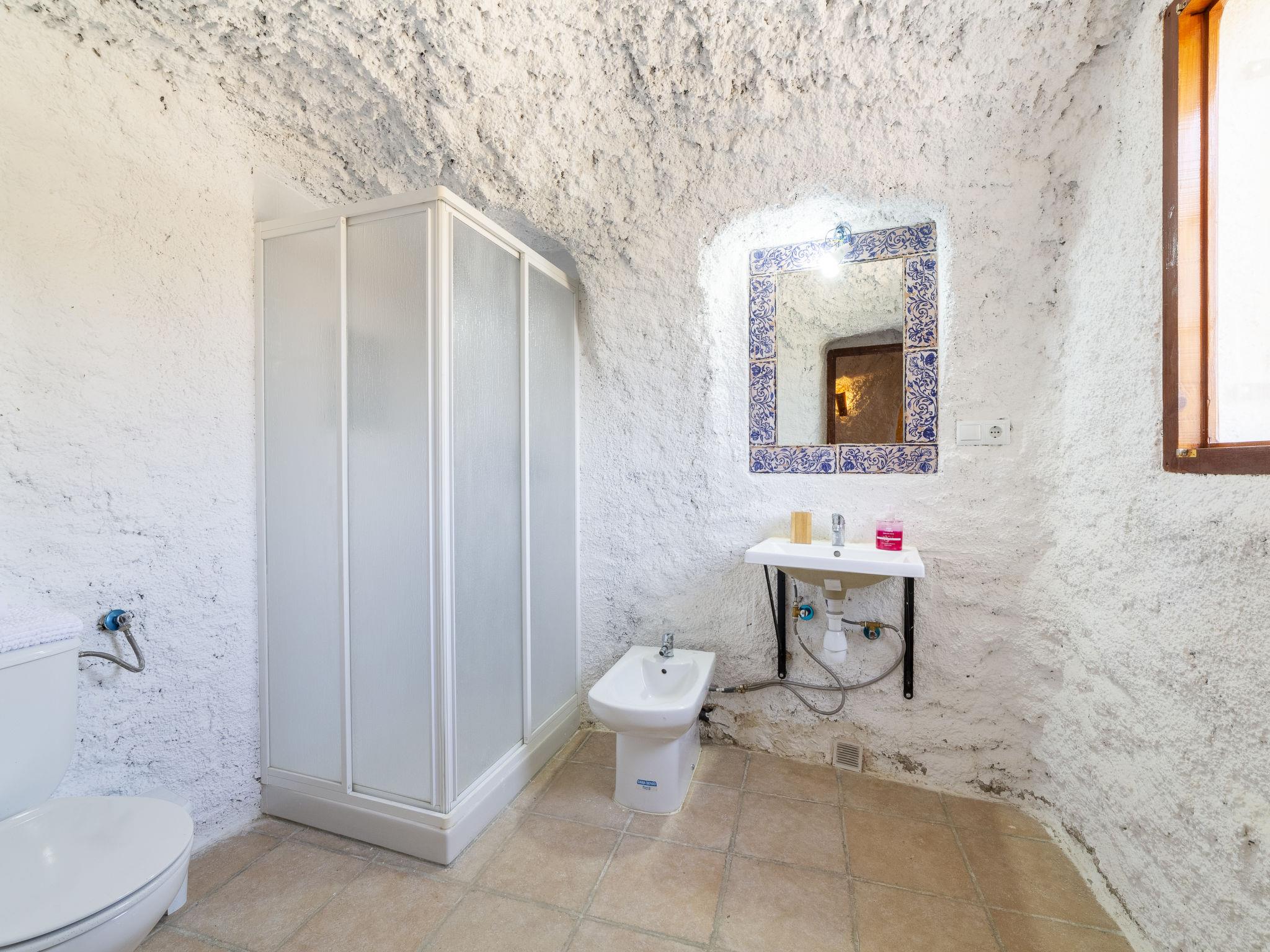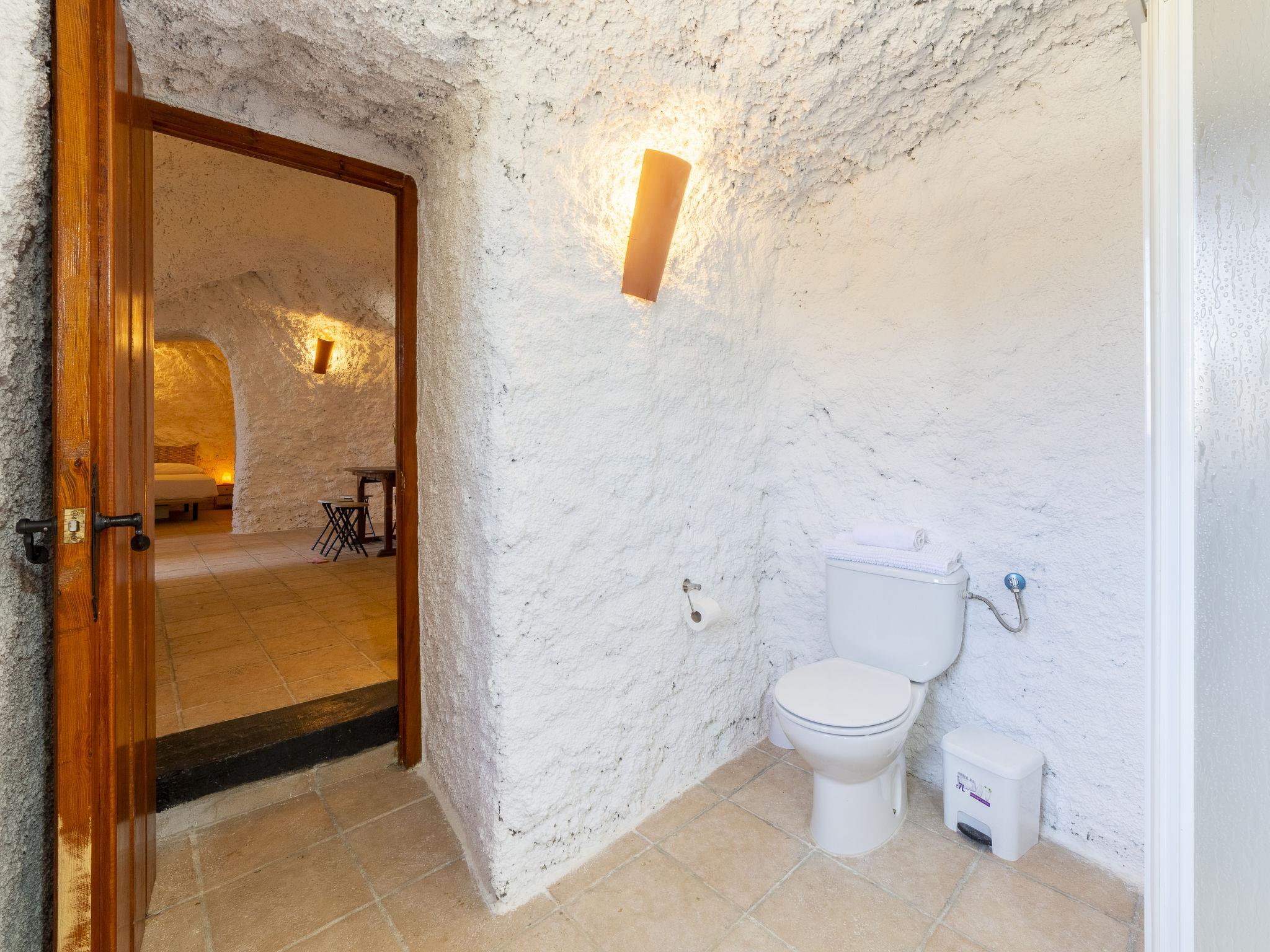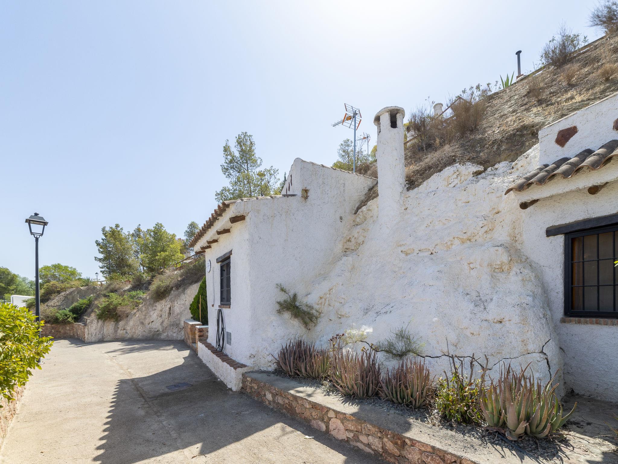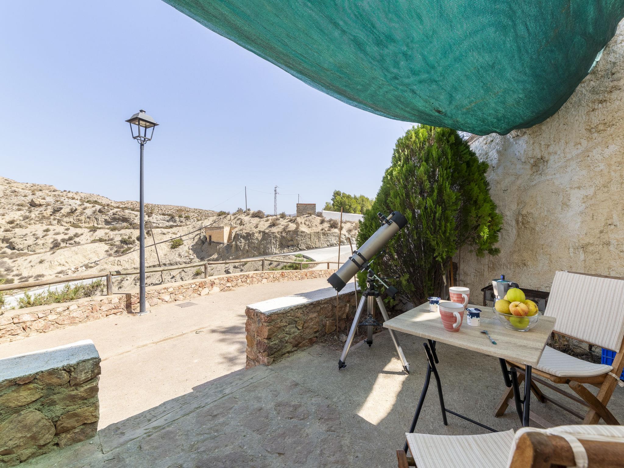 "Cueva María Zambrano", 3-room house 70 m2. Living/dining room with dining table, digital TV, flat screen and heating stove. 1 room with 2 beds (90 cm, length 190 cm). 1 room with 1 french bed (150 cm, length 190 cm). Kitchen (4 ceramic glass hob hotplates, toaster, microwave, freezer, electric coffee machine). Shower/bidet/WC. Wood heating. Terrace. Terrace furniture. Facilities: washing machine, iron, children's high chair, baby cot for up to 2 year olds, hair dryer. Internet (WiFi, free). Please note: non-smokers only. VTAR/AL/01186 // Reg. Nr.: ESFCTU000004003000388815000000000000000VTAR/AL/011868